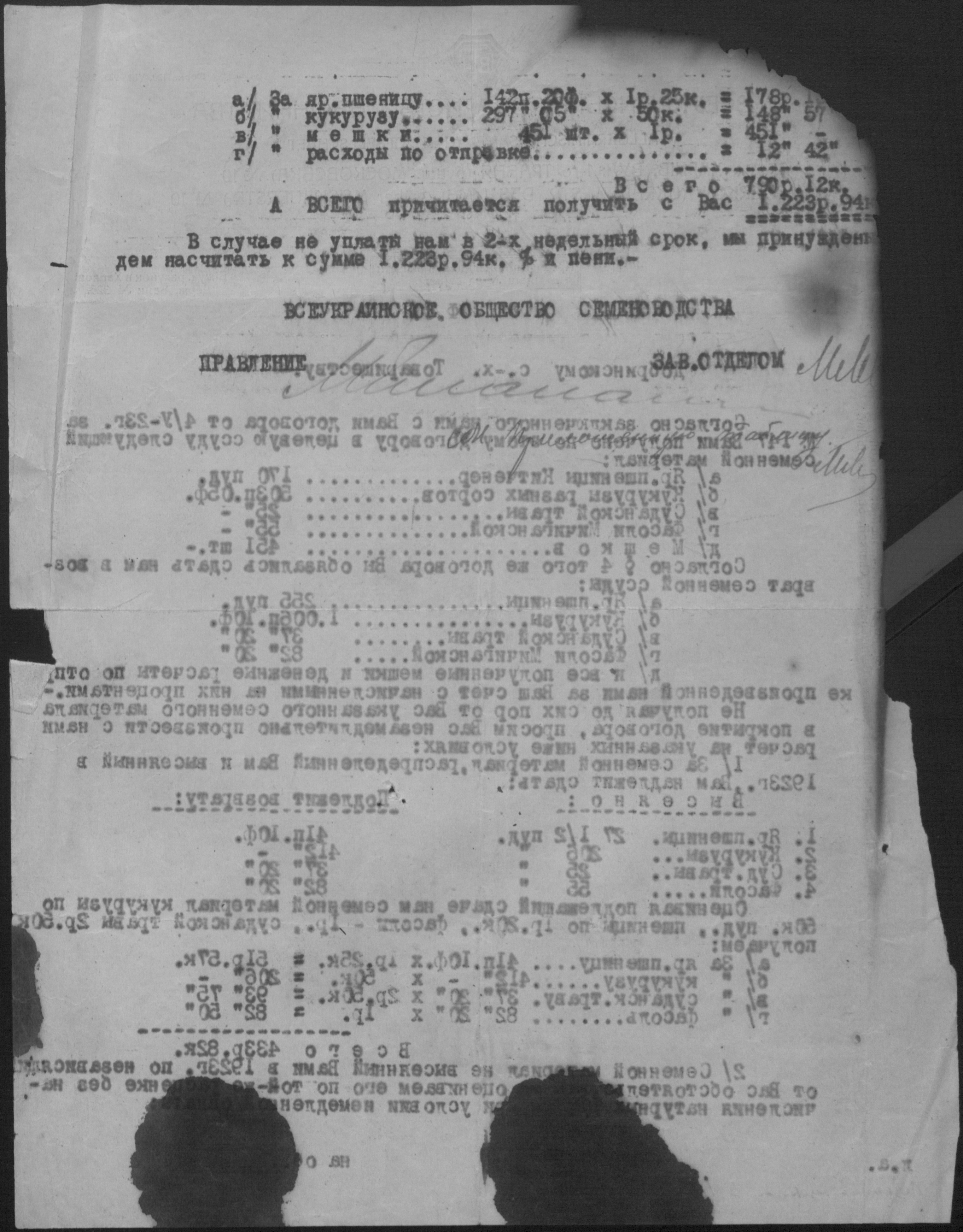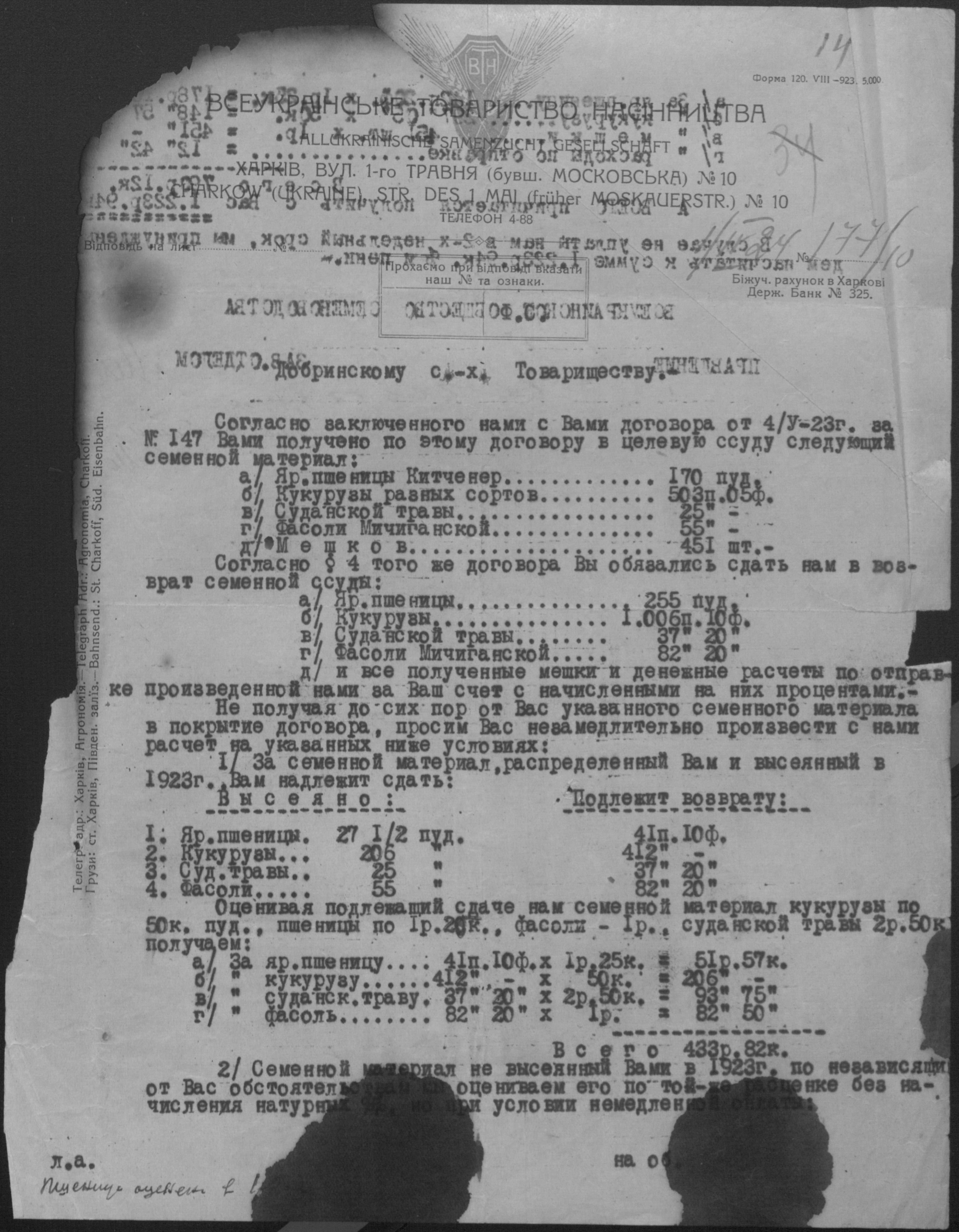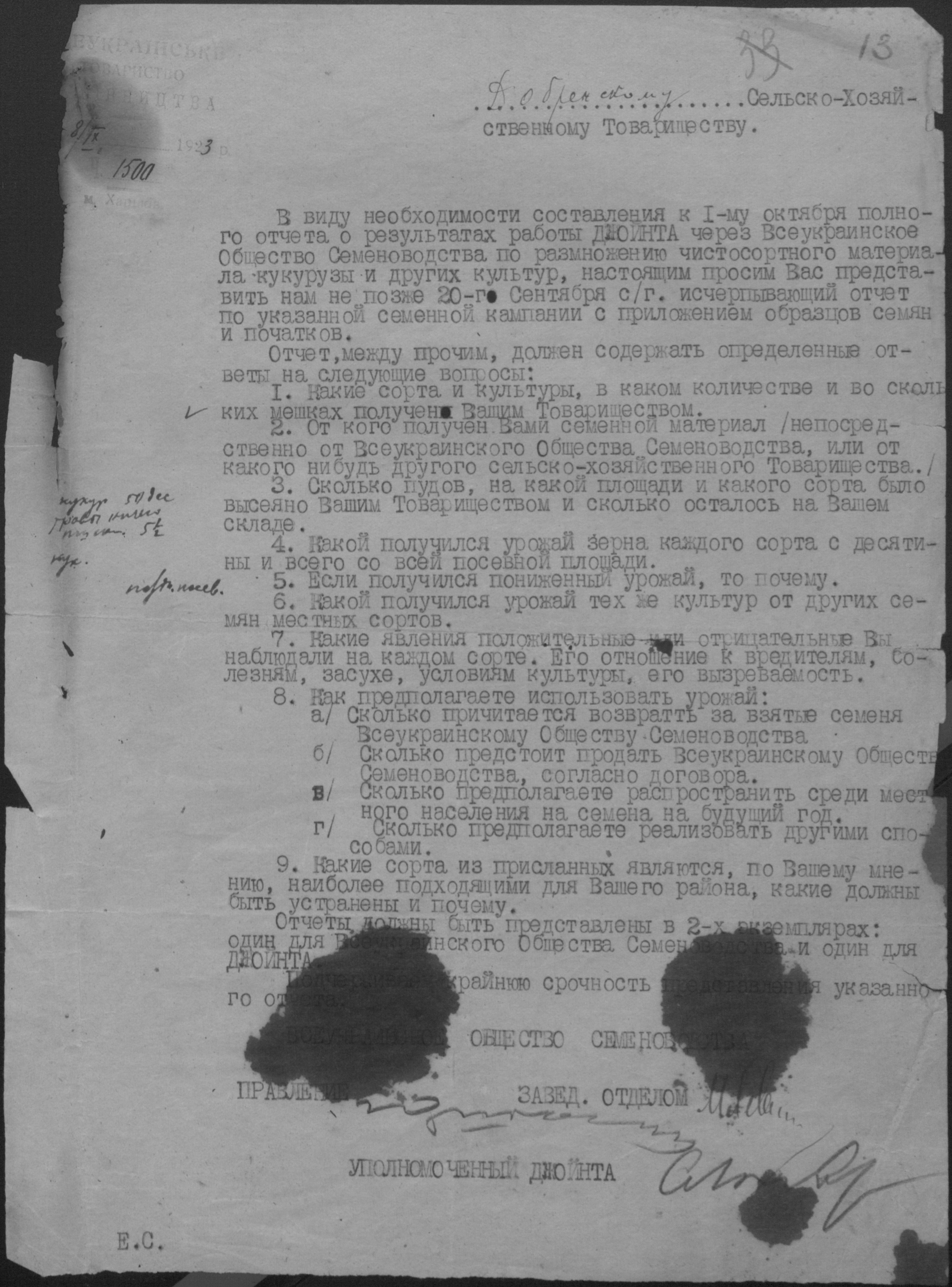 • • • • Справа № 13 “Листування з Всеукраїнським товариством насінництва про звітування щодо посівної кампанії, виплату грошей за насіння”