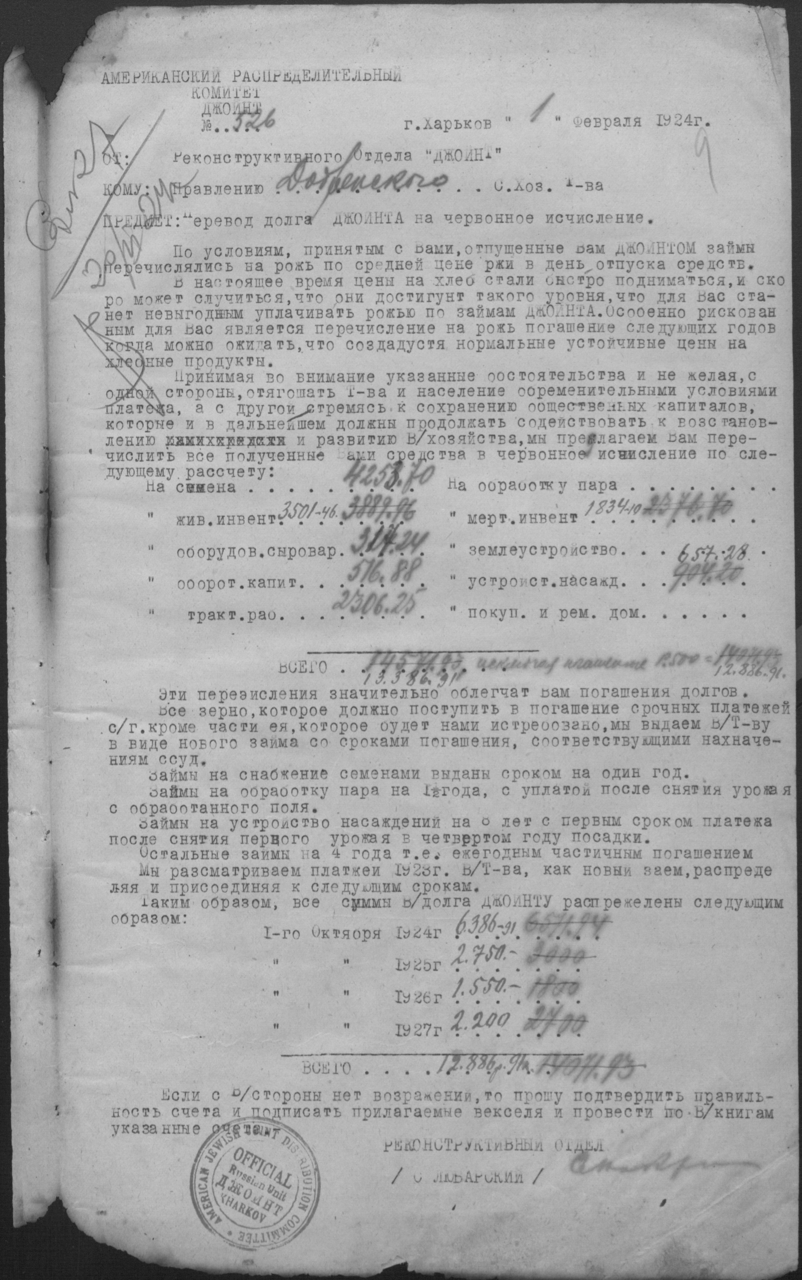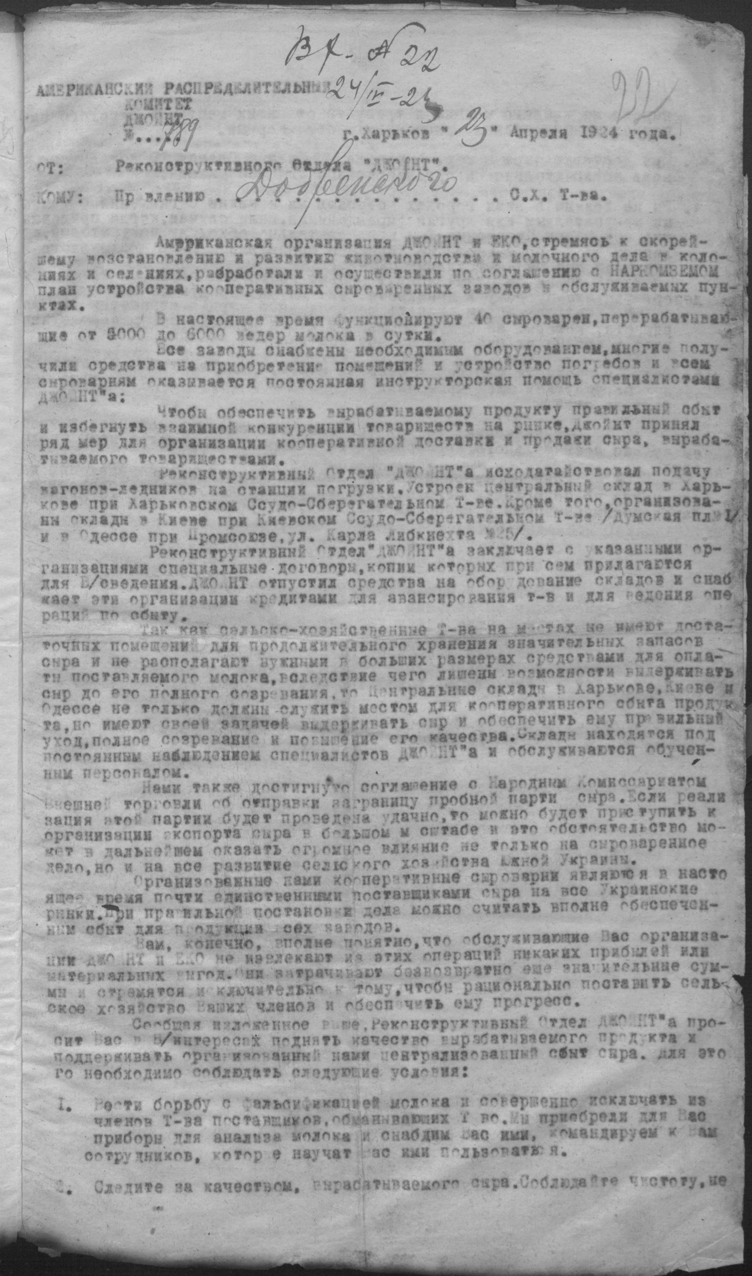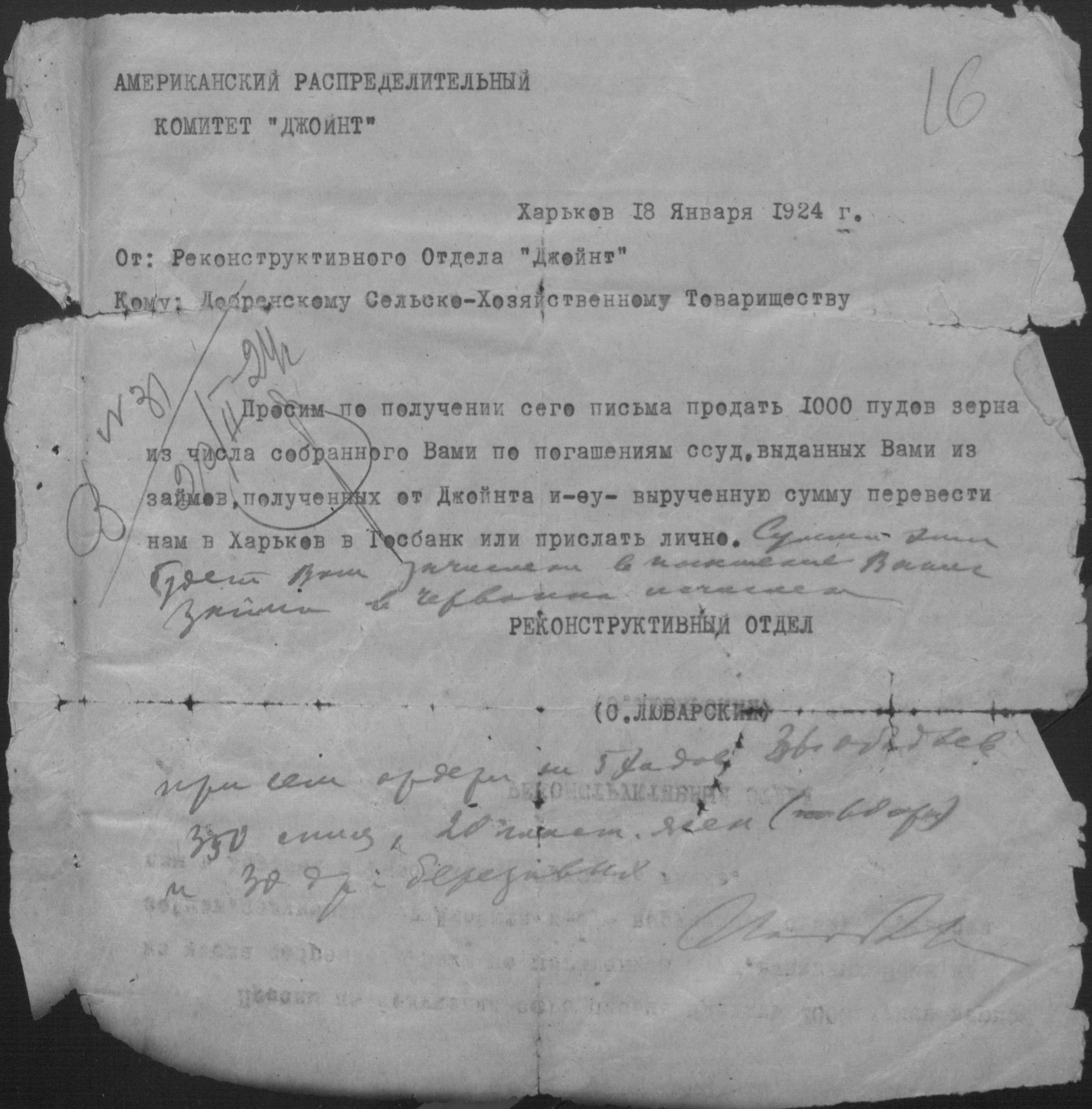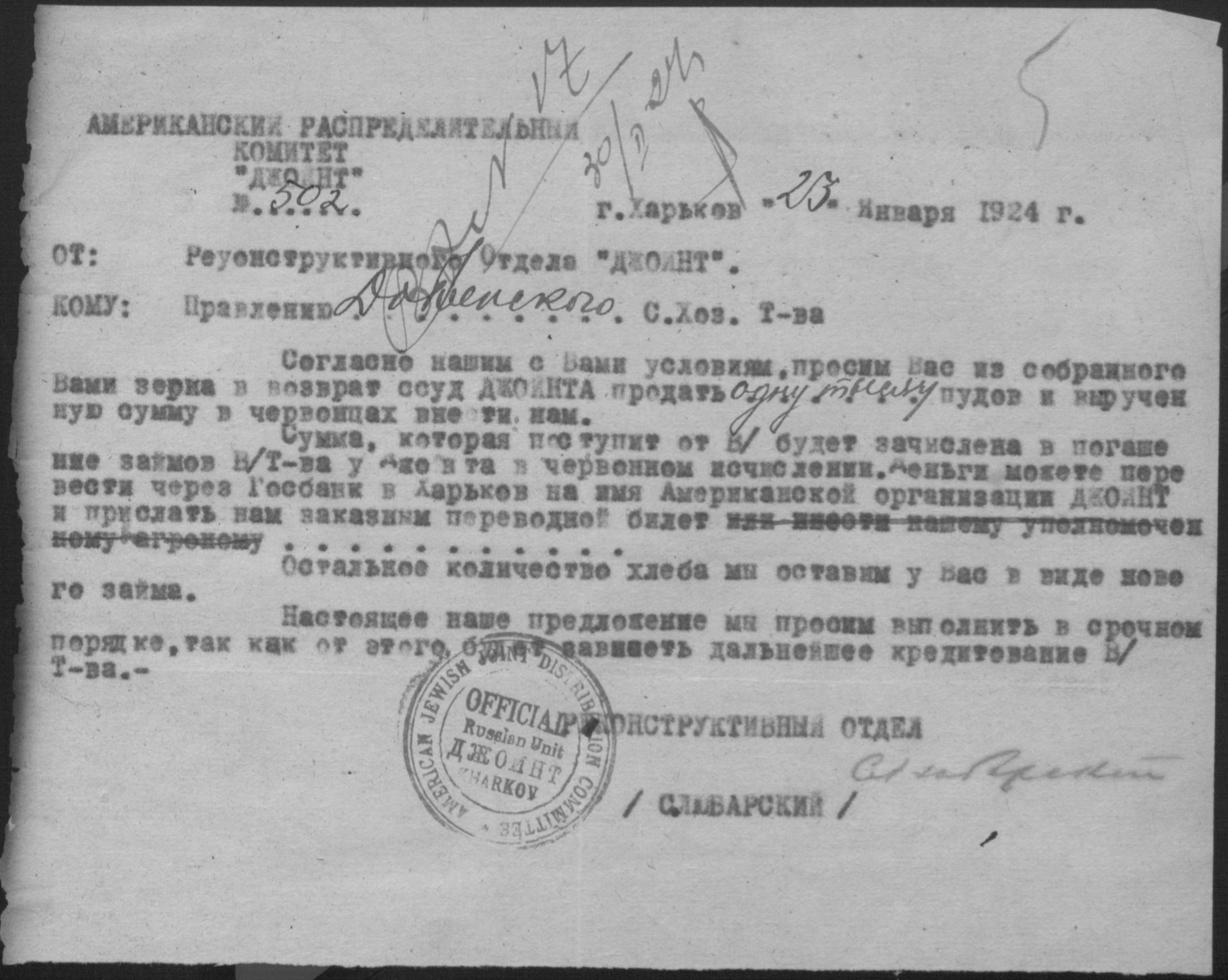 • • • • Справа № 27 “Листування з Американським розподільчим комітетом «Джойнт» про видачу позичок і відстрочення боргів, витрати вугілля, роботу сироварень”