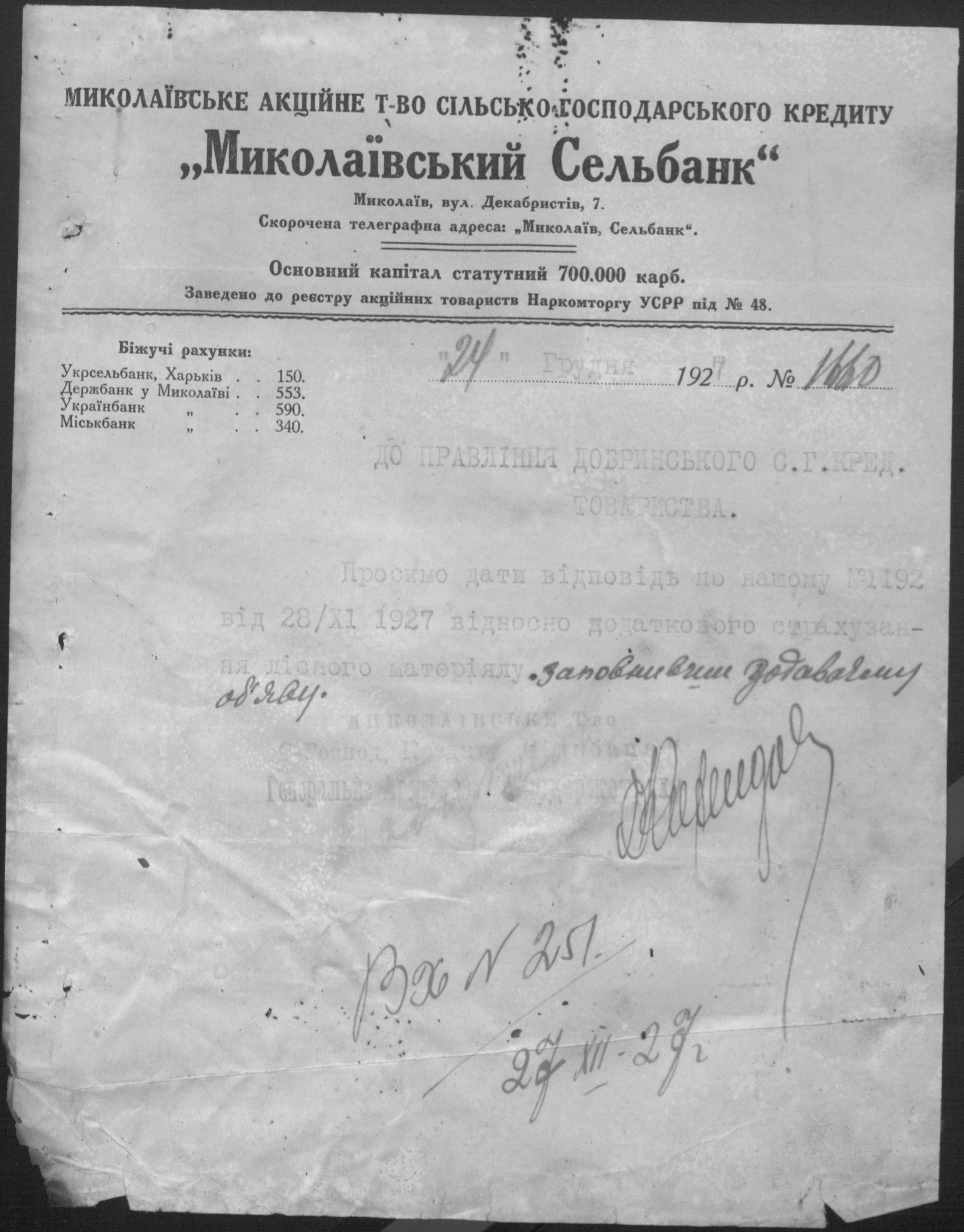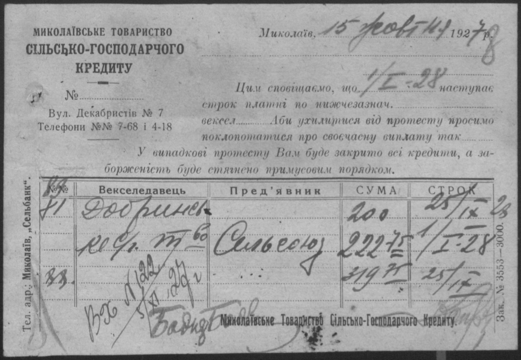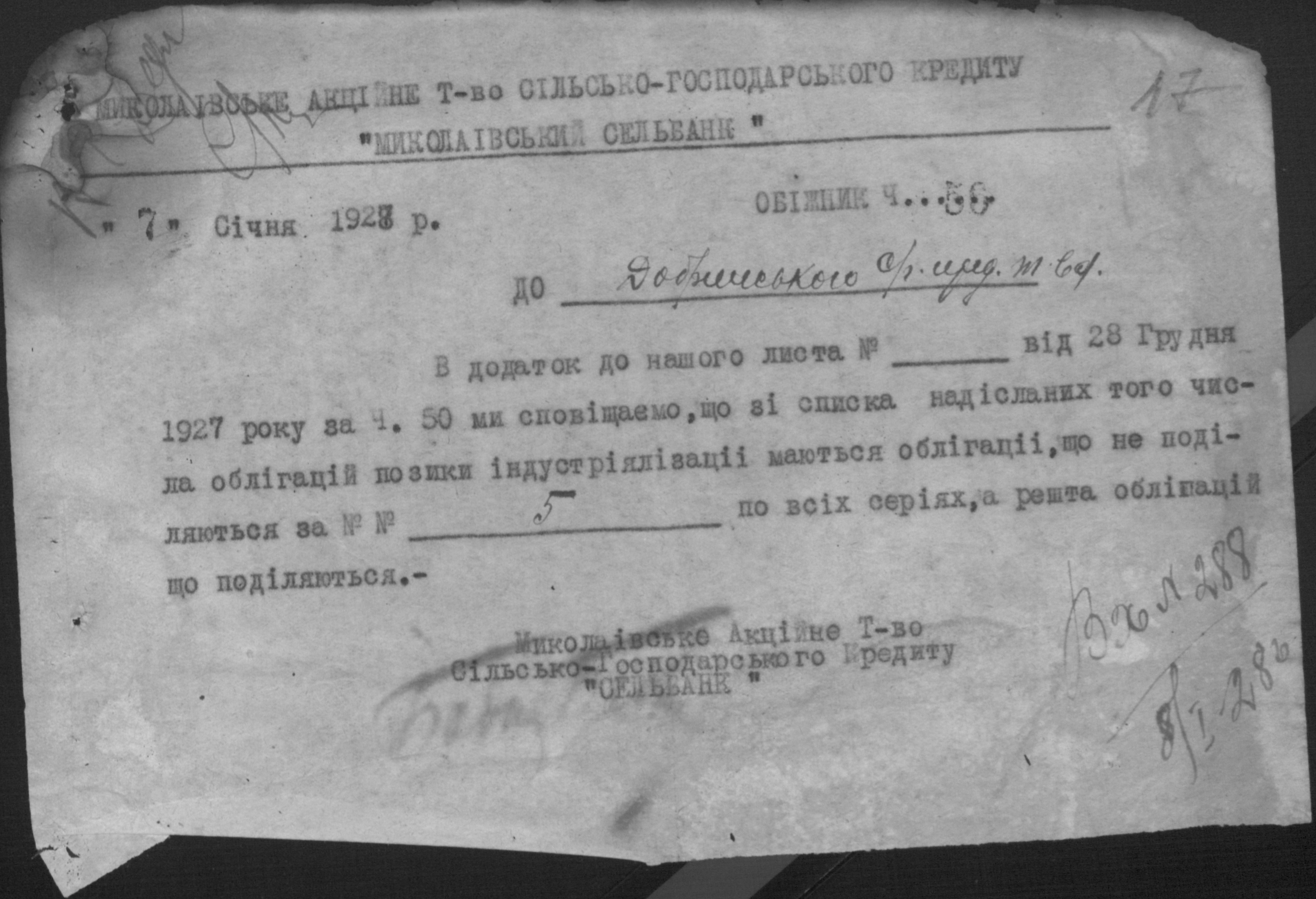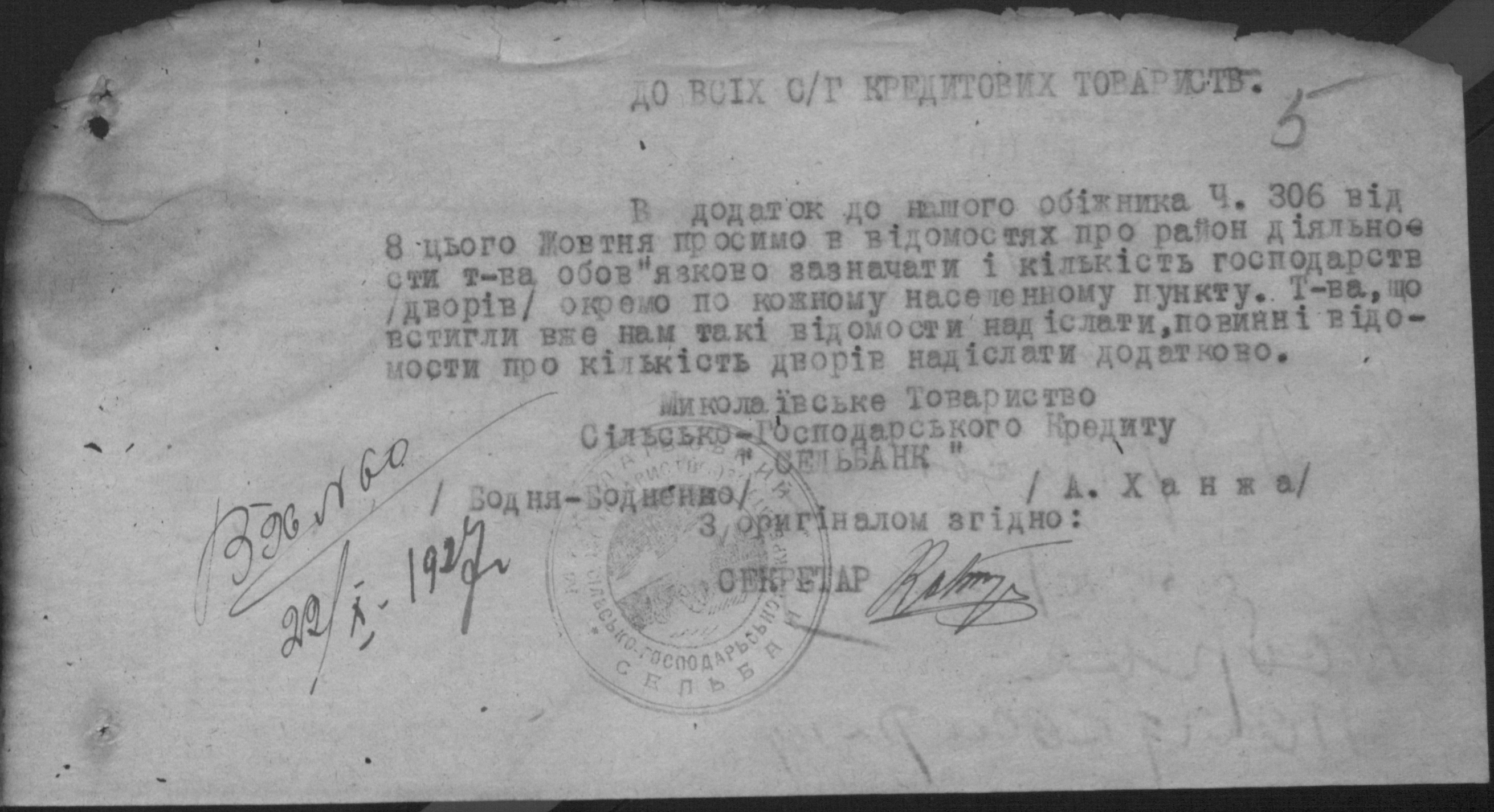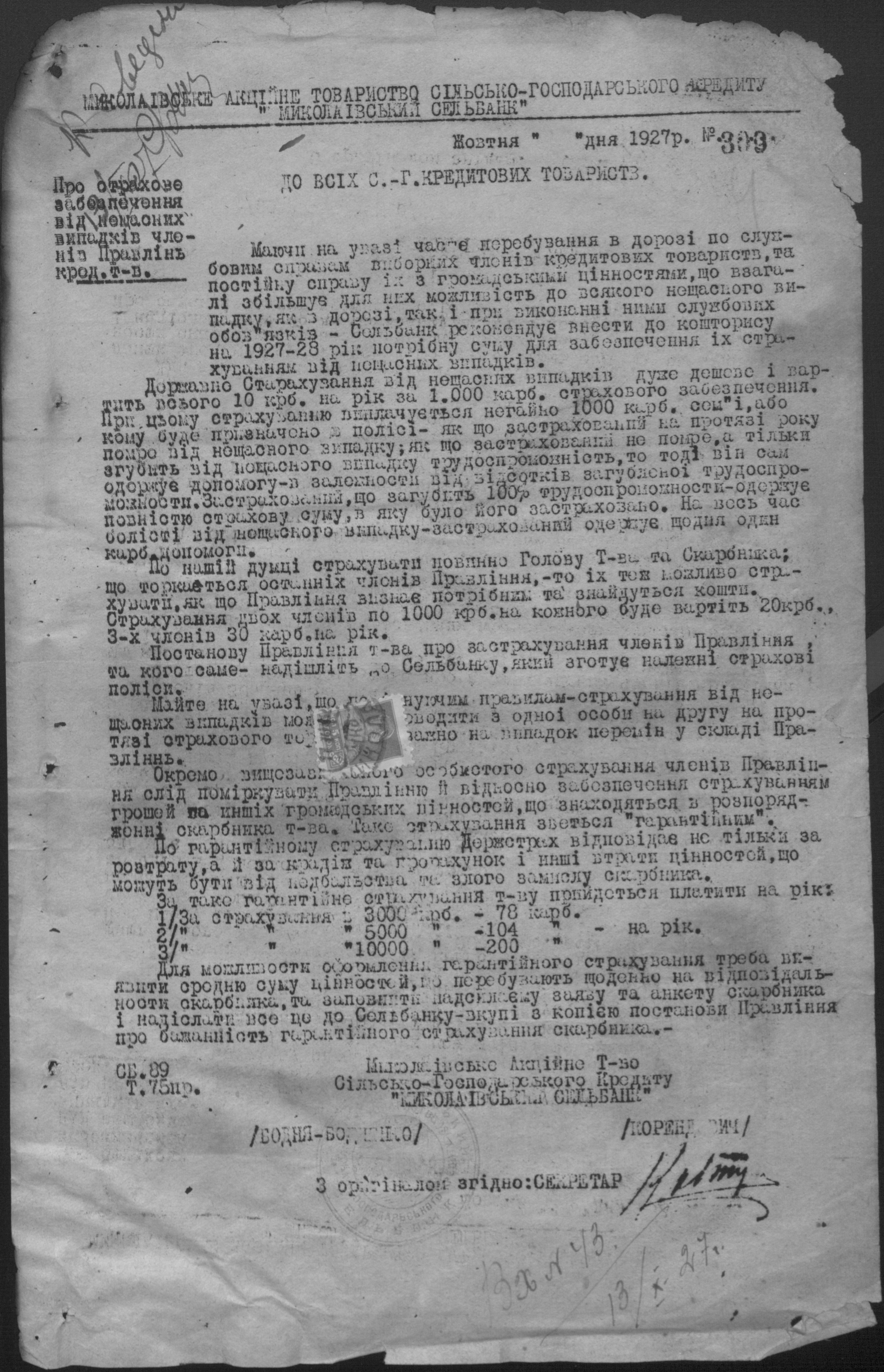 • • • • Справа № 32 “Обіжники Миколаївського акціонерного товариства сільськогосподарського кредиту «Миколаївський Сільбанк» про страхування худоби, видачу позичок і погашення заборгованостей”