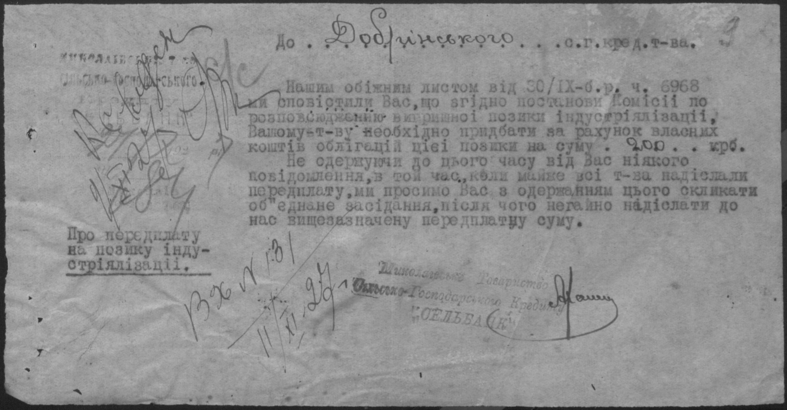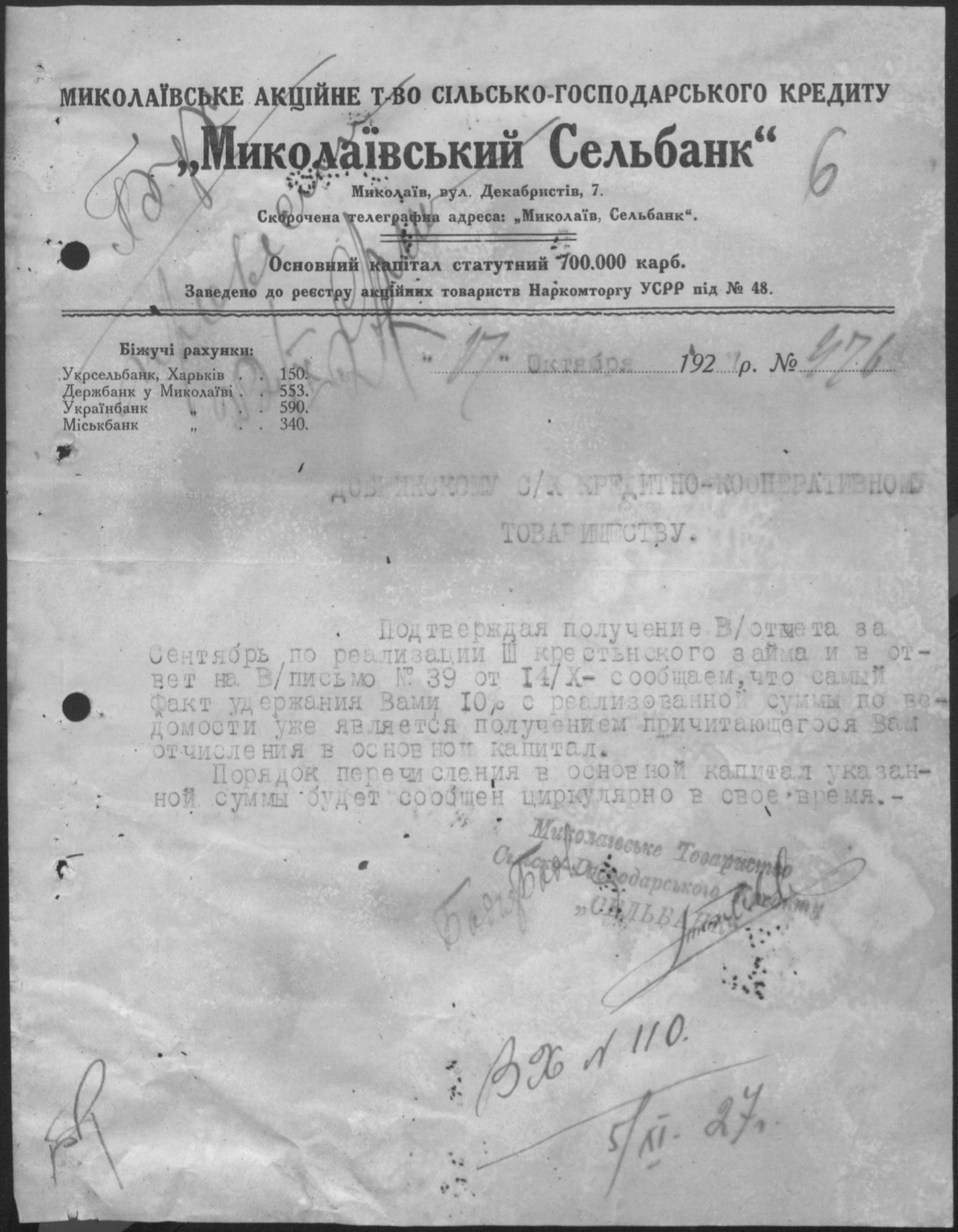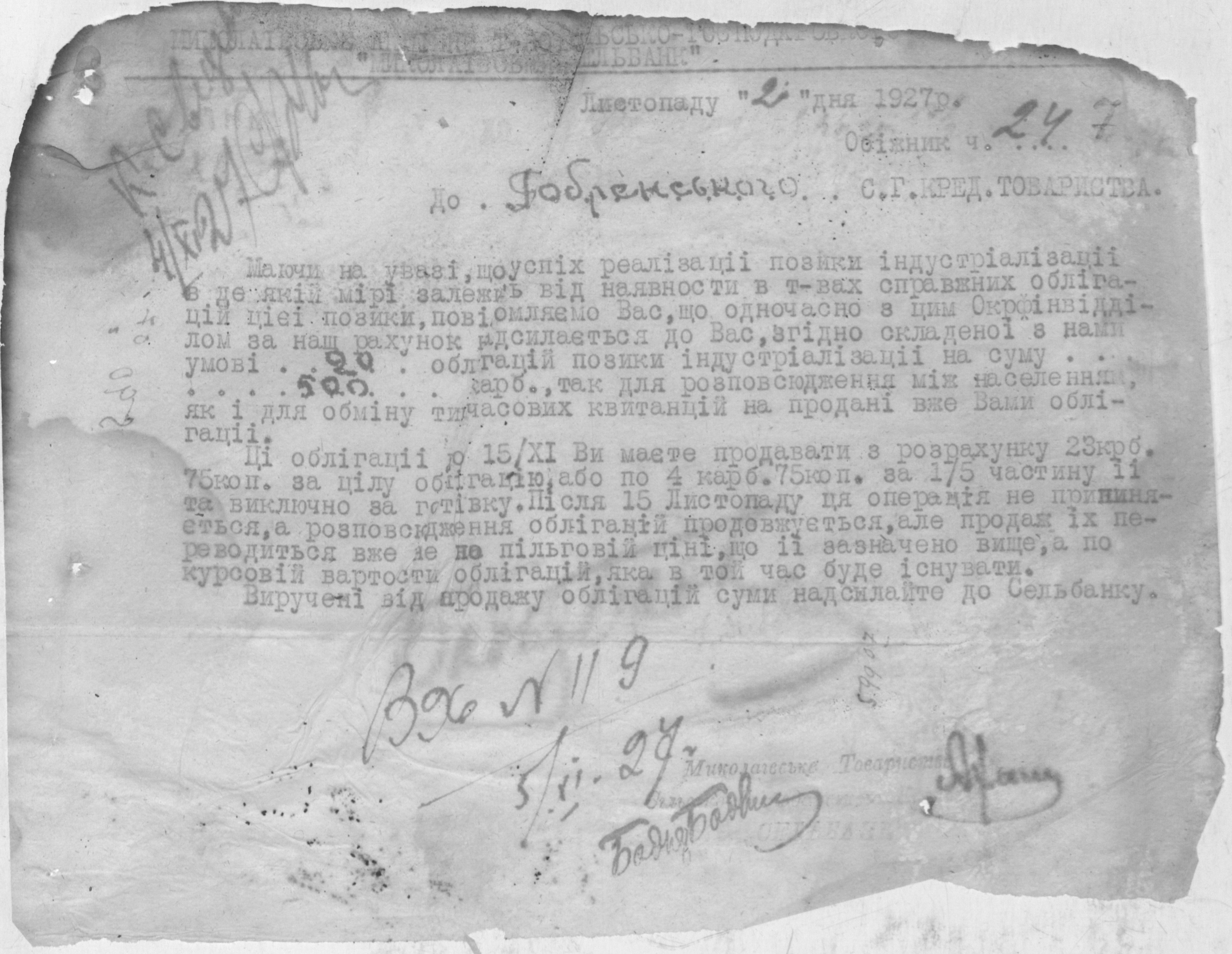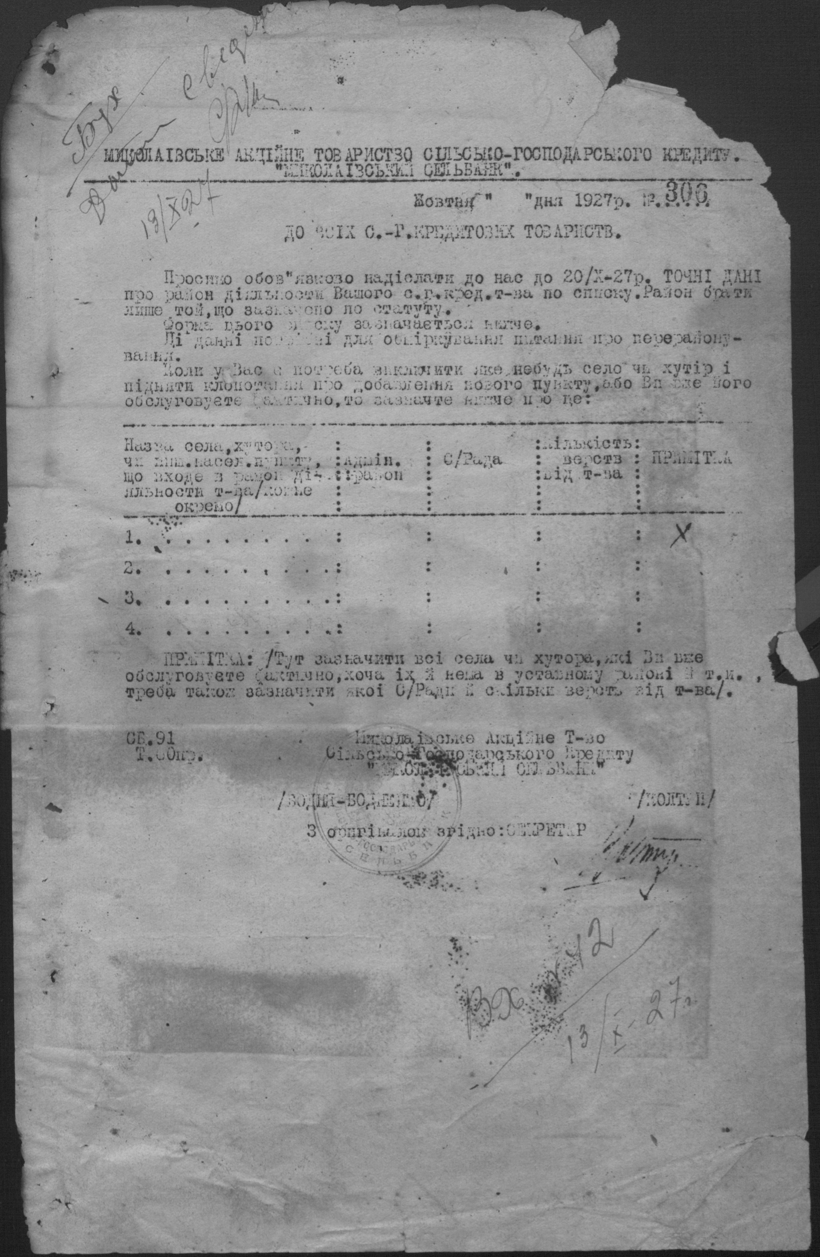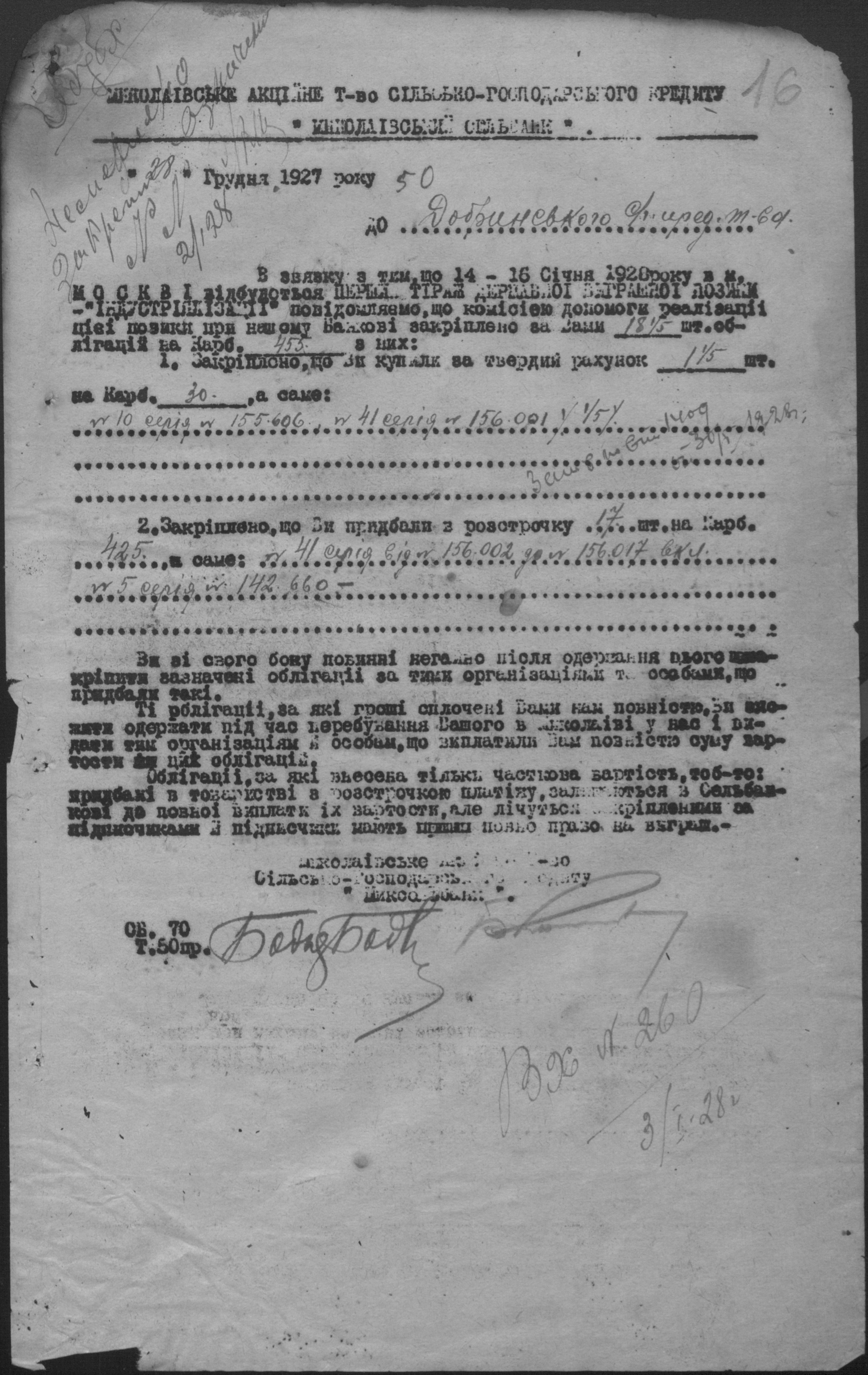 • • • • Справа № 32 “Обіжники Миколаївського акціонерного товариства сільськогосподарського кредиту «Миколаївський Сільбанк» про страхування худоби, видачу позичок і погашення заборгованостей”