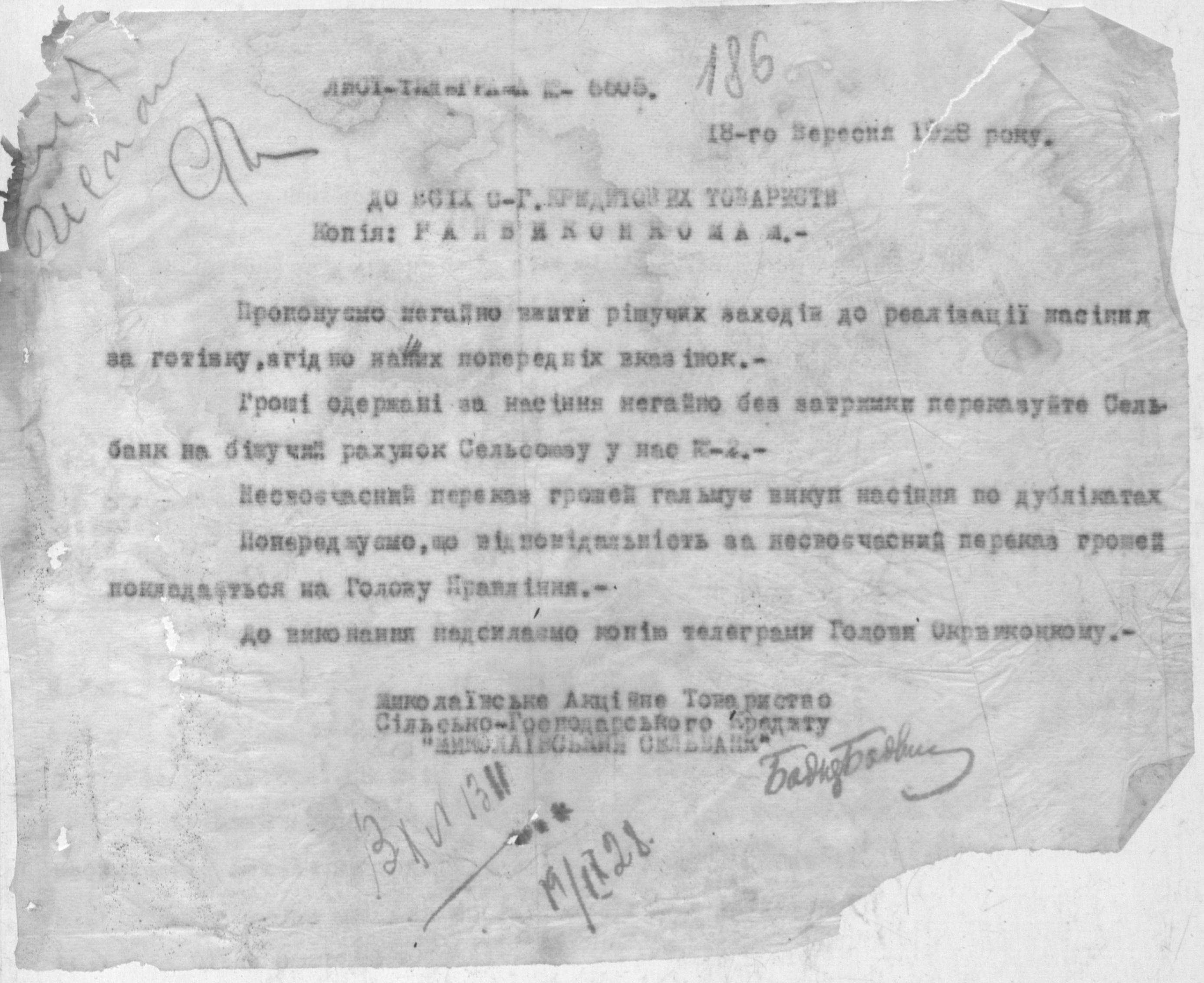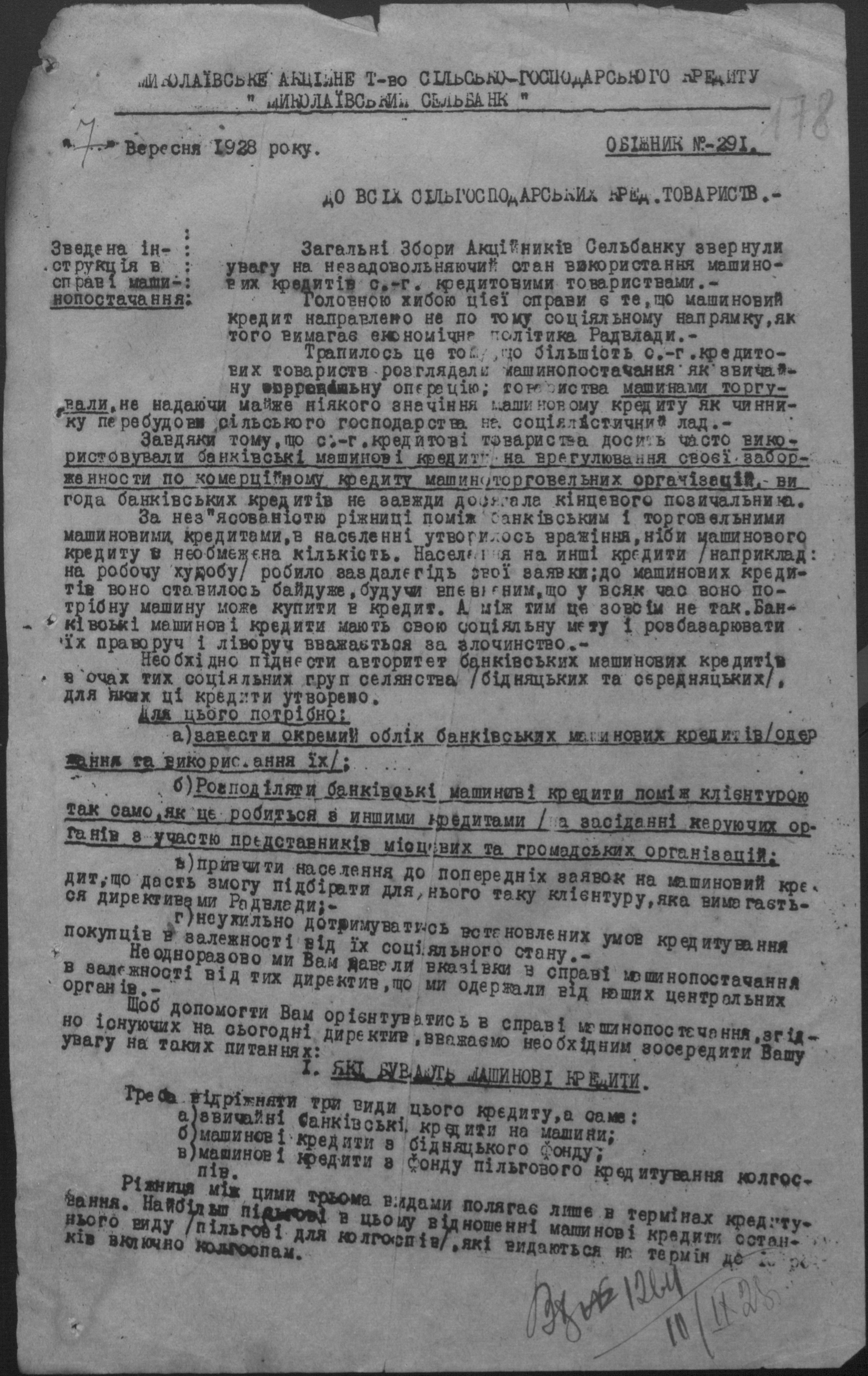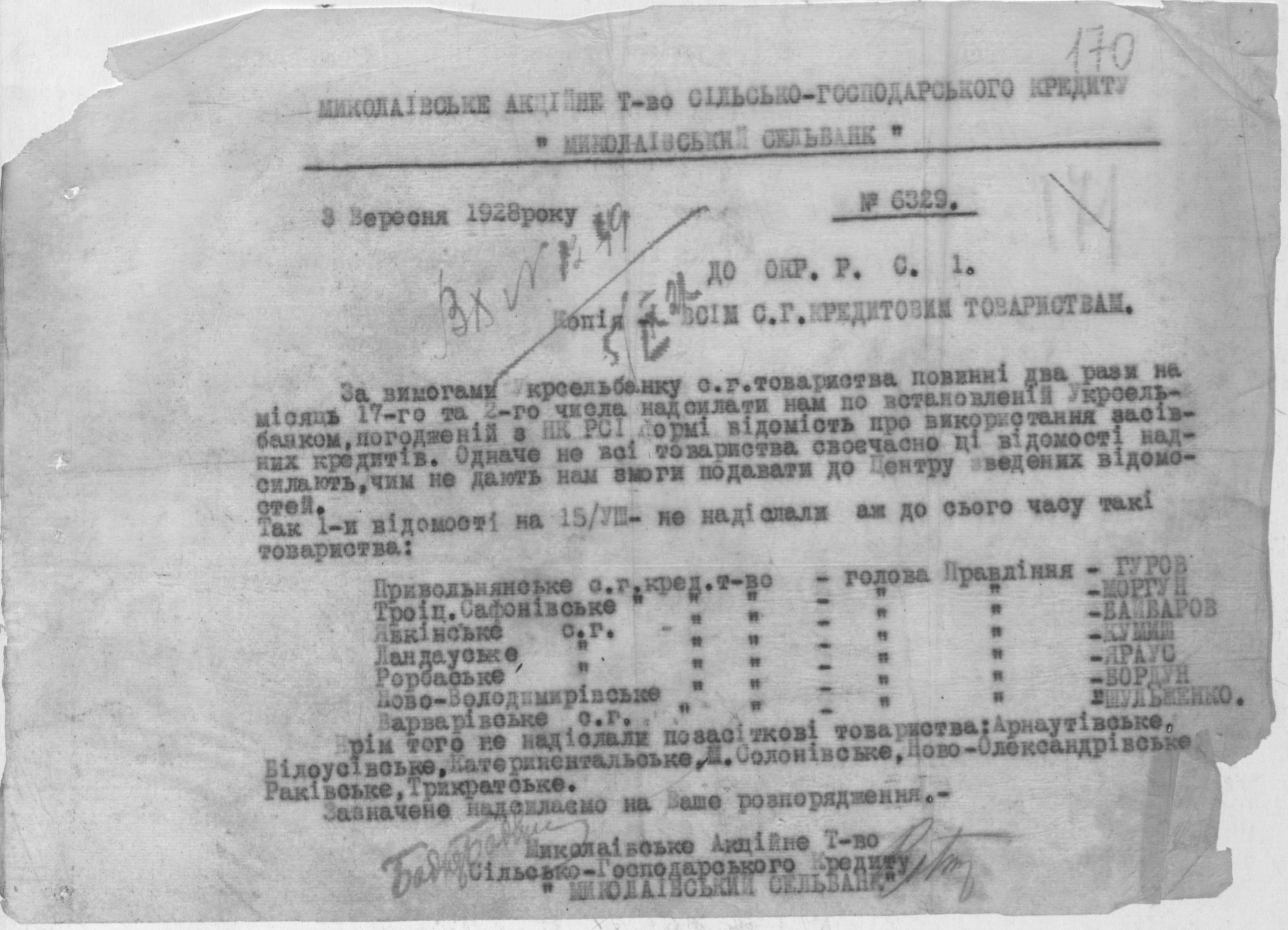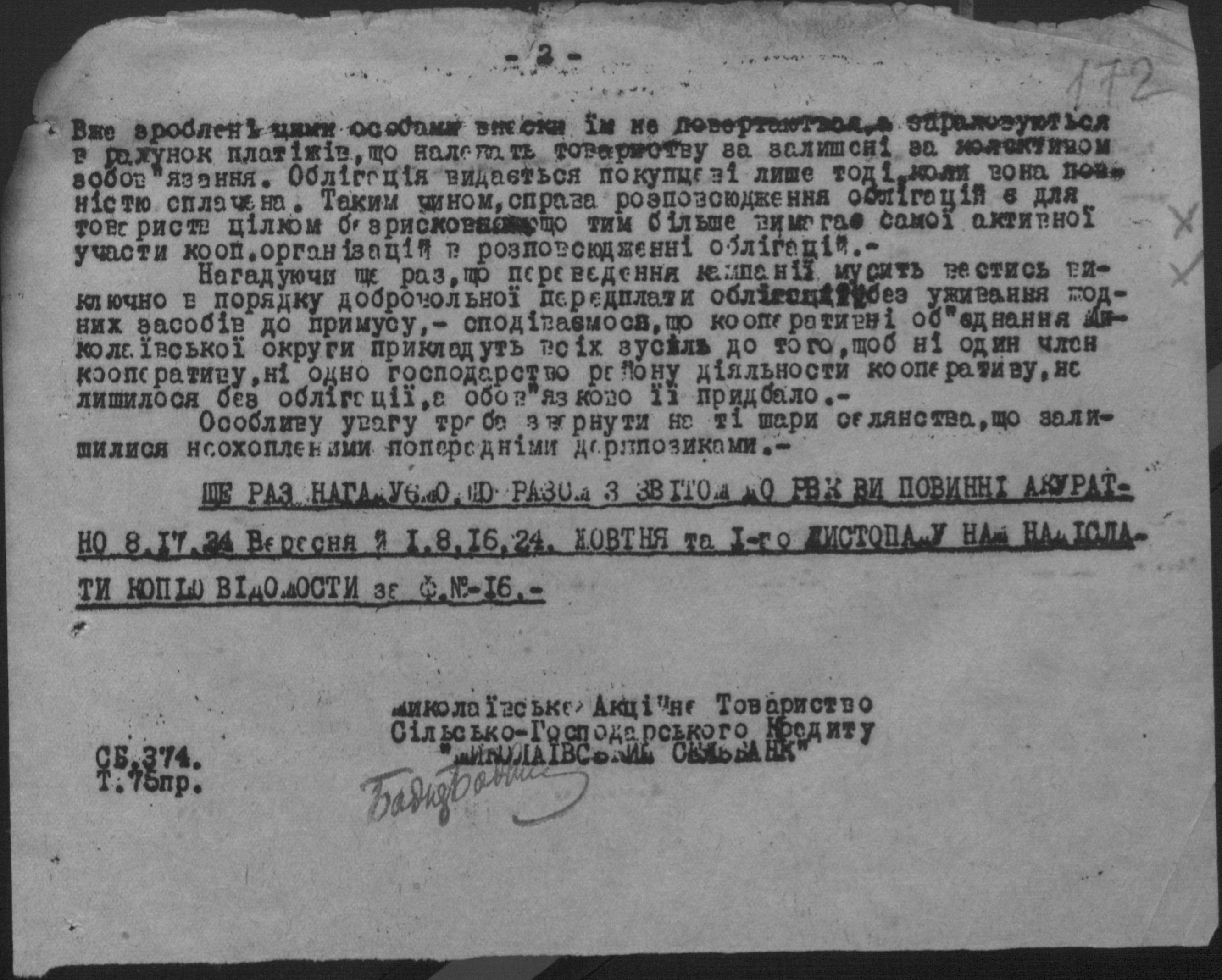 • • • • Справа № 32 “Обіжники Миколаївського акціонерного товариства сільськогосподарського кредиту «Миколаївський Сільбанк» про страхування худоби, видачу позичок і погашення заборгованостей”