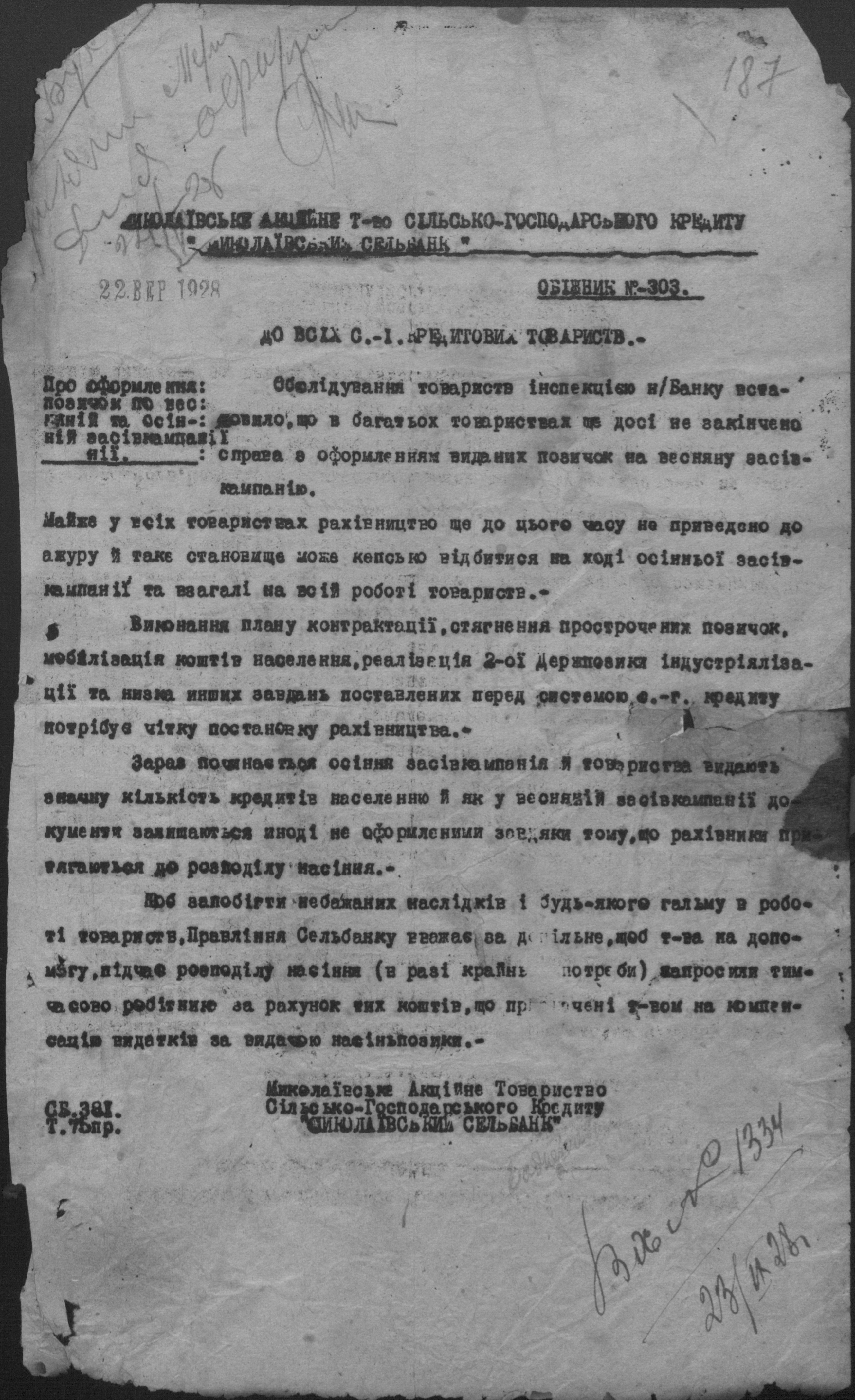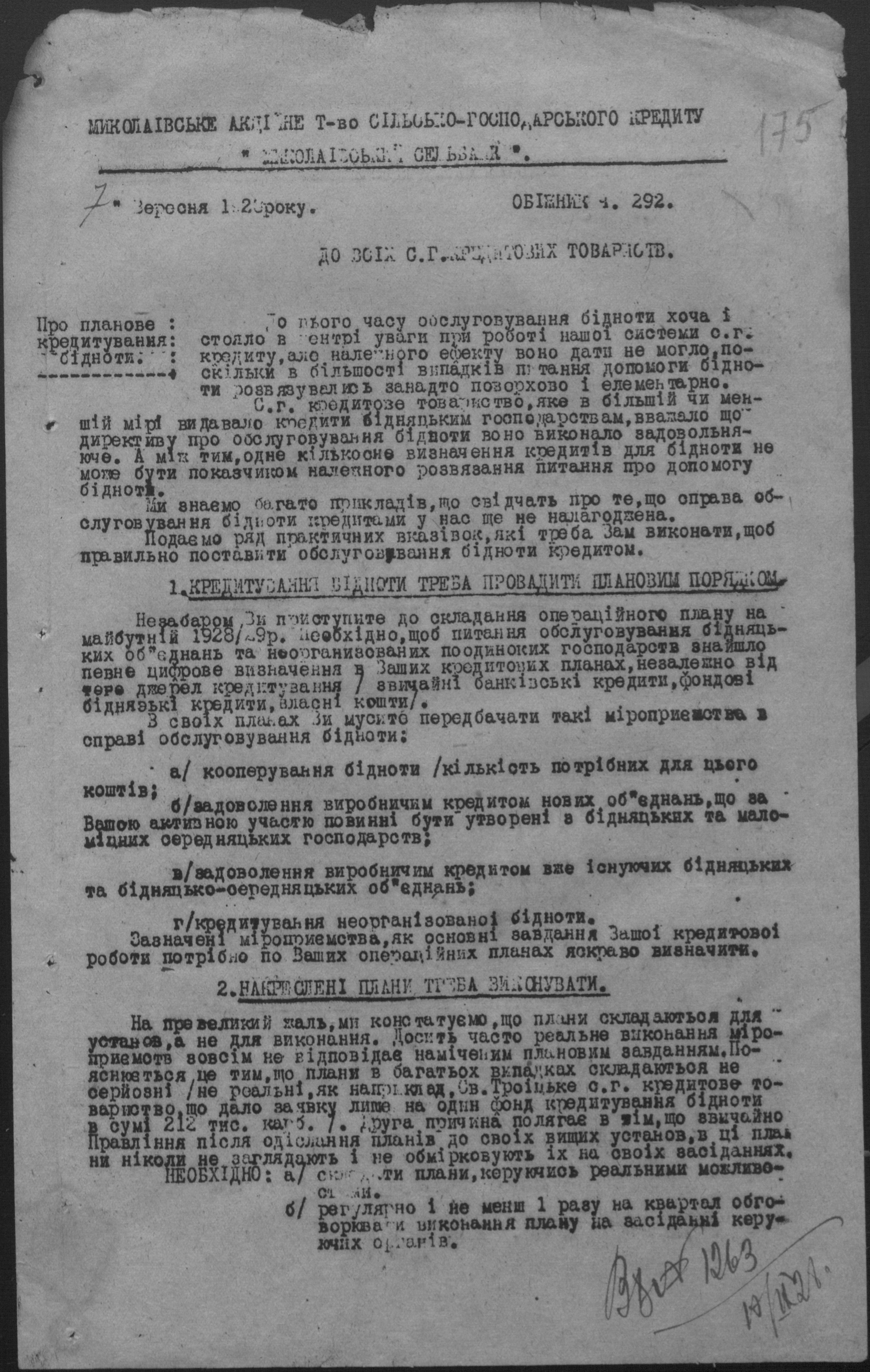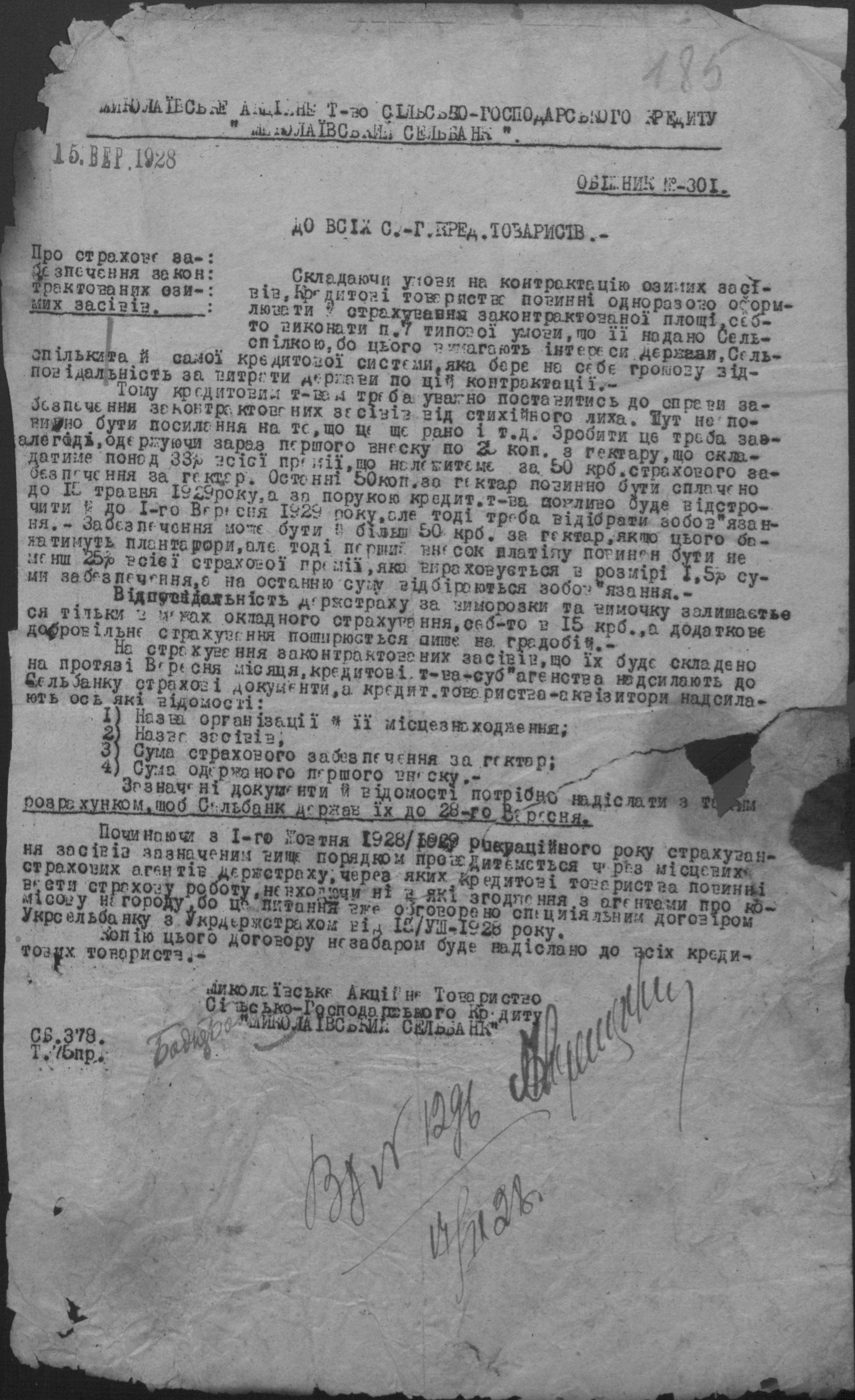 • • • • Справа № 32 “Обіжники Миколаївського акціонерного товариства сільськогосподарського кредиту «Миколаївський Сільбанк» про страхування худоби, видачу позичок і погашення заборгованостей”