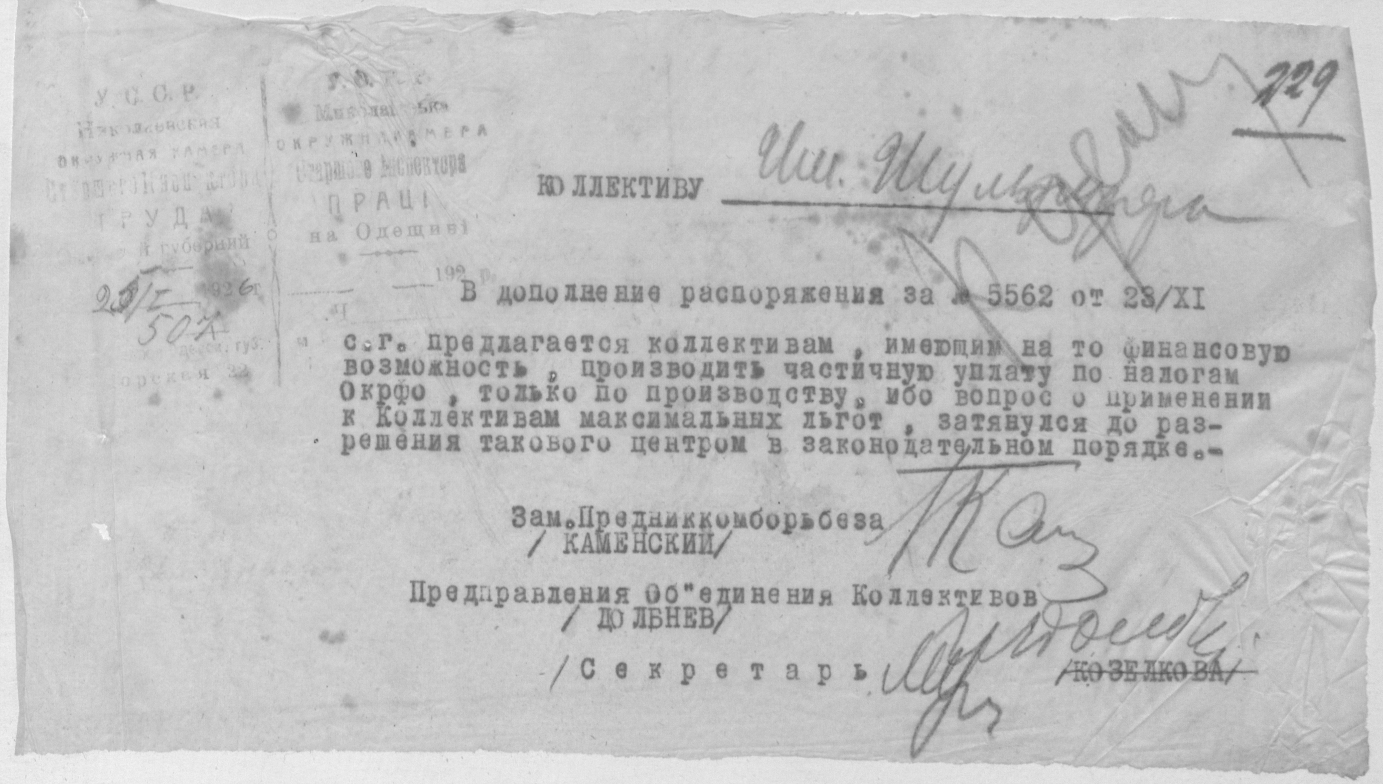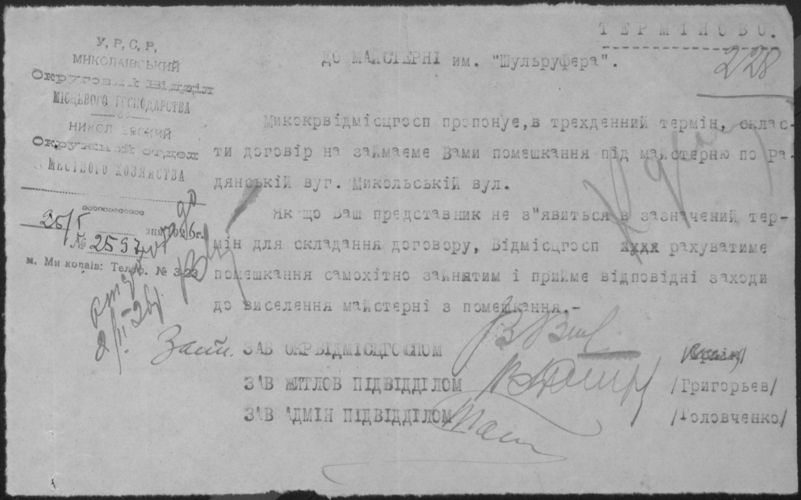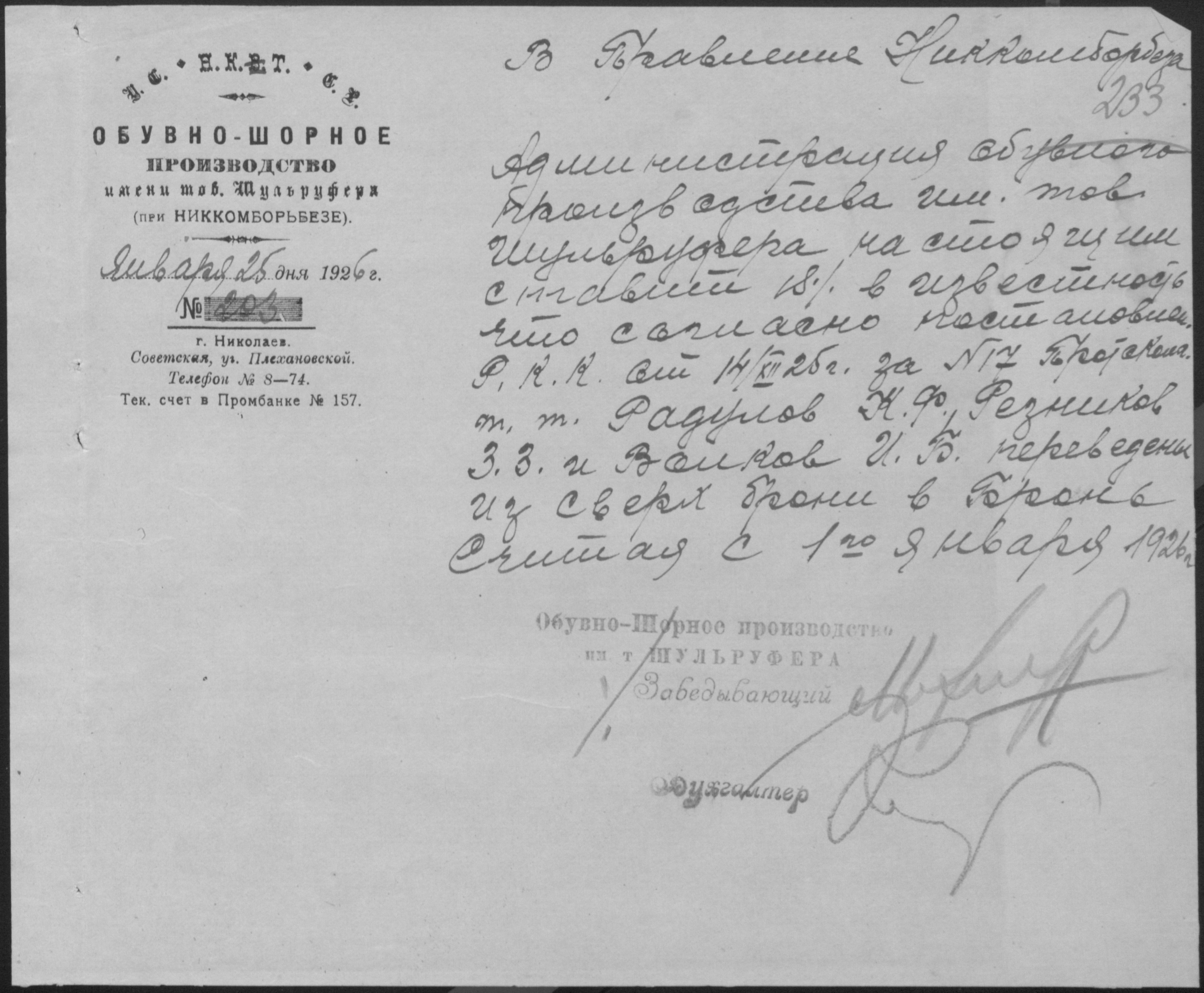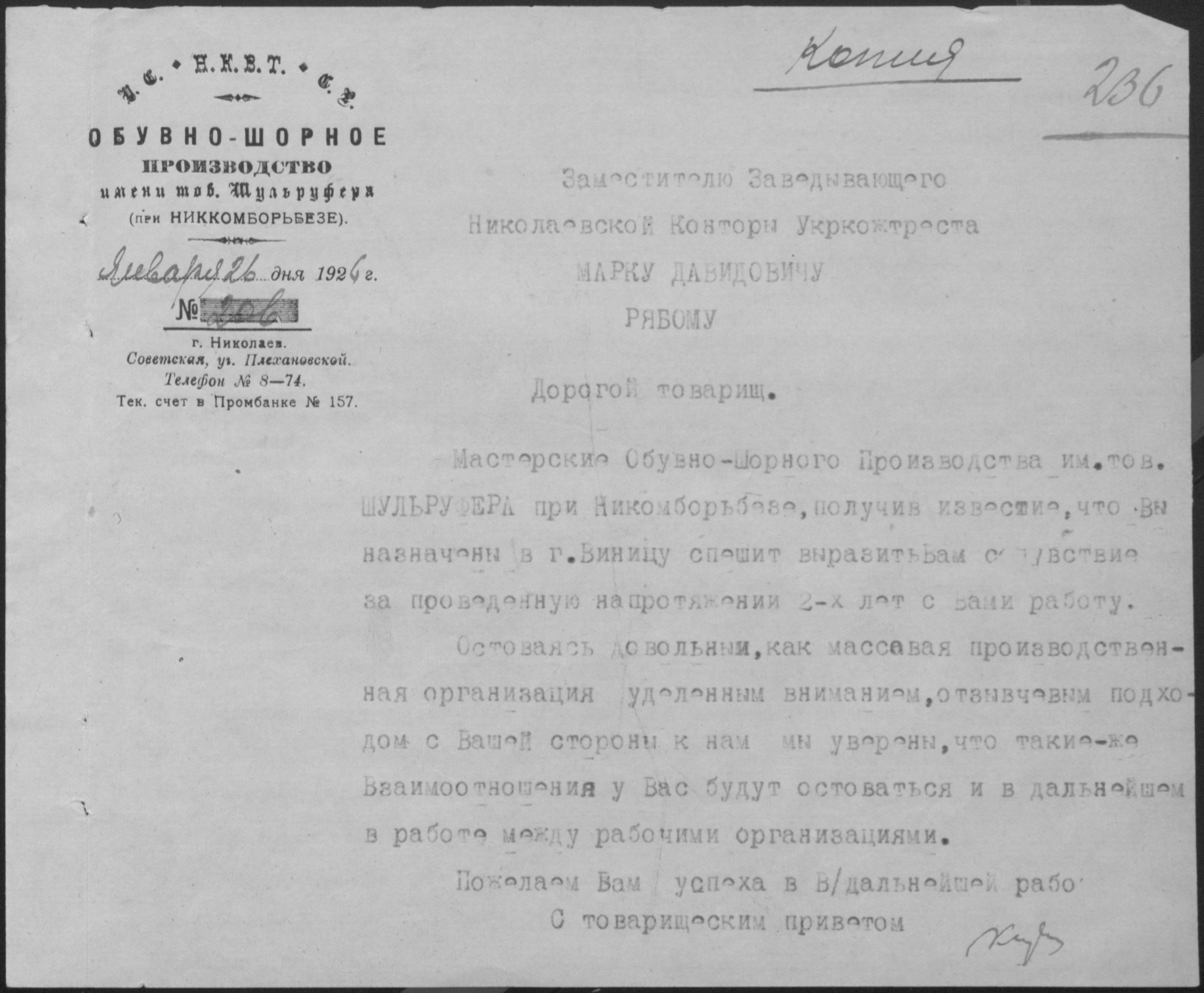 ◦ ◦ Фонд № Р-492 “Взуттєво-лимарна майстерня ім. Шульруфера колективу безробітних при Миколаївському окружному комітеті по боротьбі з безробіттям”