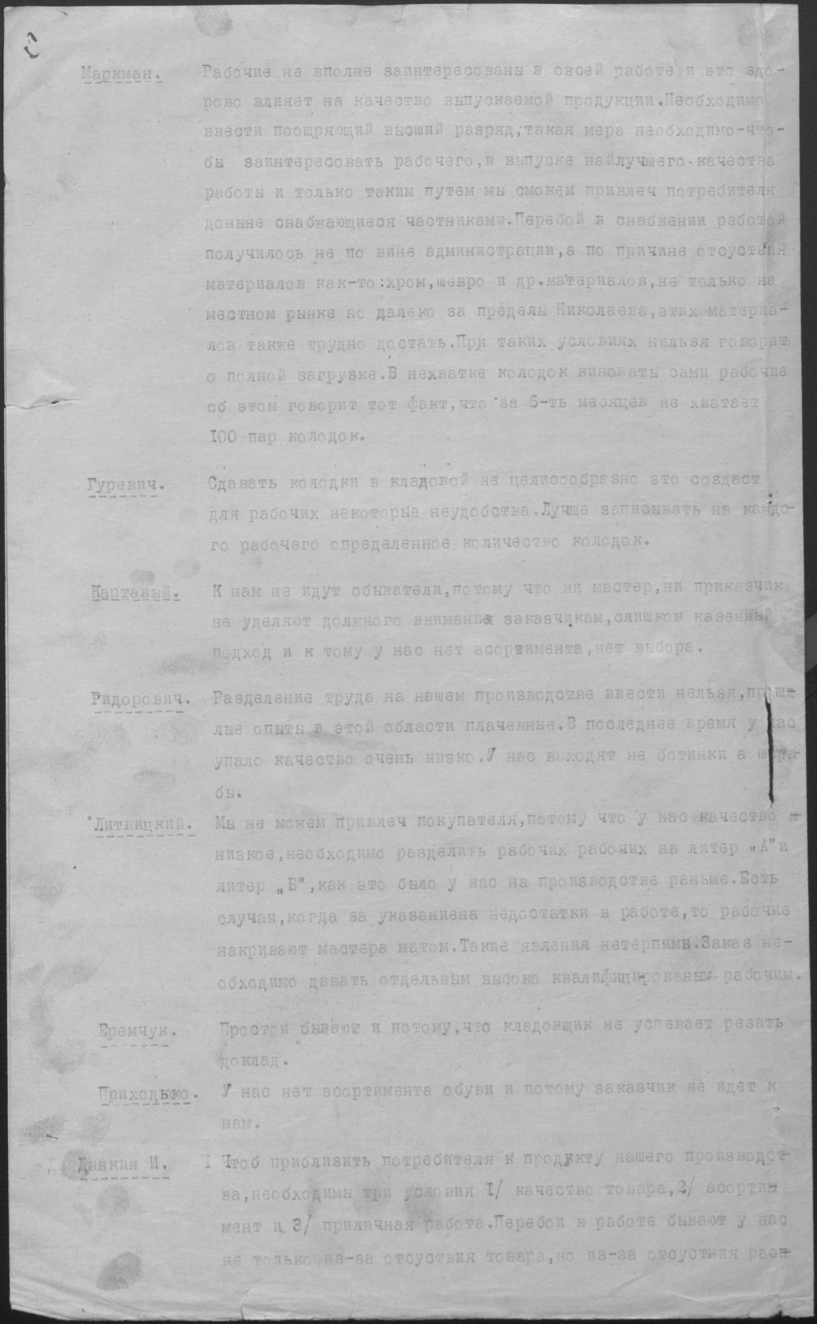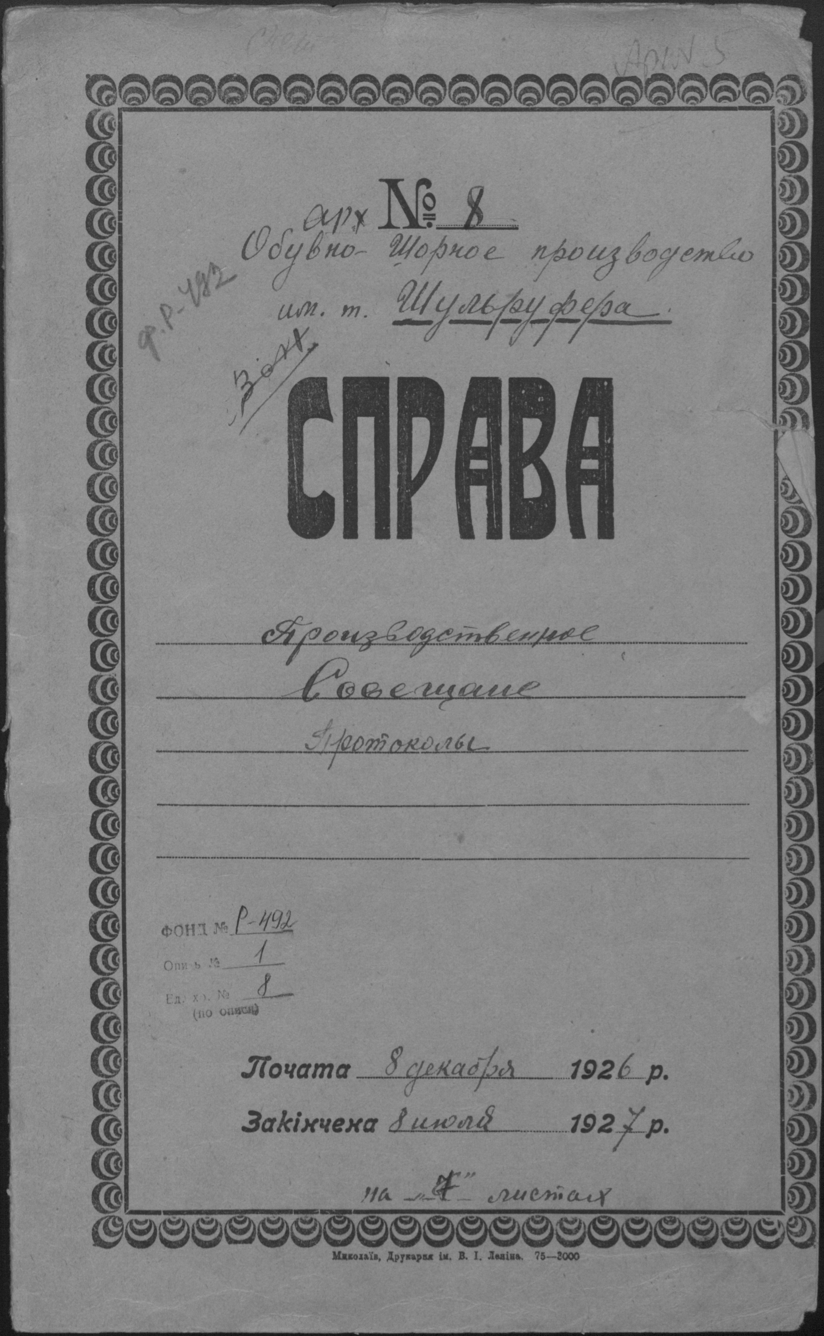 ◦ ◦ Фонд № Р-492 “Взуттєво-лимарна майстерня ім. Шульруфера колективу безробітних при Миколаївському окружному комітеті по боротьбі з безробіттям”