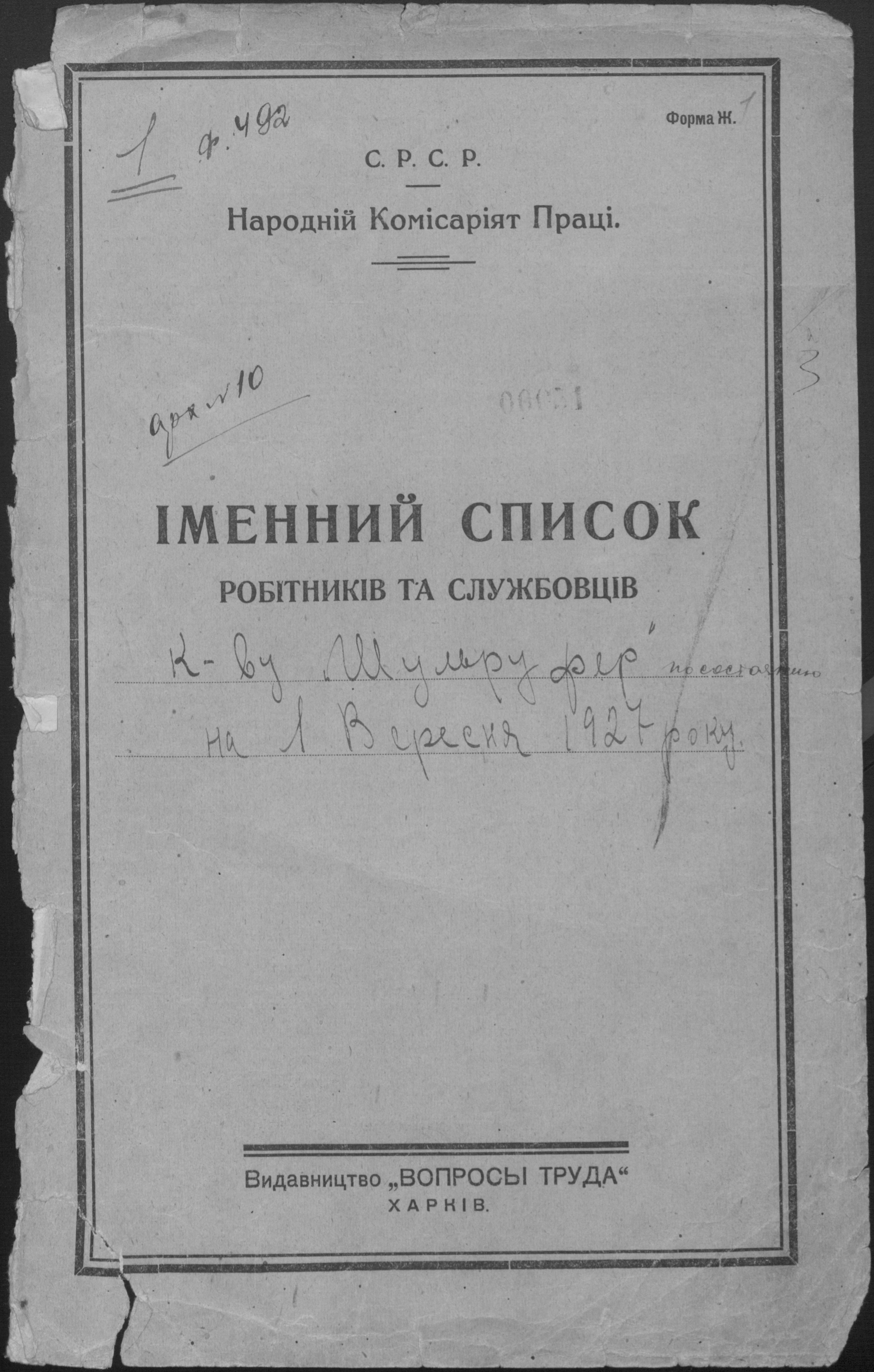 ◦ ◦ Фонд № Р-492 “Взуттєво-лимарна майстерня ім. Шульруфера колективу безробітних при Миколаївському окружному комітеті по боротьбі з безробіттям”
