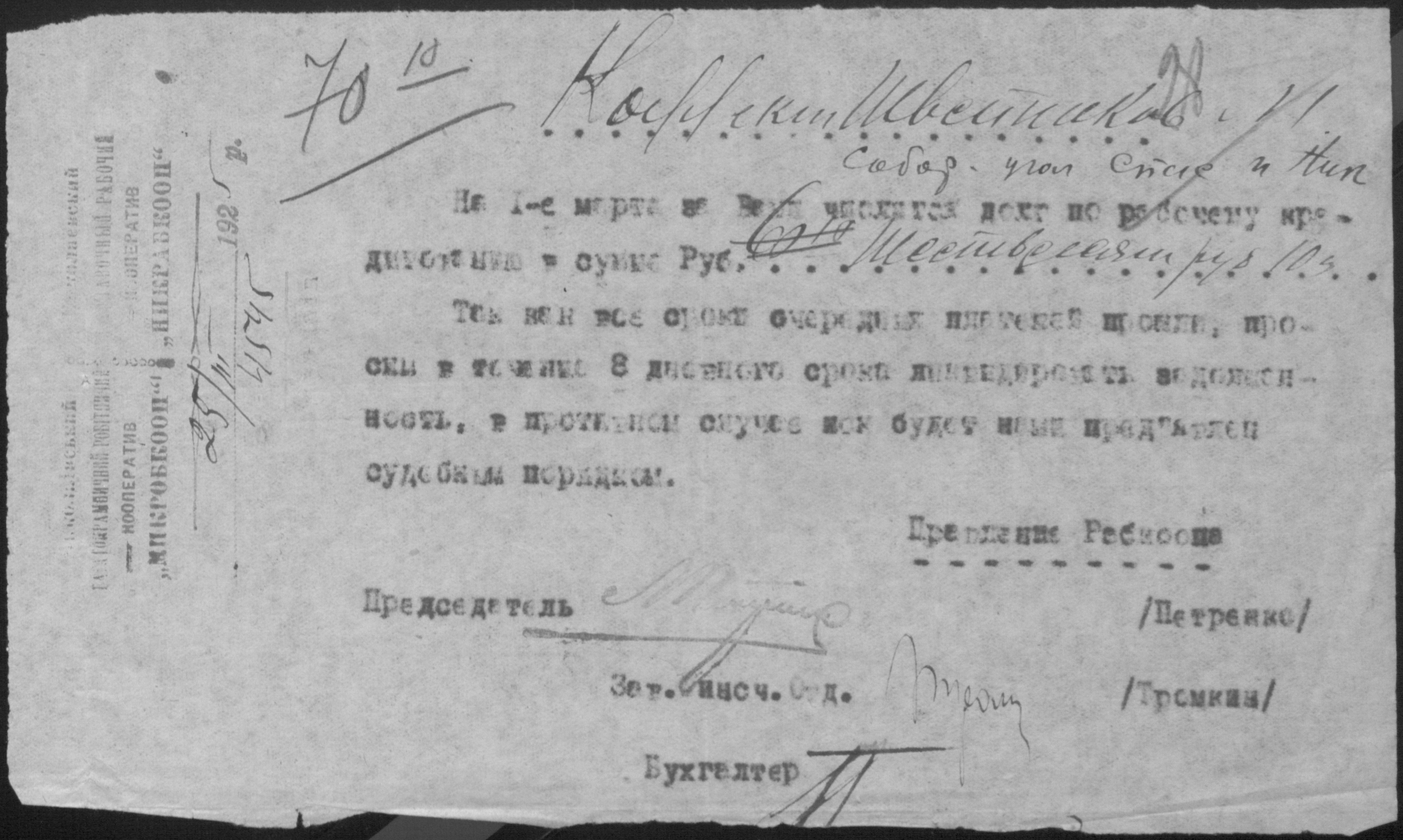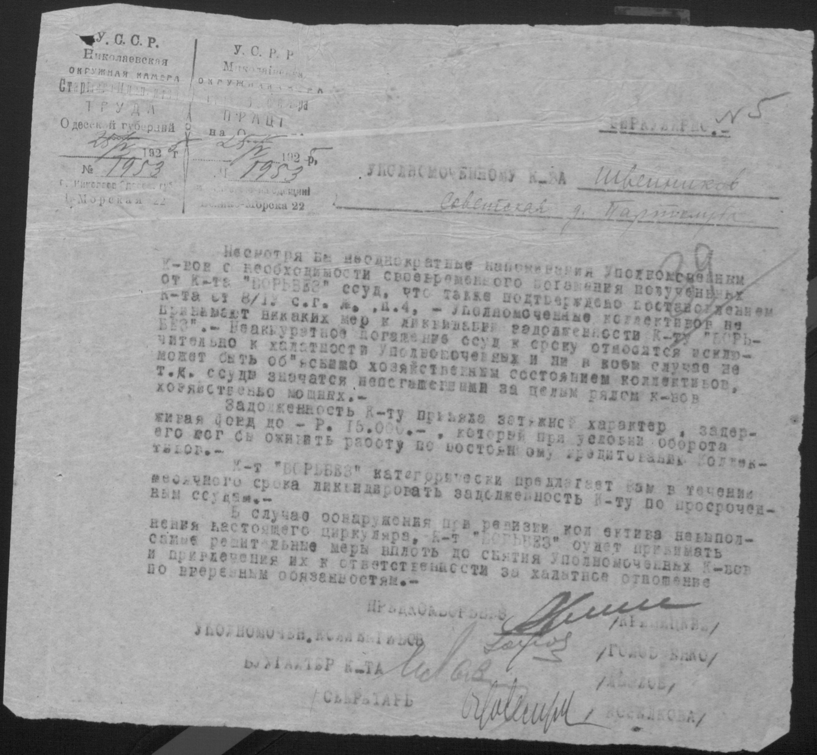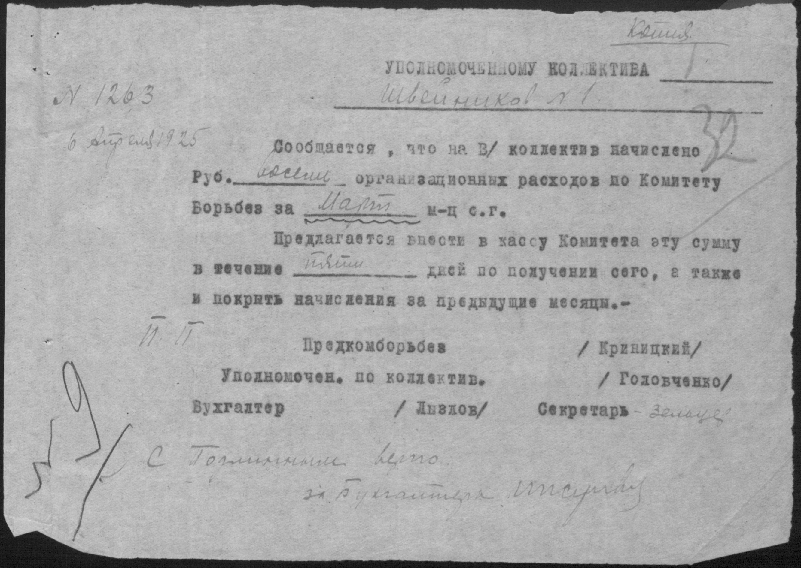 • • • • Справа № 9 “Листування з головою Миккомборбезу з виробничих і господарських питань. Акти обстеження виробів колективу”
