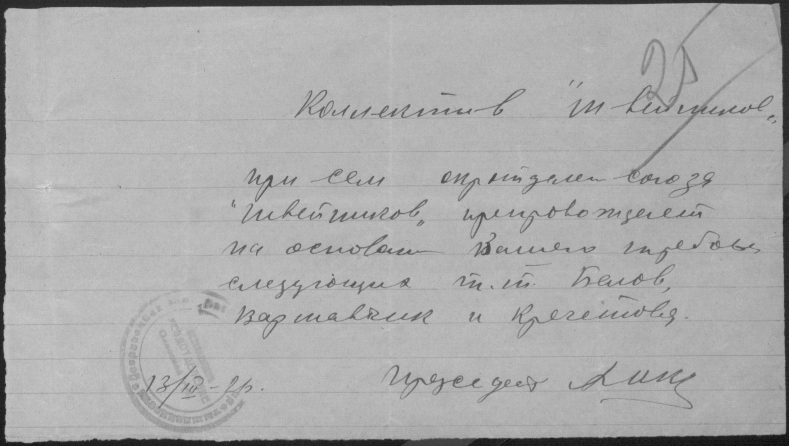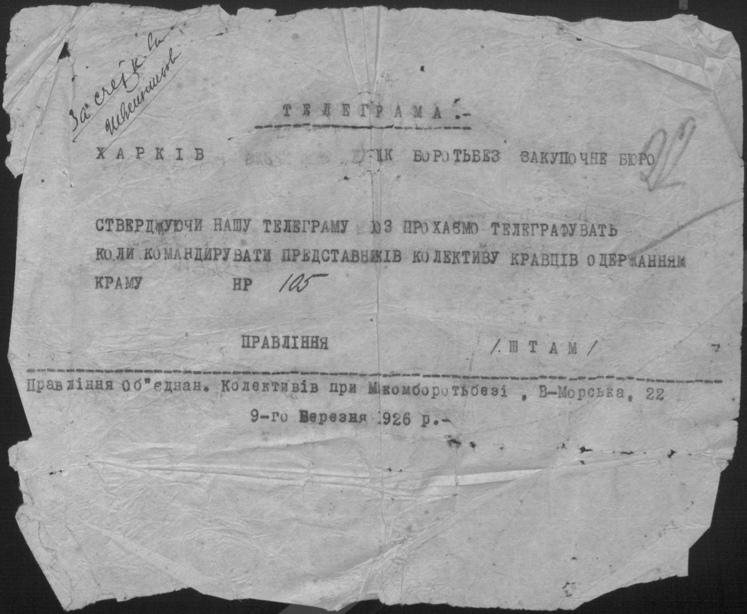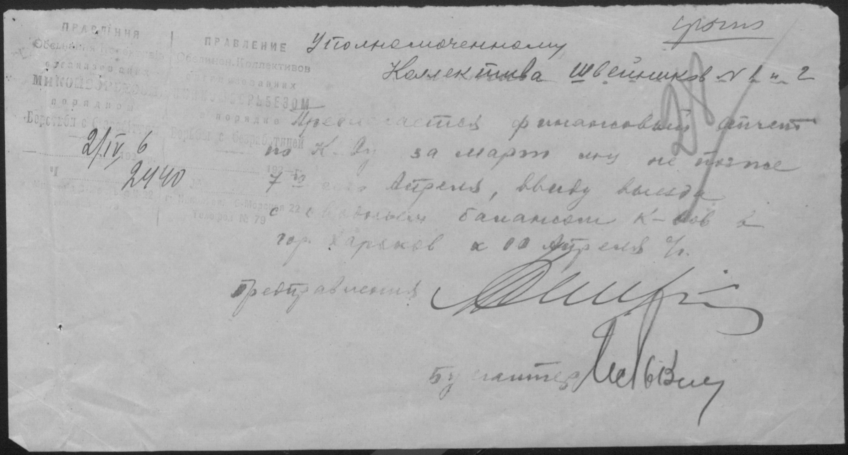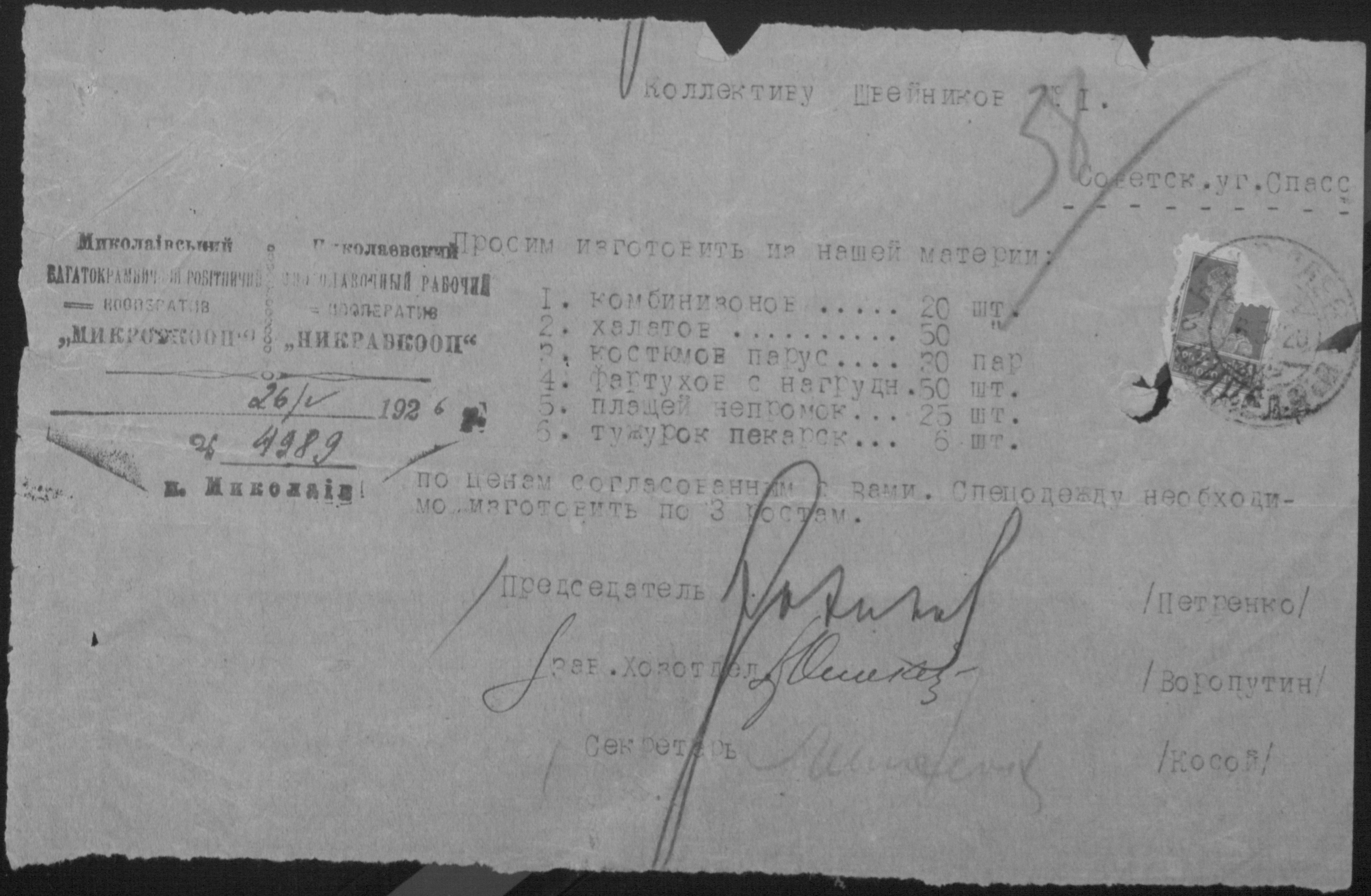 • • • • Справа № 15 “Листування з правлінням об’єднання колективів безробітних при Миккомборбезі та окружним фінансовим відділом з виробничих, господарських і фінансових питань. Листування з замовниками про пошиття виробів. Відомості про соціальний і професійний склад і трудовий стаж членів колективу”