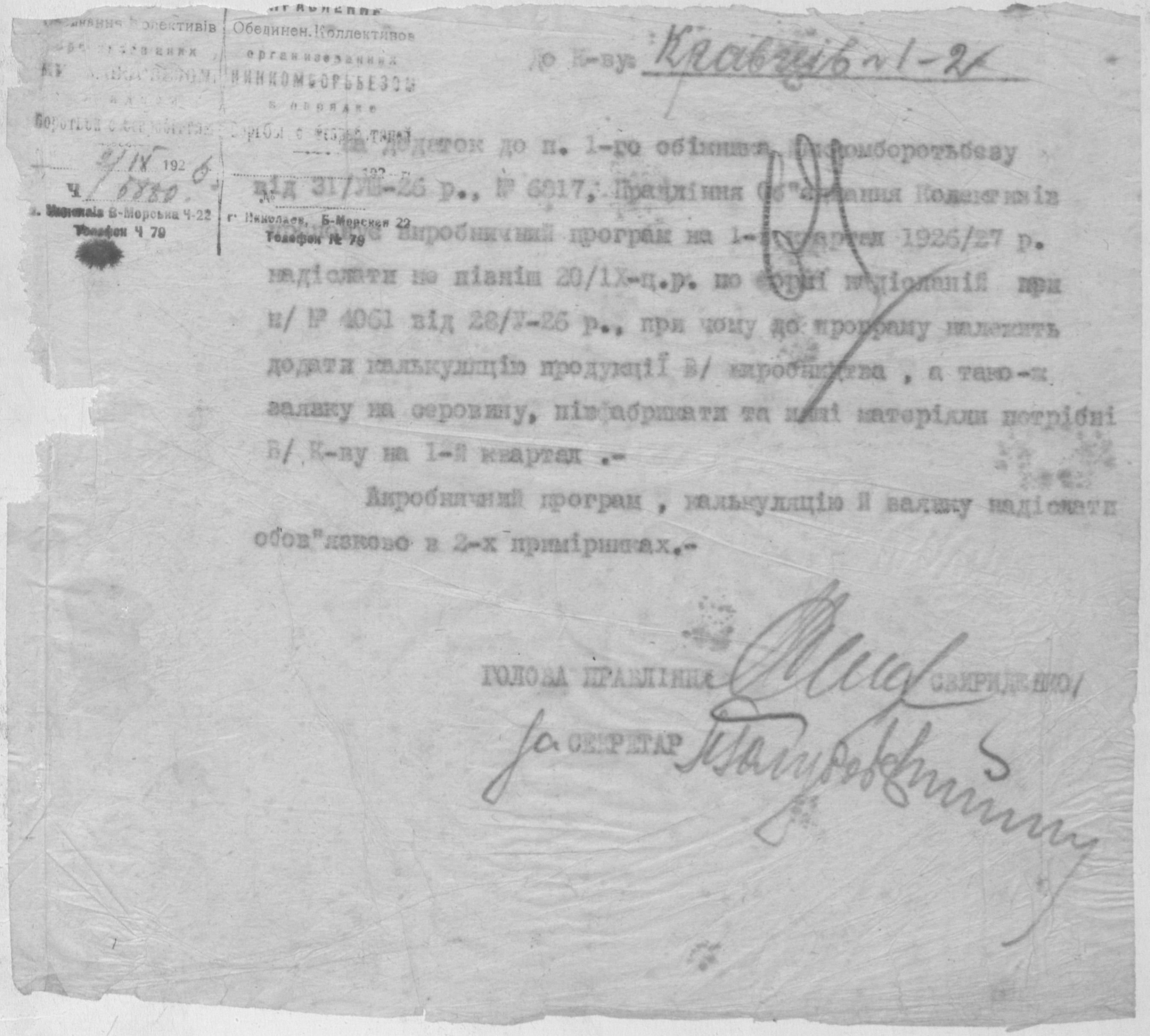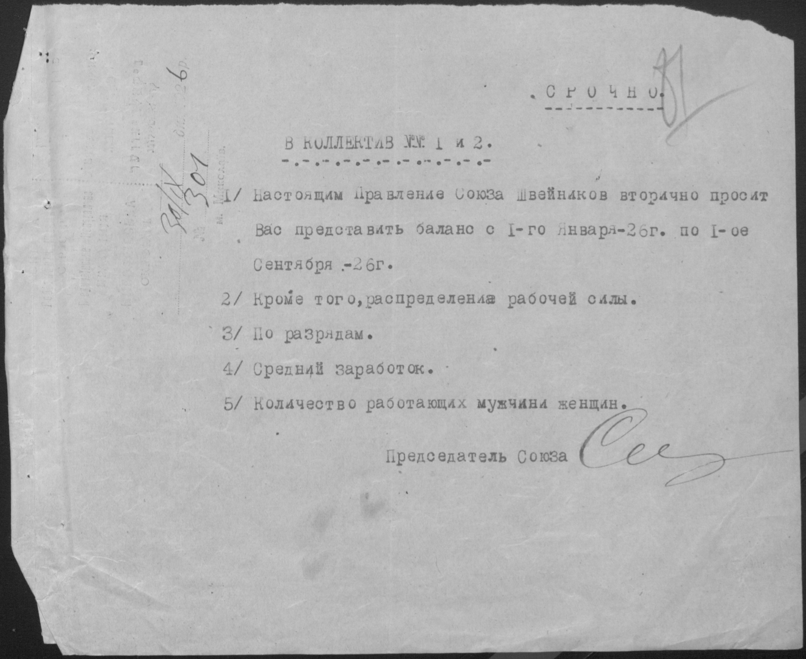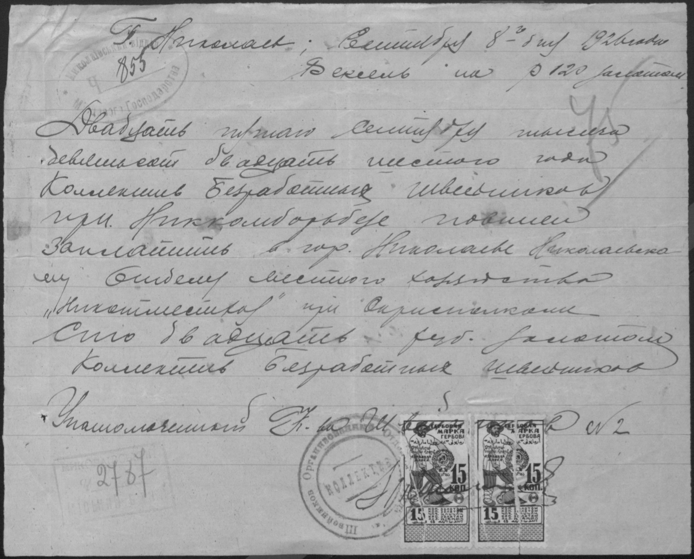 • • • • Справа № 15 “Листування з правлінням об’єднання колективів безробітних при Миккомборбезі та окружним фінансовим відділом з виробничих, господарських і фінансових питань. Листування з замовниками про пошиття виробів. Відомості про соціальний і професійний склад і трудовий стаж членів колективу”