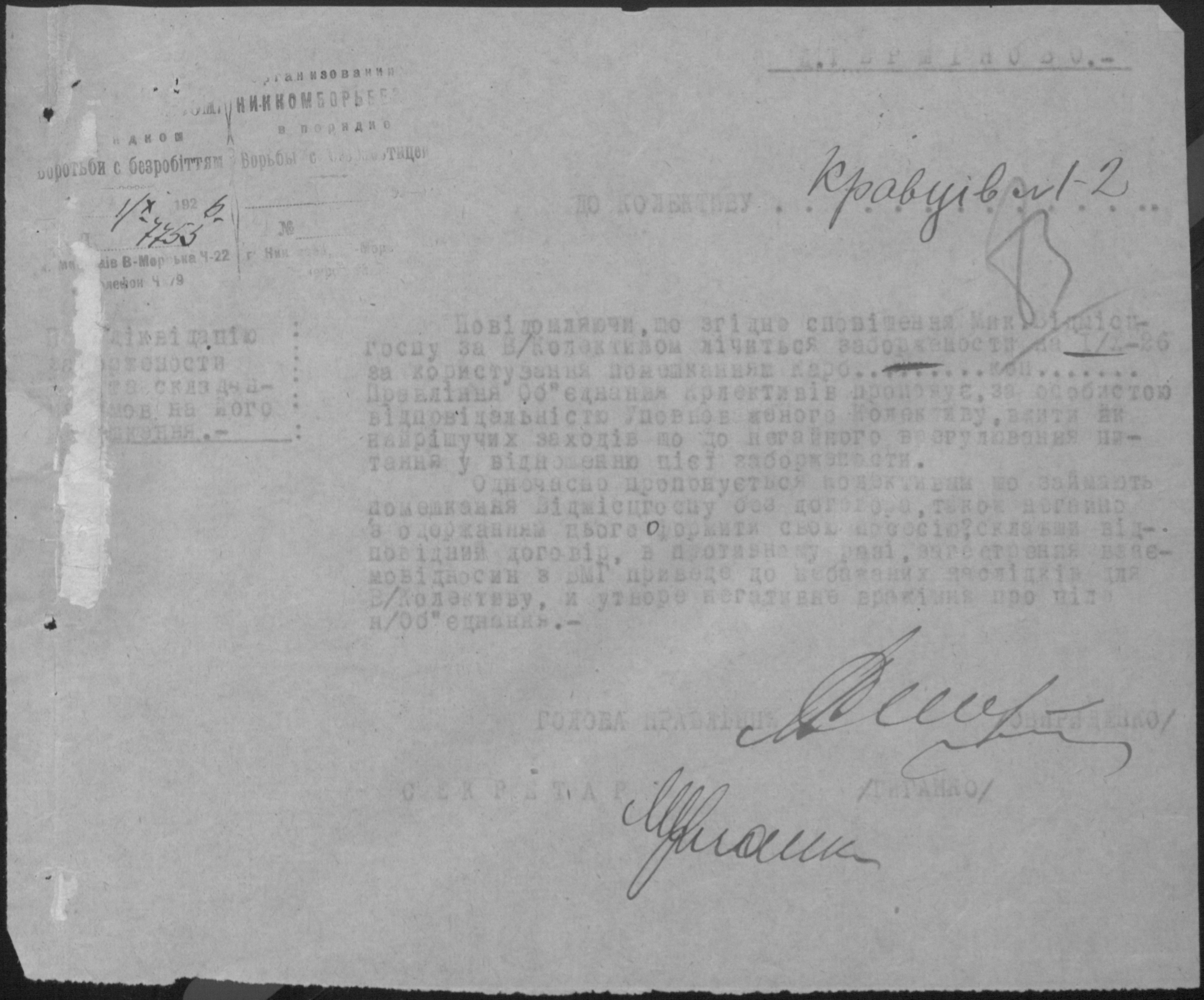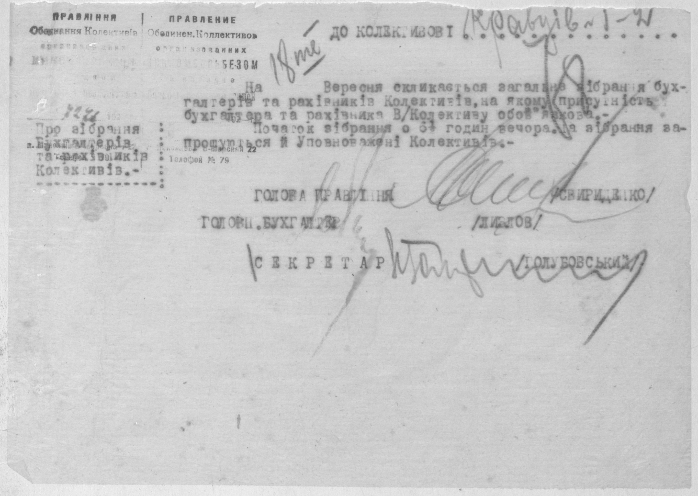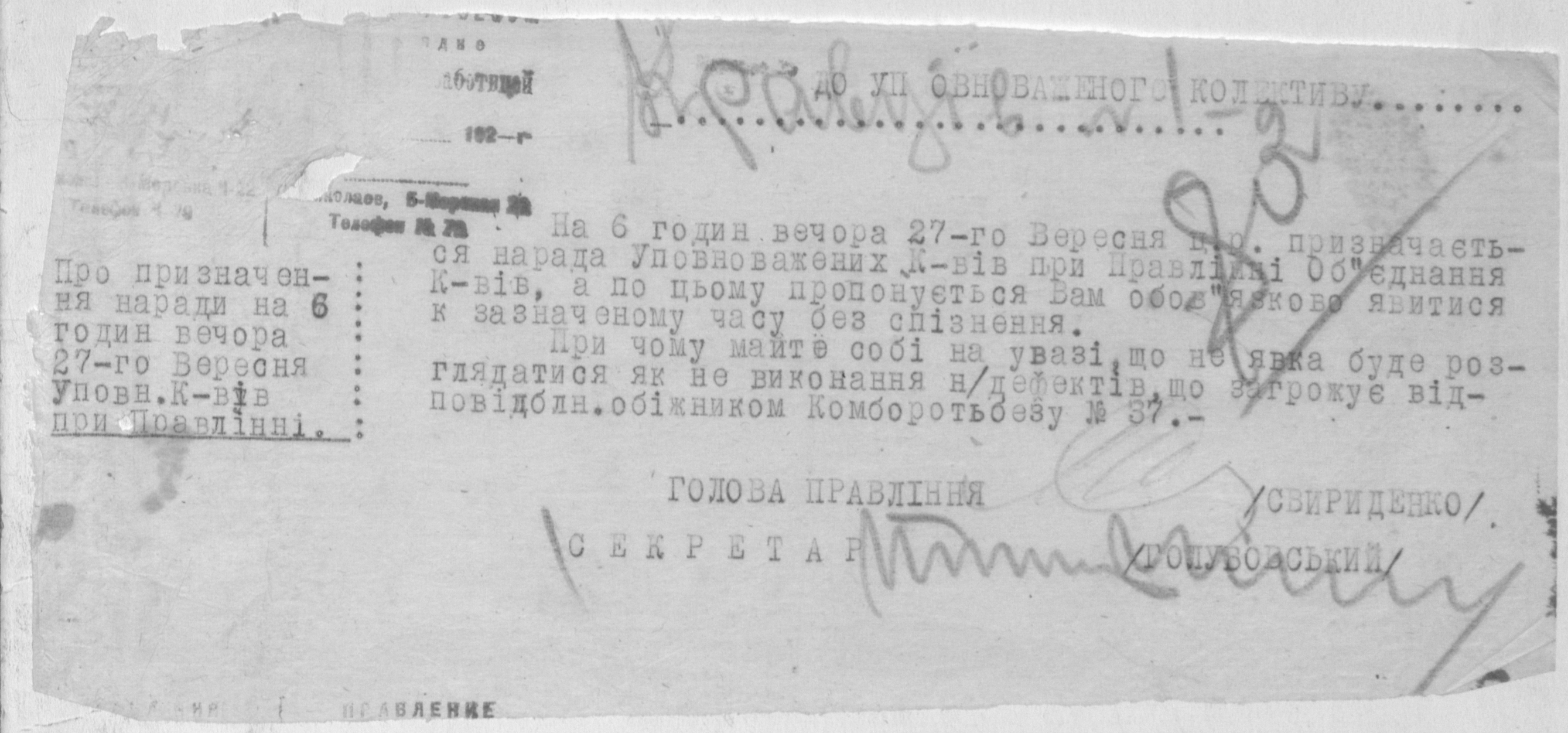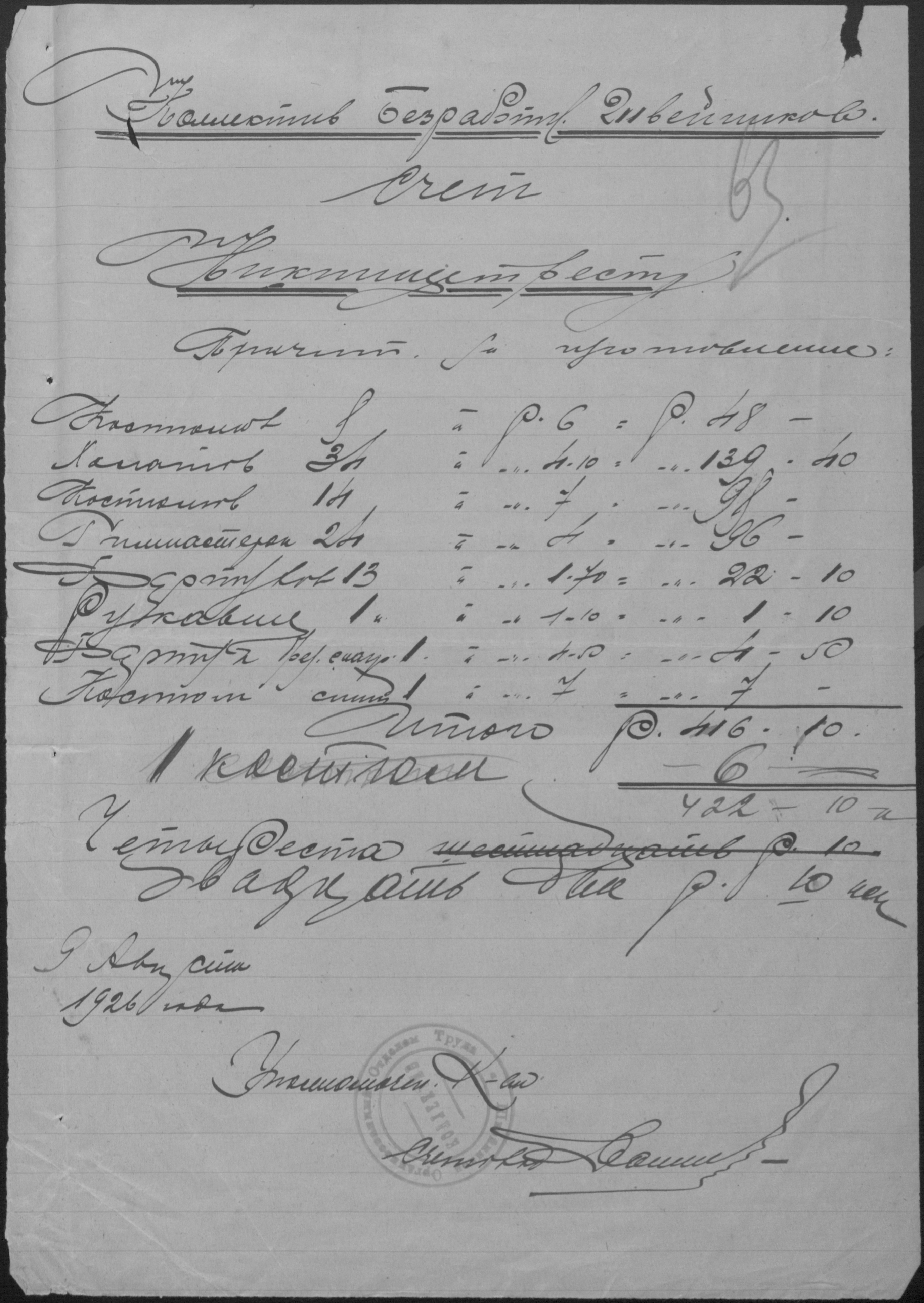 • • • • Справа № 15 “Листування з правлінням об’єднання колективів безробітних при Миккомборбезі та окружним фінансовим відділом з виробничих, господарських і фінансових питань. Листування з замовниками про пошиття виробів. Відомості про соціальний і професійний склад і трудовий стаж членів колективу”