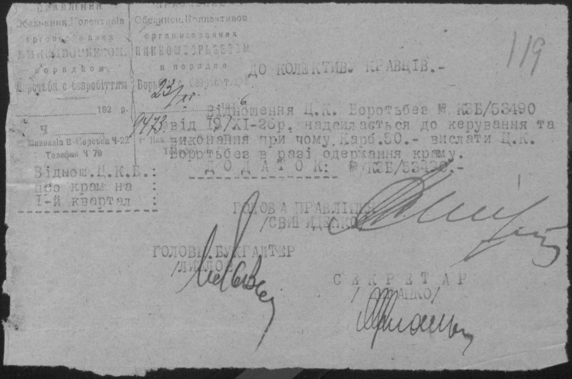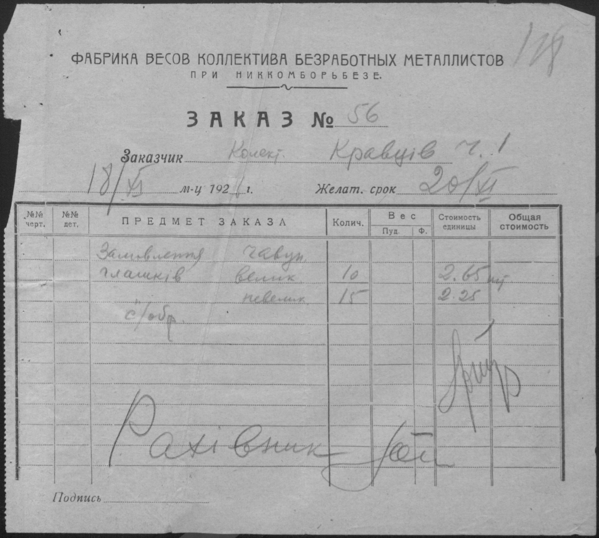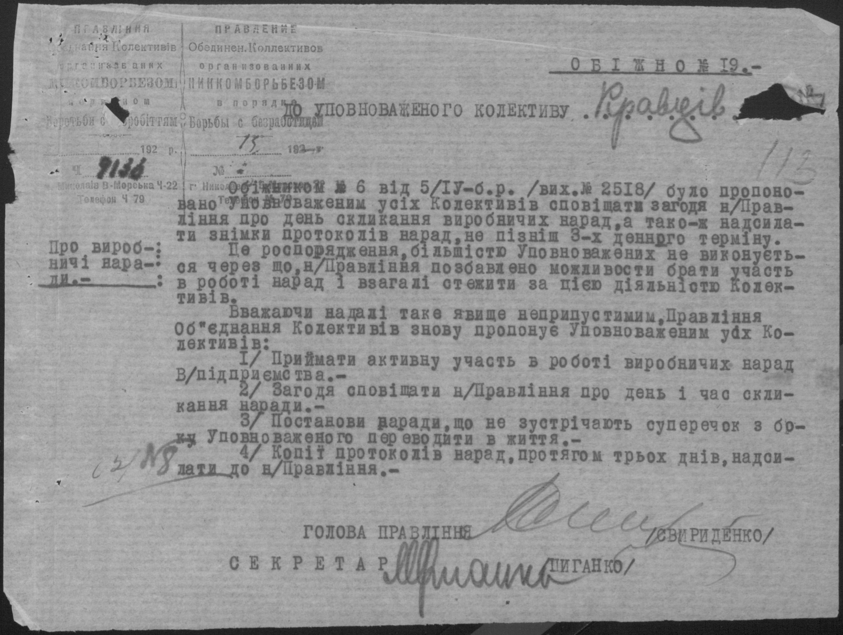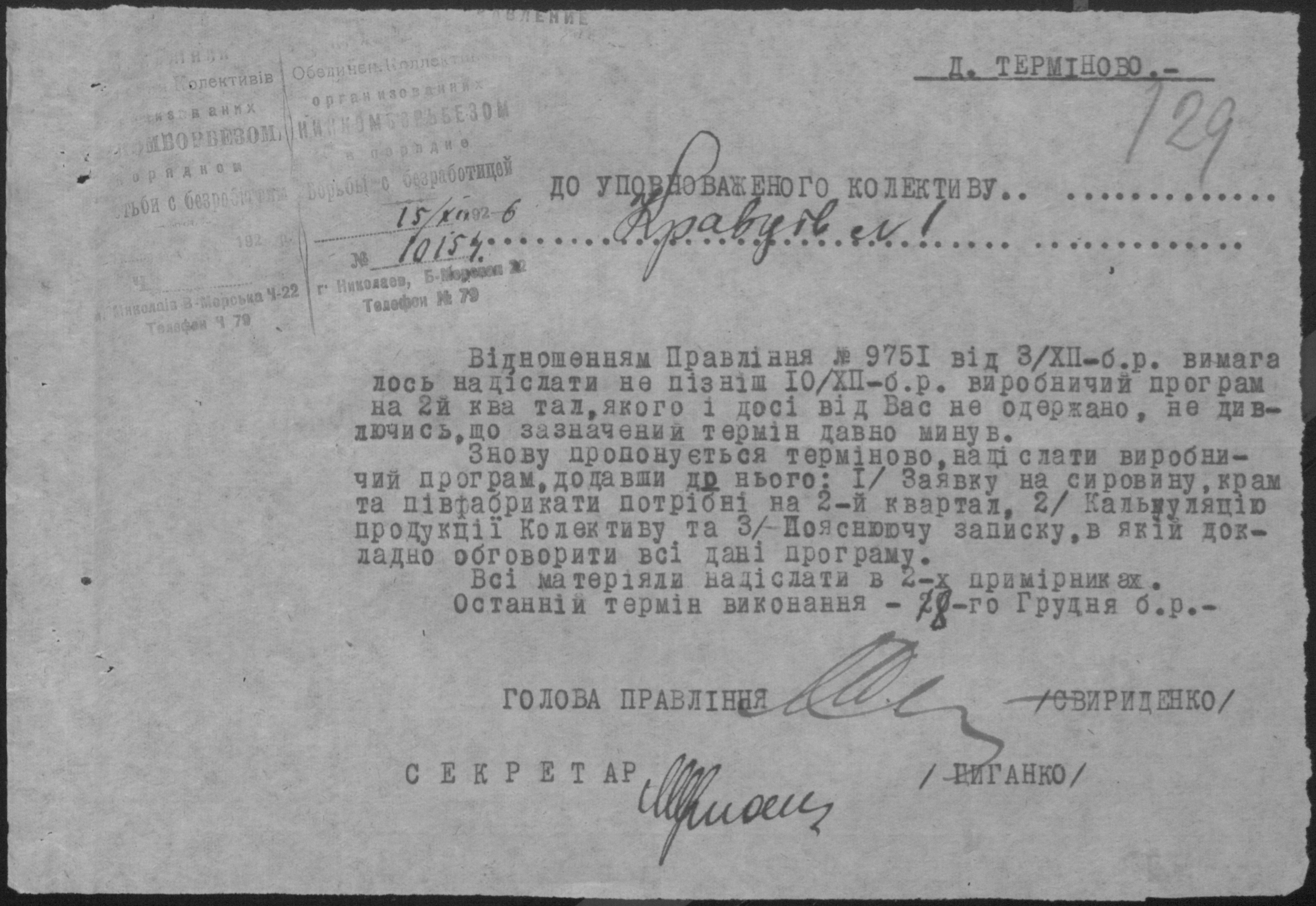 • • • • Справа № 15 “Листування з правлінням об’єднання колективів безробітних при Миккомборбезі та окружним фінансовим відділом з виробничих, господарських і фінансових питань. Листування з замовниками про пошиття виробів. Відомості про соціальний і професійний склад і трудовий стаж членів колективу”