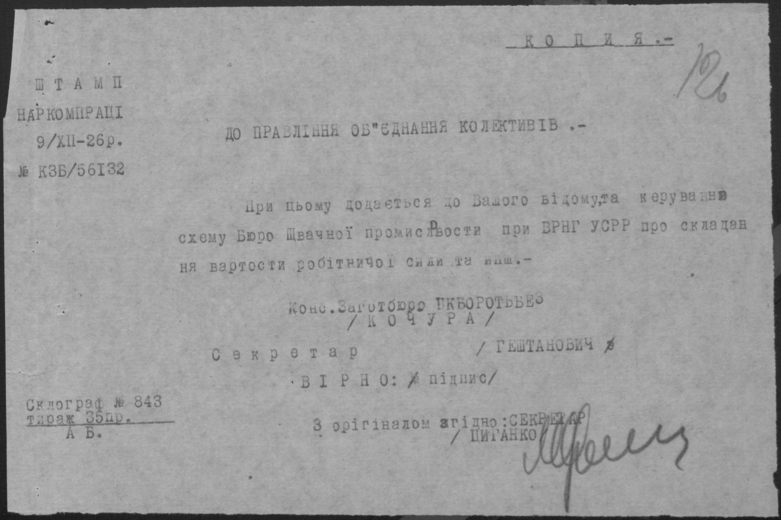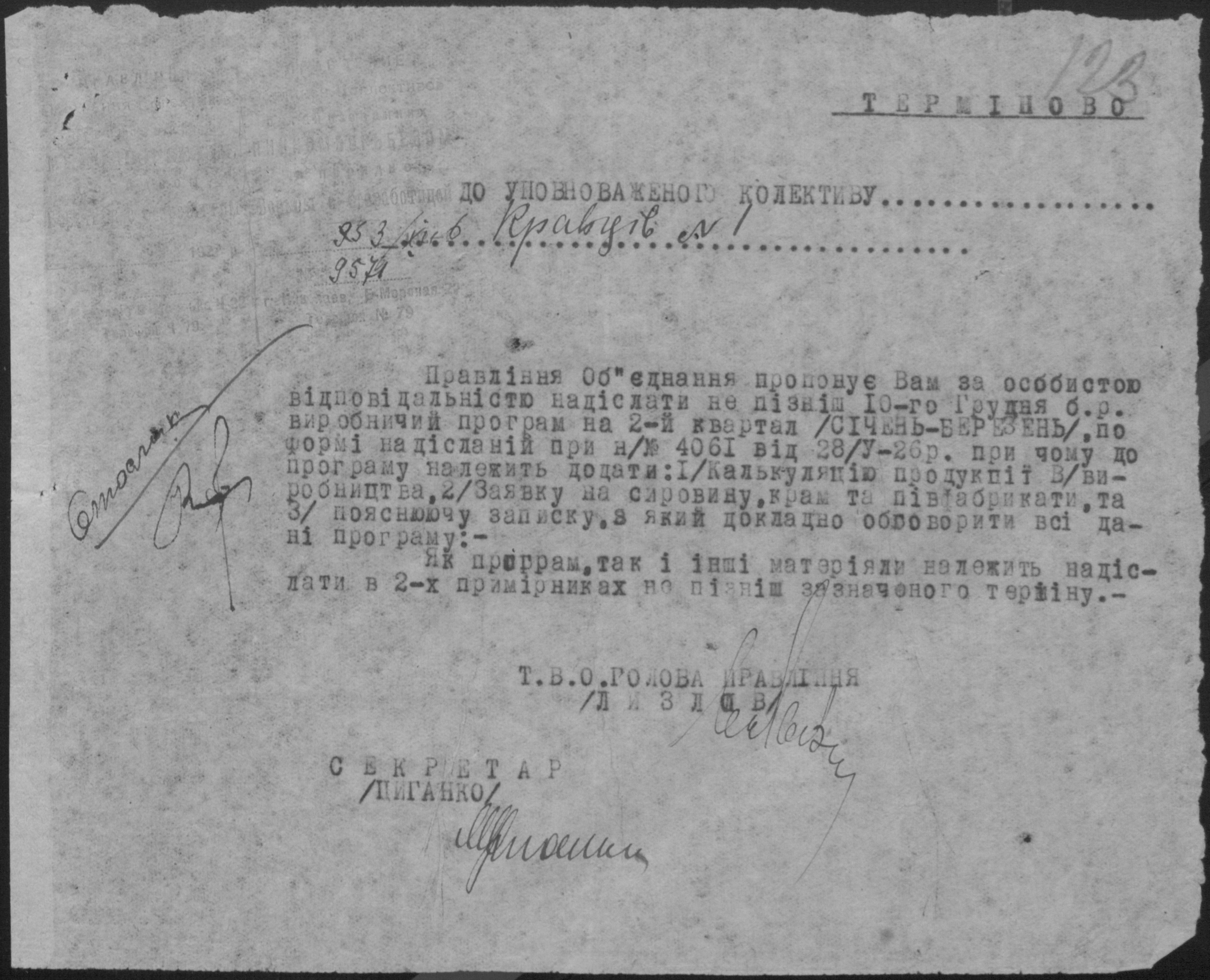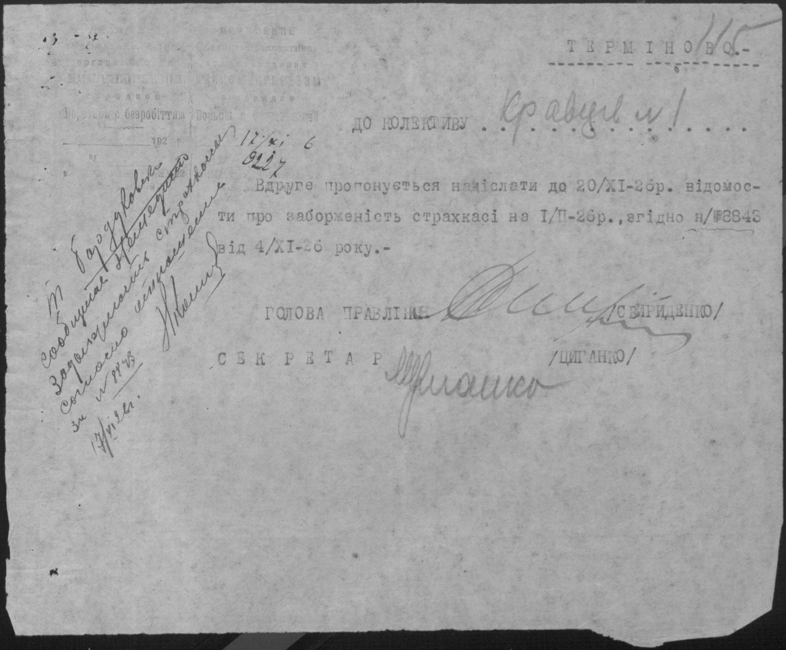 • • • • Справа № 15 “Листування з правлінням об’єднання колективів безробітних при Миккомборбезі та окружним фінансовим відділом з виробничих, господарських і фінансових питань. Листування з замовниками про пошиття виробів. Відомості про соціальний і професійний склад і трудовий стаж членів колективу”