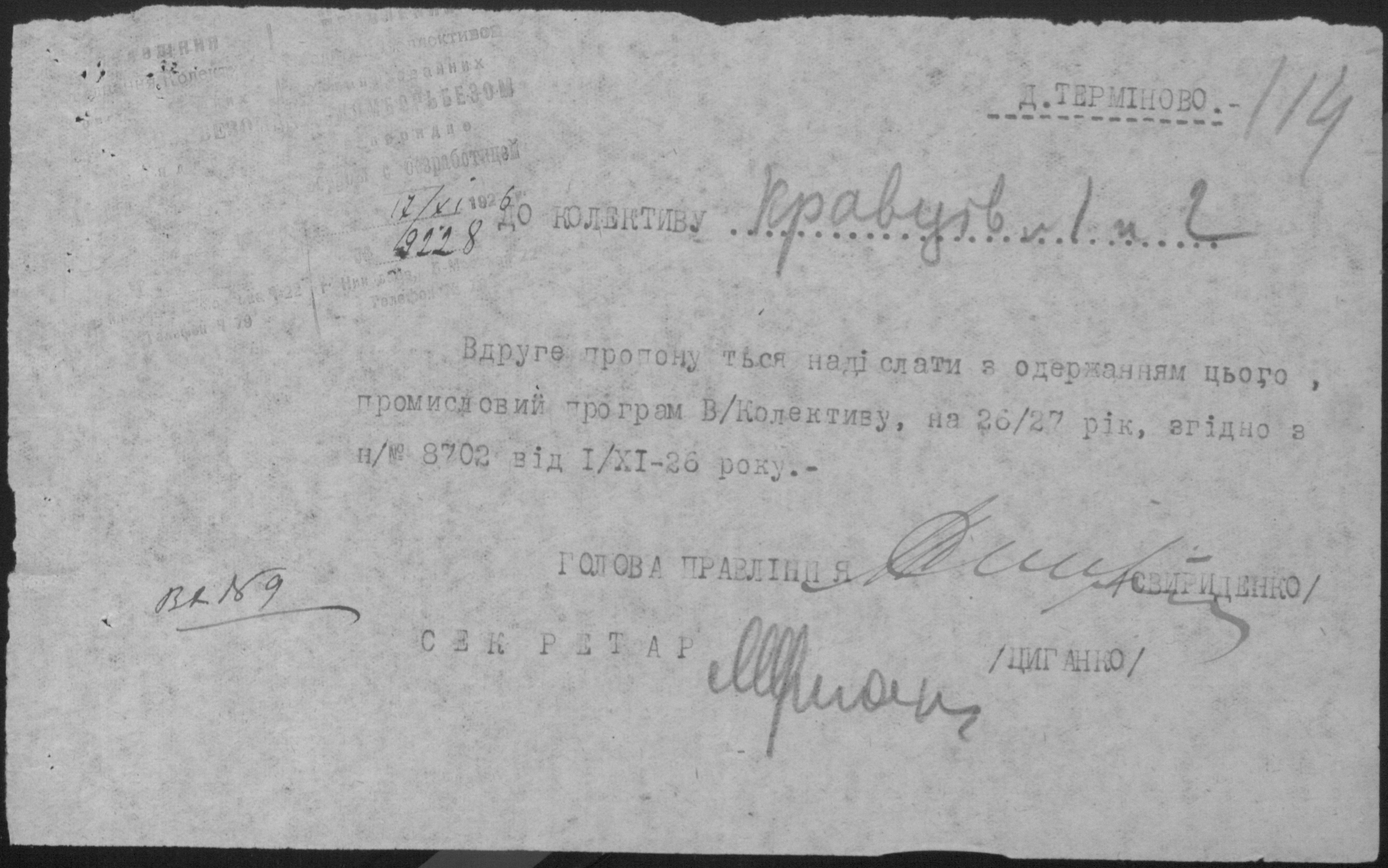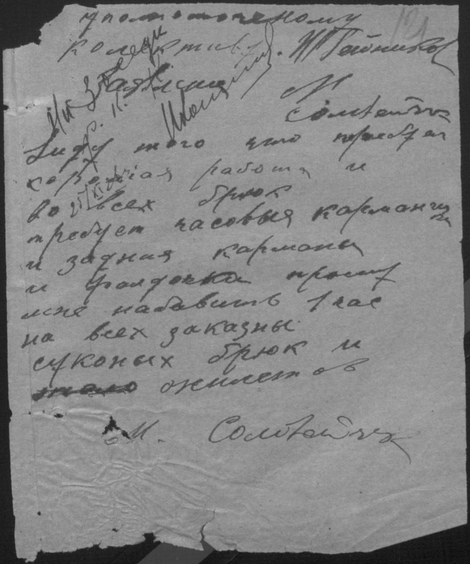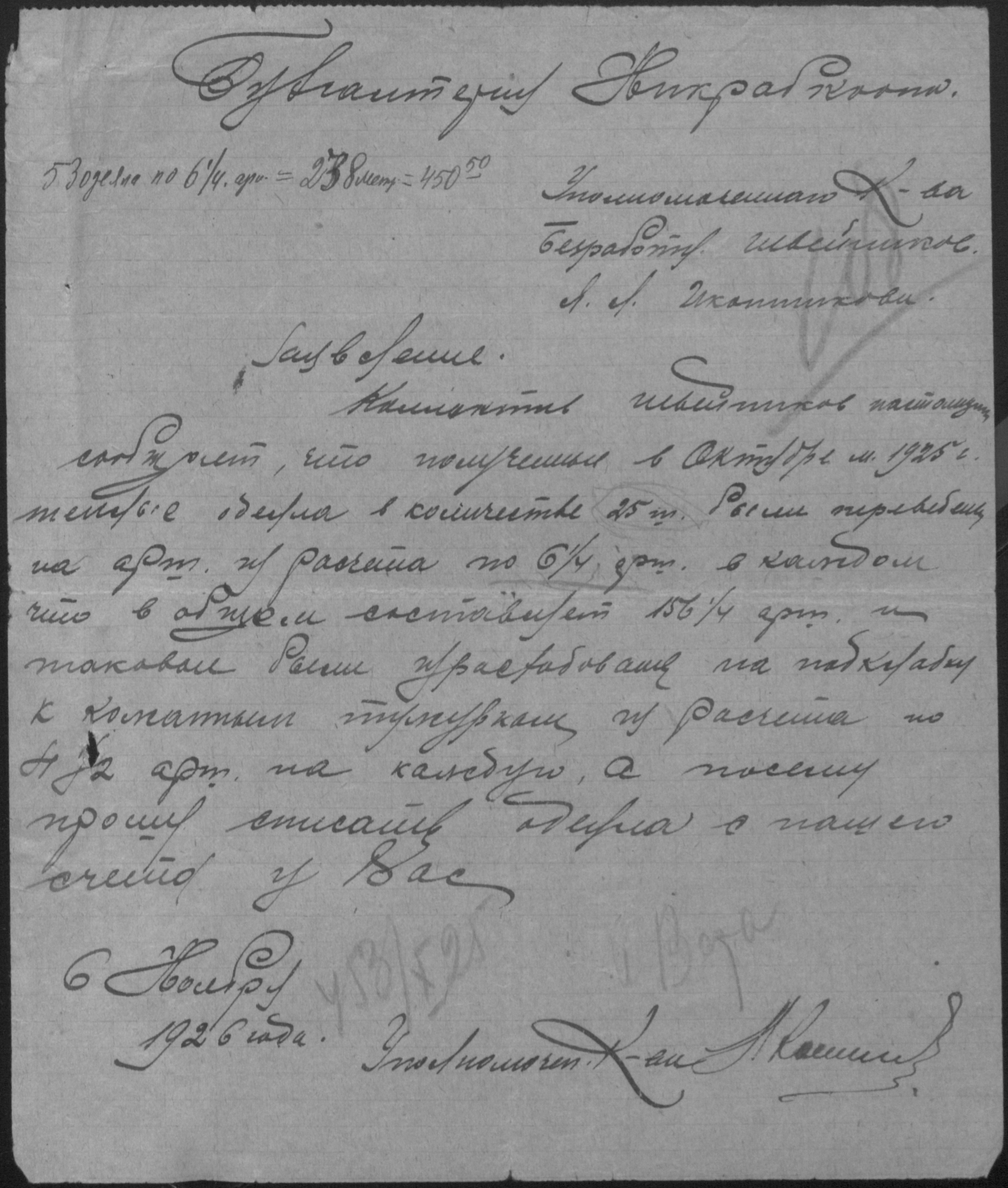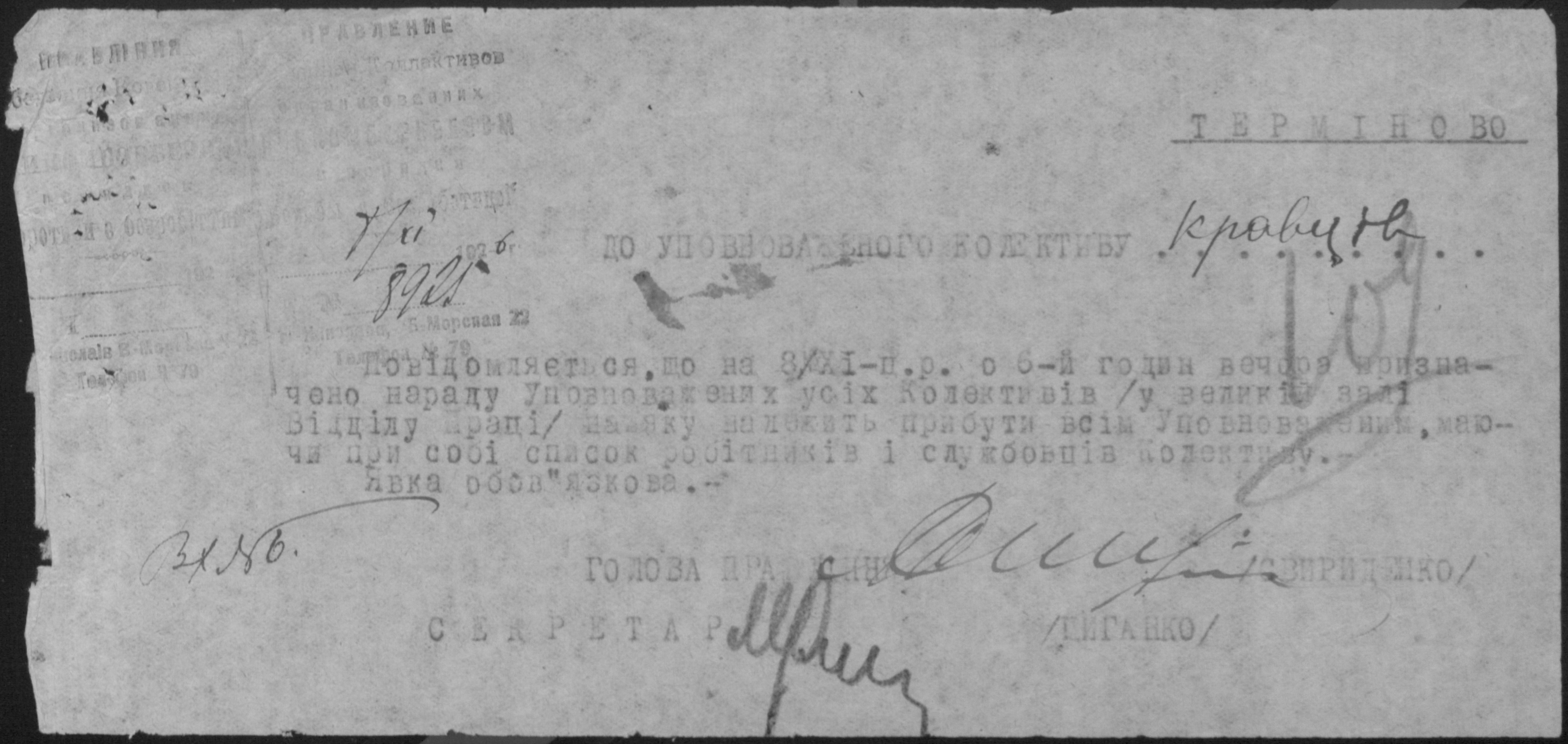 • • • • Справа № 15 “Листування з правлінням об’єднання колективів безробітних при Миккомборбезі та окружним фінансовим відділом з виробничих, господарських і фінансових питань. Листування з замовниками про пошиття виробів. Відомості про соціальний і професійний склад і трудовий стаж членів колективу”