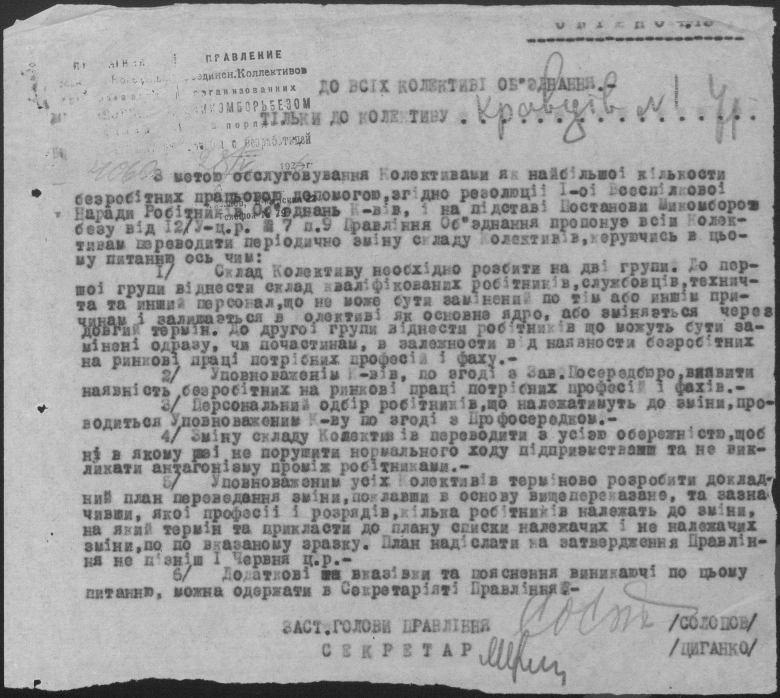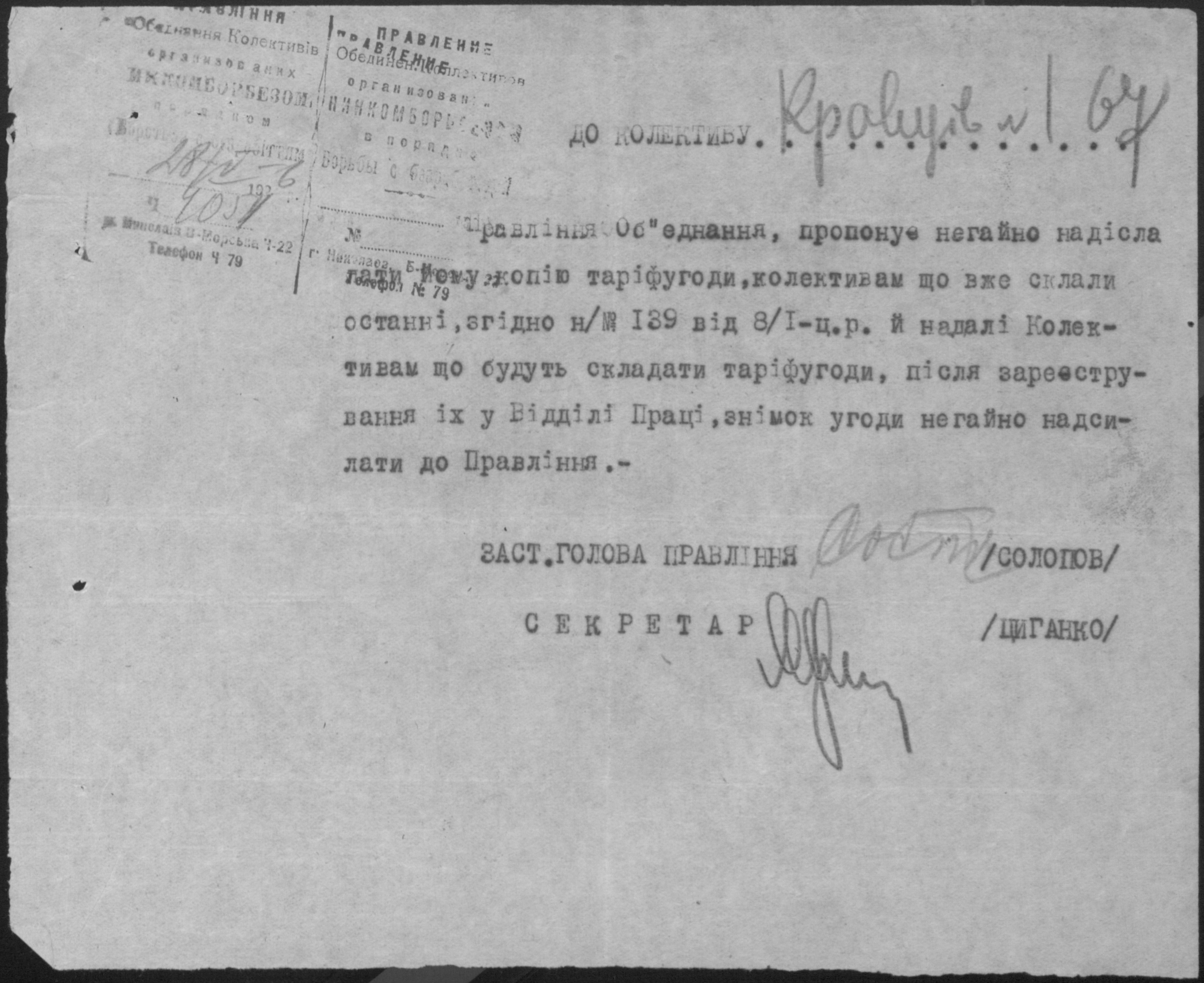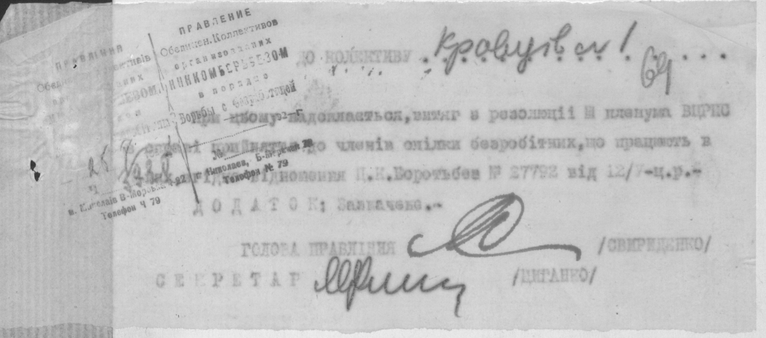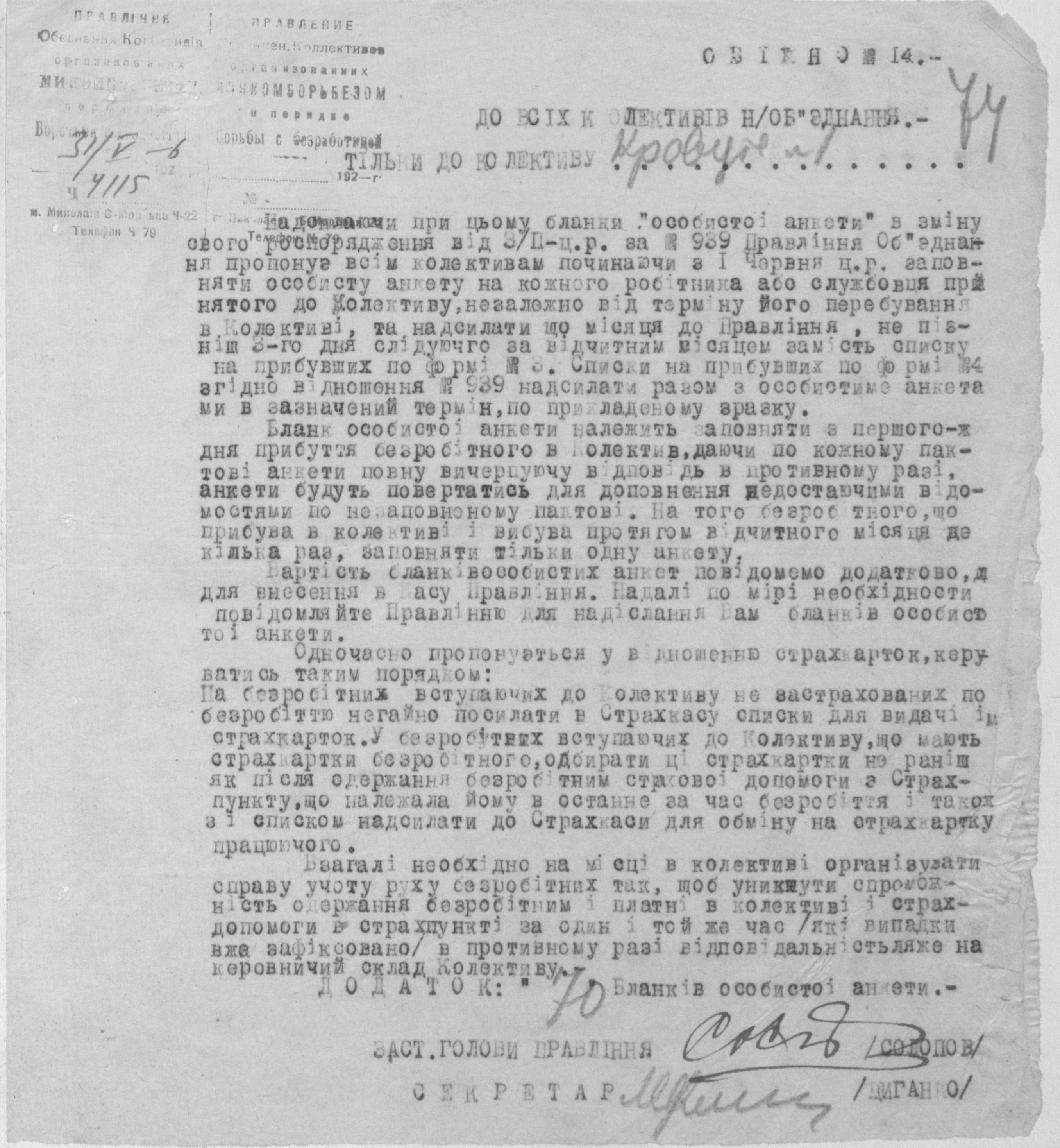 • • • • Справа № 16 “Обіжник Народного комісаріату праці УРСР про надсилання виробничого плану колективів. Листування з правлінням об’єднання колективів безробітних при Миккомборбезі з виробничих і господарських питань. Витяги з протоколу засідань Миккомборбезу. Списки керівного складу, робітників і службовців колективу”
