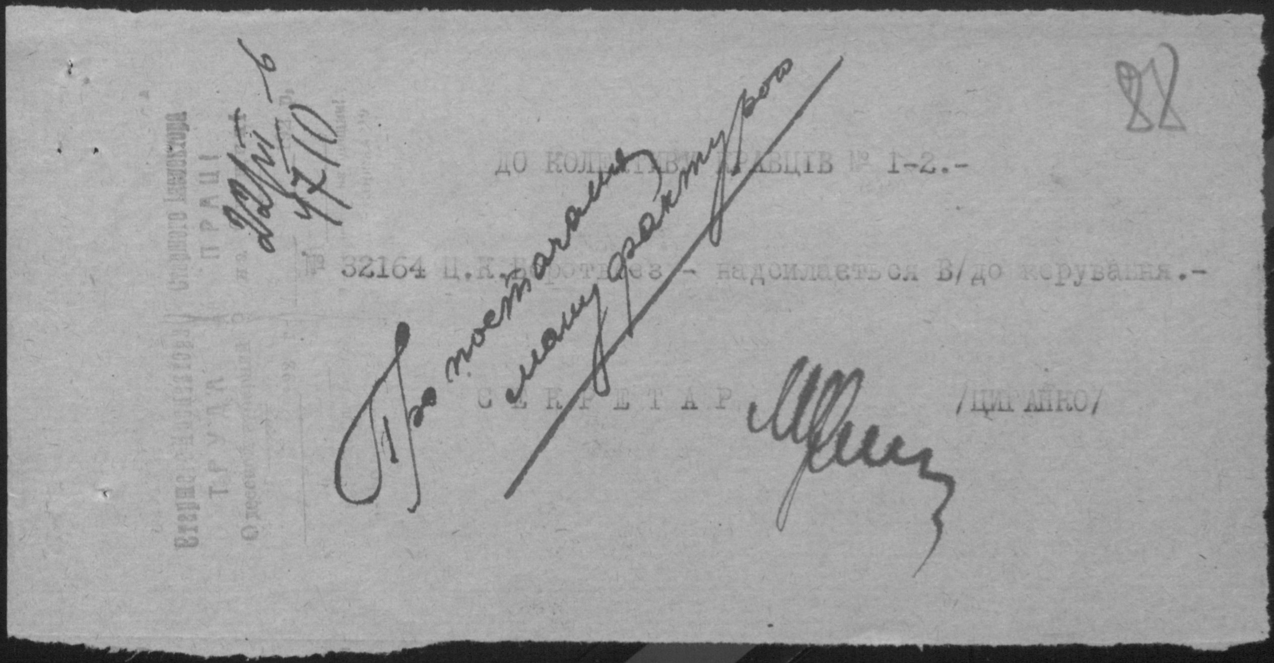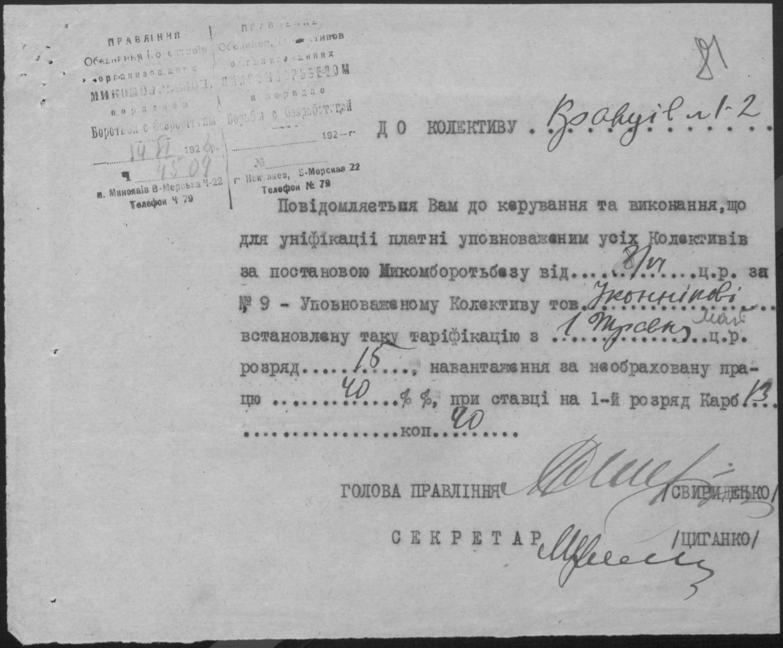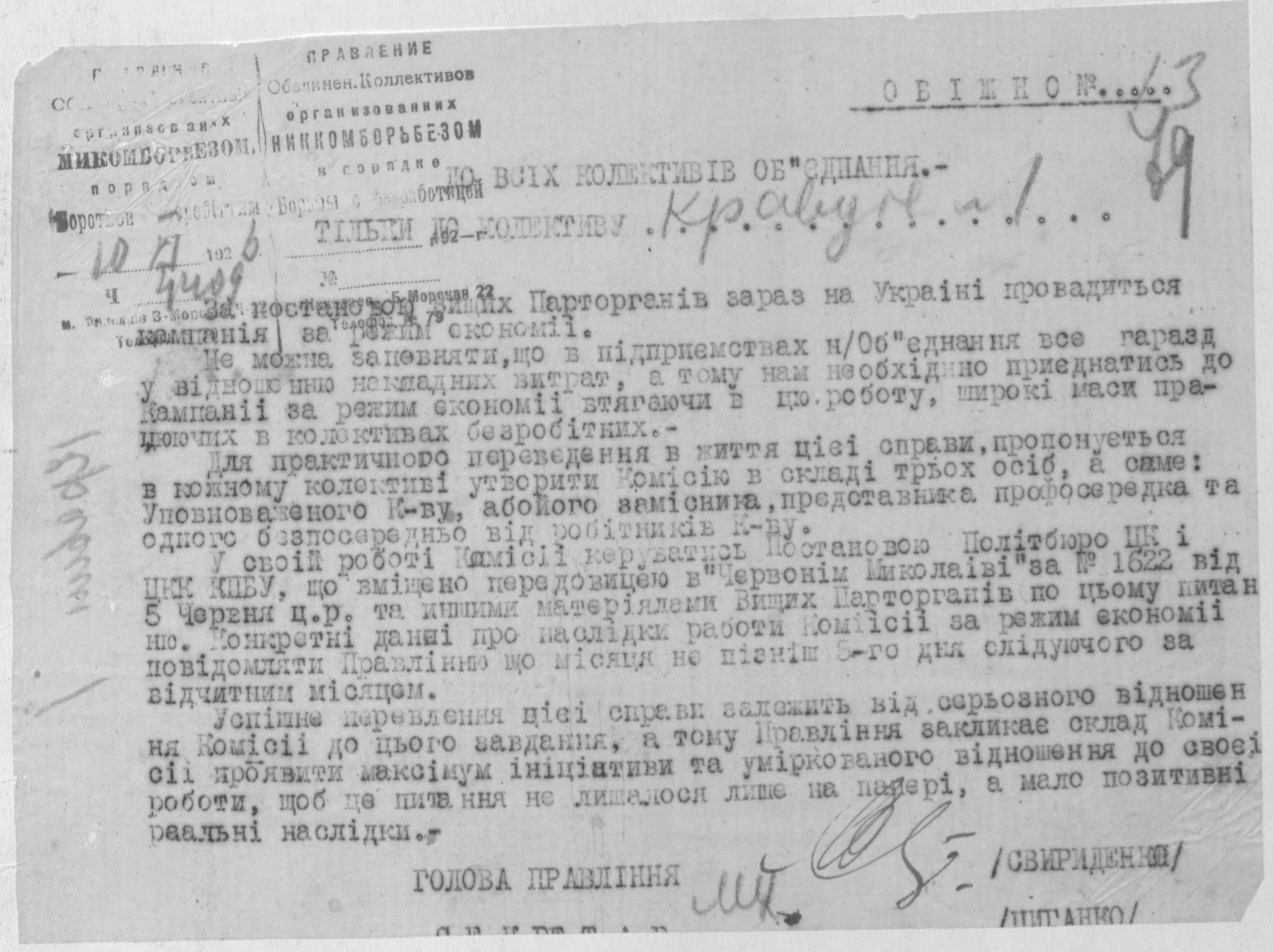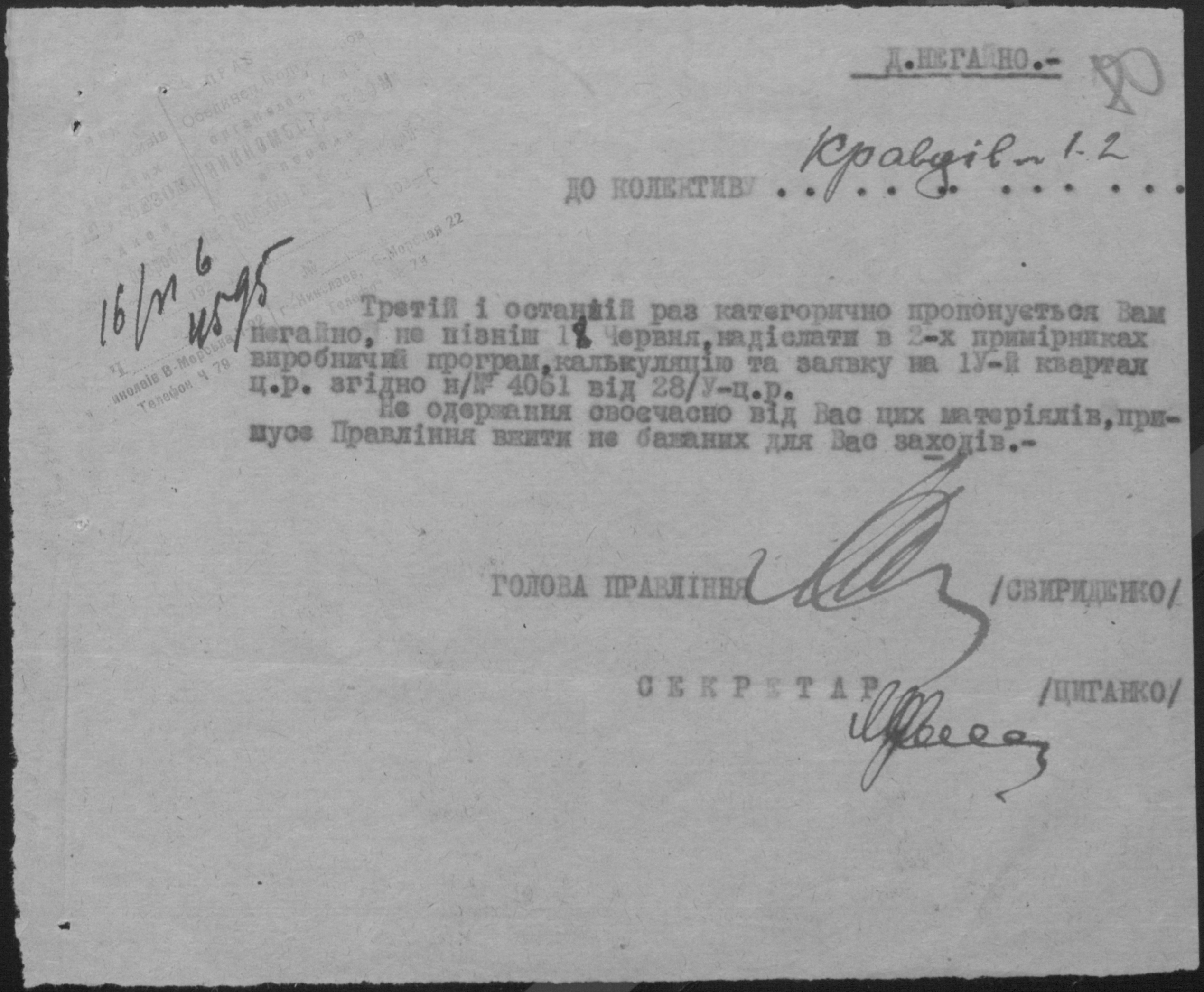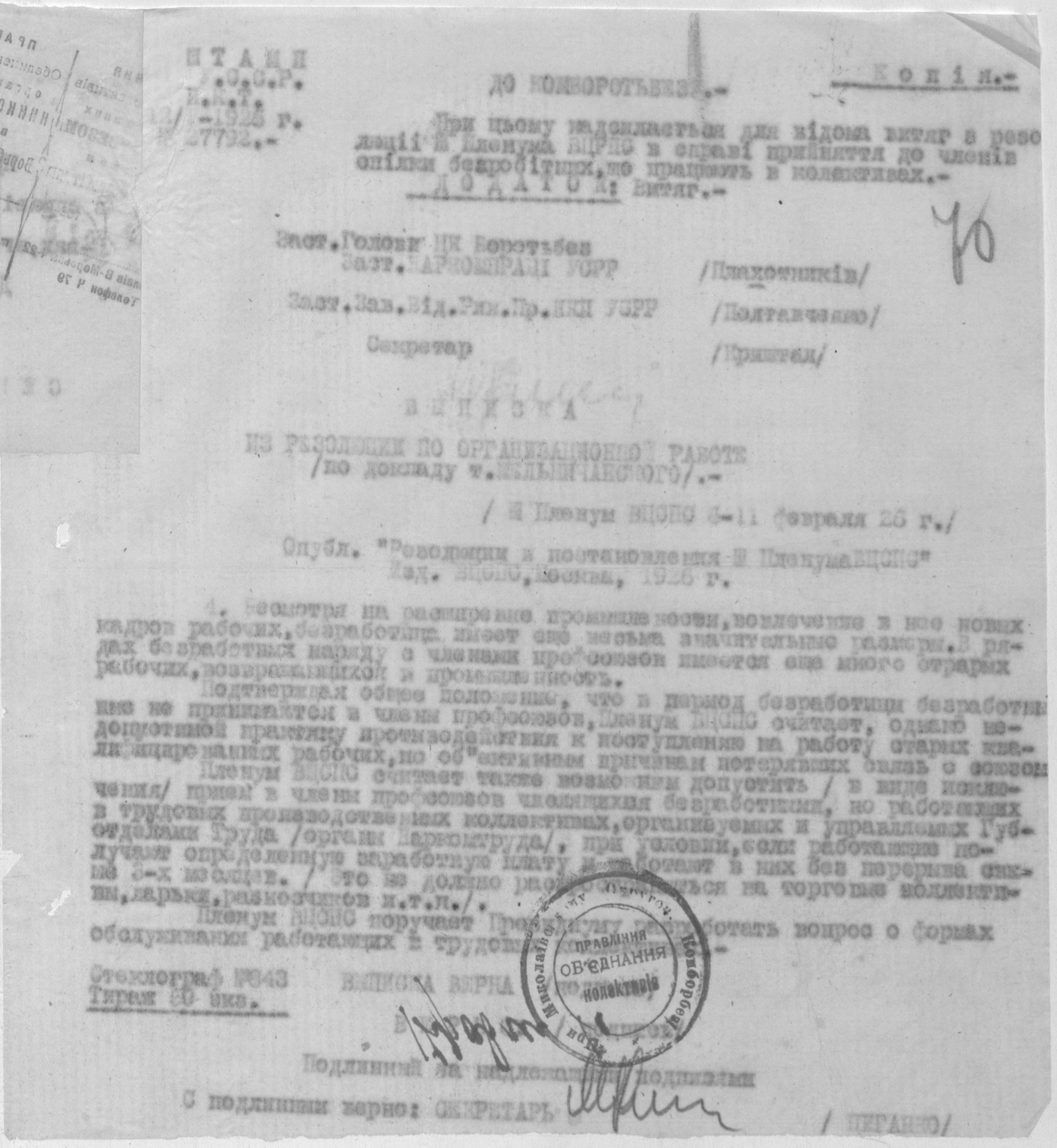 • • • • Справа № 16 “Обіжник Народного комісаріату праці УРСР про надсилання виробничого плану колективів. Листування з правлінням об’єднання колективів безробітних при Миккомборбезі з виробничих і господарських питань. Витяги з протоколу засідань Миккомборбезу. Списки керівного складу, робітників і службовців колективу”