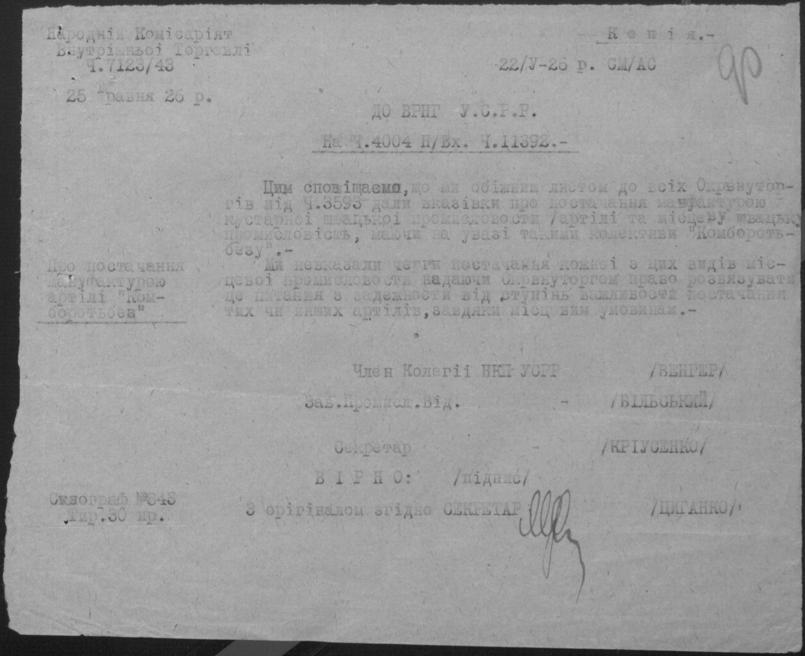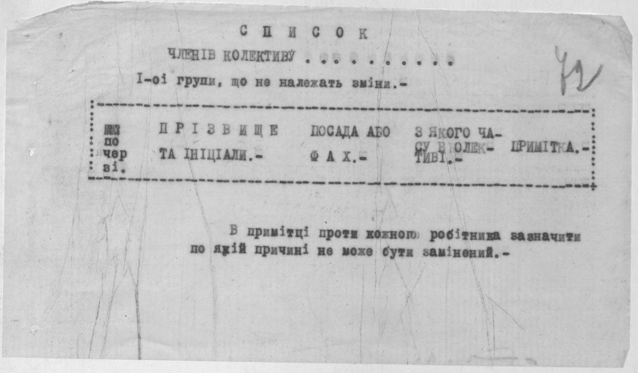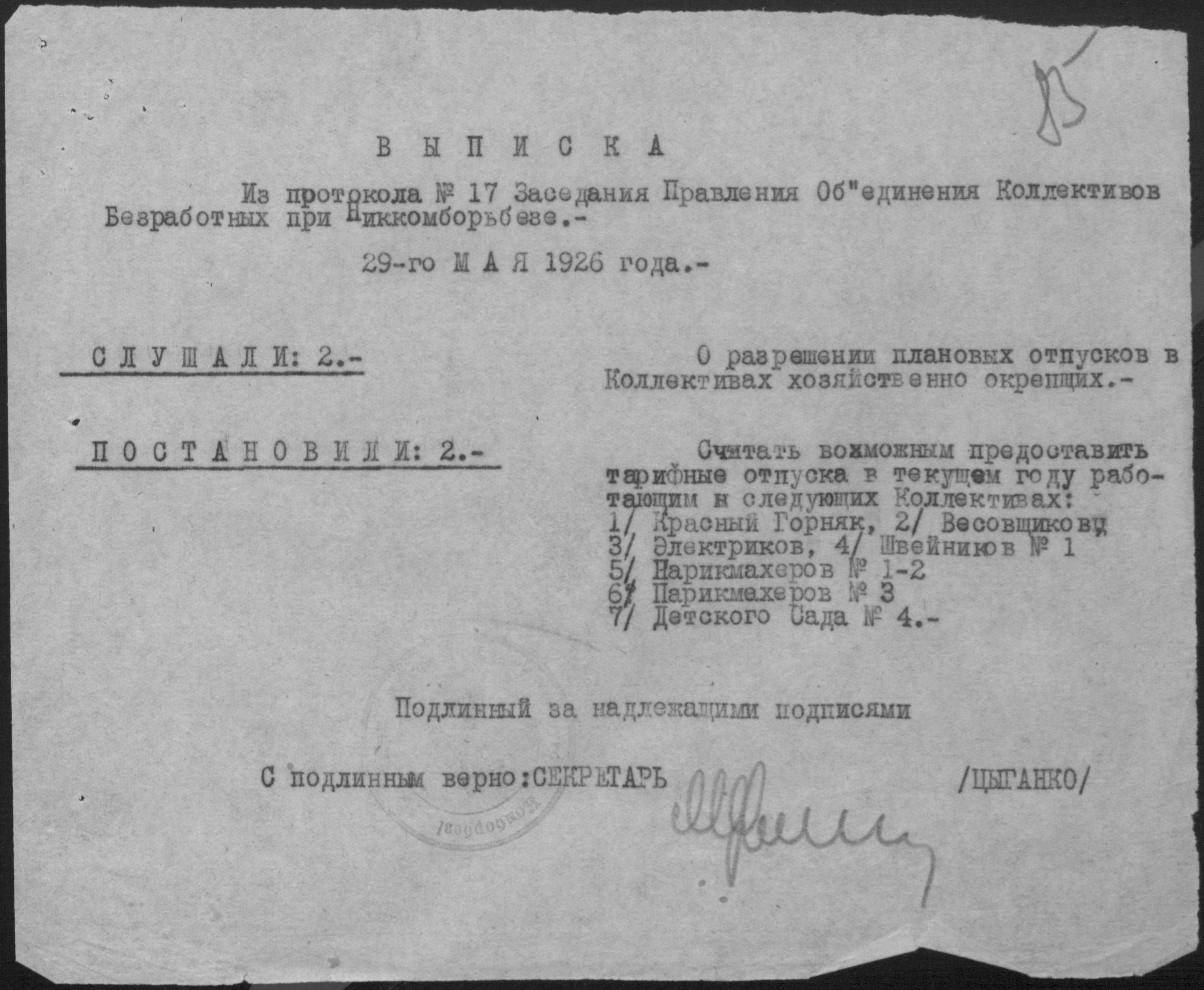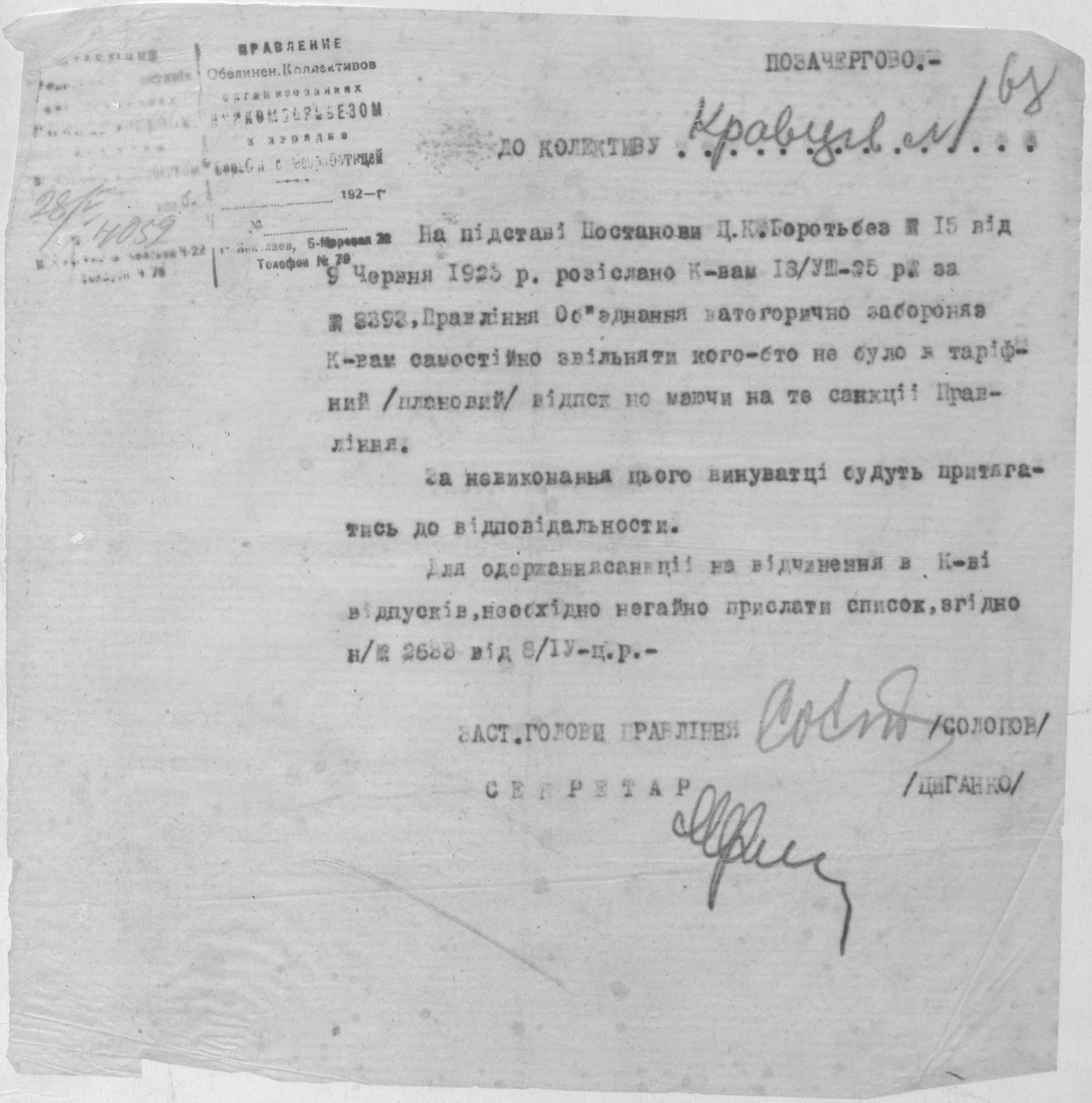 • • • • Справа № 16 “Обіжник Народного комісаріату праці УРСР про надсилання виробничого плану колективів. Листування з правлінням об’єднання колективів безробітних при Миккомборбезі з виробничих і господарських питань. Витяги з протоколу засідань Миккомборбезу. Списки керівного складу, робітників і службовців колективу”