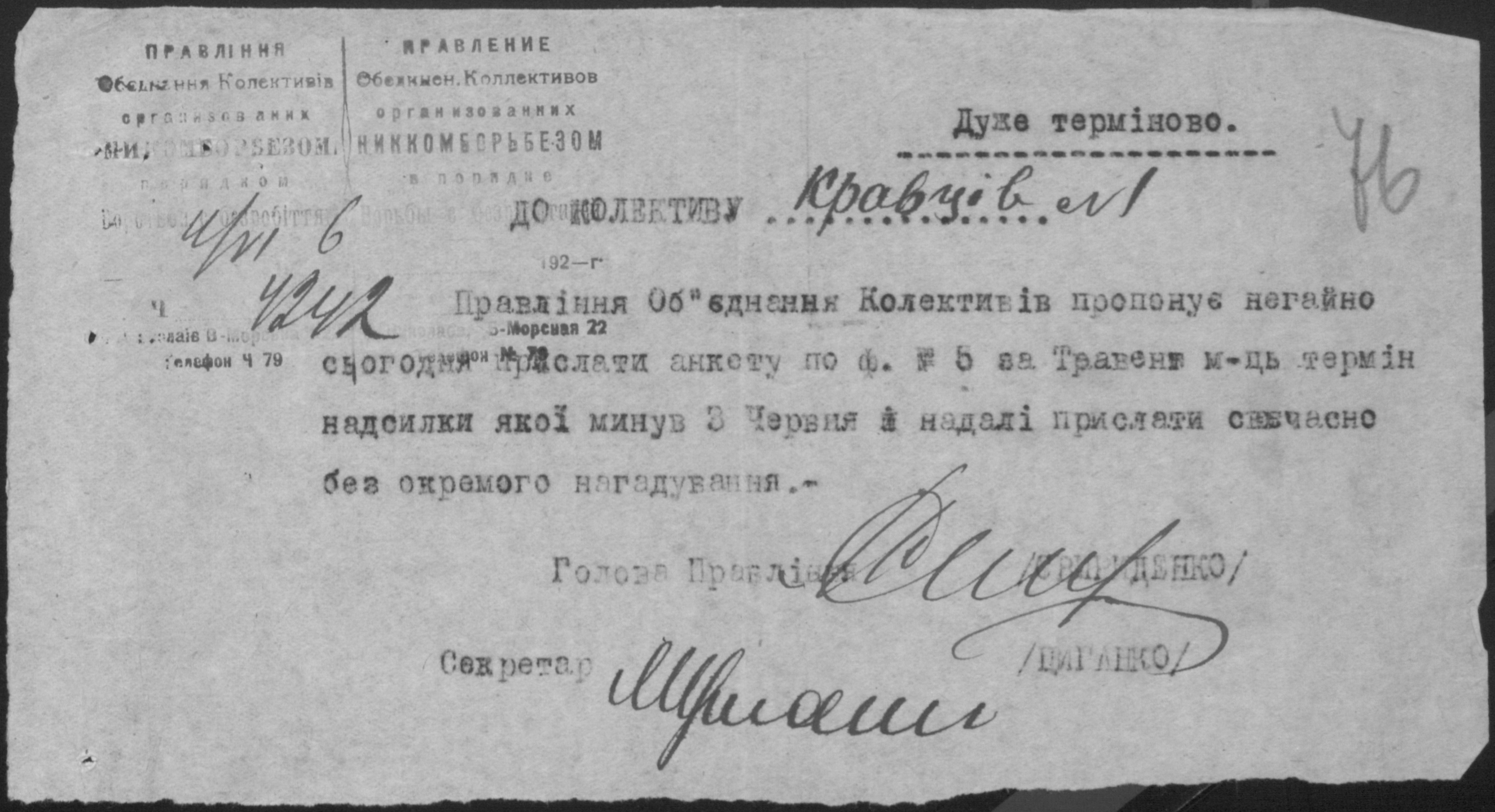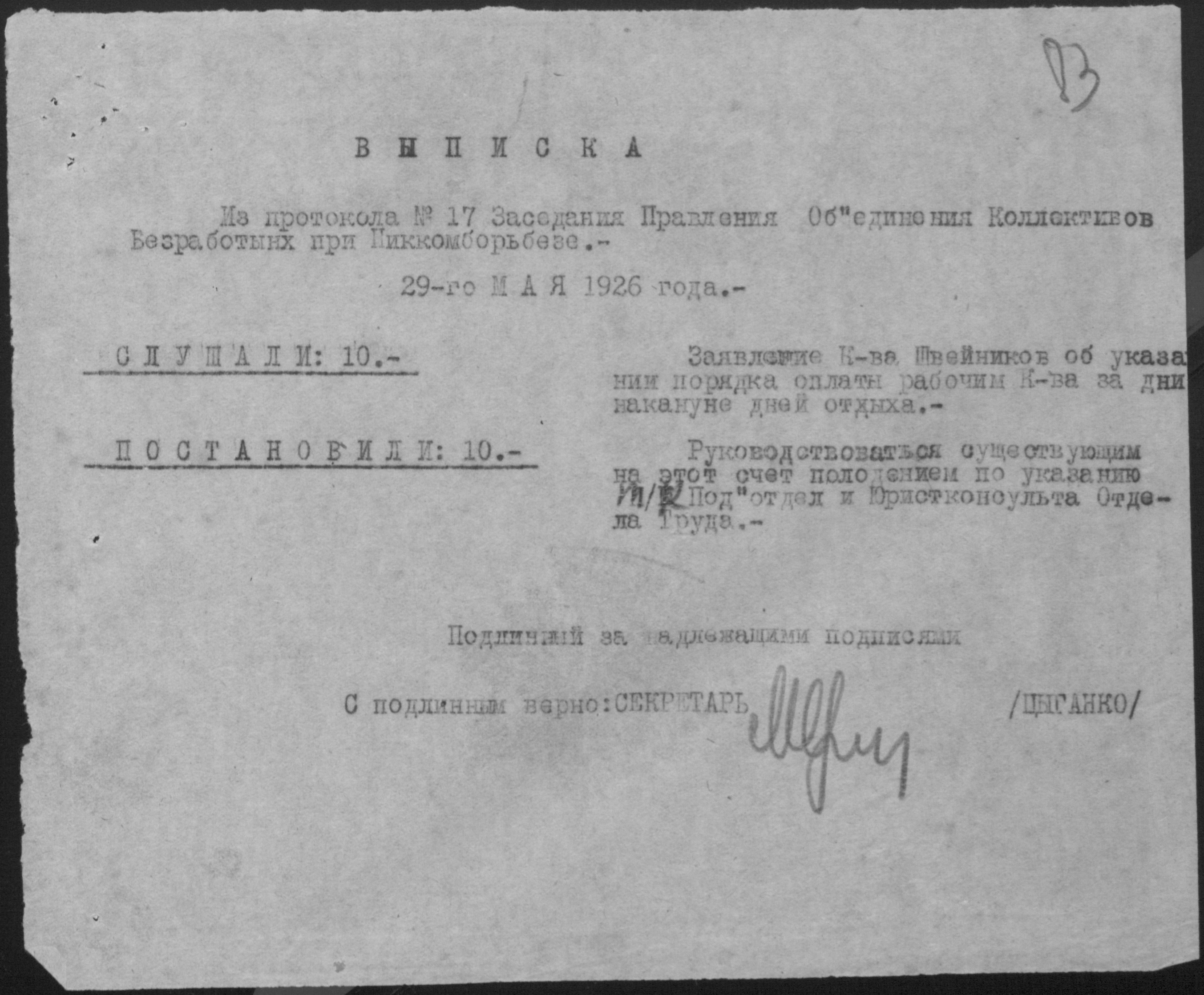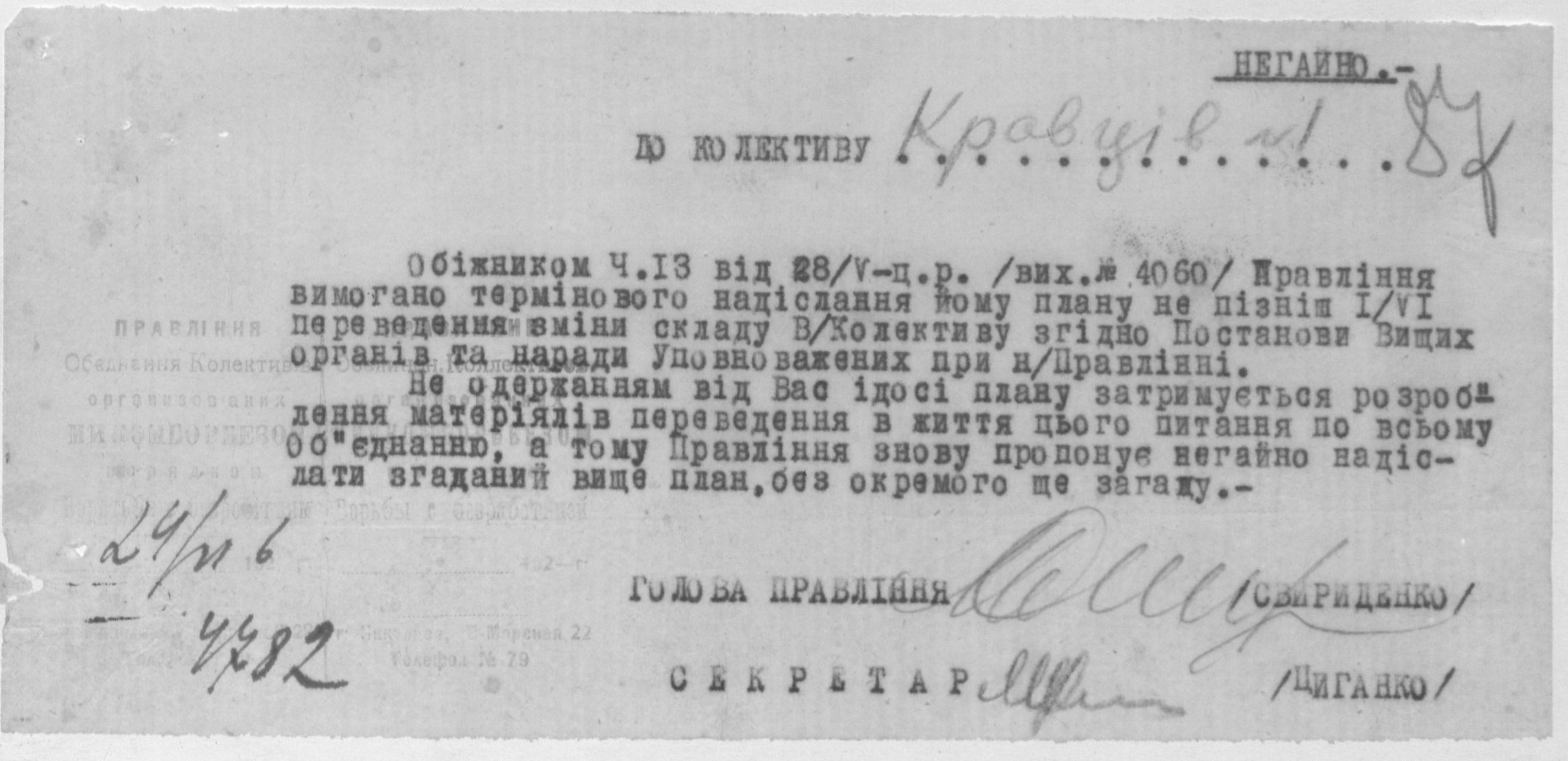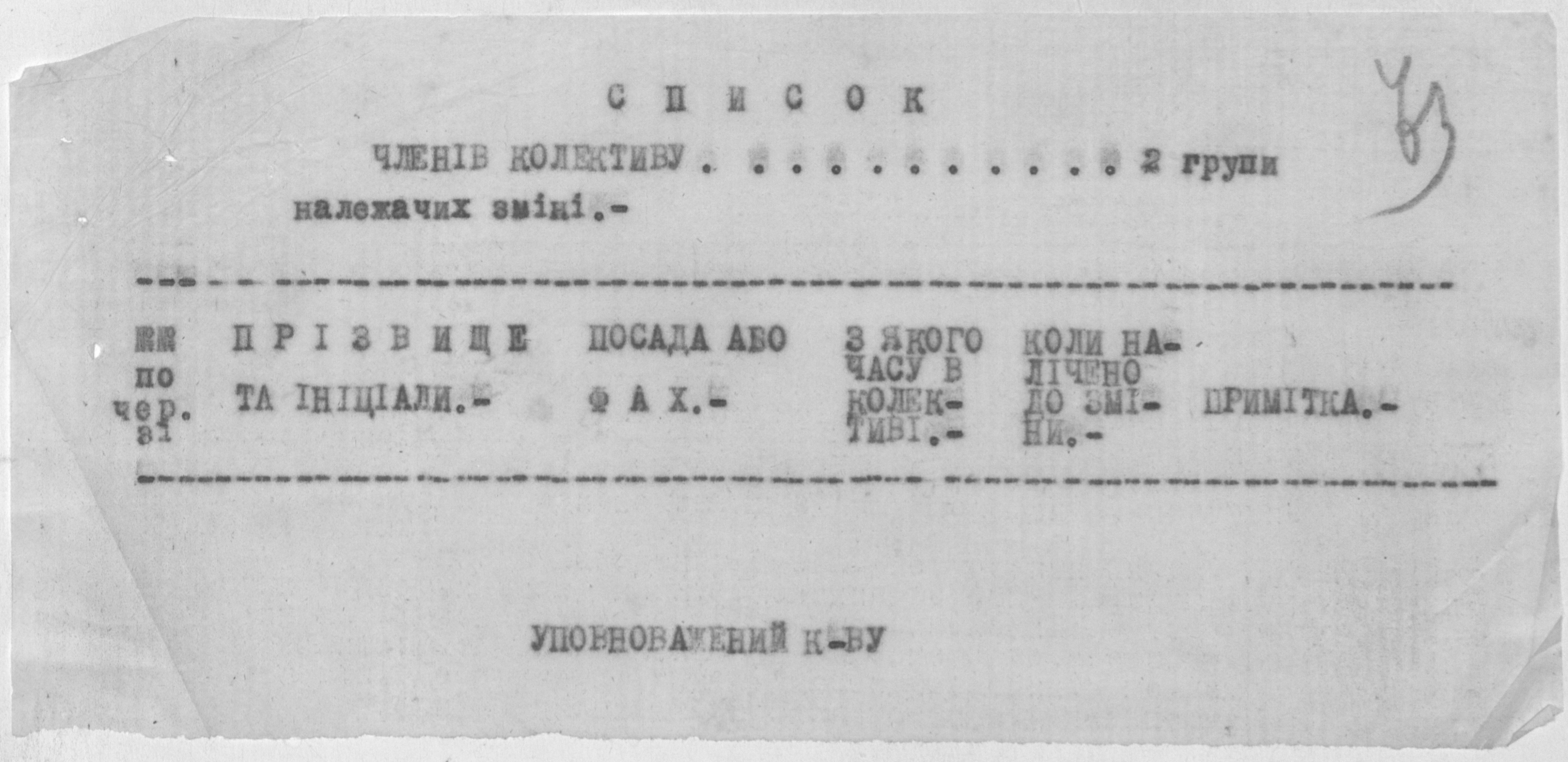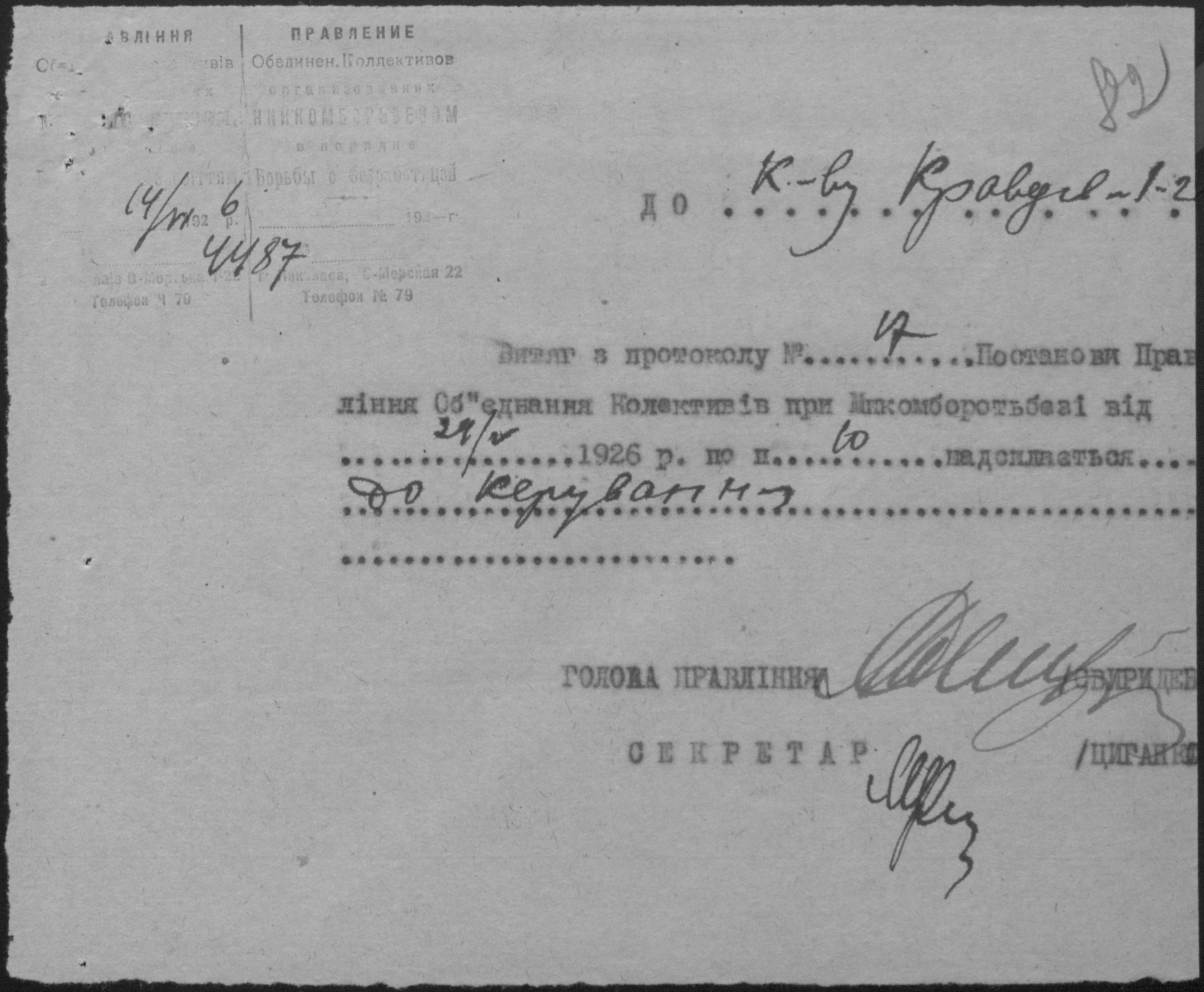 • • • • Справа № 16 “Обіжник Народного комісаріату праці УРСР про надсилання виробничого плану колективів. Листування з правлінням об’єднання колективів безробітних при Миккомборбезі з виробничих і господарських питань. Витяги з протоколу засідань Миккомборбезу. Списки керівного складу, робітників і службовців колективу”