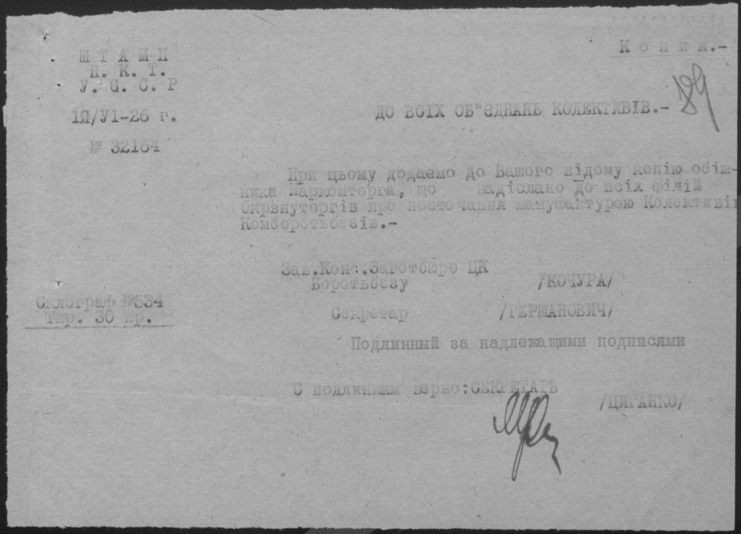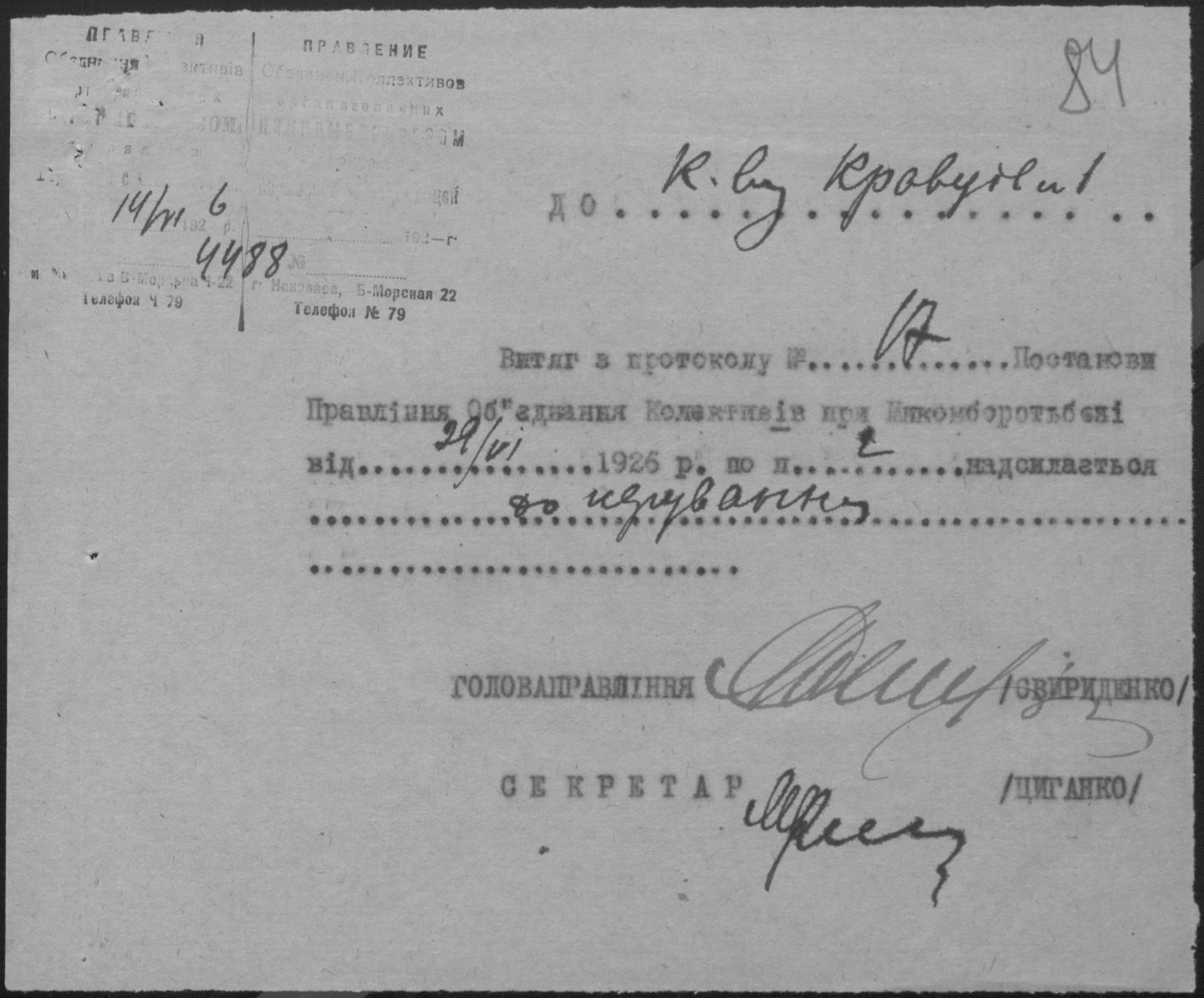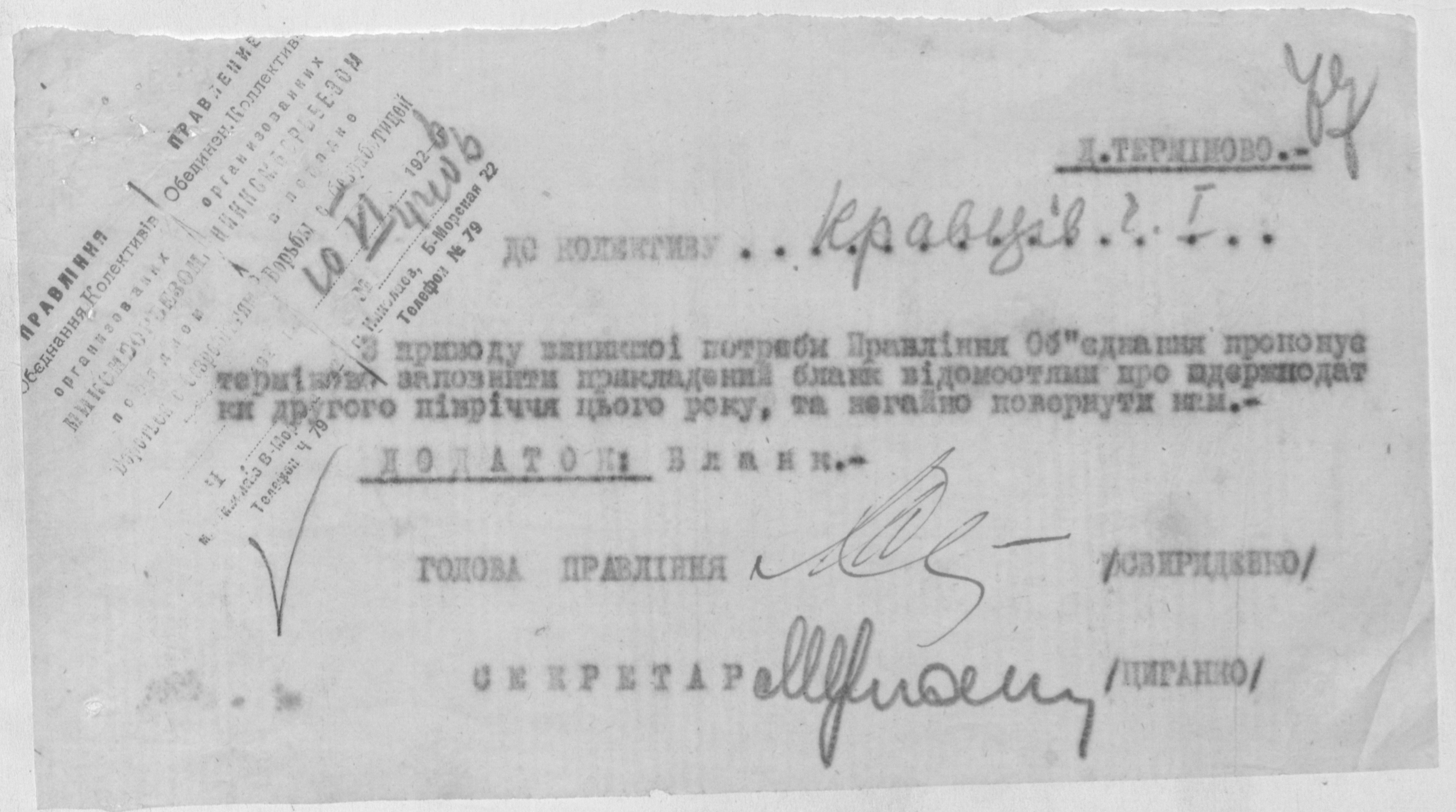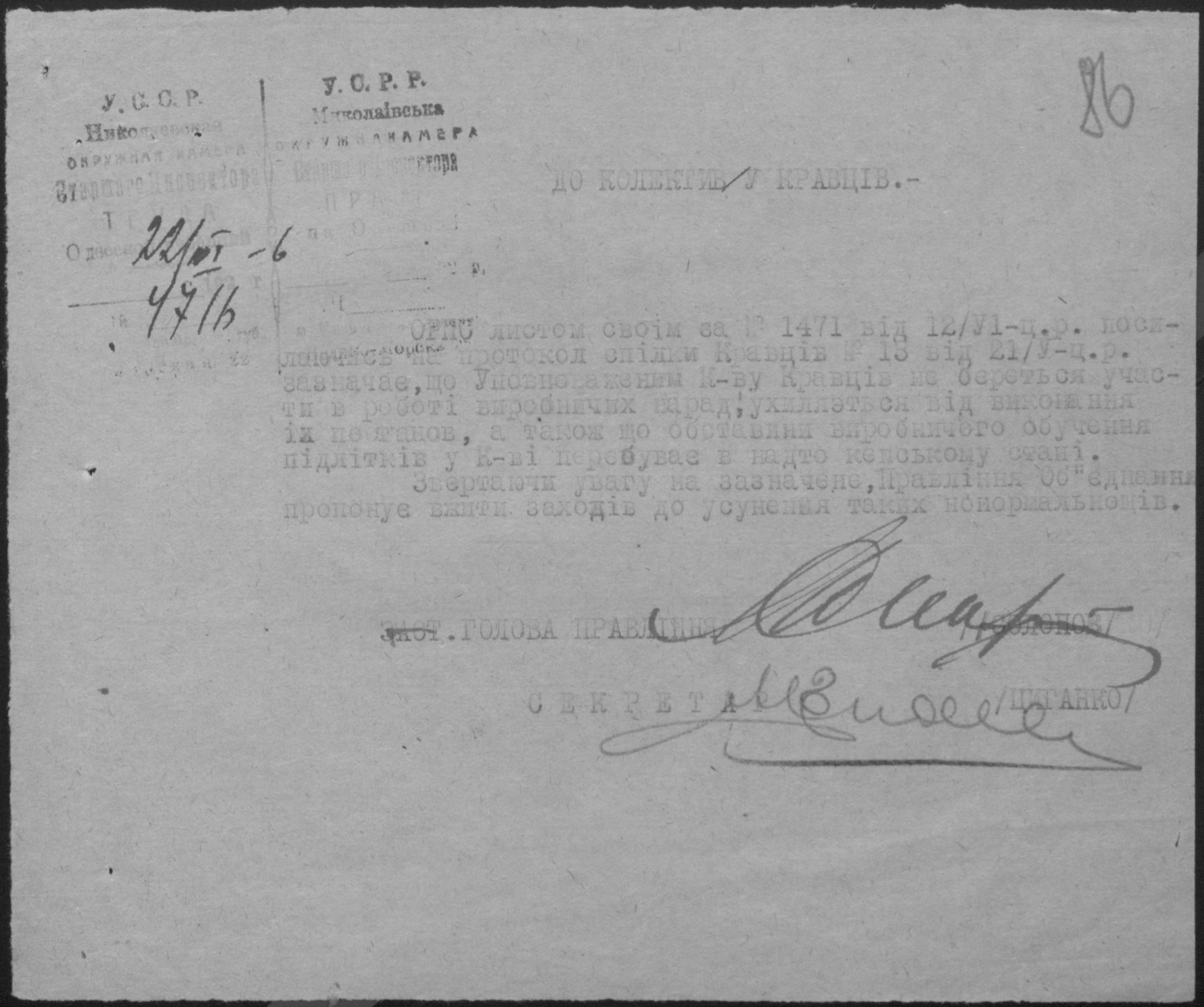 • • • • Справа № 16 “Обіжник Народного комісаріату праці УРСР про надсилання виробничого плану колективів. Листування з правлінням об’єднання колективів безробітних при Миккомборбезі з виробничих і господарських питань. Витяги з протоколу засідань Миккомборбезу. Списки керівного складу, робітників і службовців колективу”
