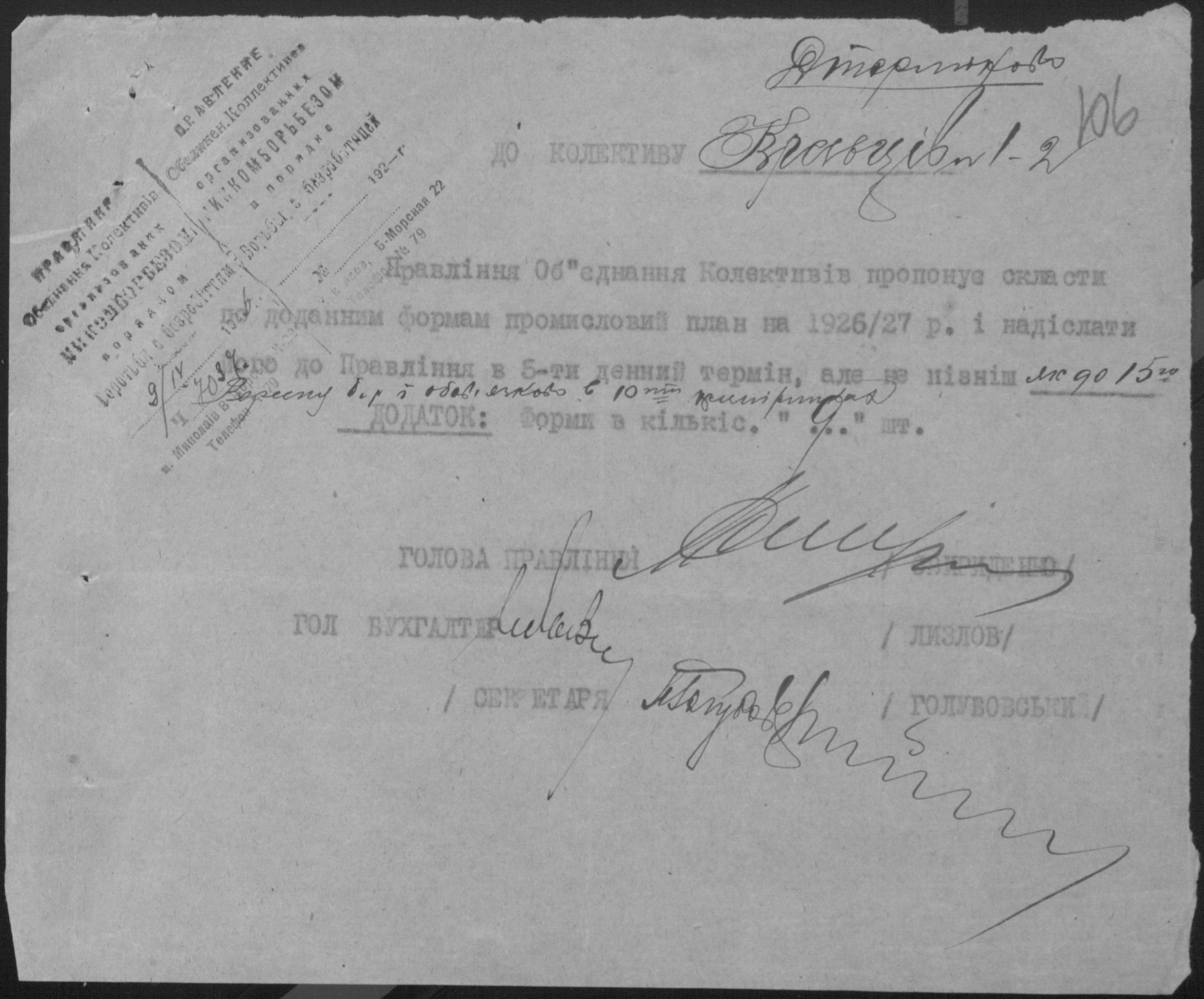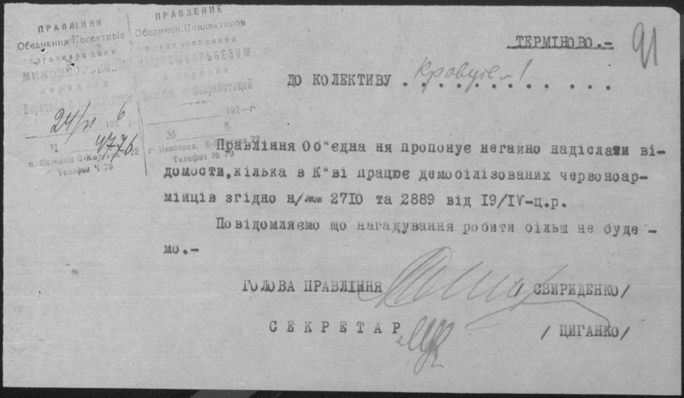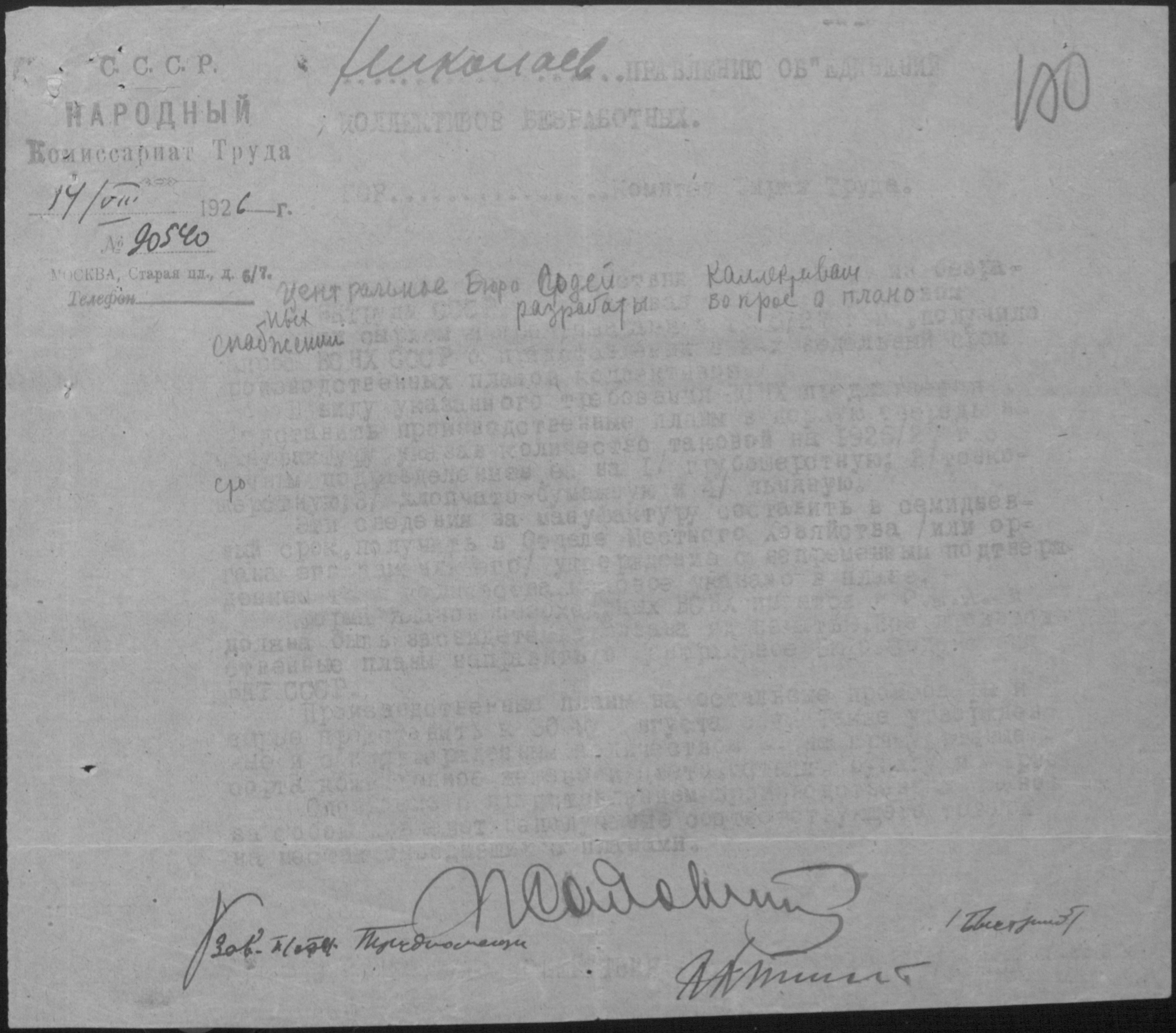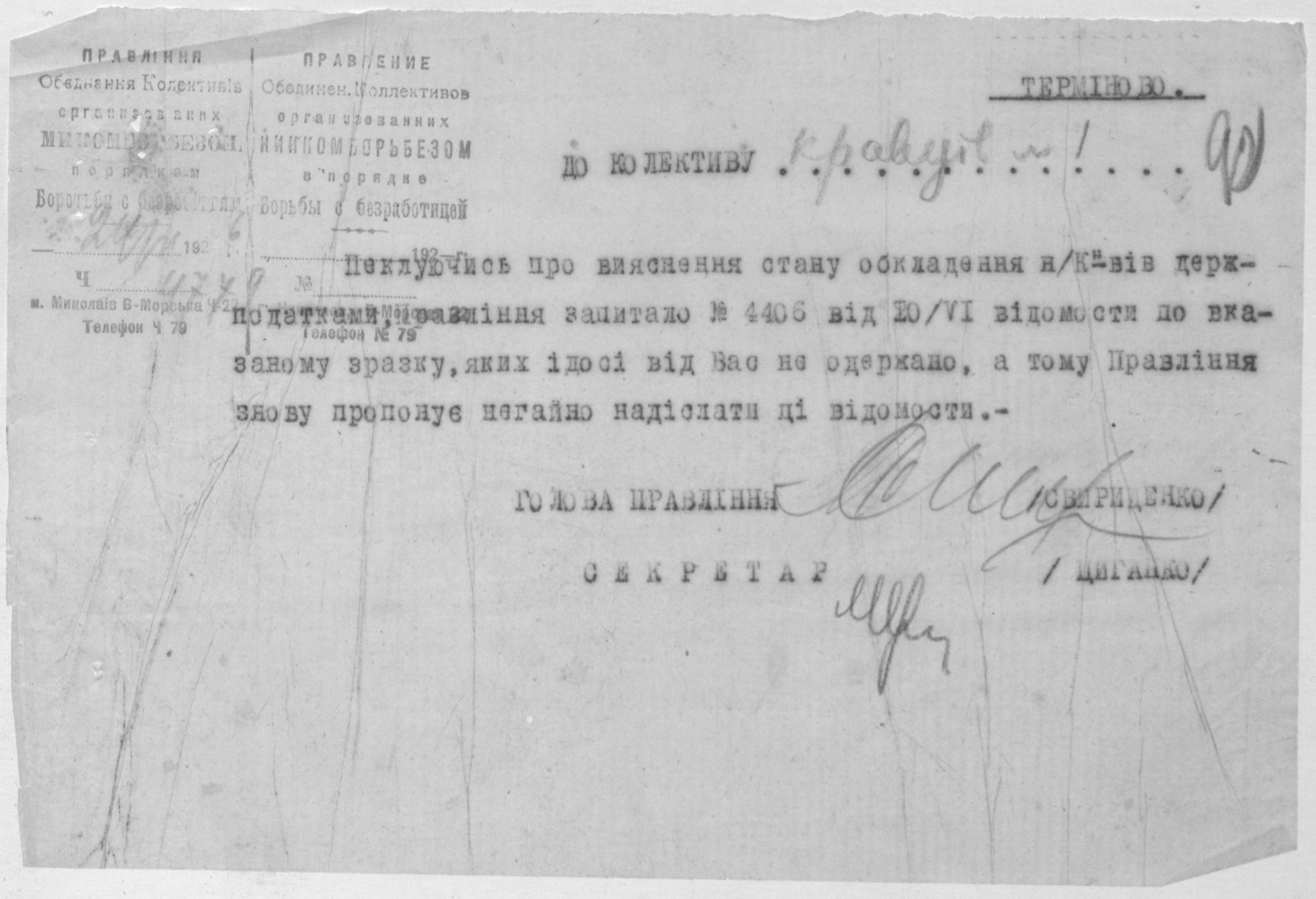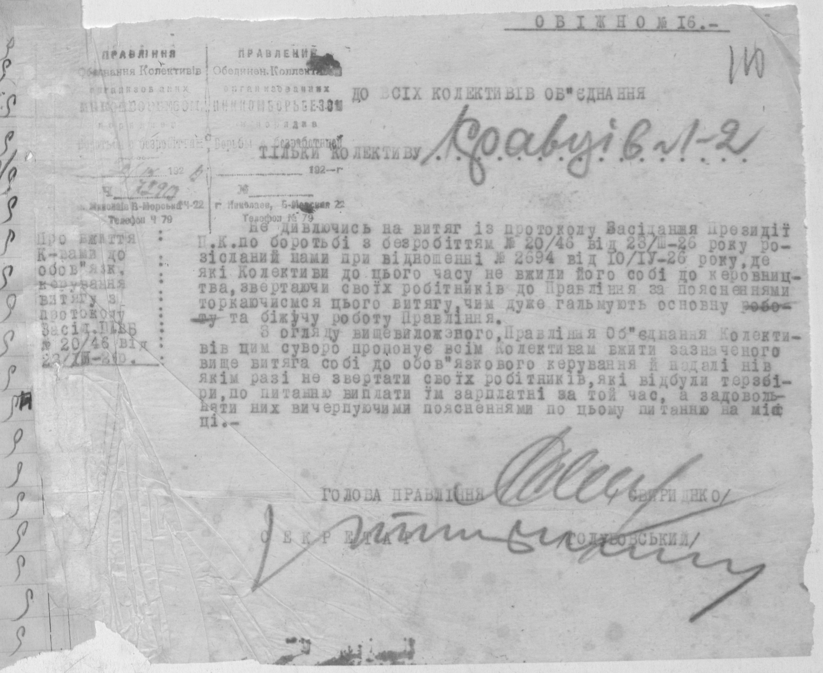 • • • • Справа № 16 “Обіжник Народного комісаріату праці УРСР про надсилання виробничого плану колективів. Листування з правлінням об’єднання колективів безробітних при Миккомборбезі з виробничих і господарських питань. Витяги з протоколу засідань Миккомборбезу. Списки керівного складу, робітників і службовців колективу”