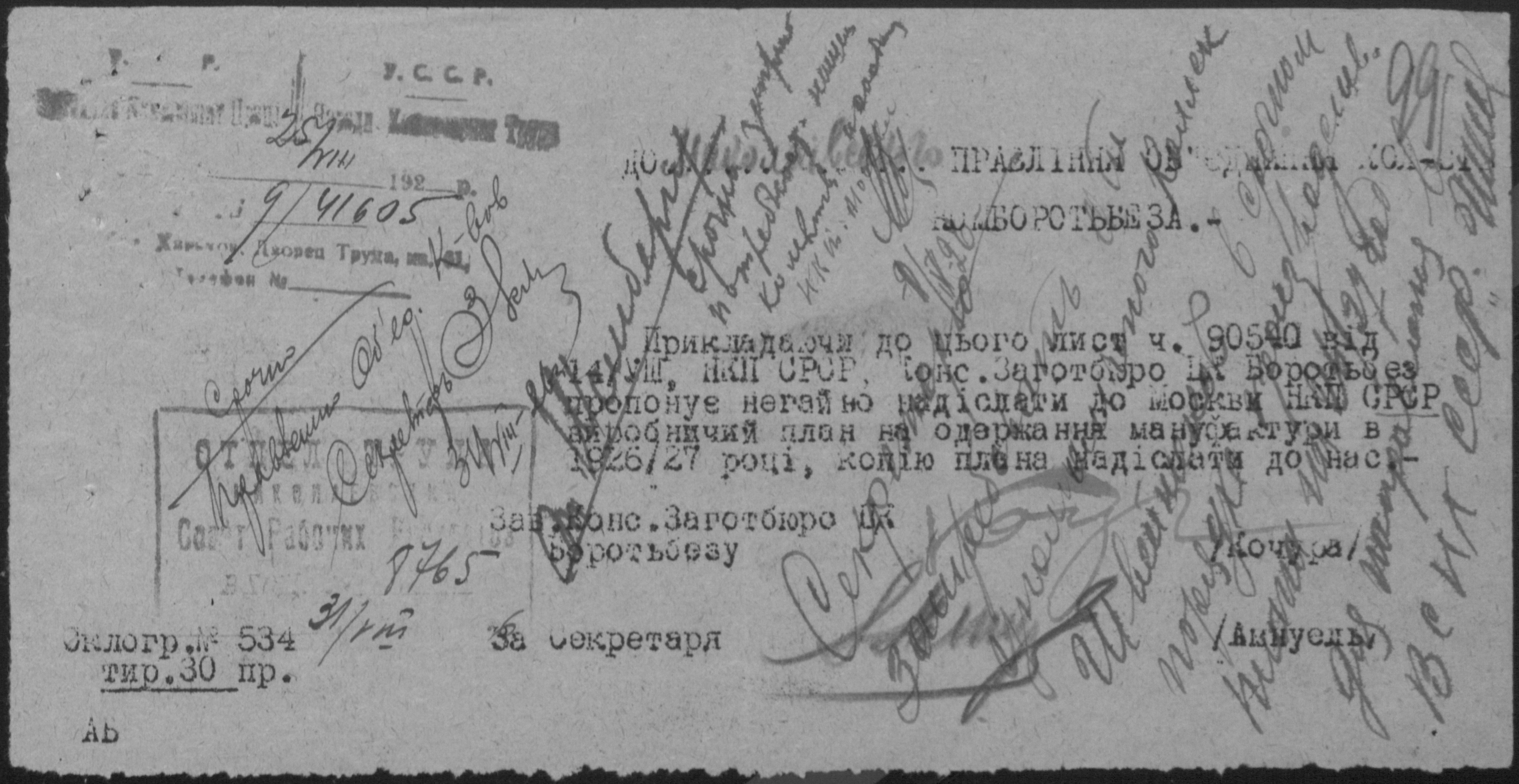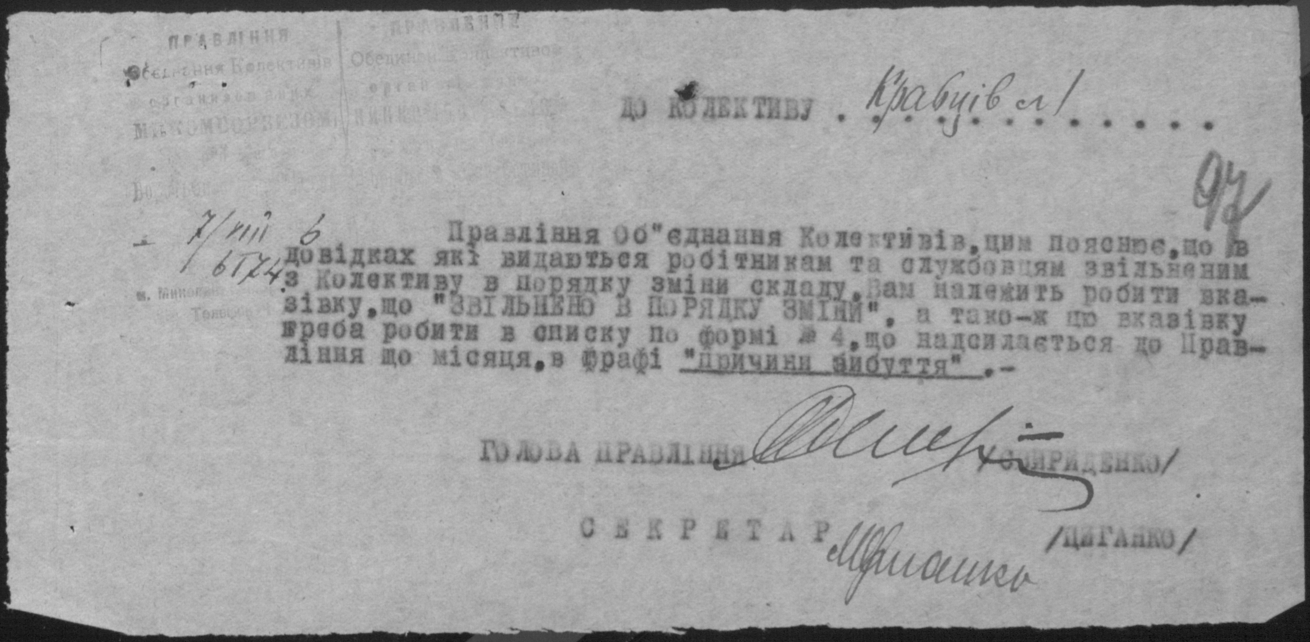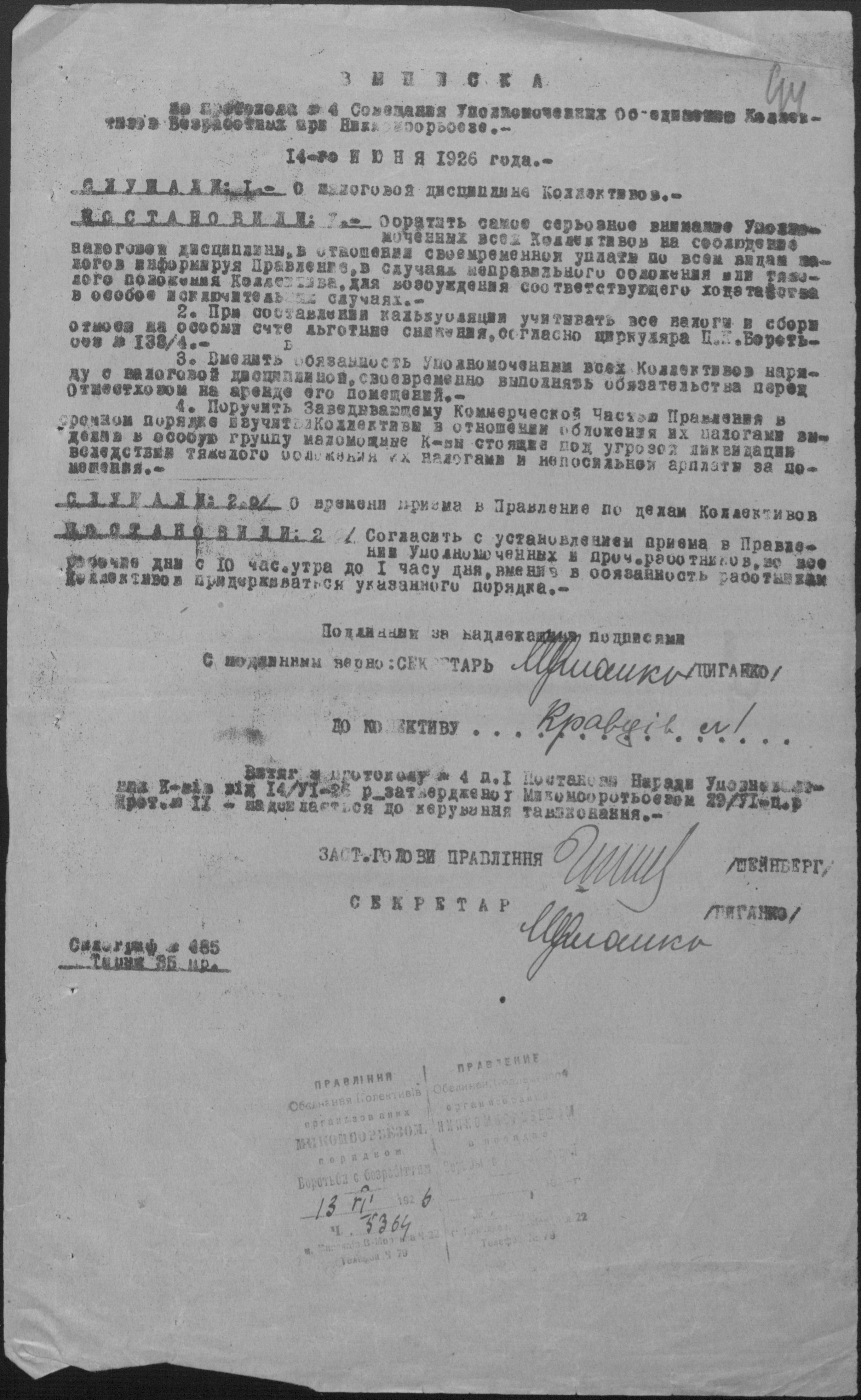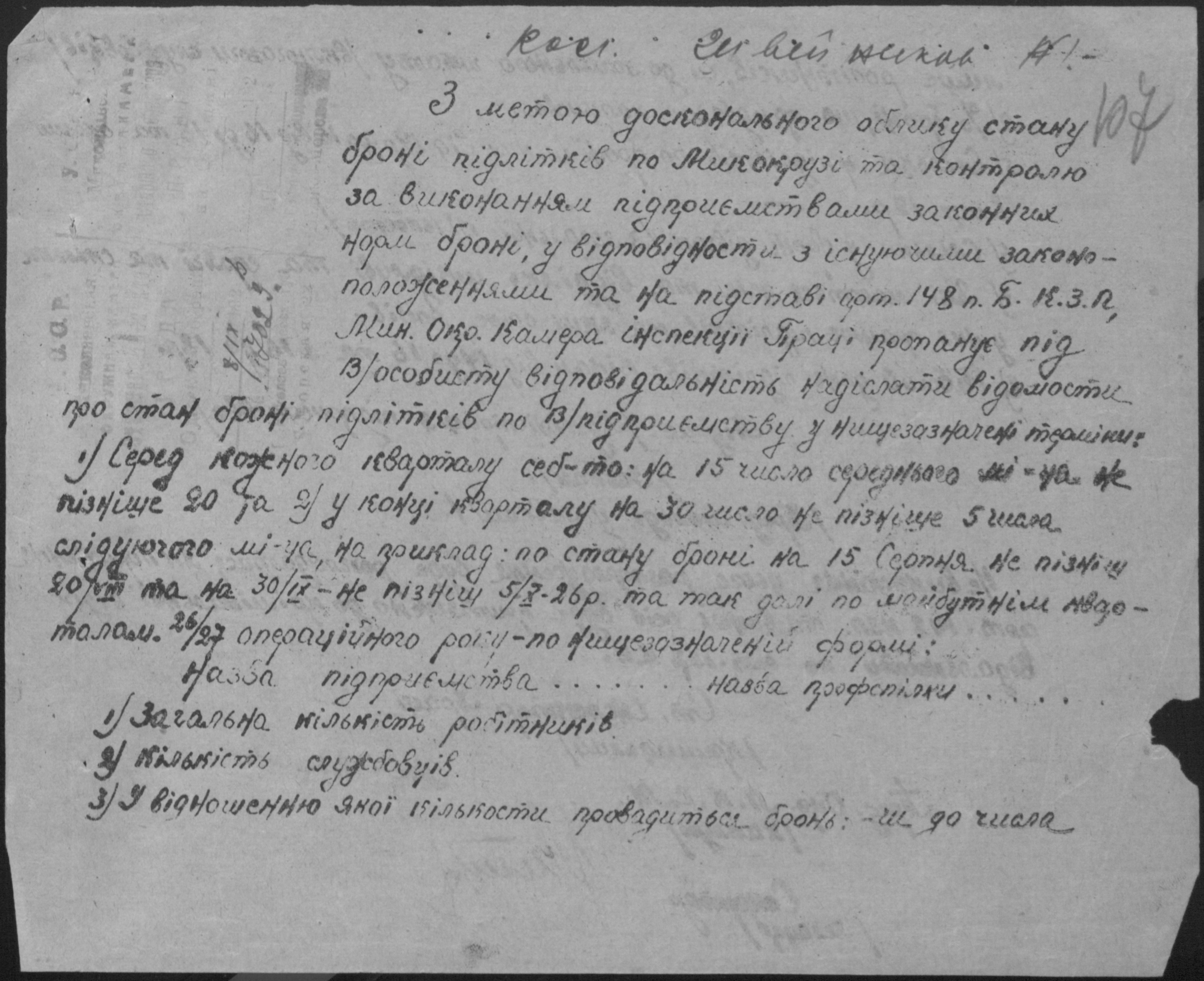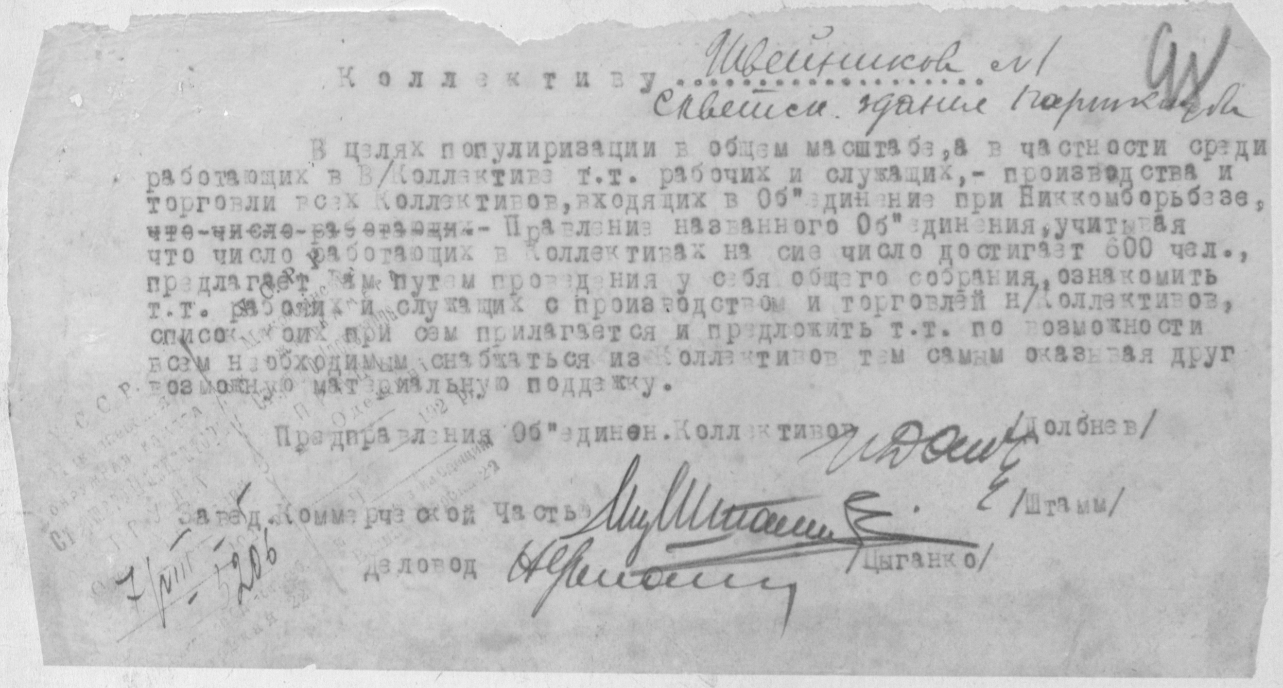 • • • • Справа № 16 “Обіжник Народного комісаріату праці УРСР про надсилання виробничого плану колективів. Листування з правлінням об’єднання колективів безробітних при Миккомборбезі з виробничих і господарських питань. Витяги з протоколу засідань Миккомборбезу. Списки керівного складу, робітників і службовців колективу”