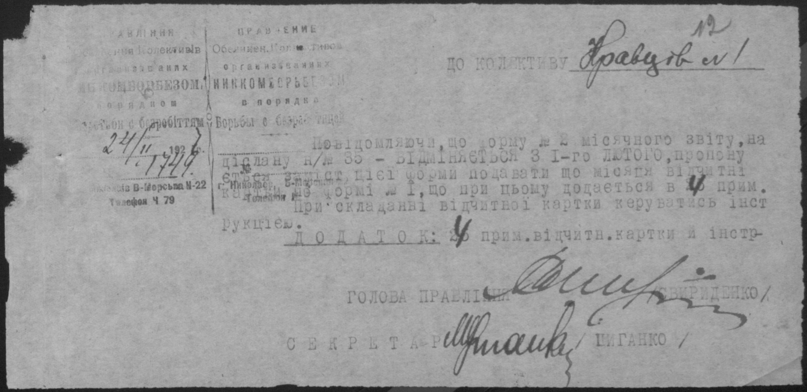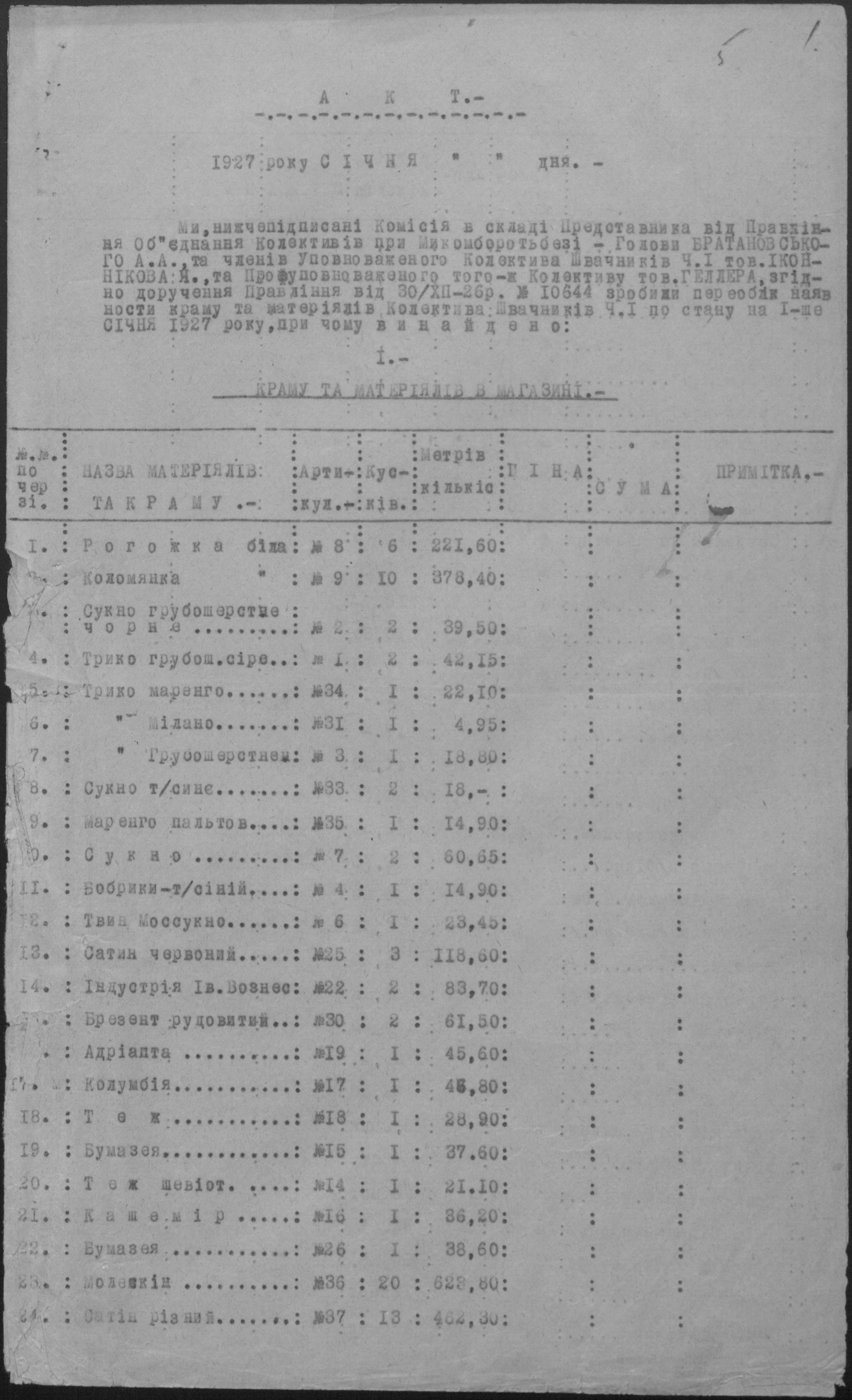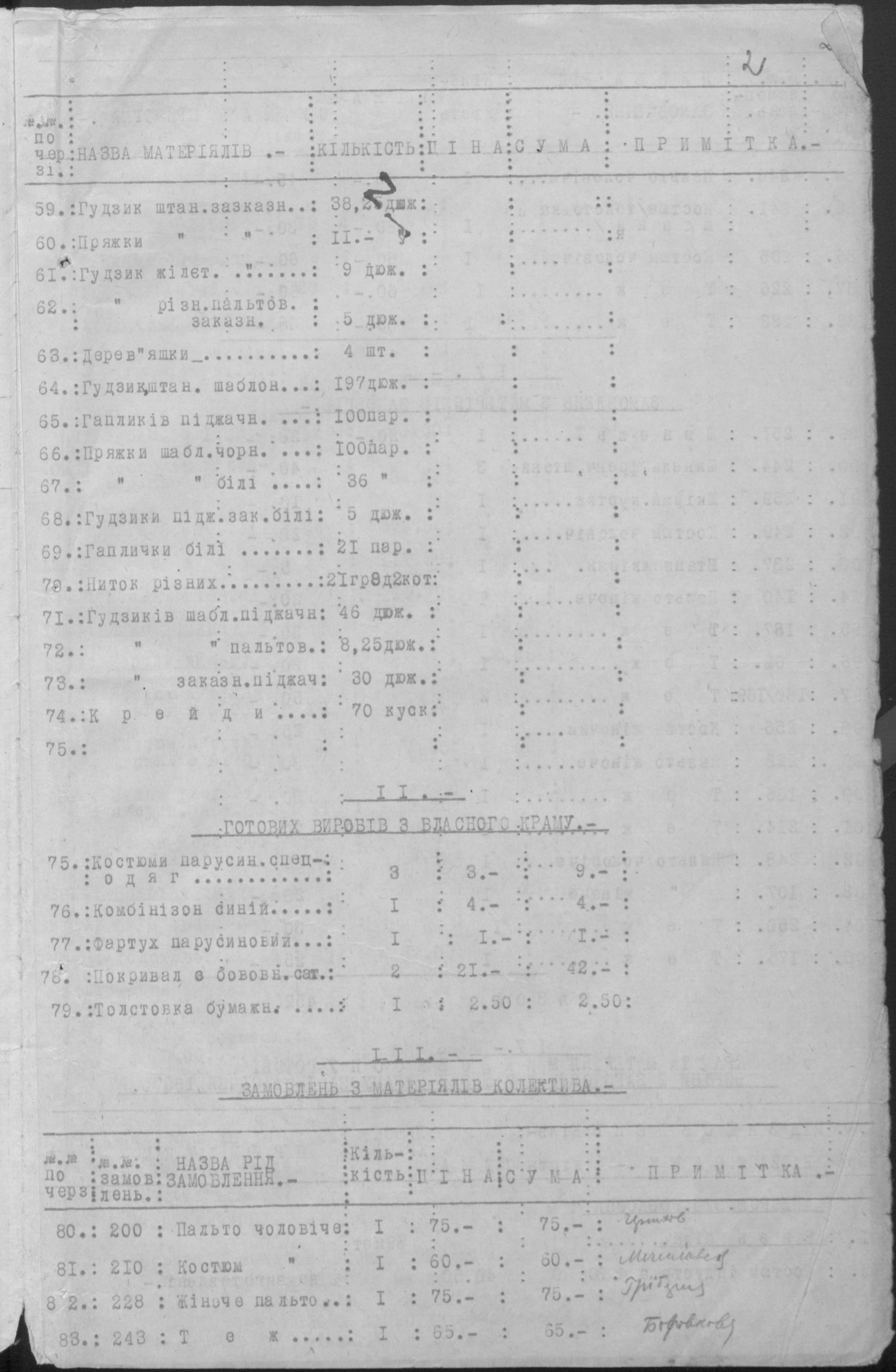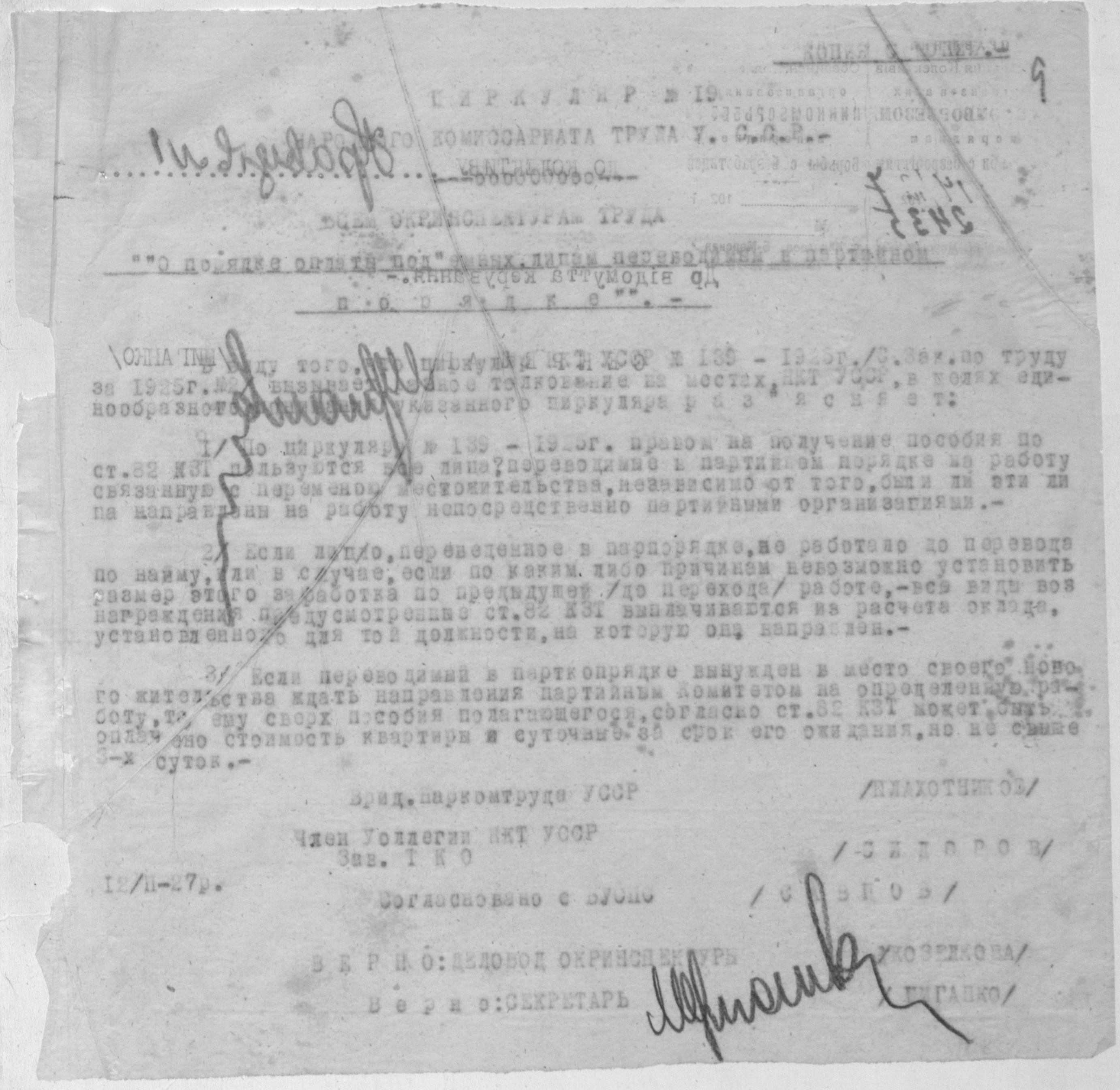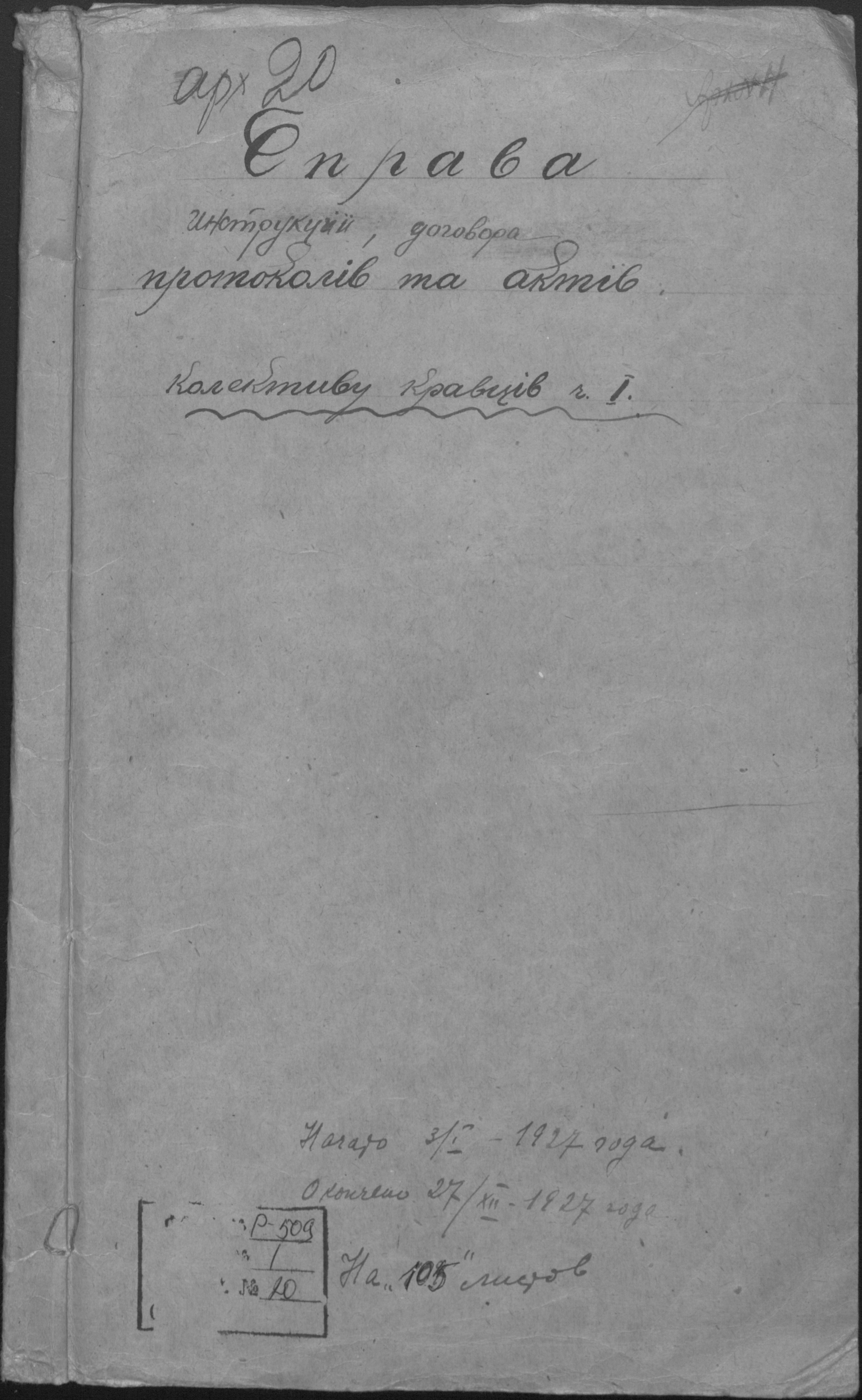 • • • • Справа № 20 “Обіжник Народного комісаріату праці УРСР про виплату підйомної допомоги особам, які переводяться у партійному порядку. Обіжник Народного комісаріату зовнішньої і внутрішньої торгівлі УРСР про зниження роздрібних цін. Листування з правлінням об’єднання колективів безробітних при Миккомборбезі з виробничих і господарських питань. Протоколи засідань членів колективу. Акти інвентаризації”