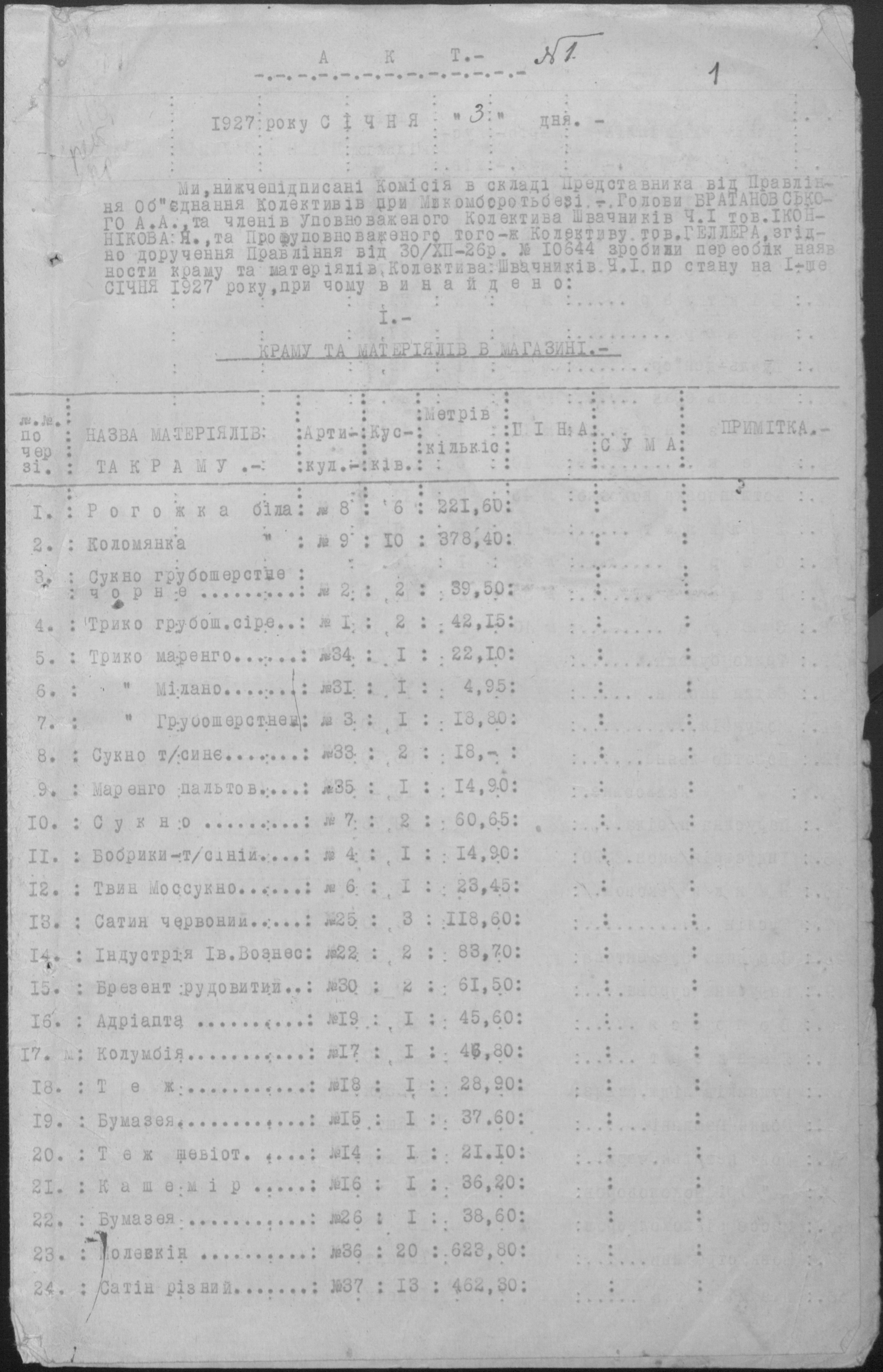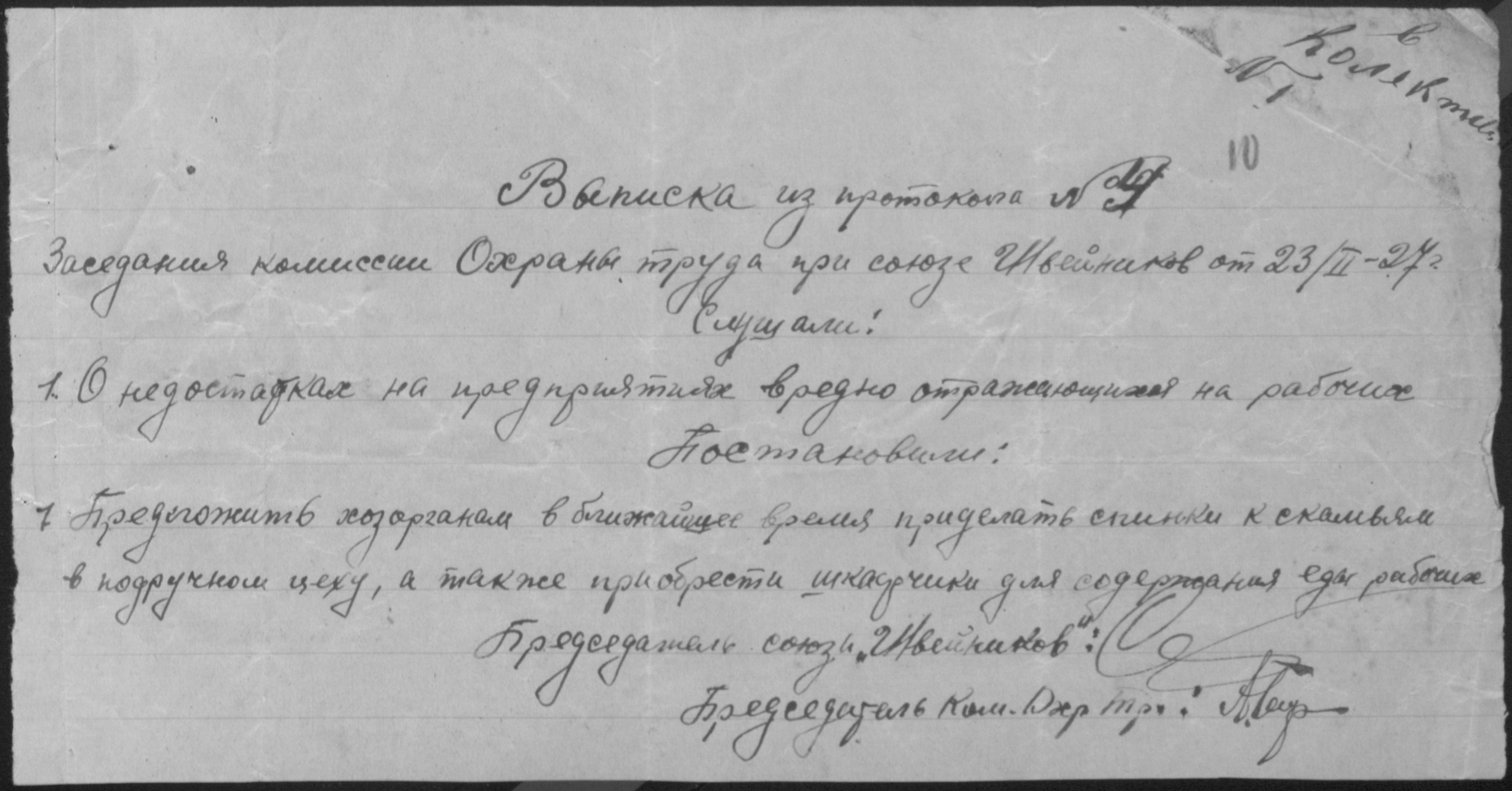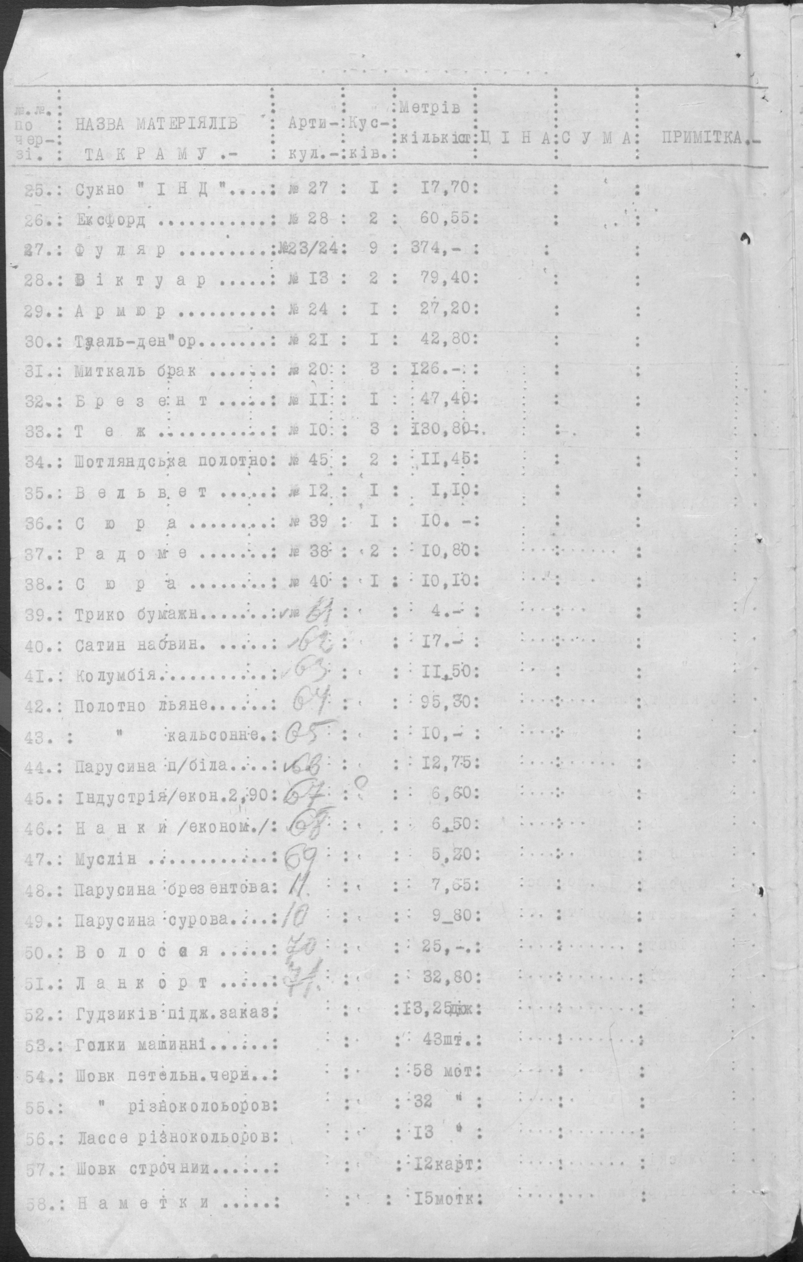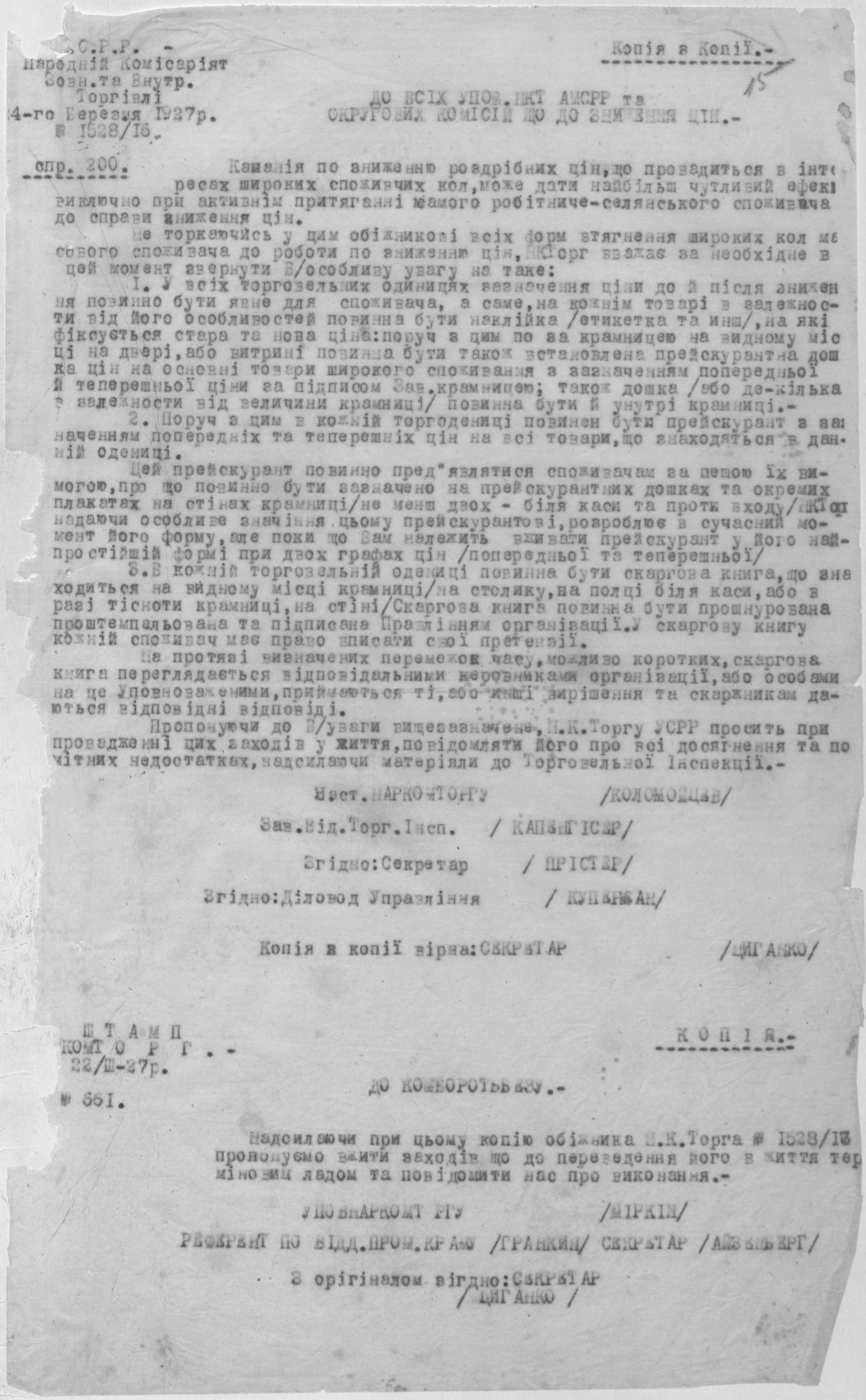 • • • • Справа № 20 “Обіжник Народного комісаріату праці УРСР про виплату підйомної допомоги особам, які переводяться у партійному порядку. Обіжник Народного комісаріату зовнішньої і внутрішньої торгівлі УРСР про зниження роздрібних цін. Листування з правлінням об’єднання колективів безробітних при Миккомборбезі з виробничих і господарських питань. Протоколи засідань членів колективу. Акти інвентаризації”