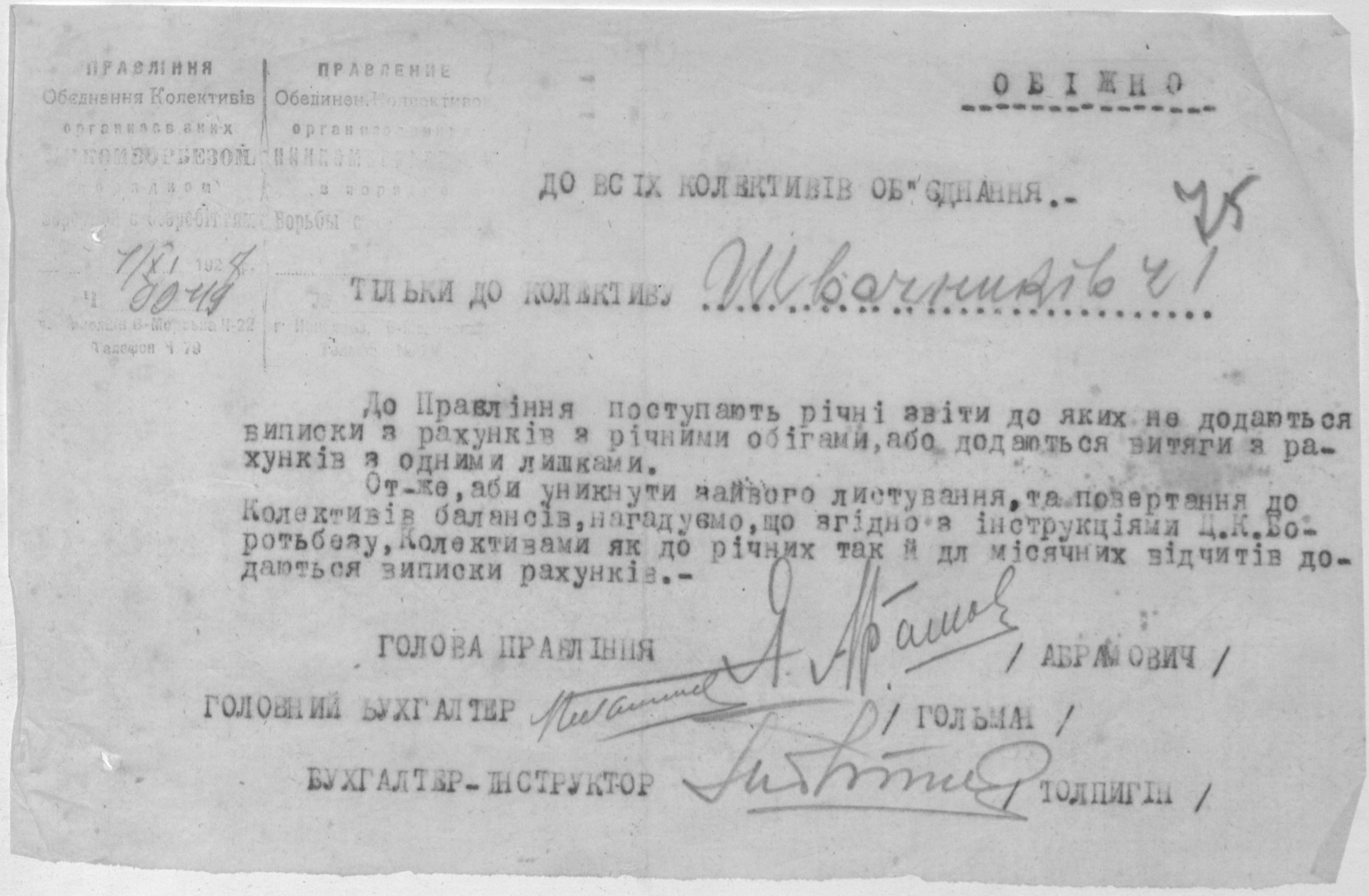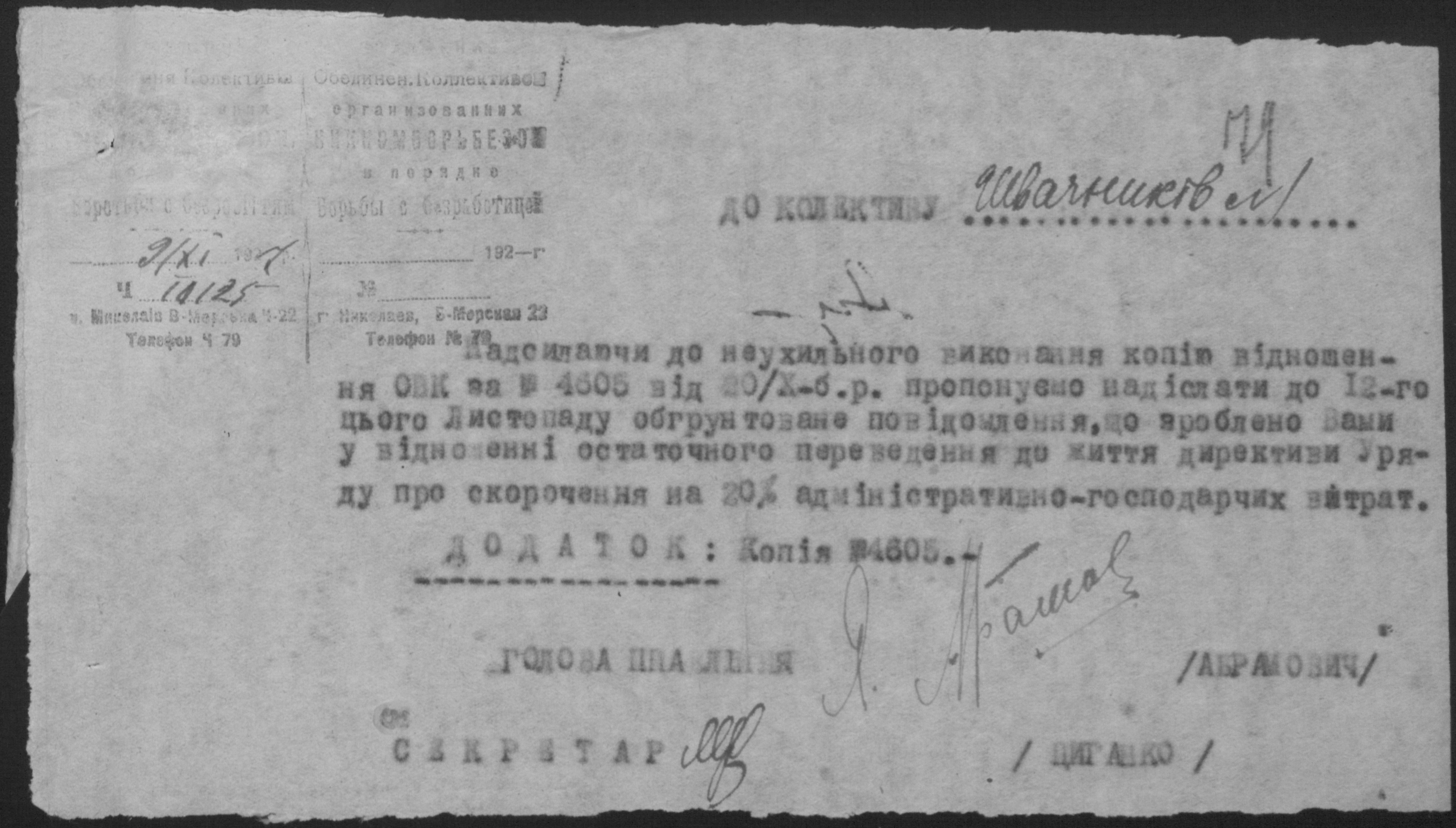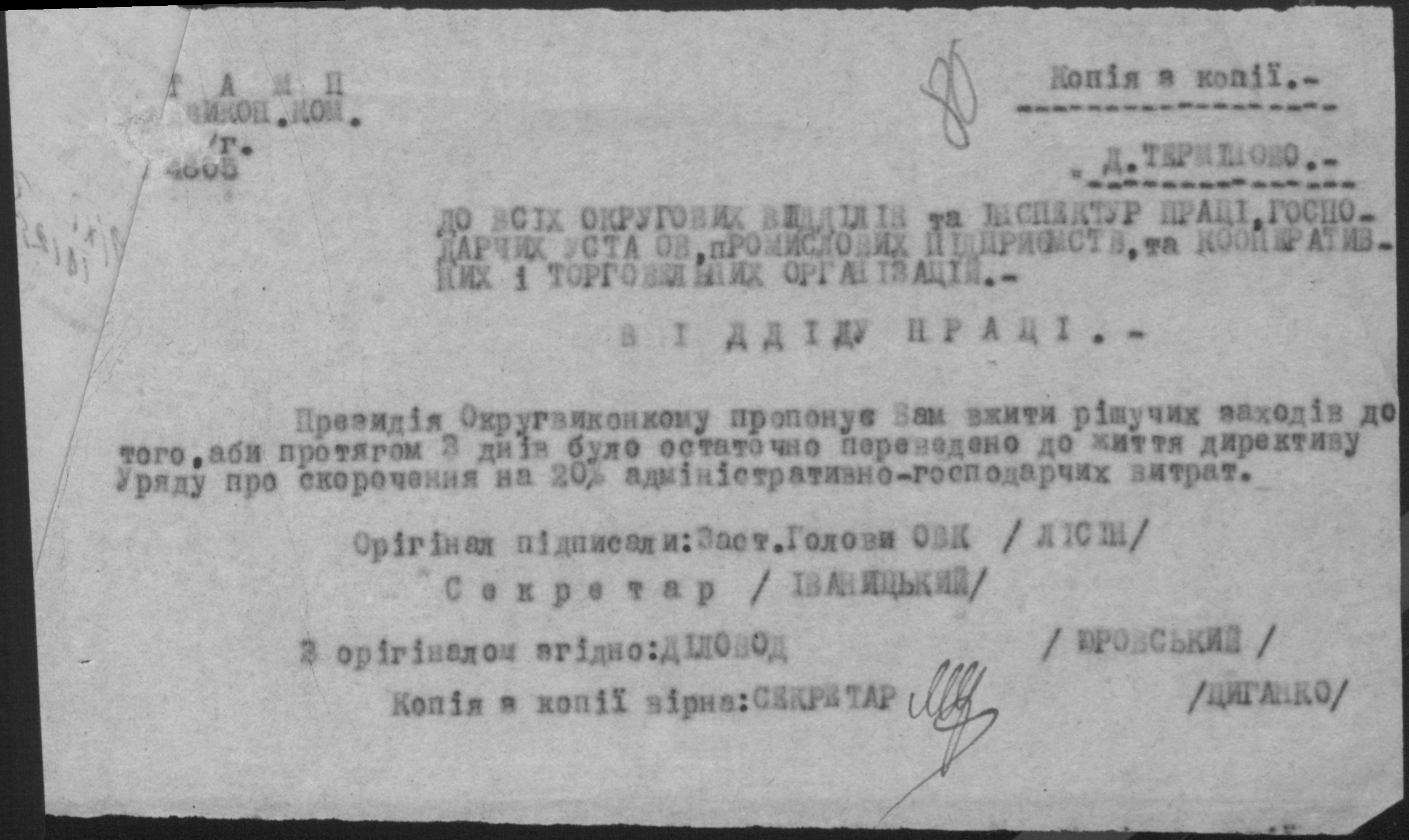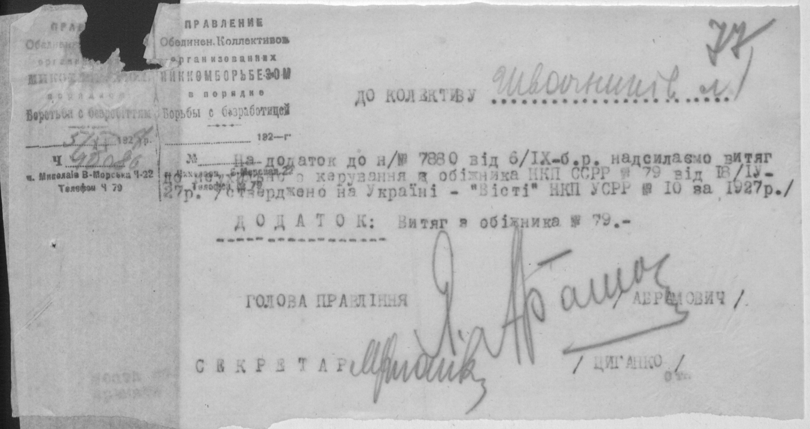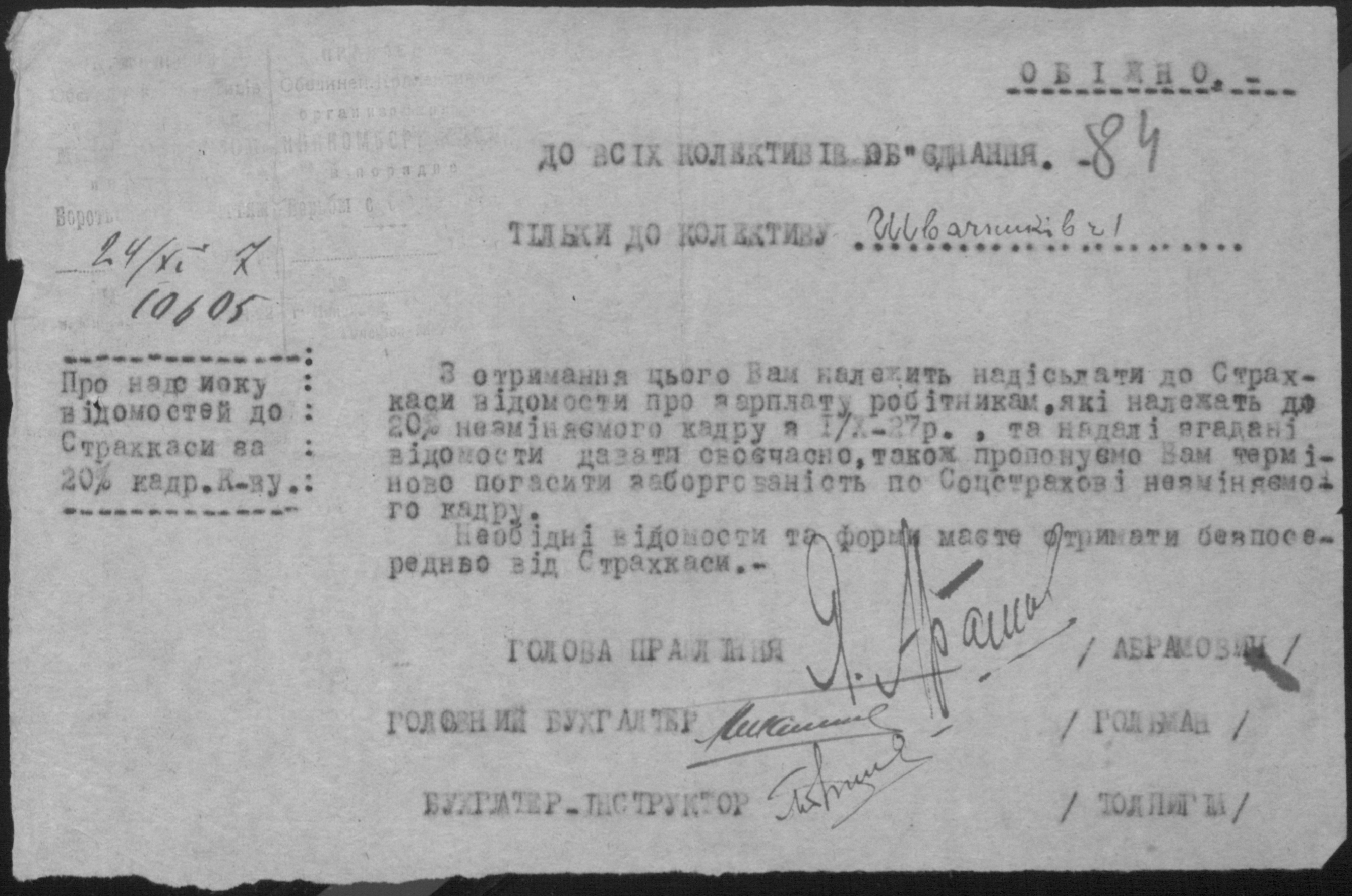 • • • • Справа № 20 “Обіжник Народного комісаріату праці УРСР про виплату підйомної допомоги особам, які переводяться у партійному порядку. Обіжник Народного комісаріату зовнішньої і внутрішньої торгівлі УРСР про зниження роздрібних цін. Листування з правлінням об’єднання колективів безробітних при Миккомборбезі з виробничих і господарських питань. Протоколи засідань членів колективу. Акти інвентаризації”