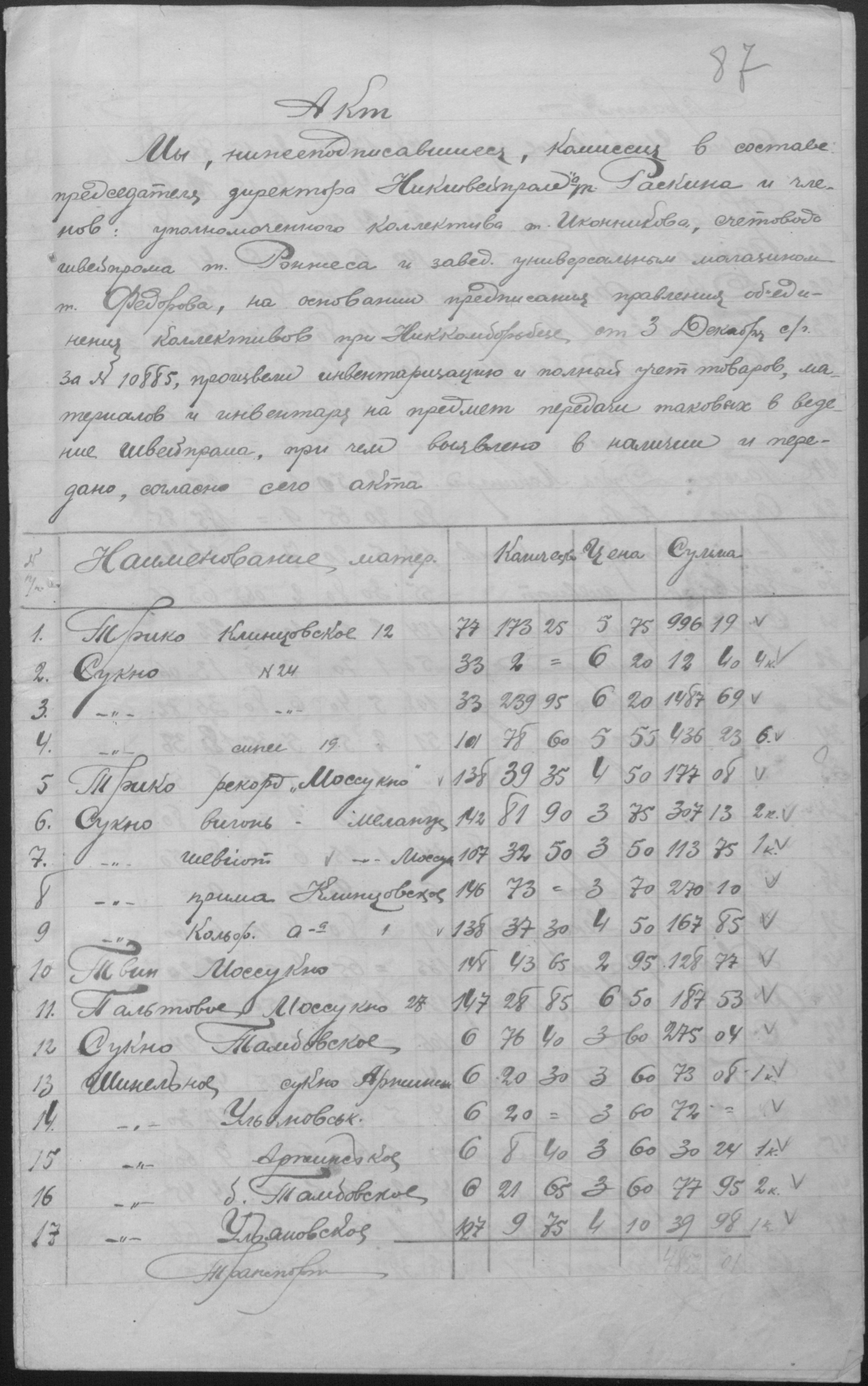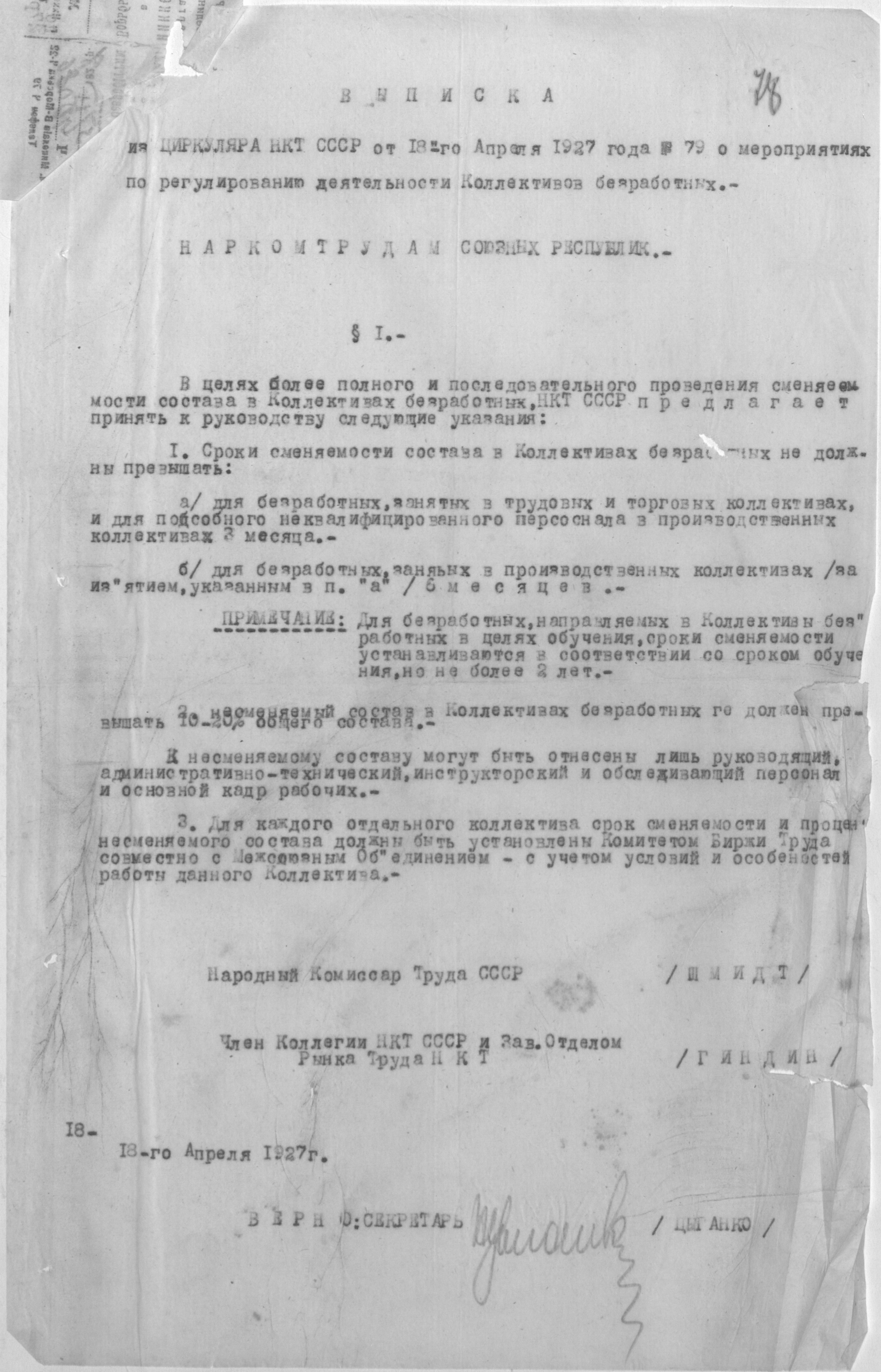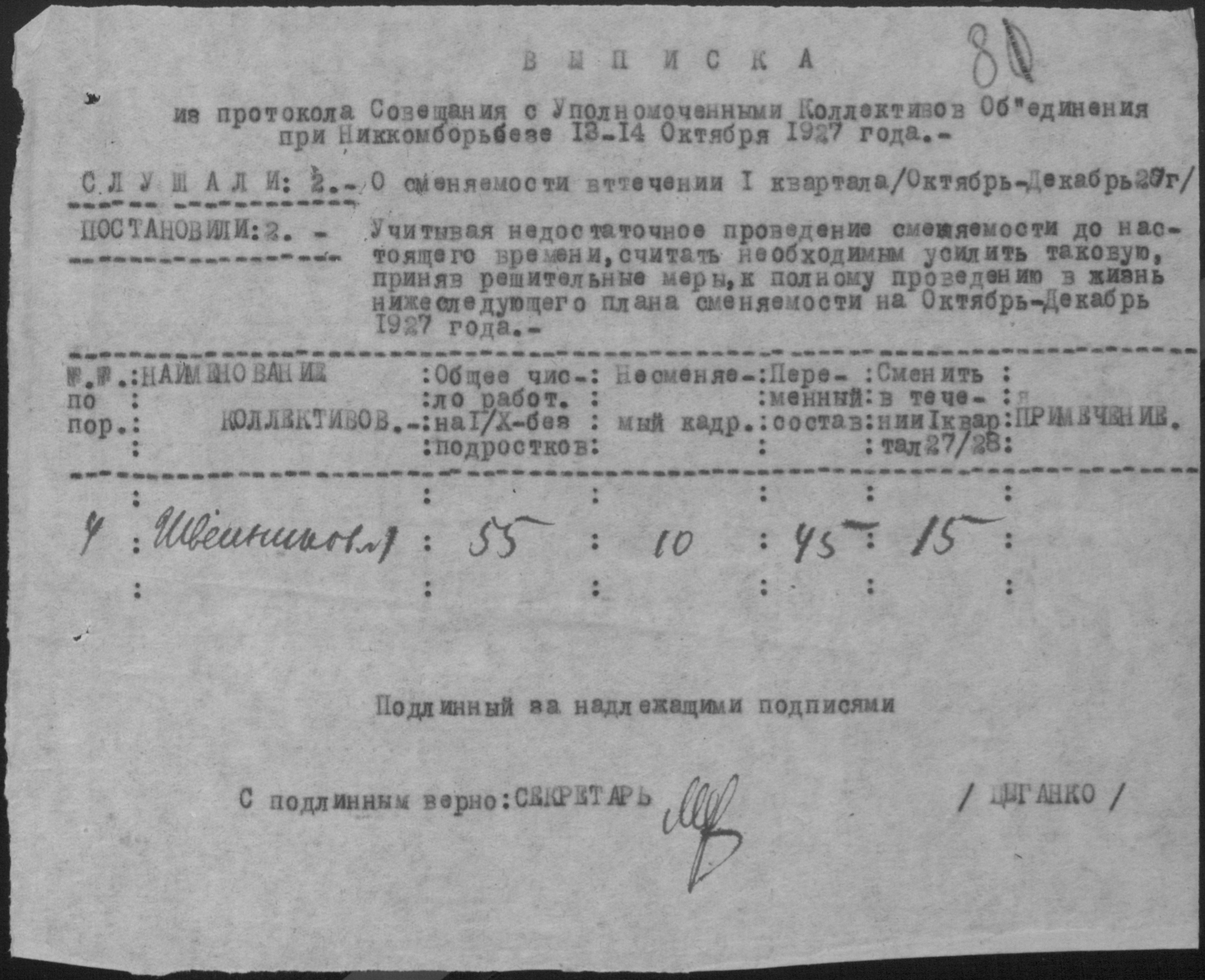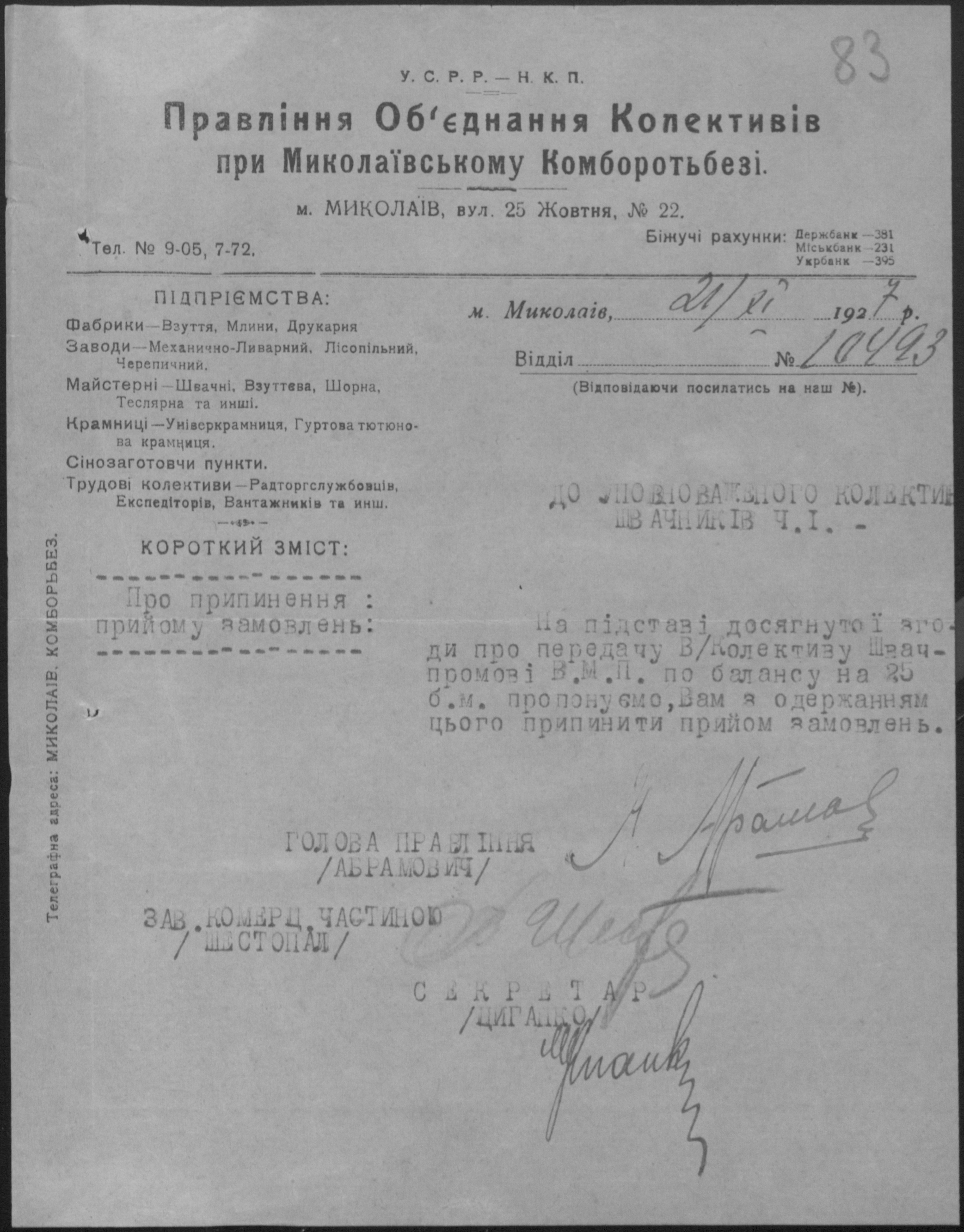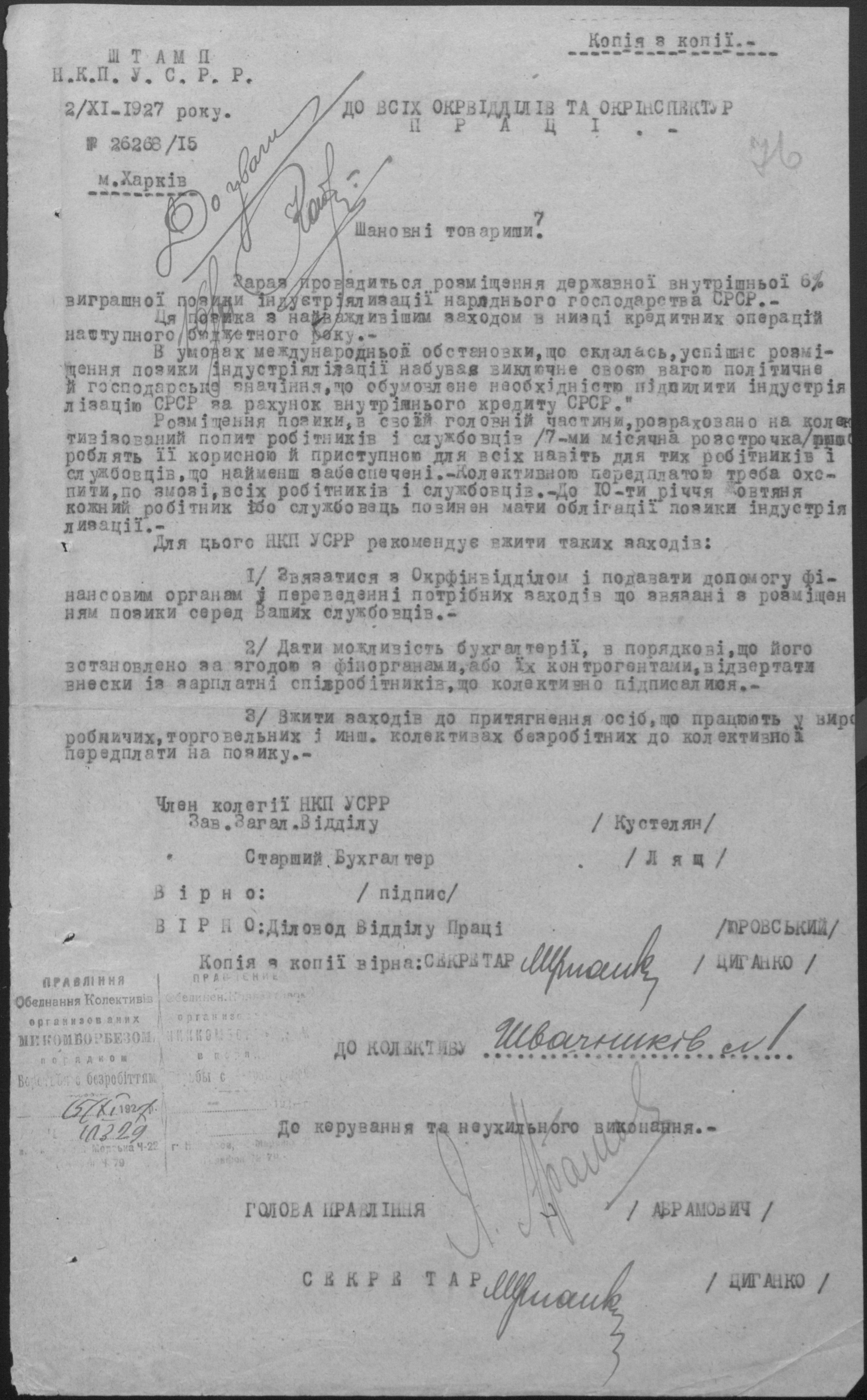 • • • • Справа № 20 “Обіжник Народного комісаріату праці УРСР про виплату підйомної допомоги особам, які переводяться у партійному порядку. Обіжник Народного комісаріату зовнішньої і внутрішньої торгівлі УРСР про зниження роздрібних цін. Листування з правлінням об’єднання колективів безробітних при Миккомборбезі з виробничих і господарських питань. Протоколи засідань членів колективу. Акти інвентаризації”