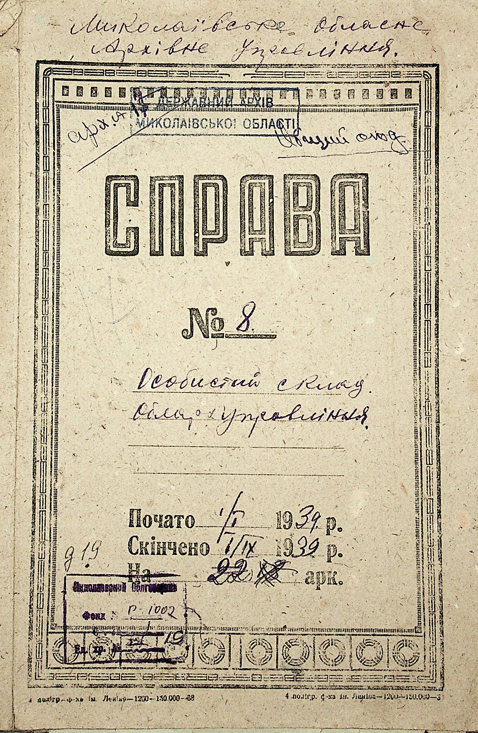 ◦ ◦ Фонд № Р-1002 “Архівний відділ управління виконкому Миколаївської обласної Ради народних депутатів, м. Миколаїв”
