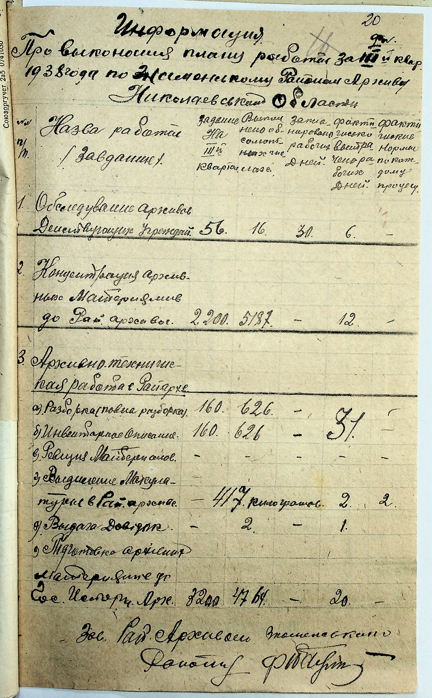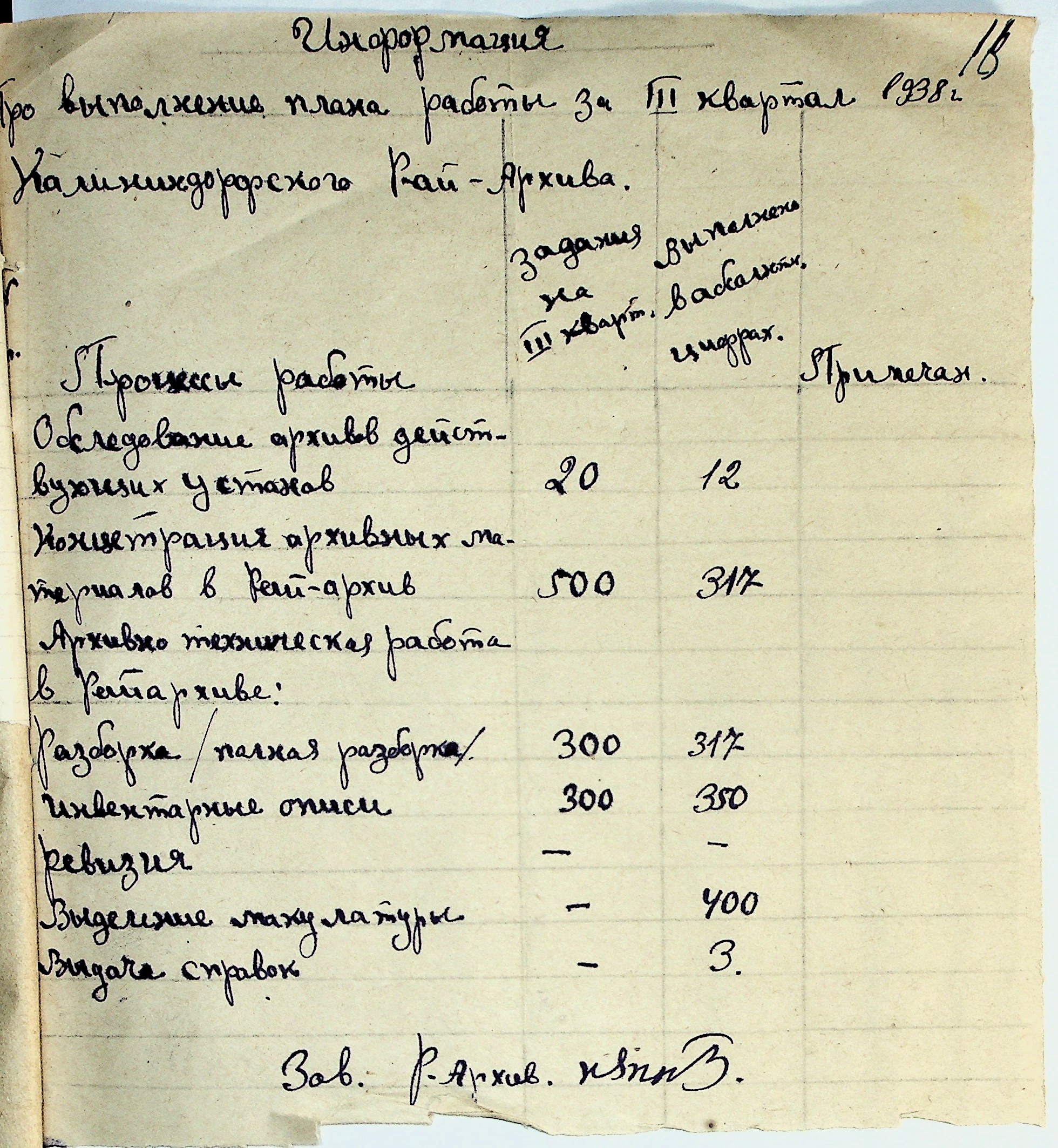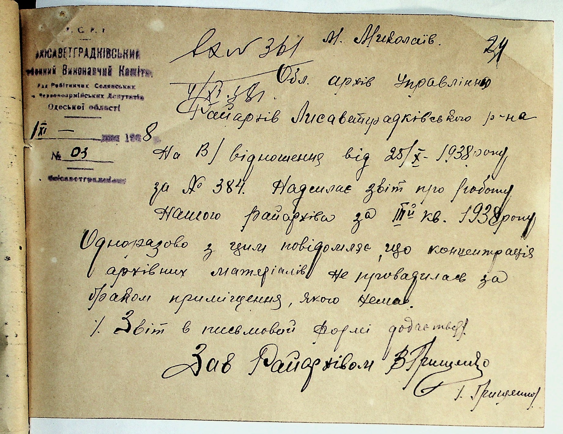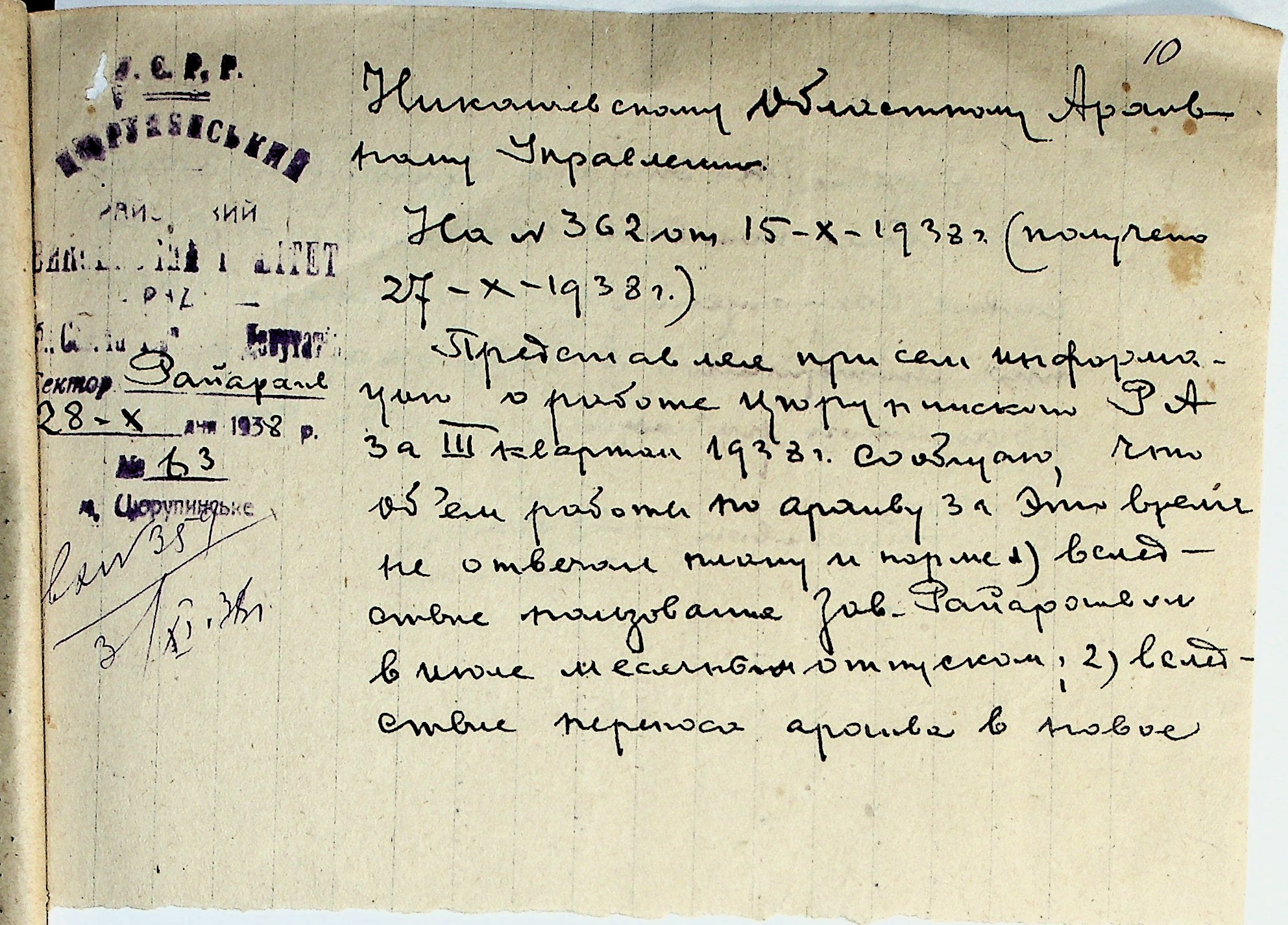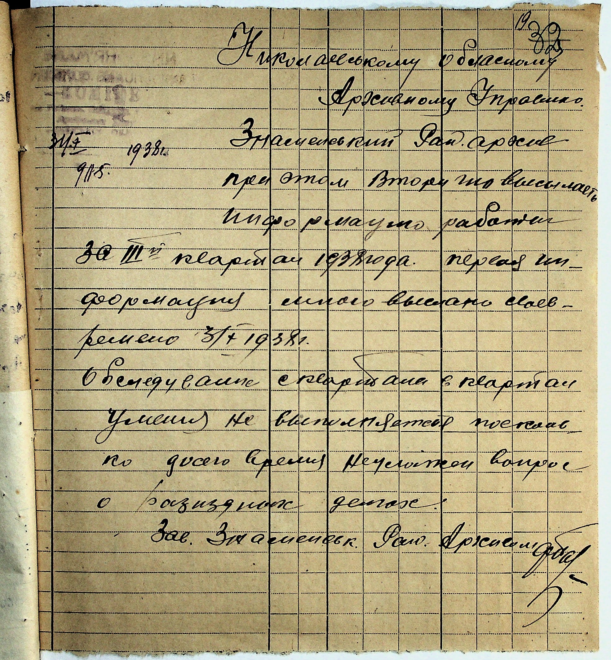 • • • • Справа № 31 “Документи (звіти, інформації, відомості, листування) про виконання планів роботи за ІІІ-й квартал 1938 р. районними архівами”
