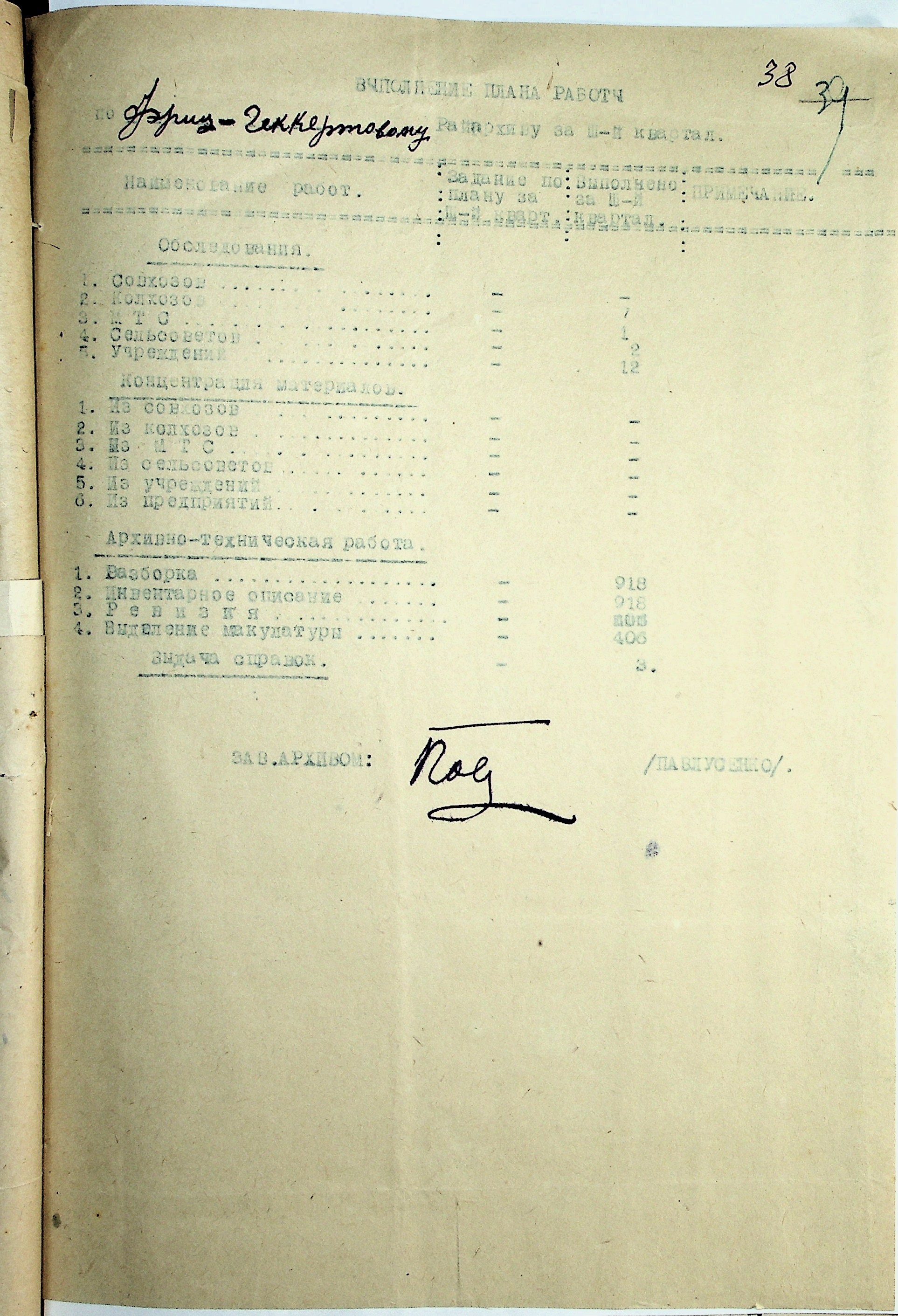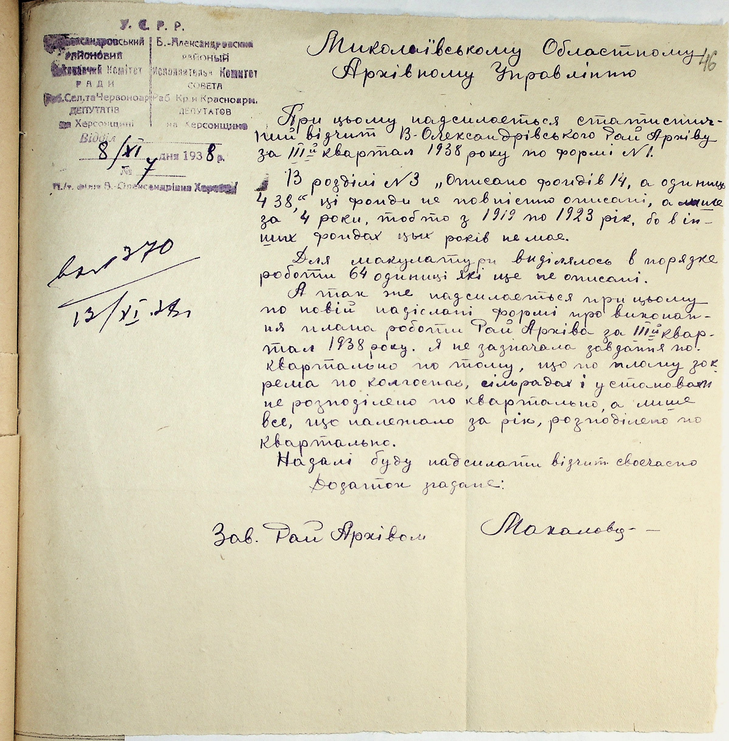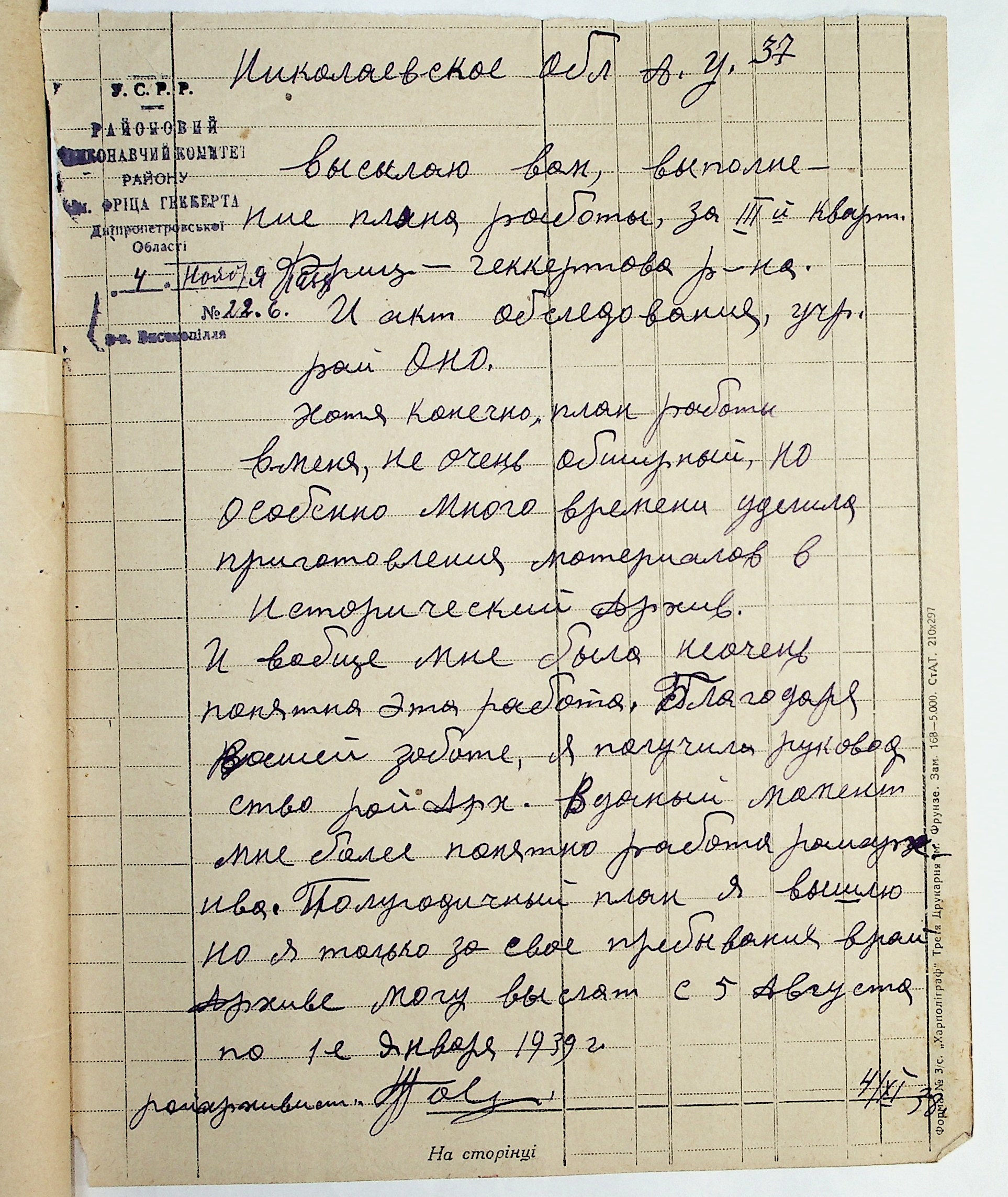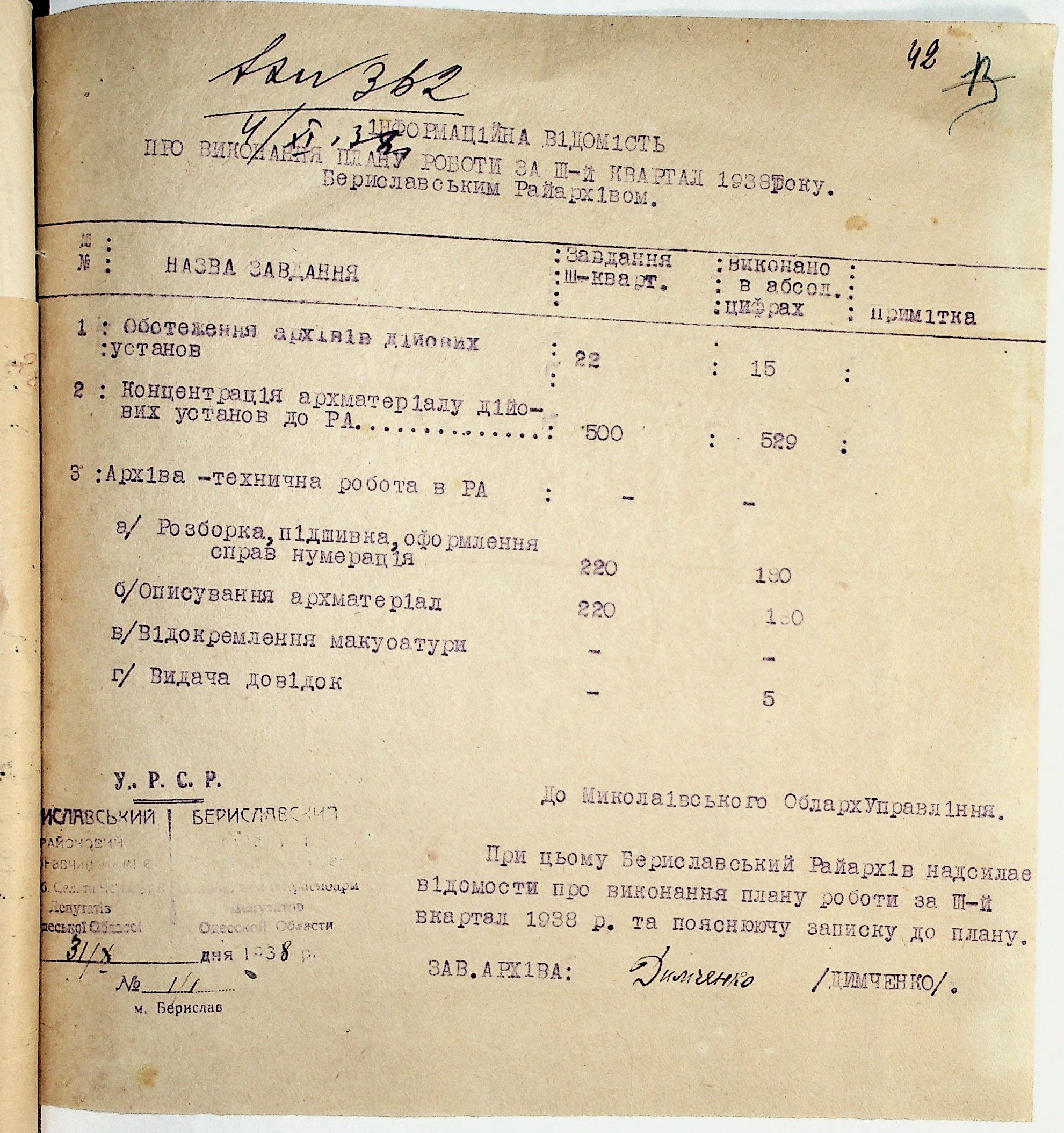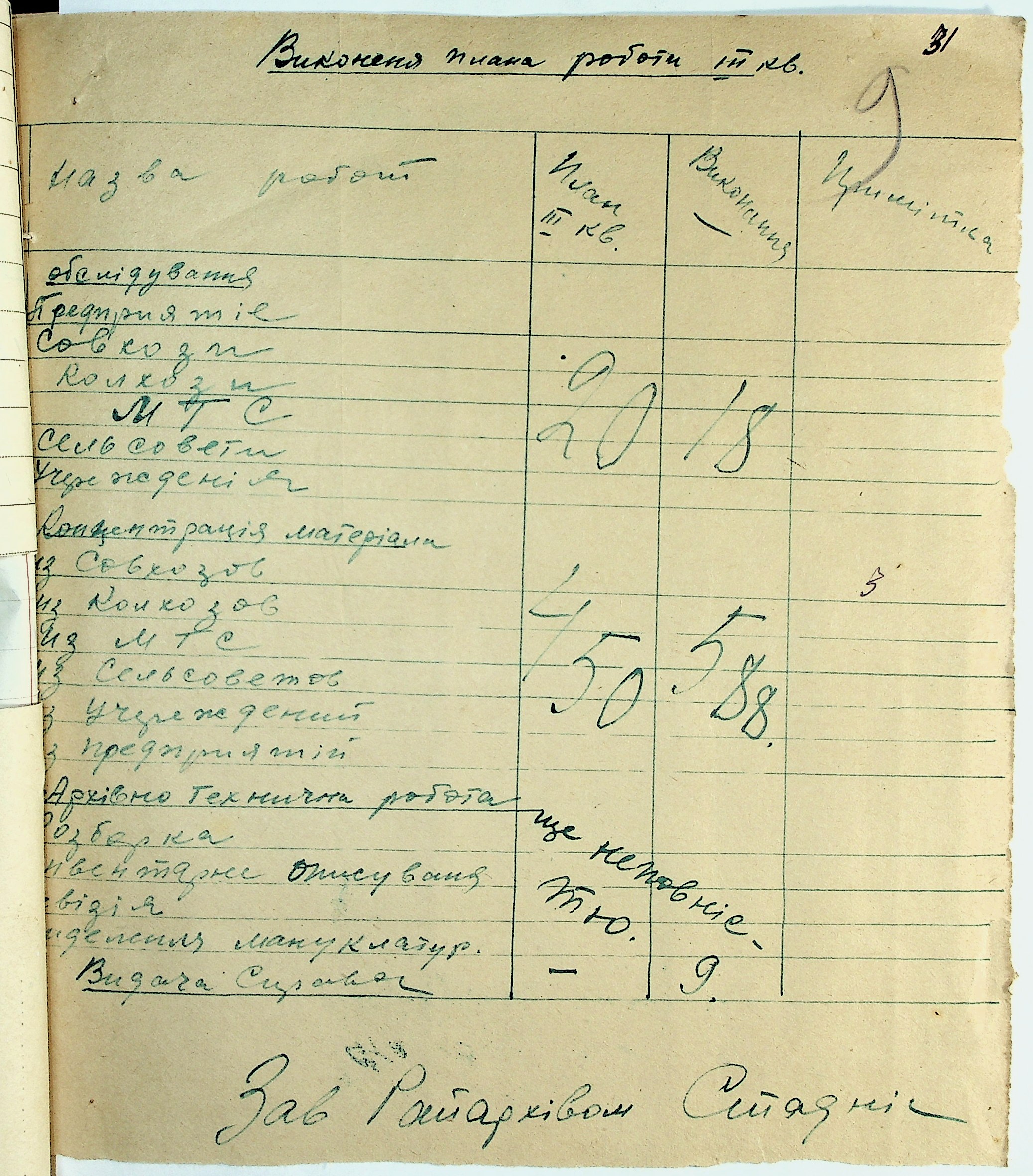 • • • • Справа № 31 “Документи (звіти, інформації, відомості, листування) про виконання планів роботи за ІІІ-й квартал 1938 р. районними архівами”