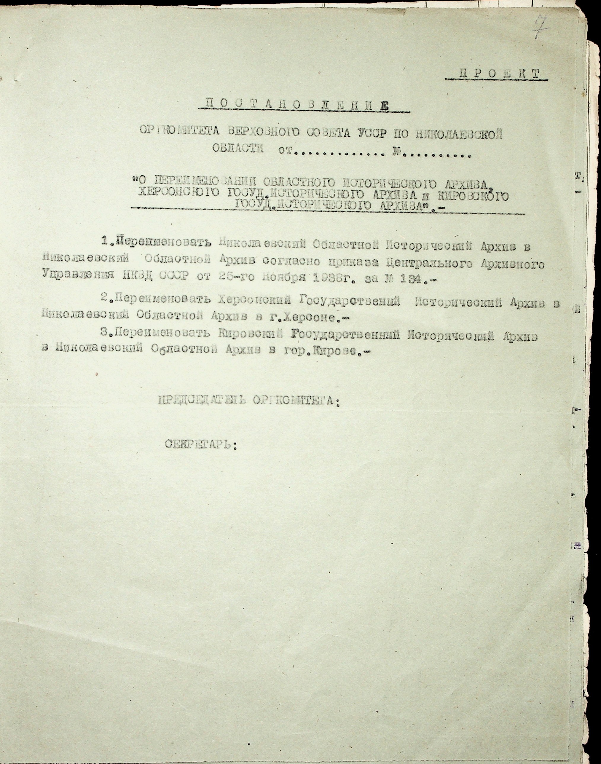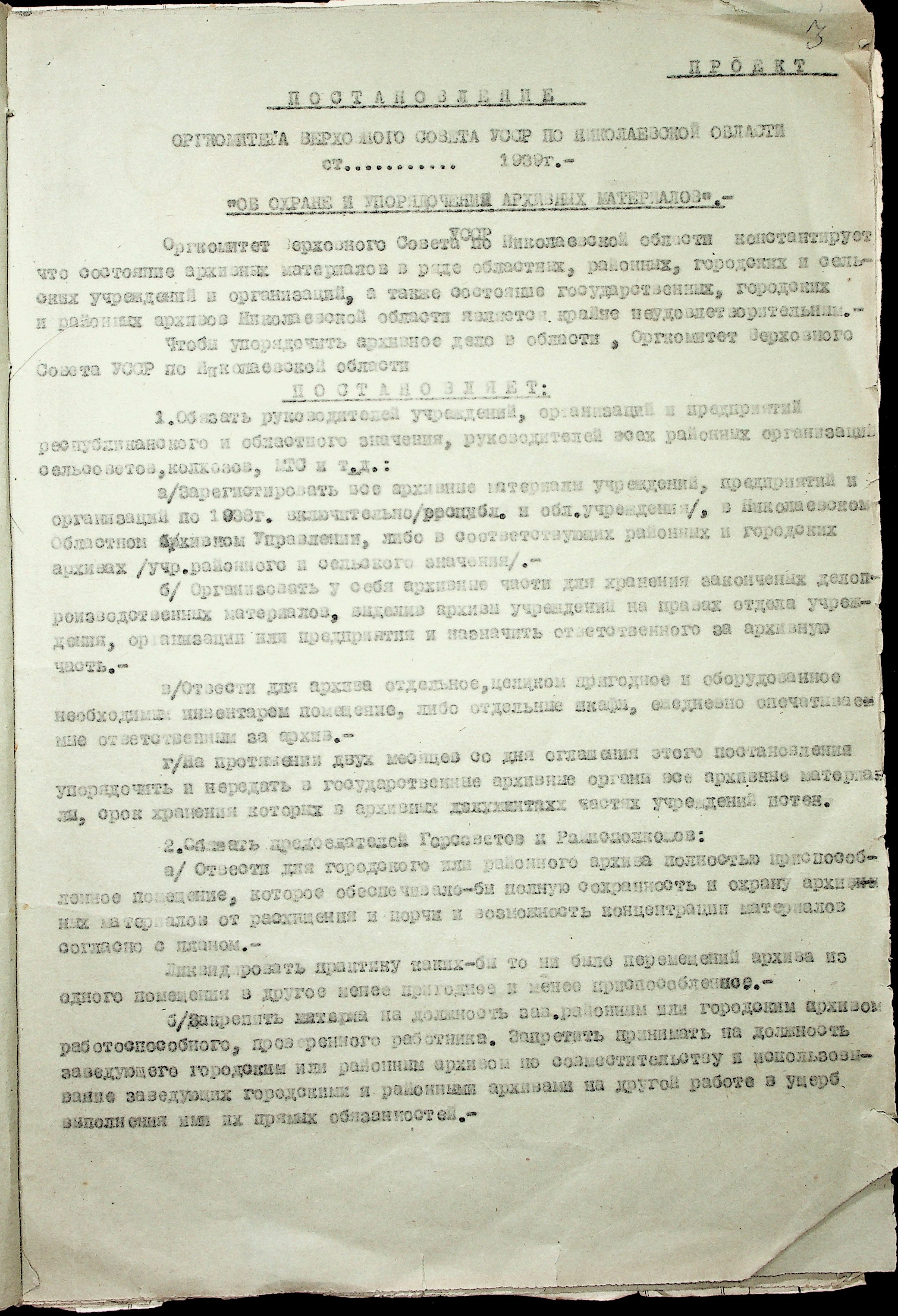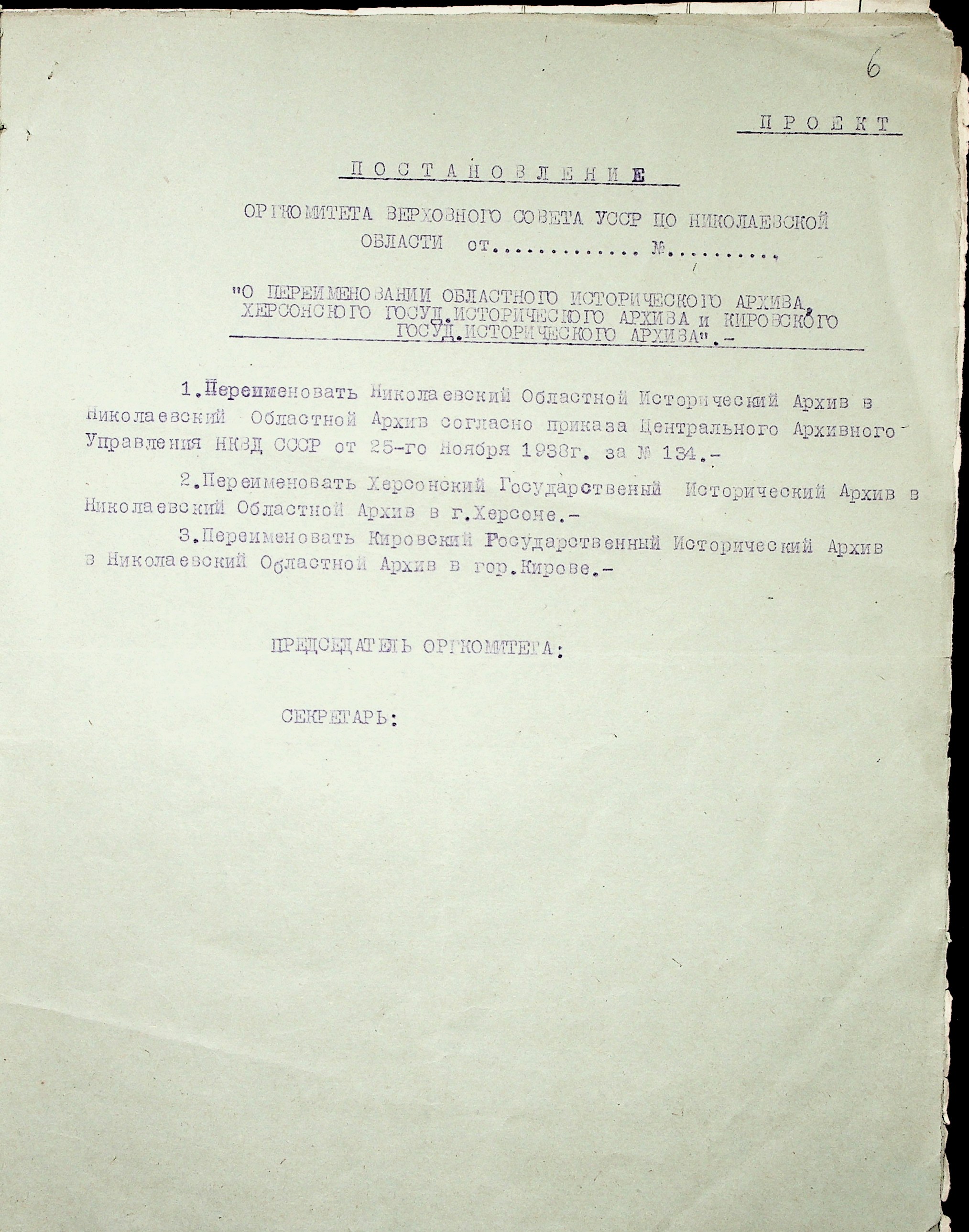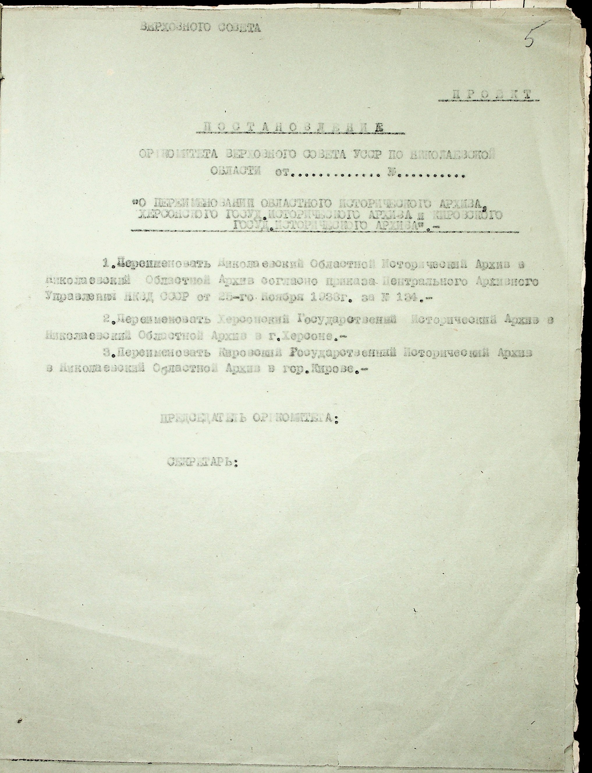 • • • • Справа № 36 “Проєкти постанов оргкомітету Верховної Ради УРСР по Миколаївській області про охорону і впорядкування архівних матеріалів, про перейменування Миколаївського, Херсонського та Кіровського обласних історичних архівів. Доповідна записка про роботу архівних установ Миколаївської області”