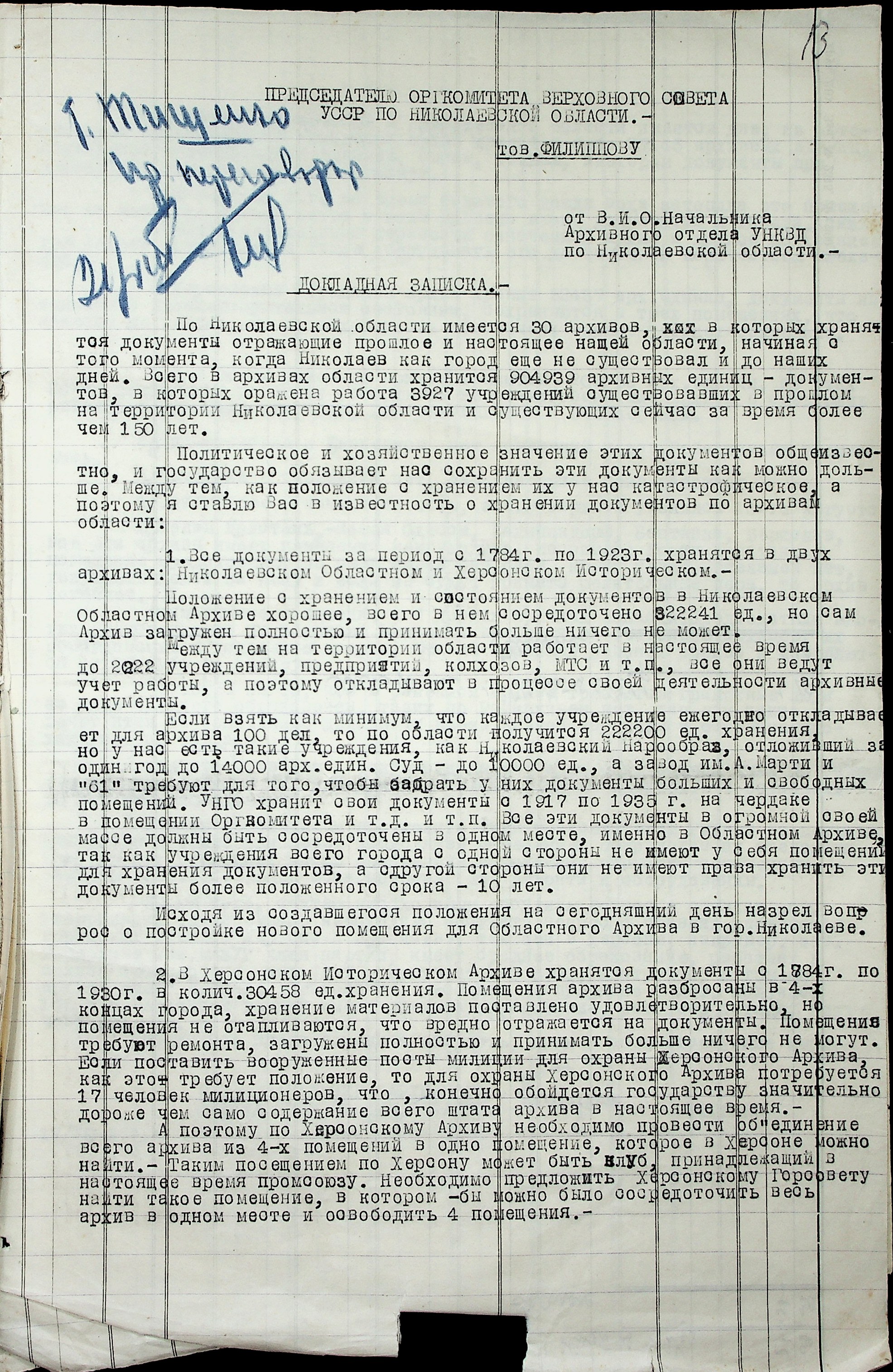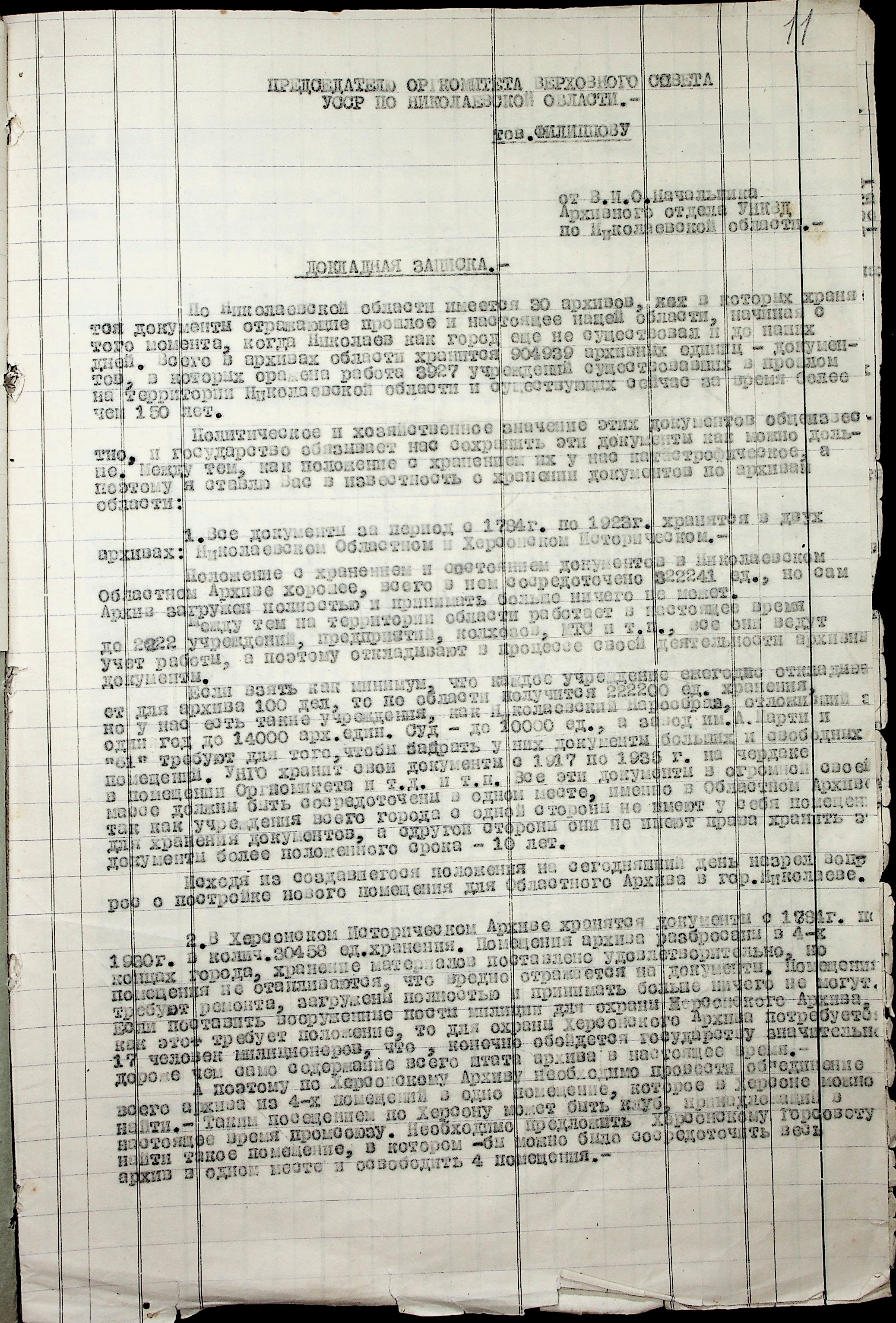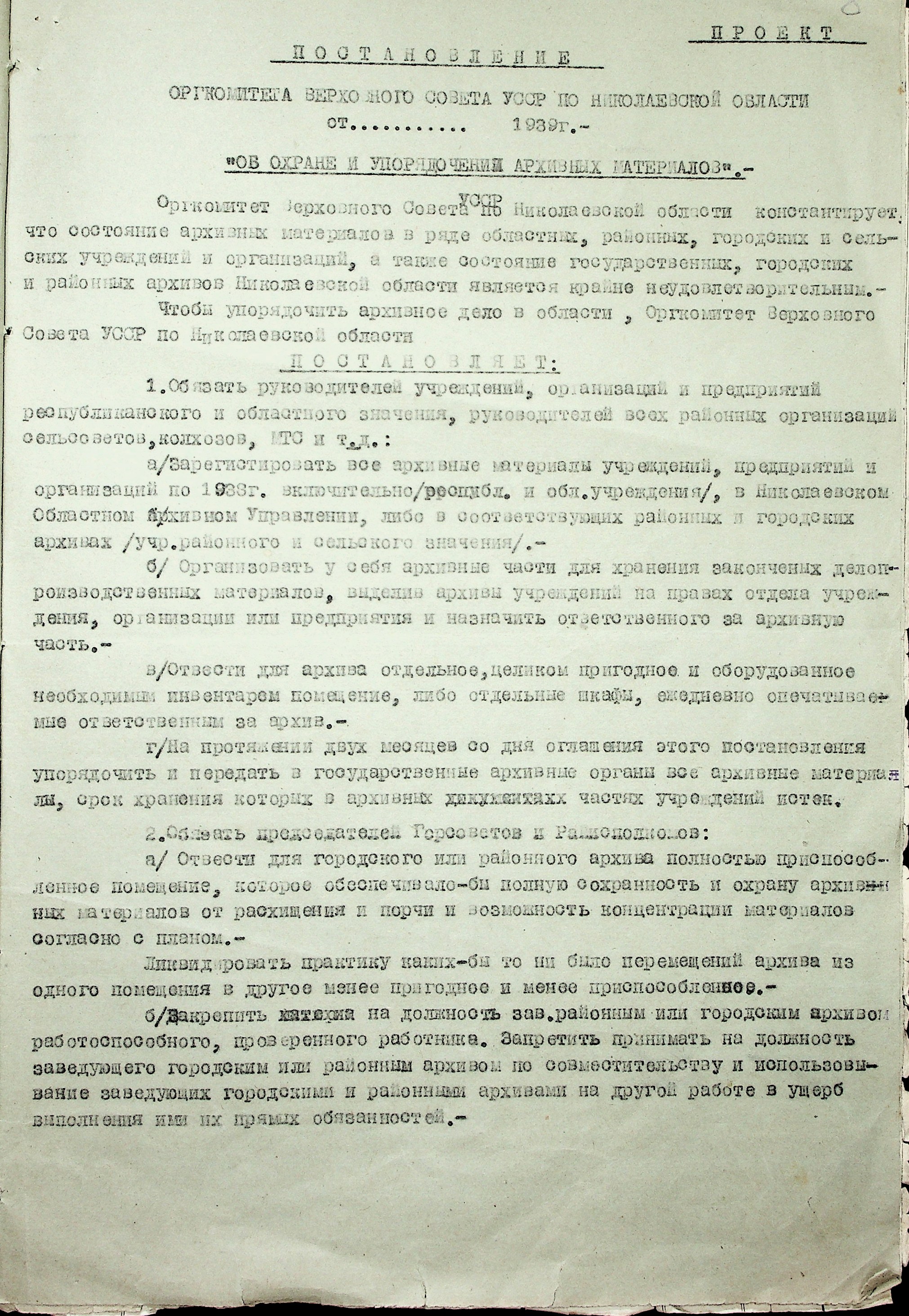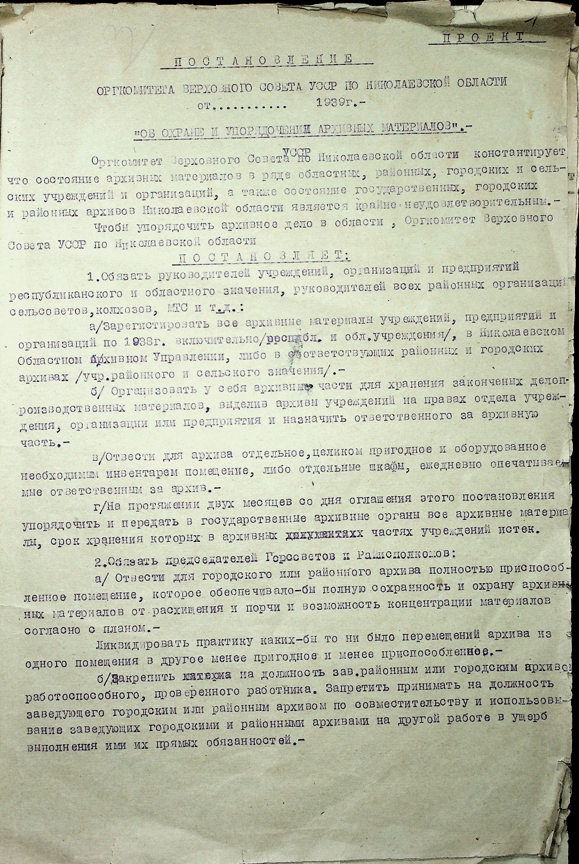 • • • • Справа № 36 “Проєкти постанов оргкомітету Верховної Ради УРСР по Миколаївській області про охорону і впорядкування архівних матеріалів, про перейменування Миколаївського, Херсонського та Кіровського обласних історичних архівів. Доповідна записка про роботу архівних установ Миколаївської області”
