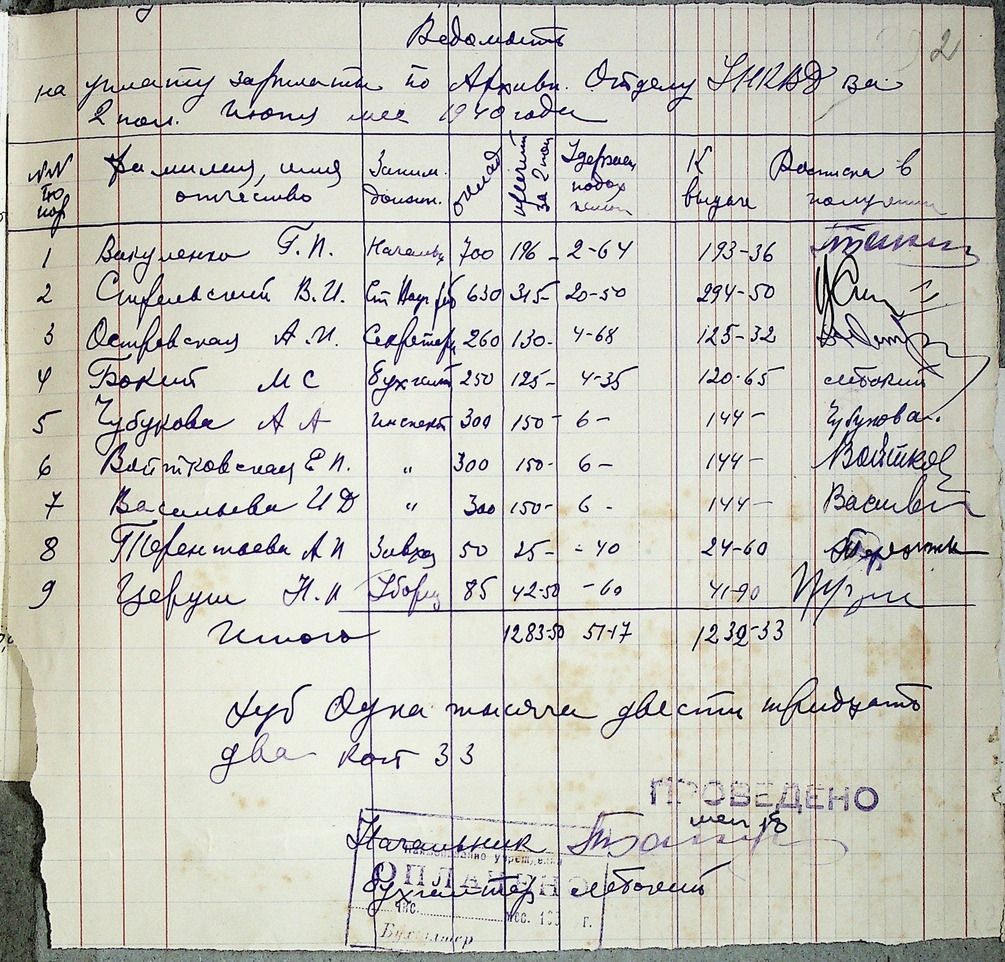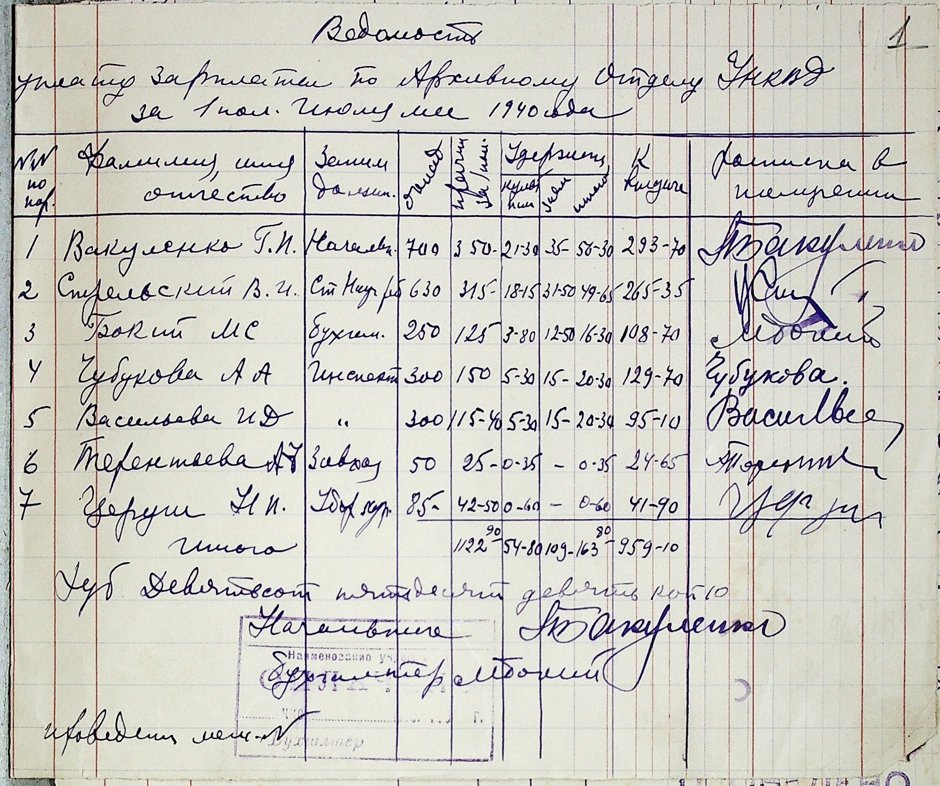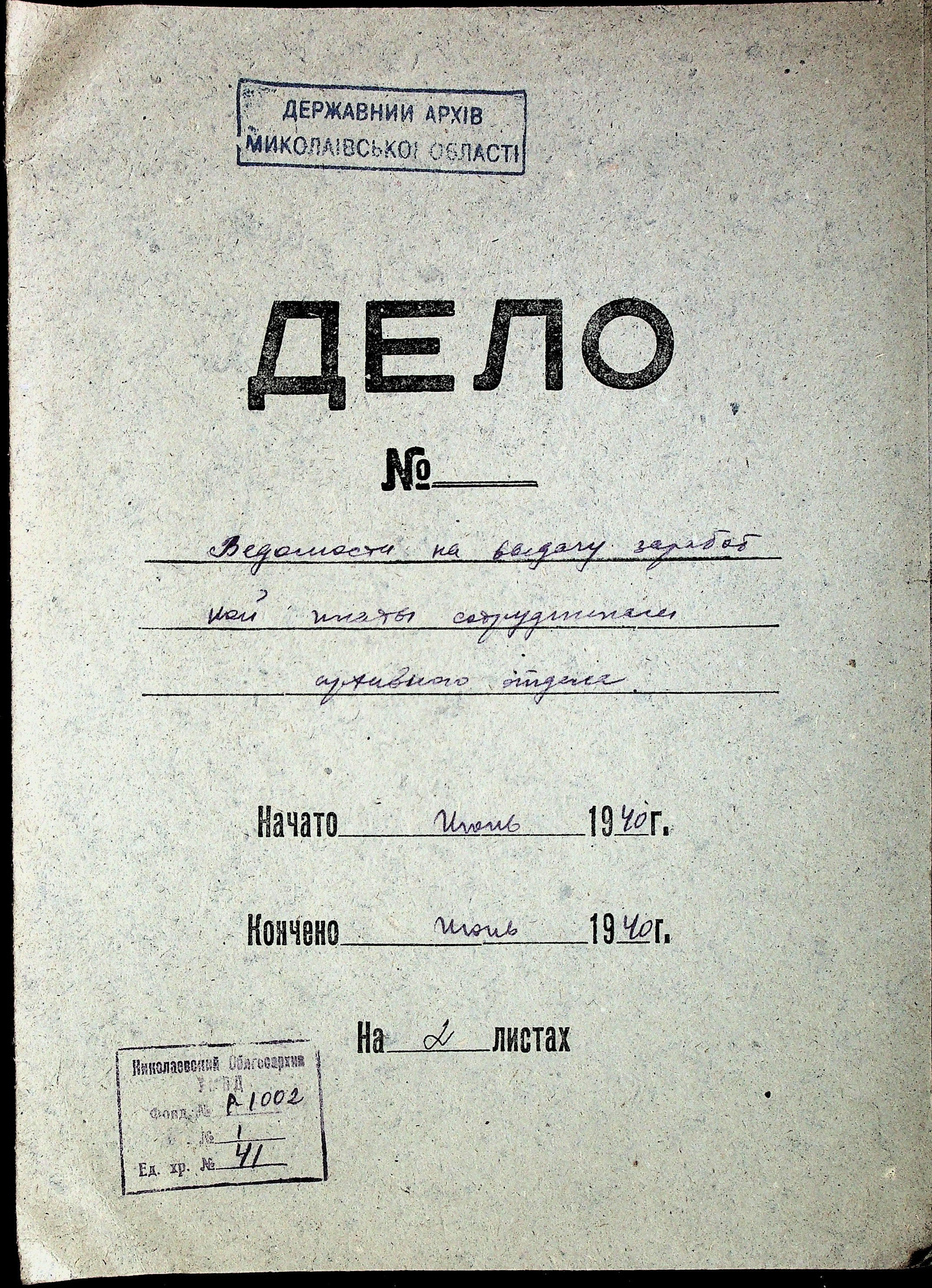 • • • • Справа № 41 “Відомості на видачу заробітної плати співробітникам архівного відділу за червень 1940 р.”