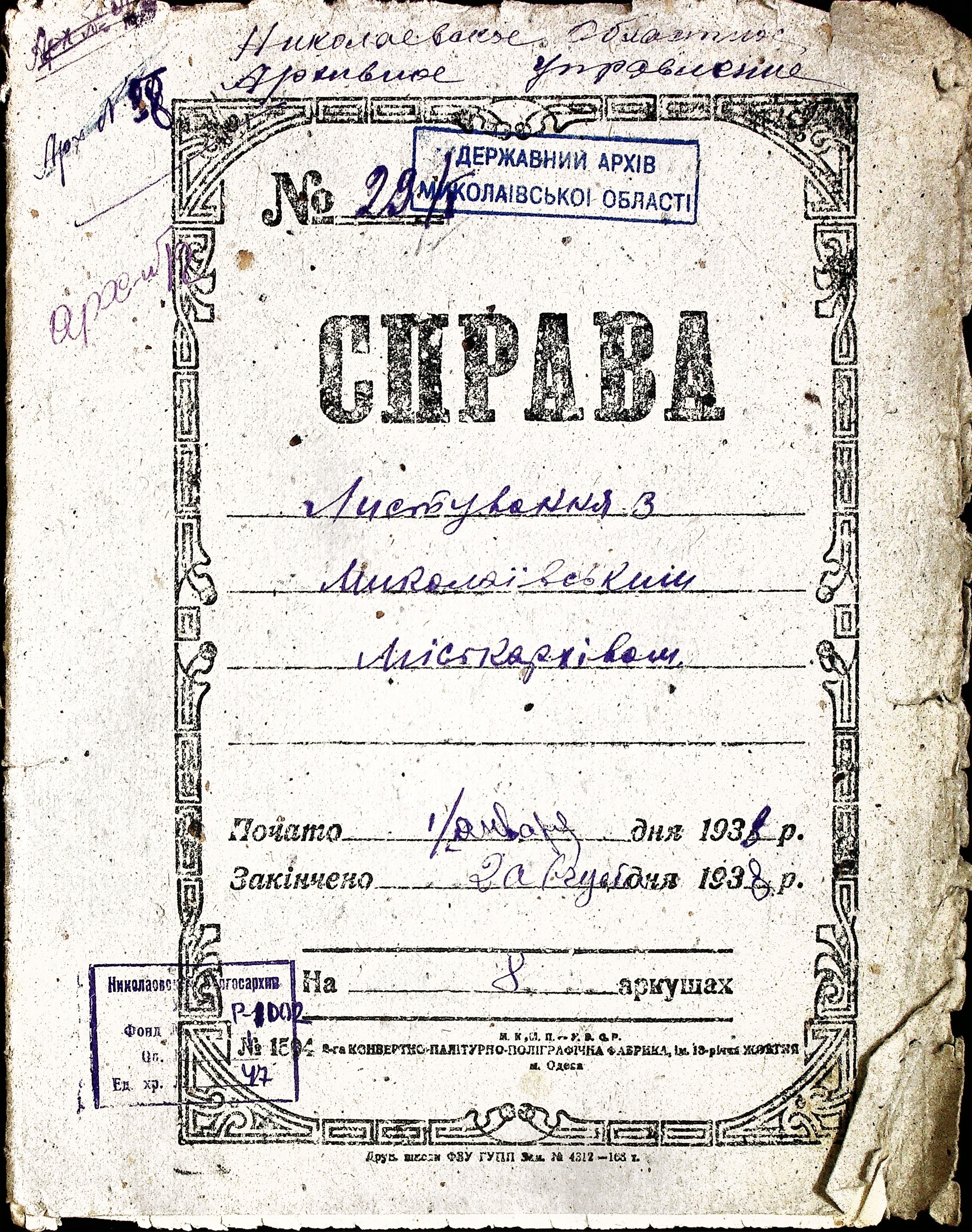 ◦ ◦ Фонд № Р-1002 “Архівний відділ управління виконкому Миколаївської обласної Ради народних депутатів, м. Миколаїв”