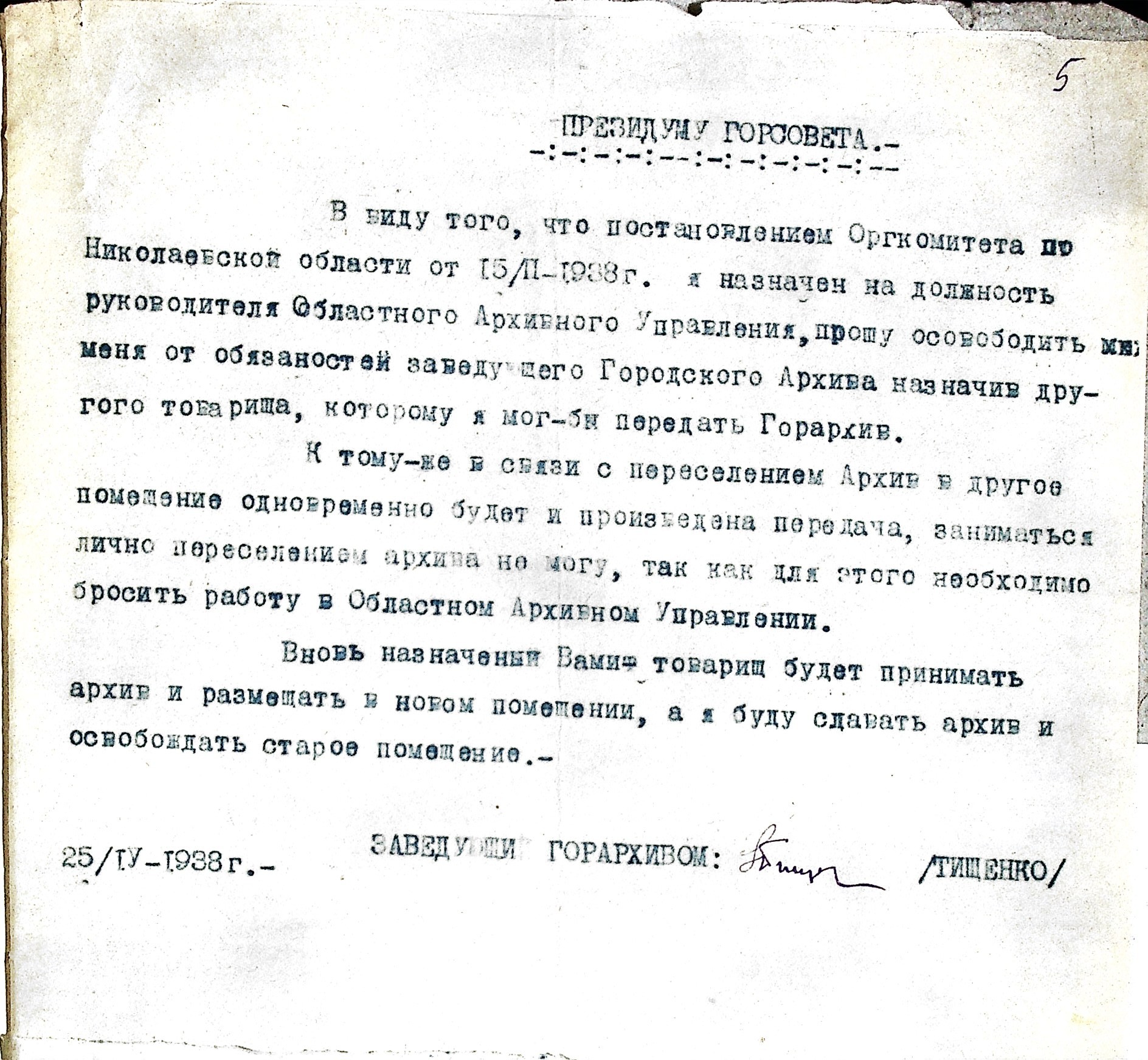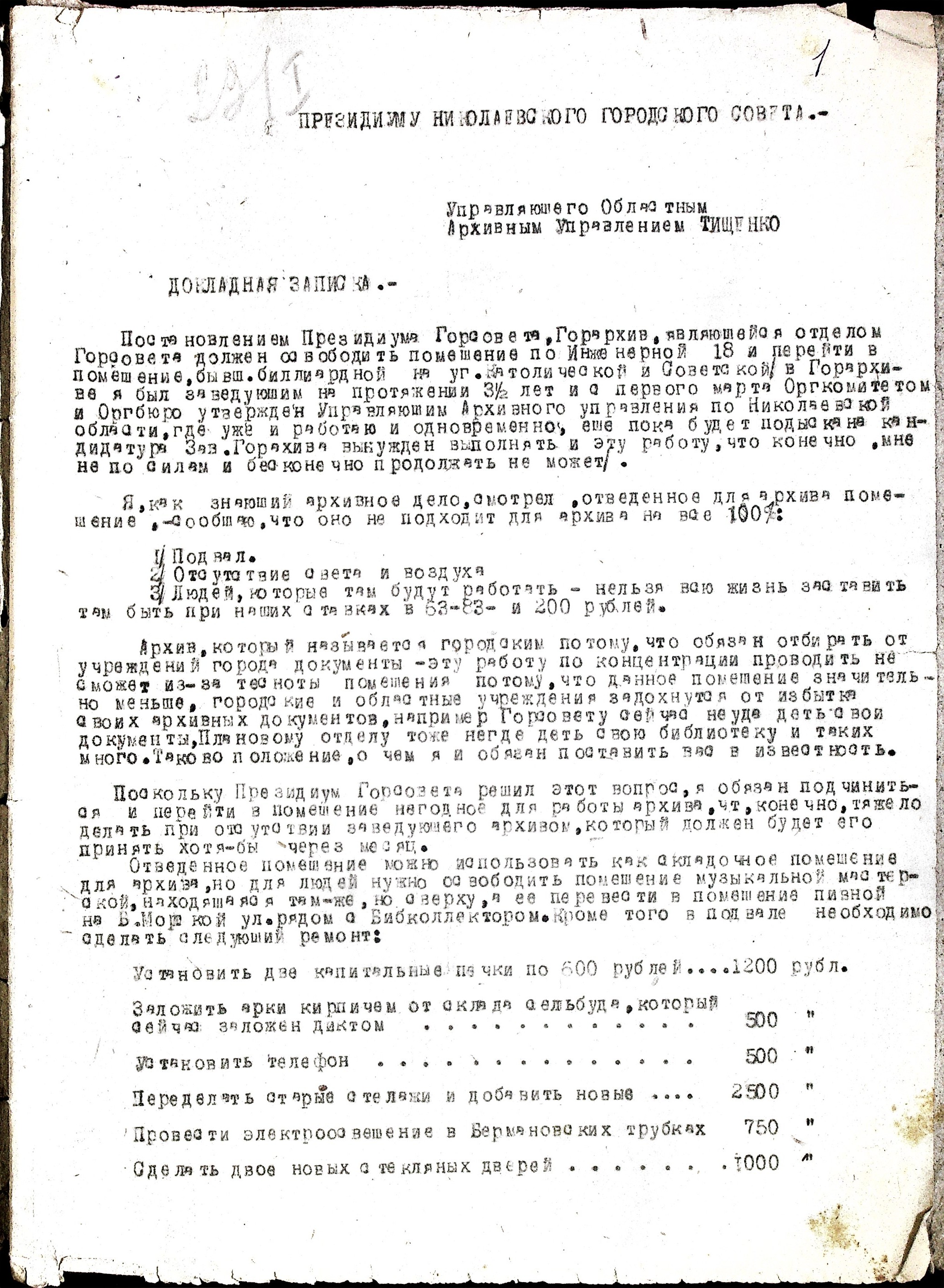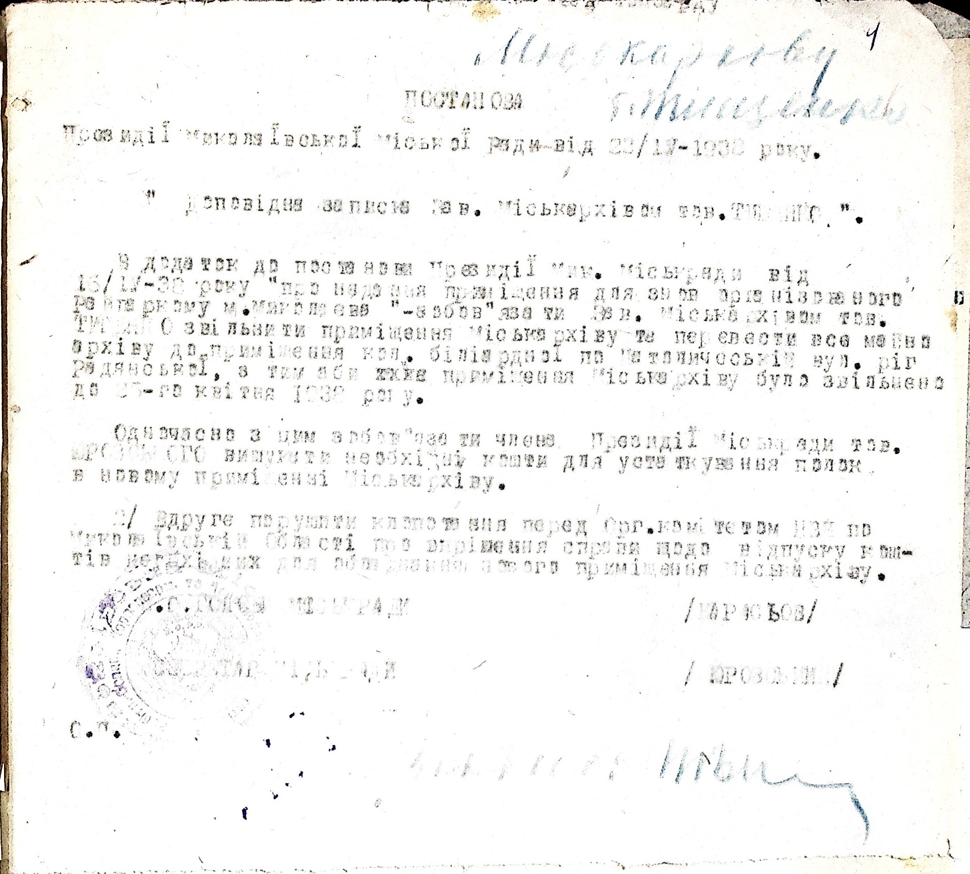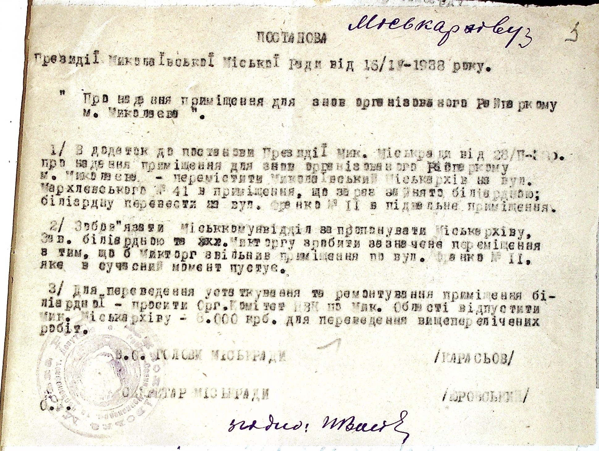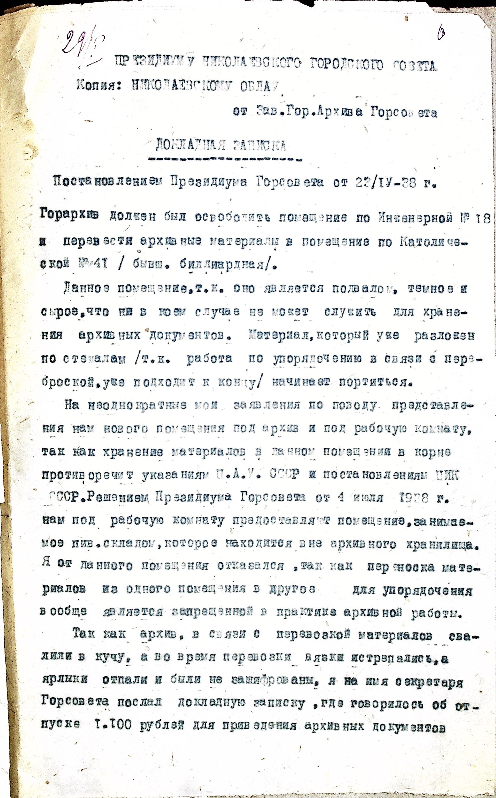 • • • • Справа № 47 “Постанови президії Миколаївської міської Ради та доповідні записки про переведення Миколаївського міського архіву до іншого приміщення”