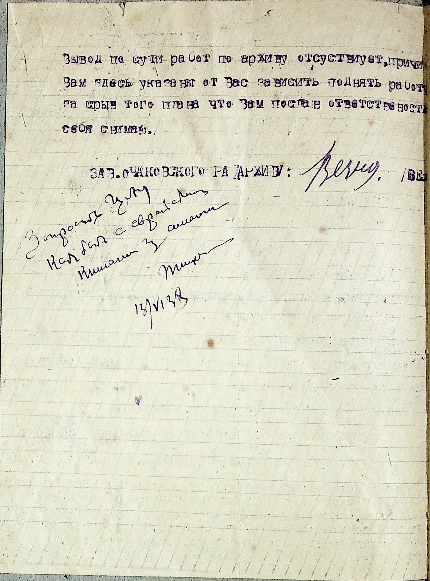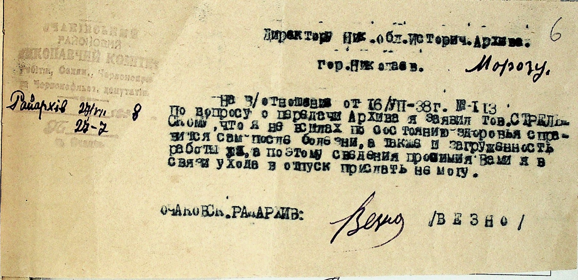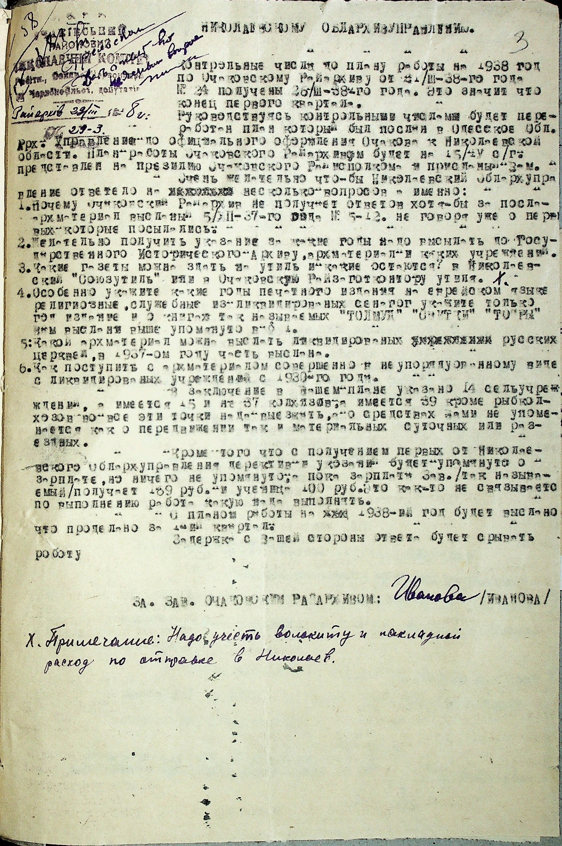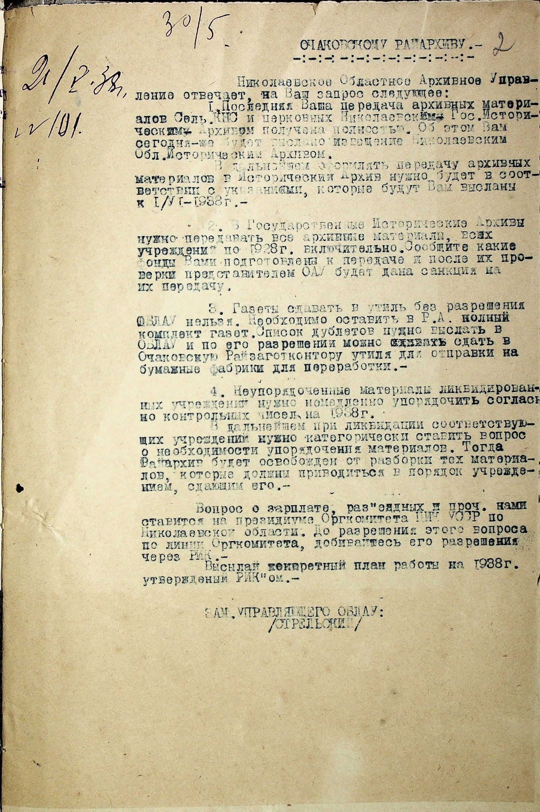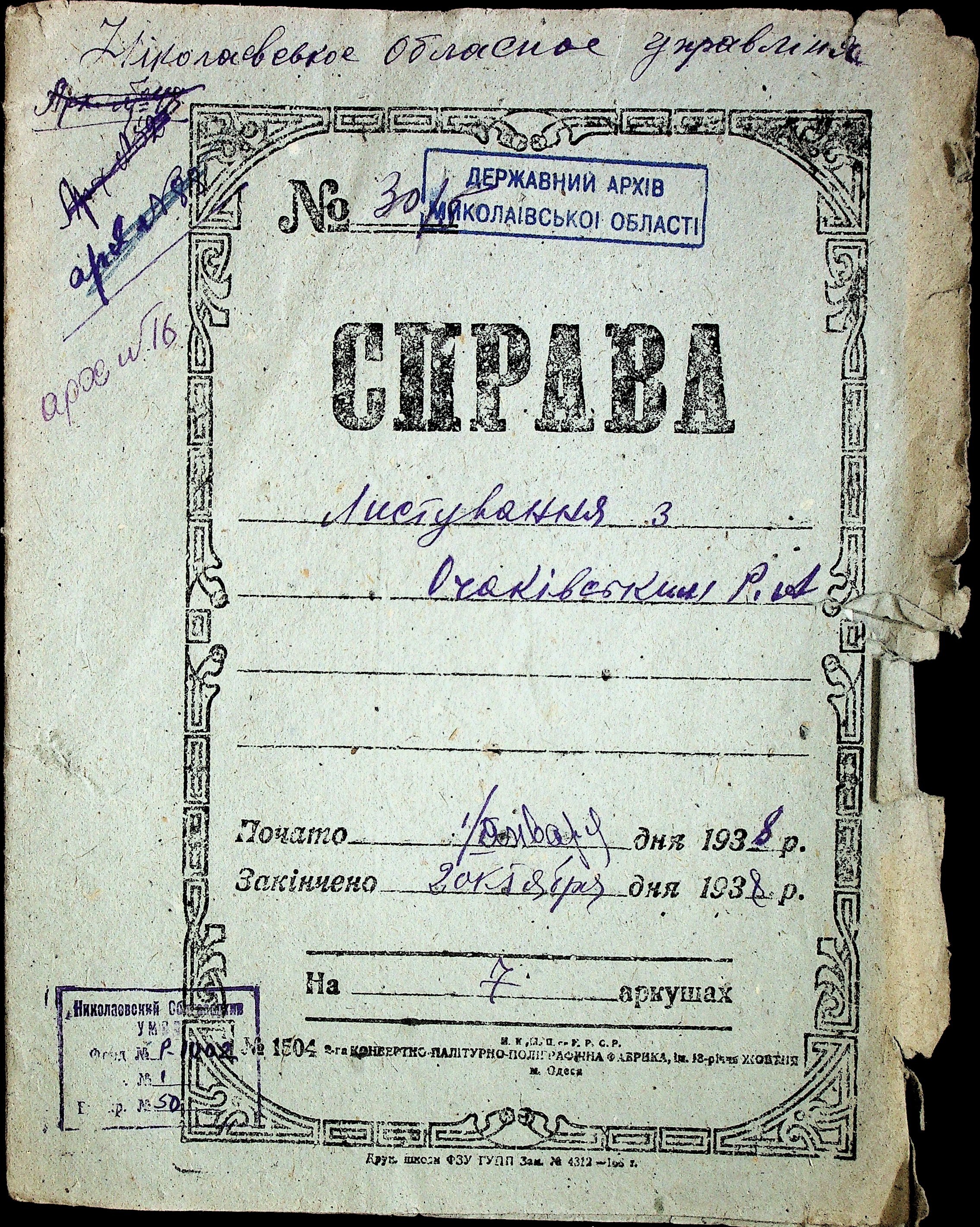 • • • • Справа № 50 “Листування з Очаківським районним архівом про порядок підготовки і передачі документів до Миколаївського обласного історичного архіву, план роботи районного архіву на 1938 р.”