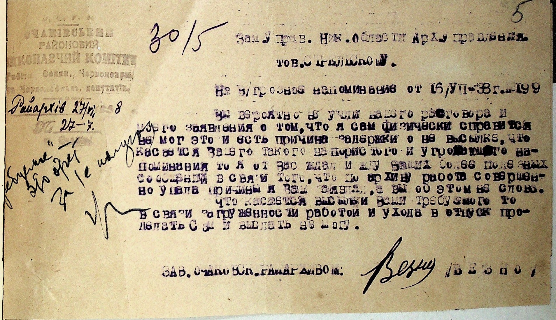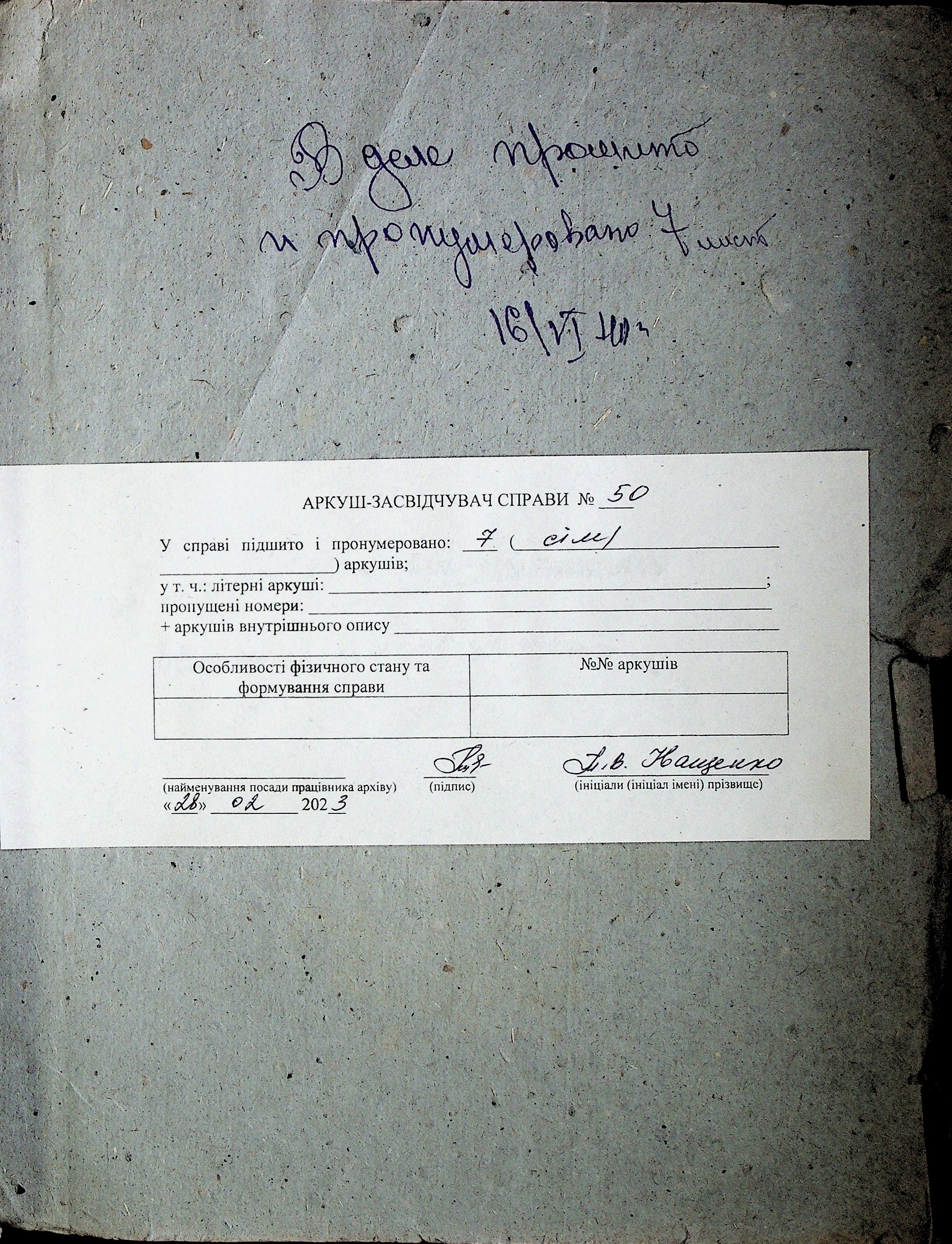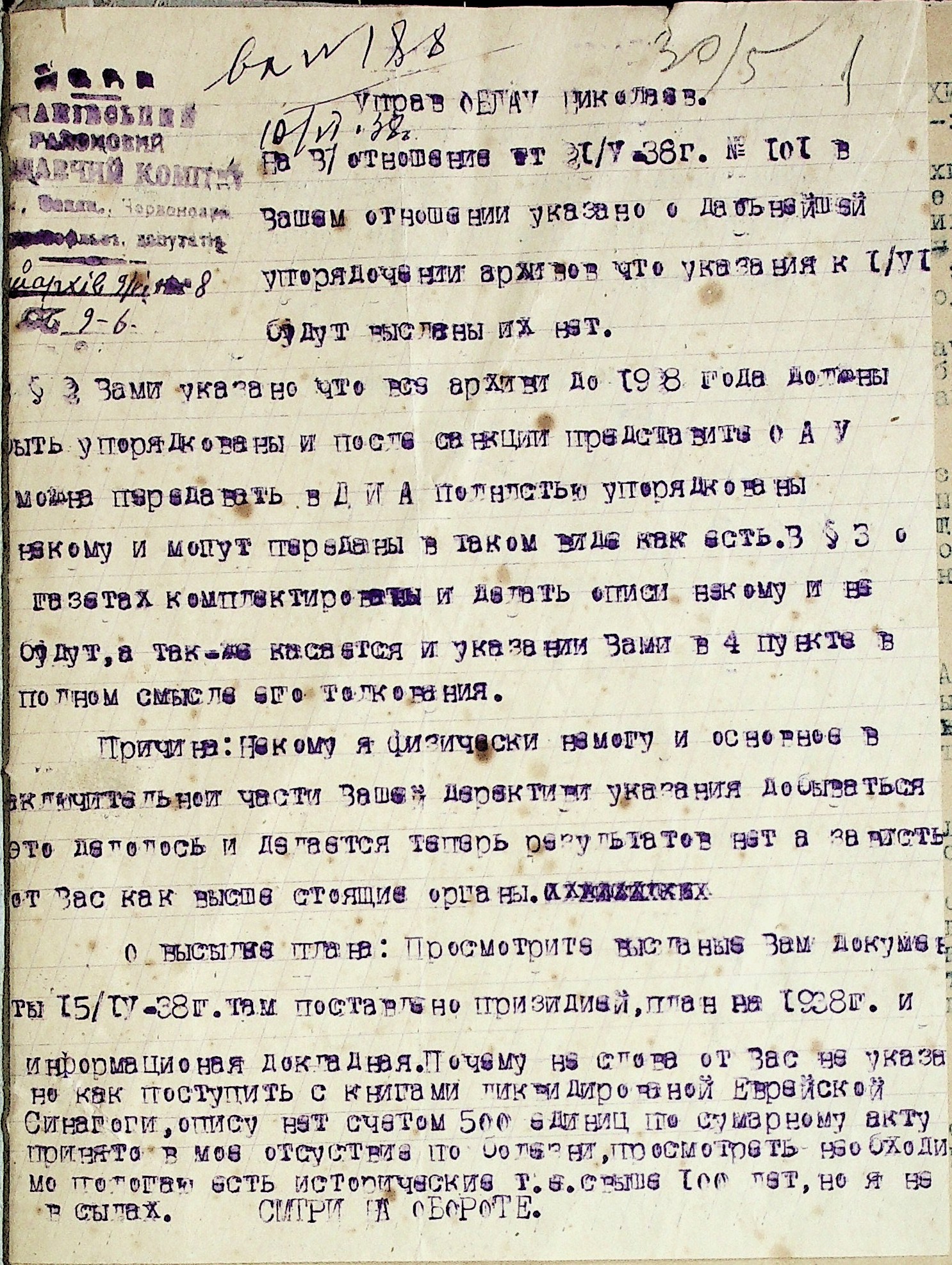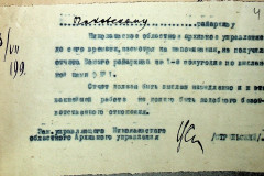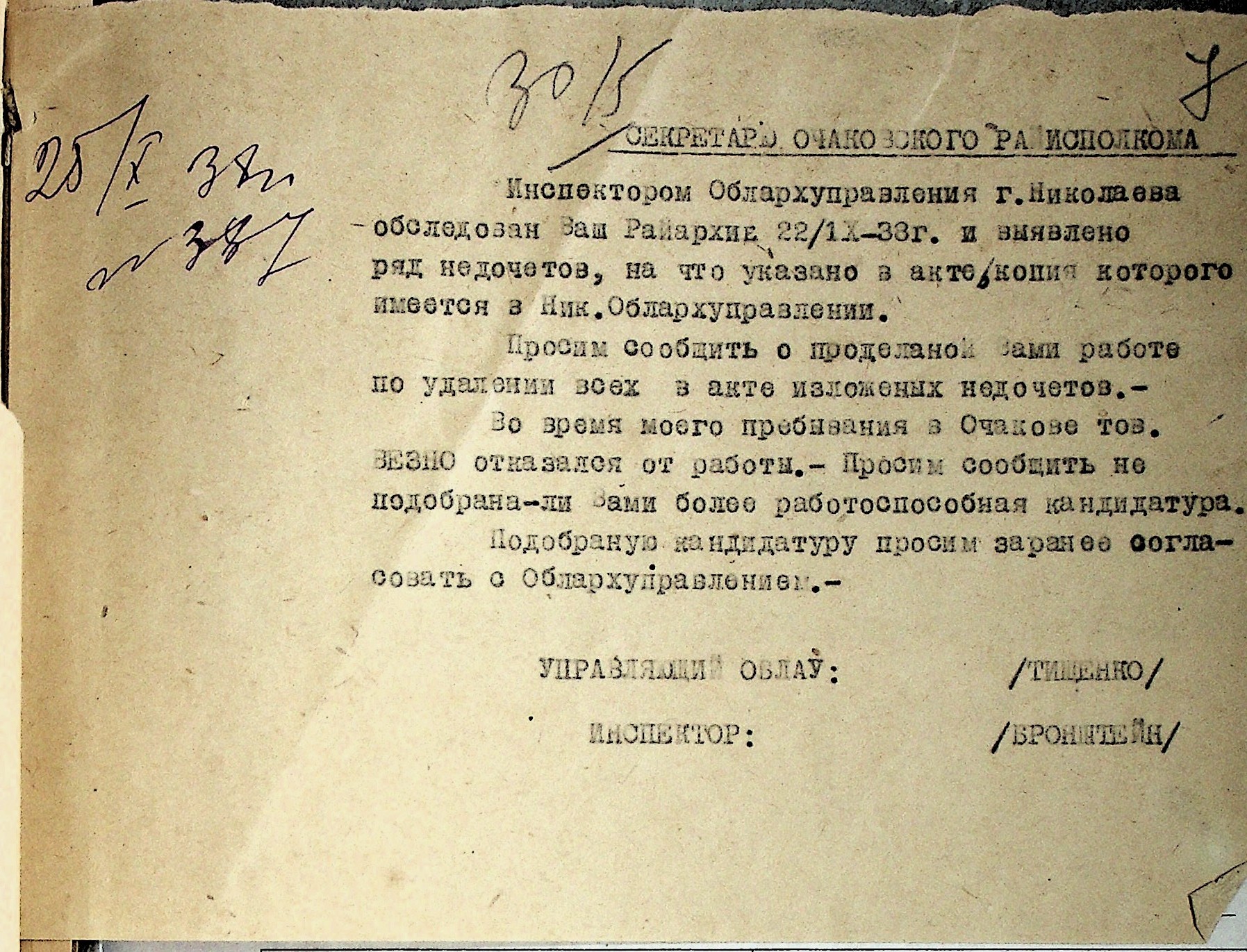 • • • • Справа № 50 “Листування з Очаківським районним архівом про порядок підготовки і передачі документів до Миколаївського обласного історичного архіву, план роботи районного архіву на 1938 р.”