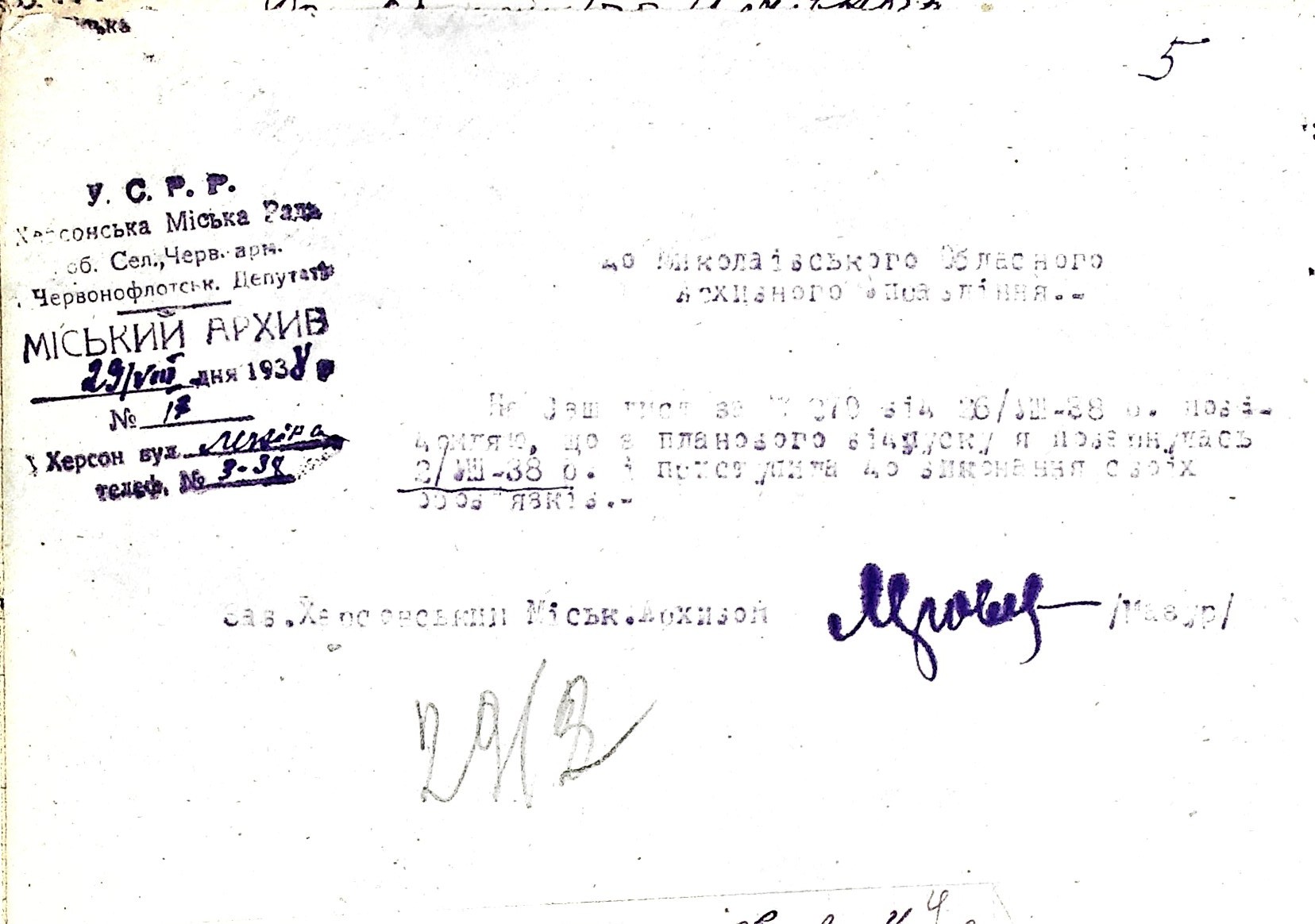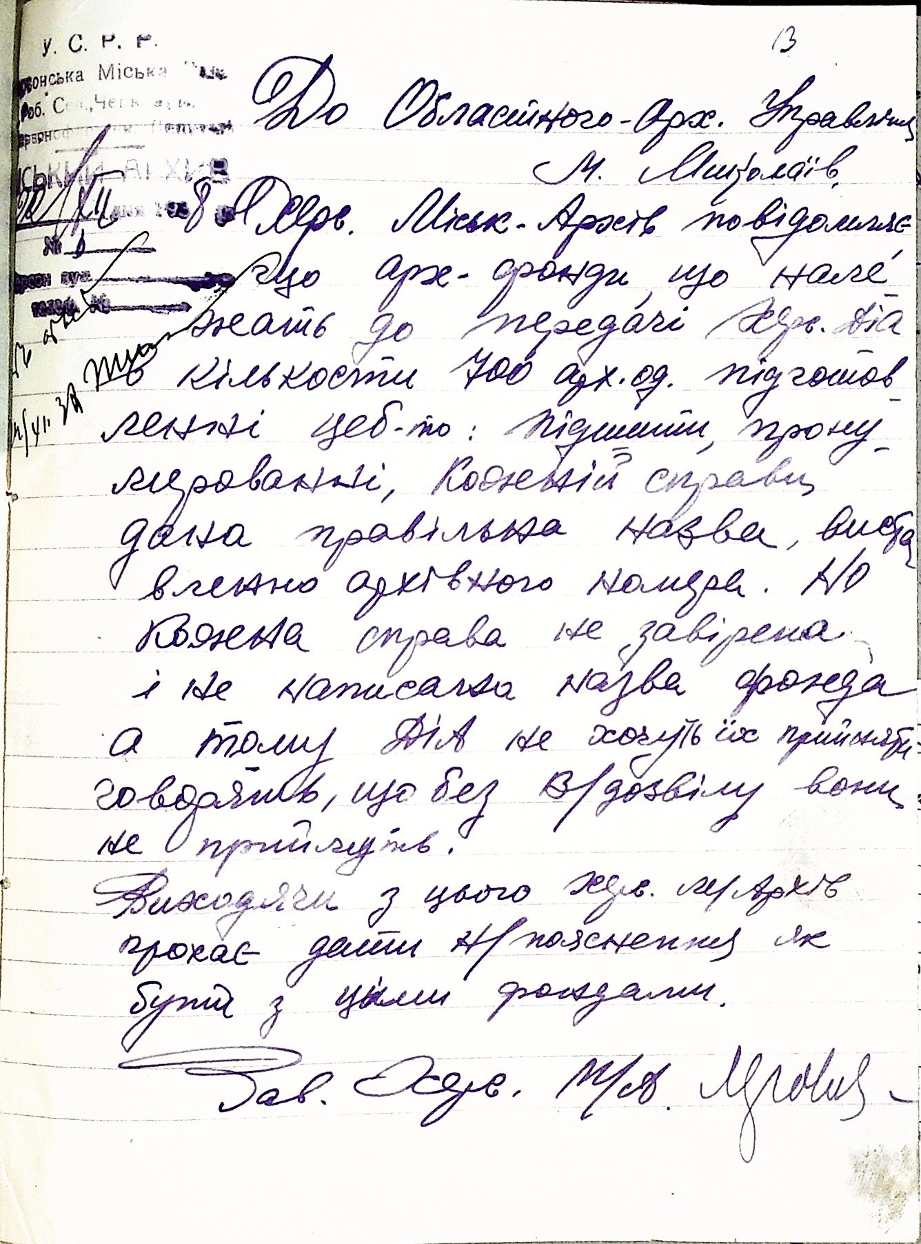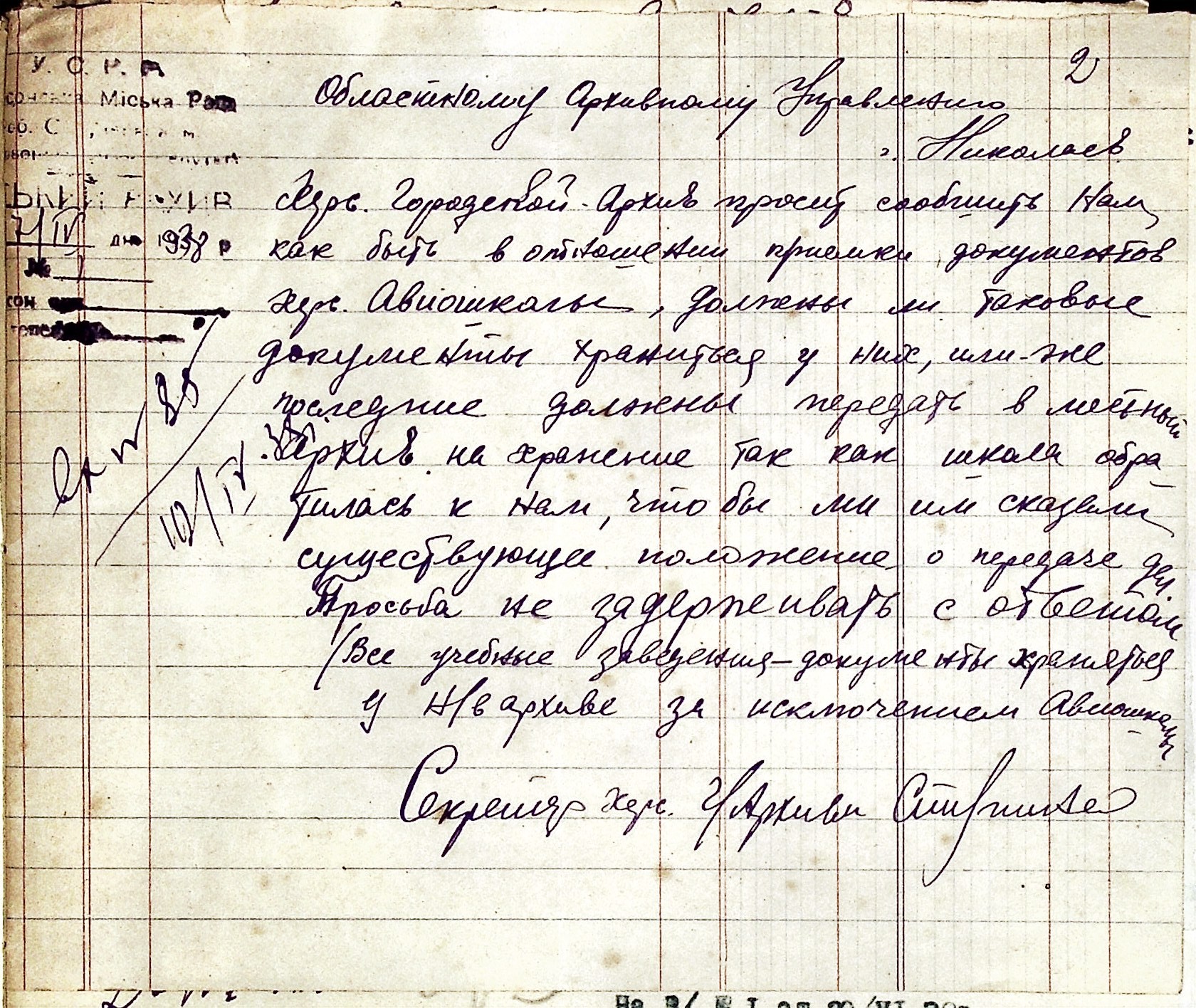 • • • • Справа № 53 “Листування з Херсонським міським архівом про передачу документів Херсонської авіаційної школи, здачу архівних матеріалів в утиль, обласну нараду керівних та наукових працівників; про неналежну підготовку документів для передачі в Херсонський державний історичний архів”