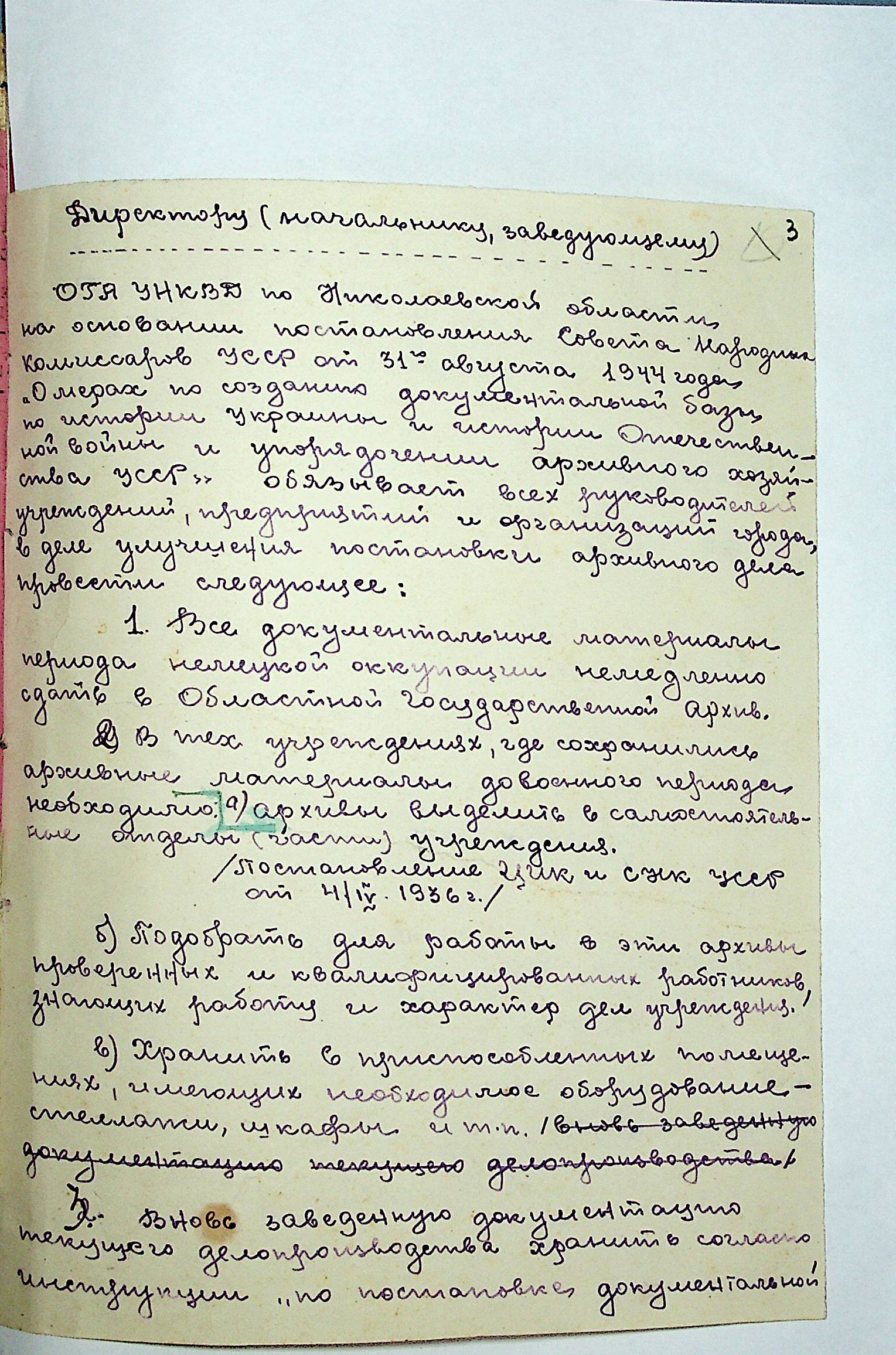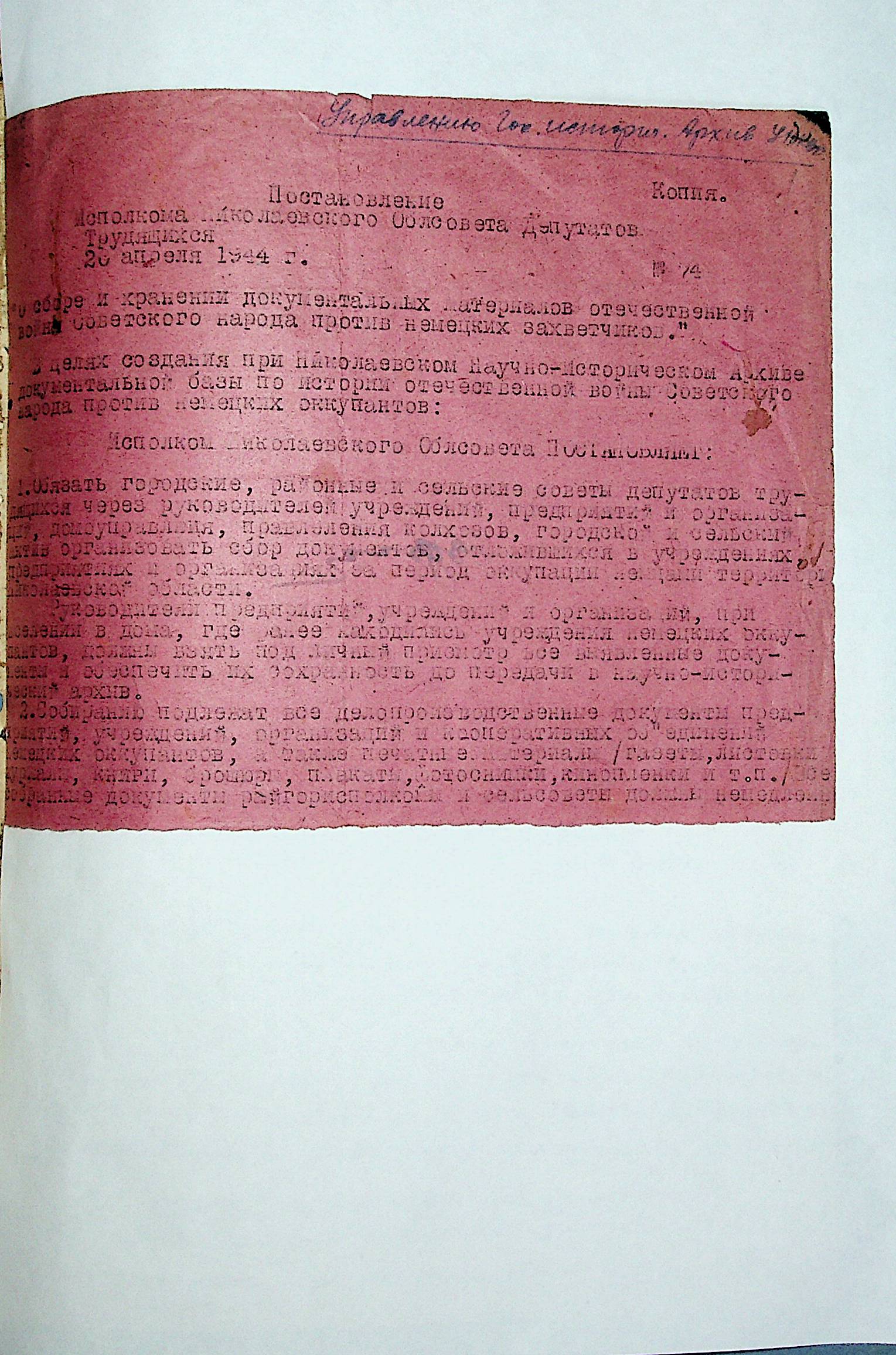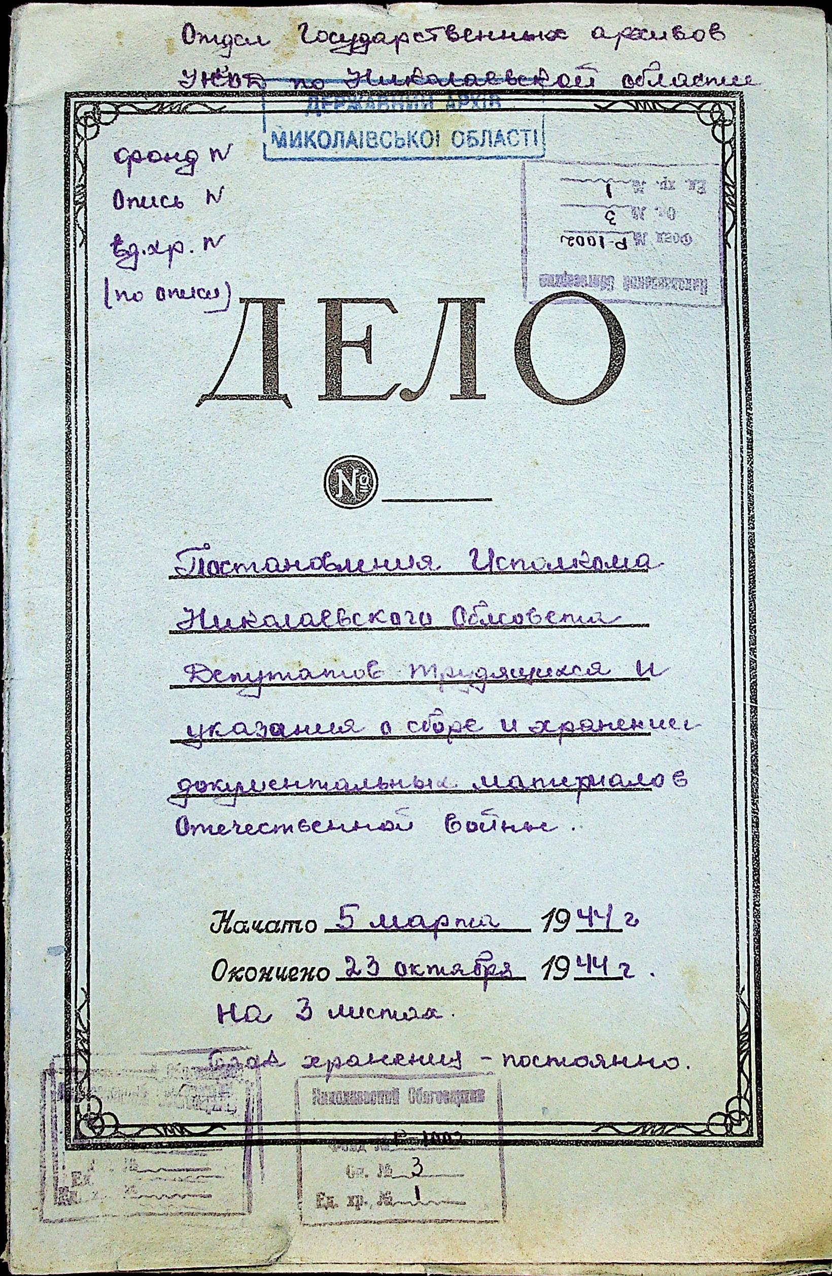 • • • • Справа № 1 “Постанови Виконкому Миколаївської Облради Депутатів Працівників та вказівки про збирання та зберігання документальних матеріалів Другої Світової війни”