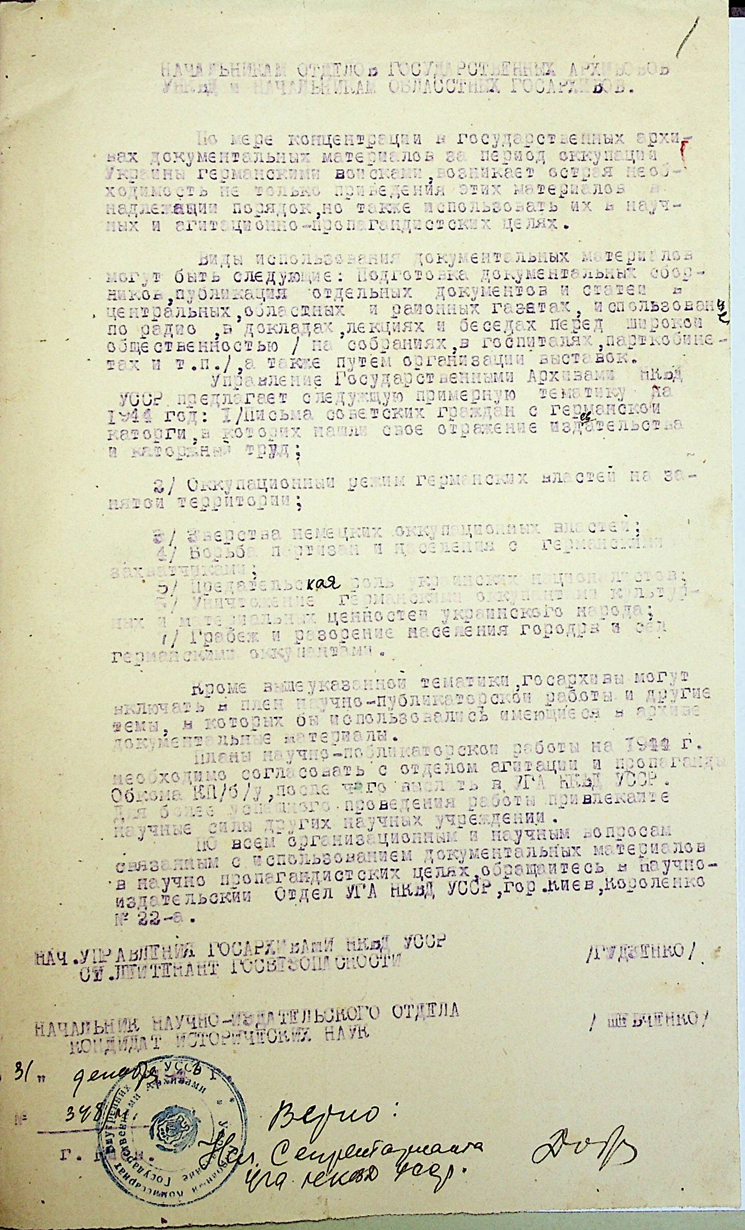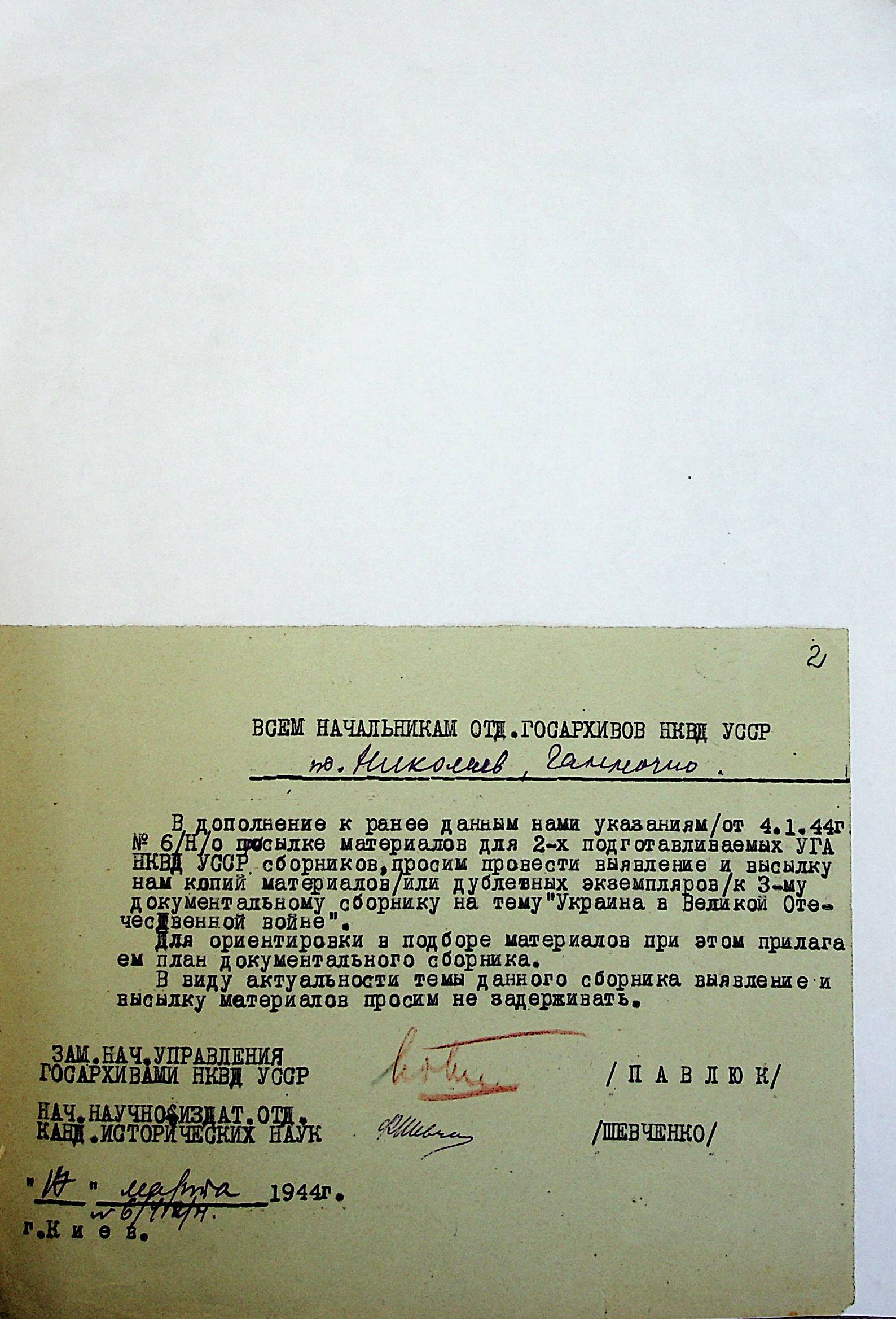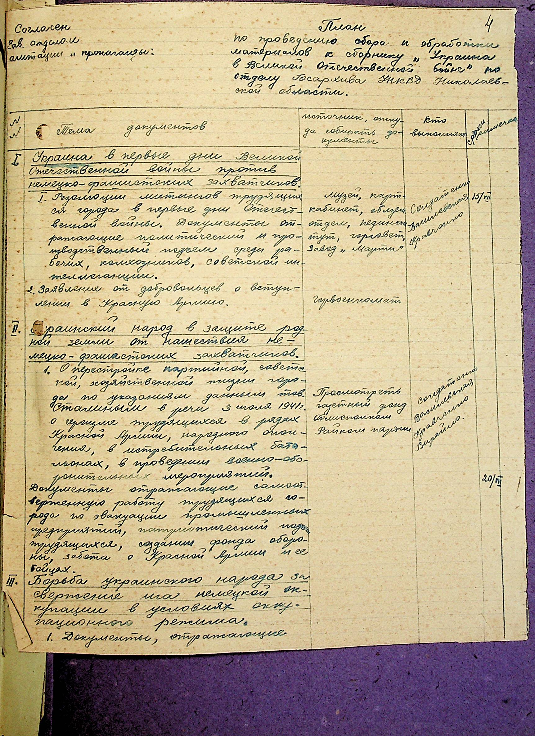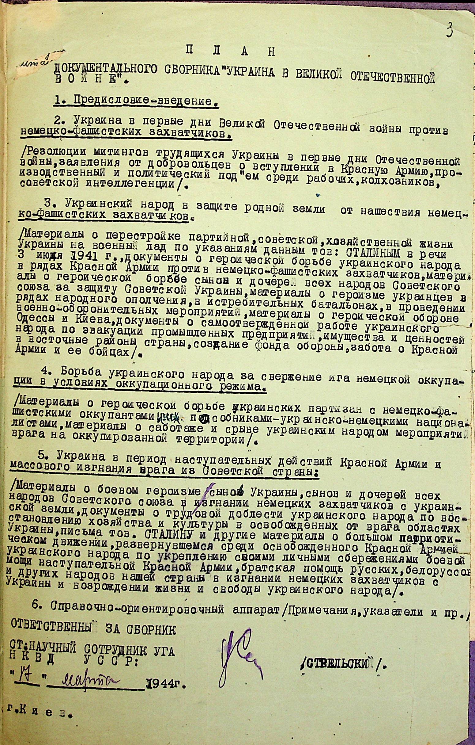 • • • • Справа № 7 “План щодо проведення збору та обробки документальних матеріалів до збірки “Україна у Другій Світовій війні” на 1944 р.”