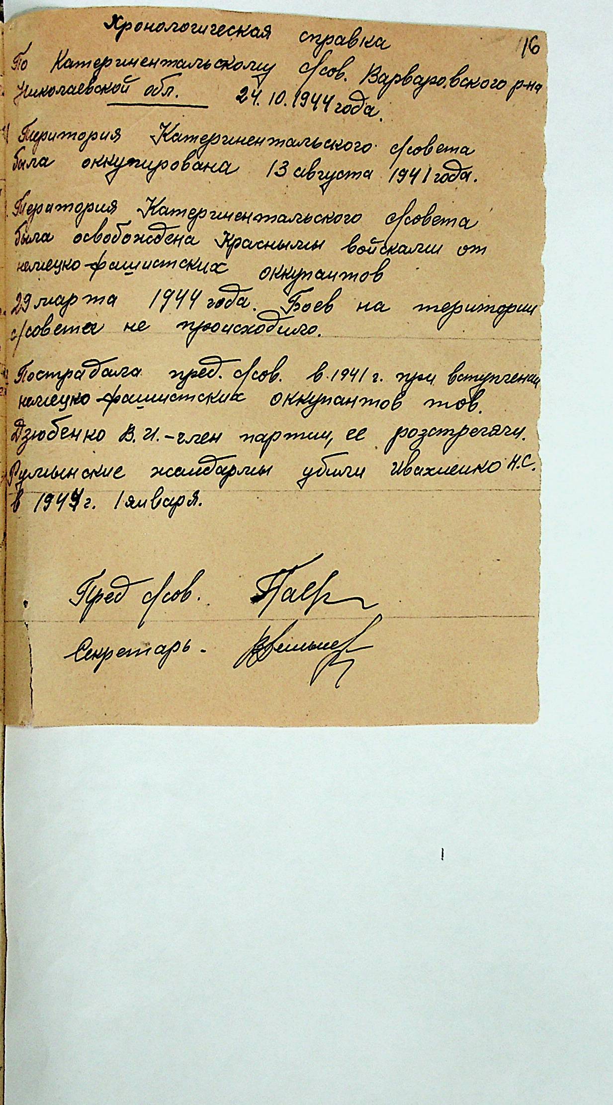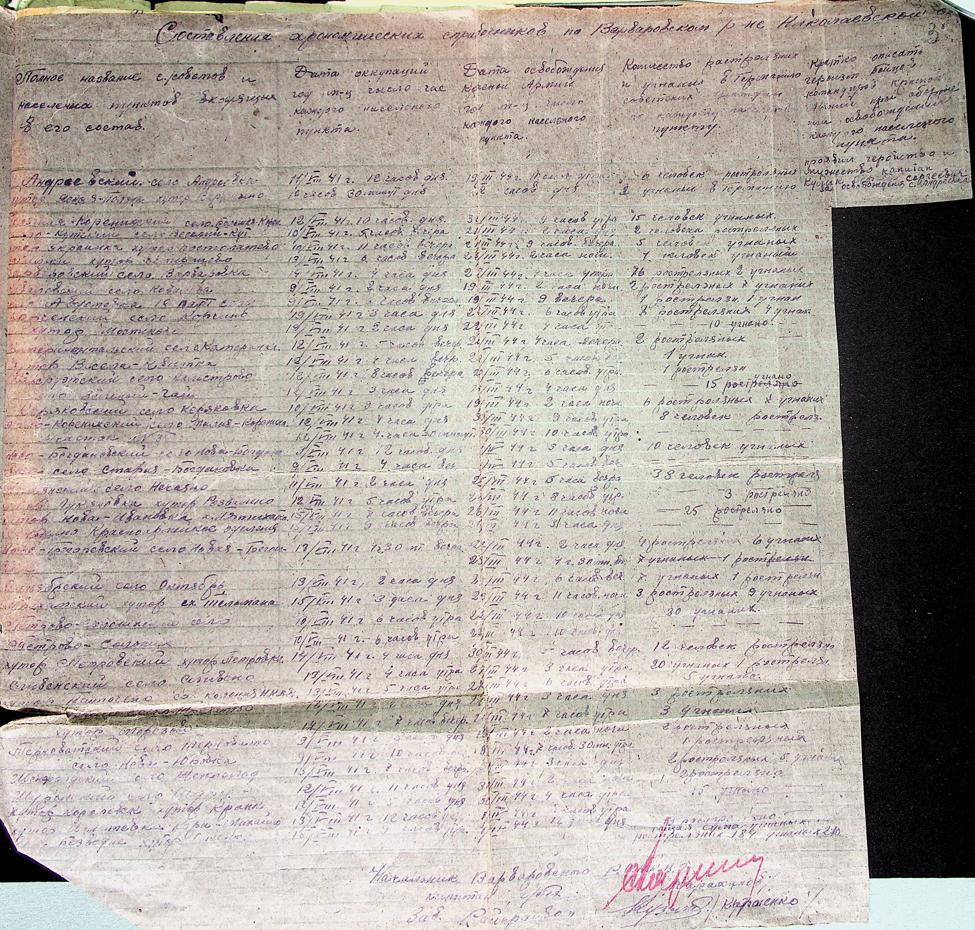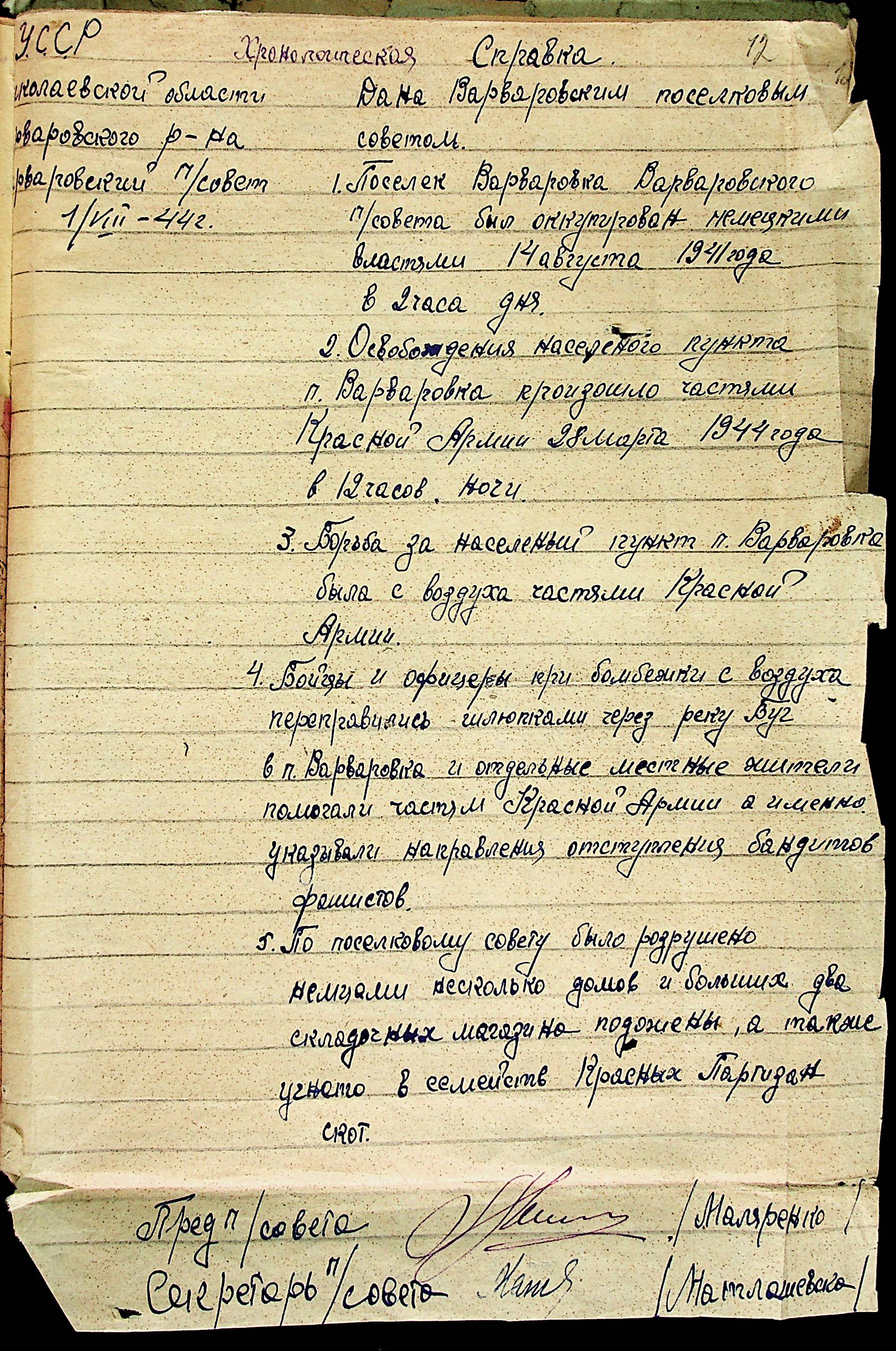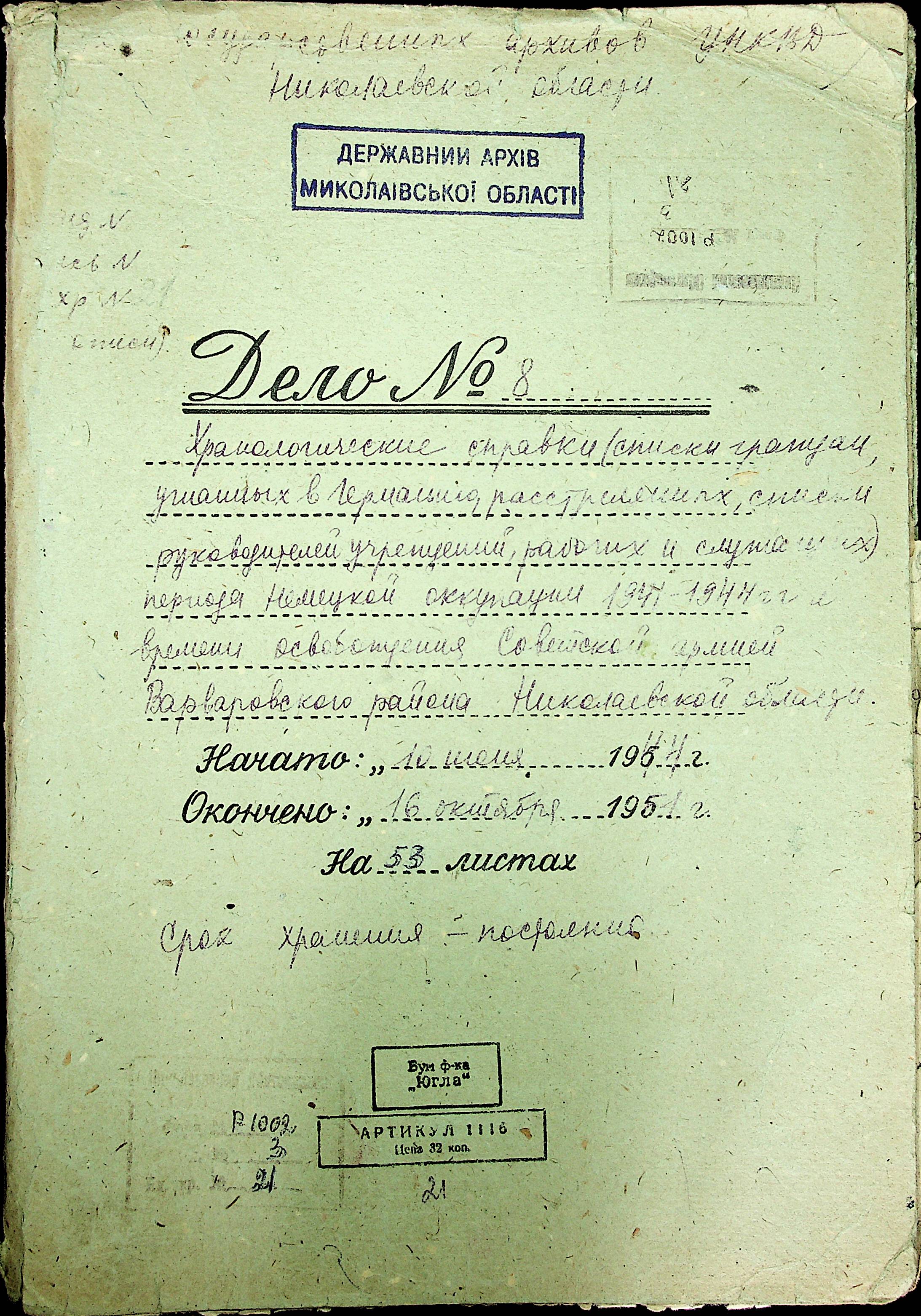 • • • • Справа № 21 “Хронологічні довідки (списки громадян викрадених до Німеччини, розстріляних, списки керівників установ, робітників та службовців) періоду німецької окупації 1941-1944 та часу визволення Радянською армією Варварівського району Миколаївської області”