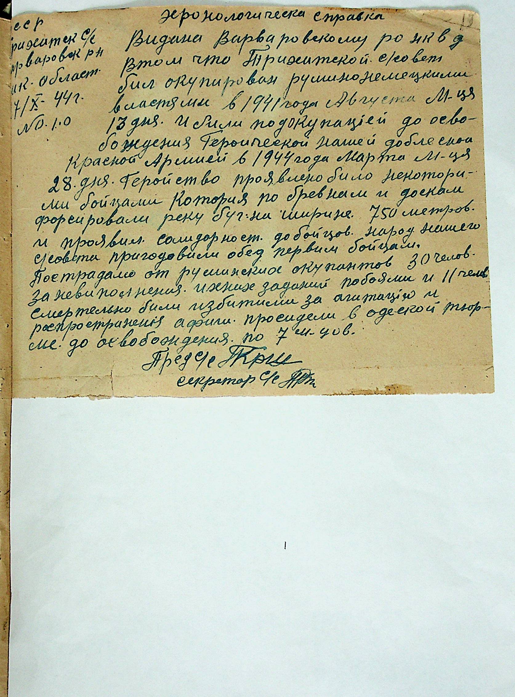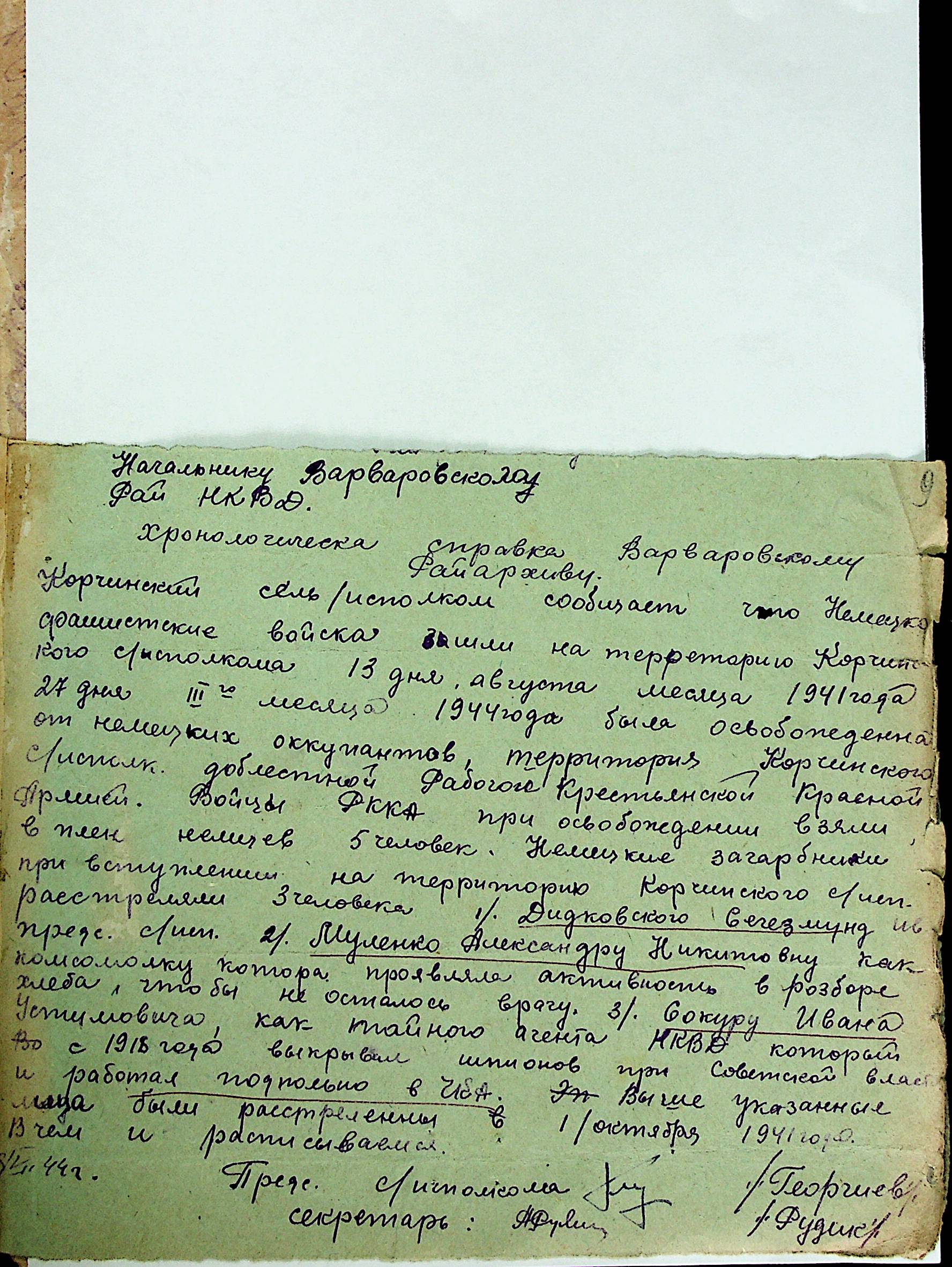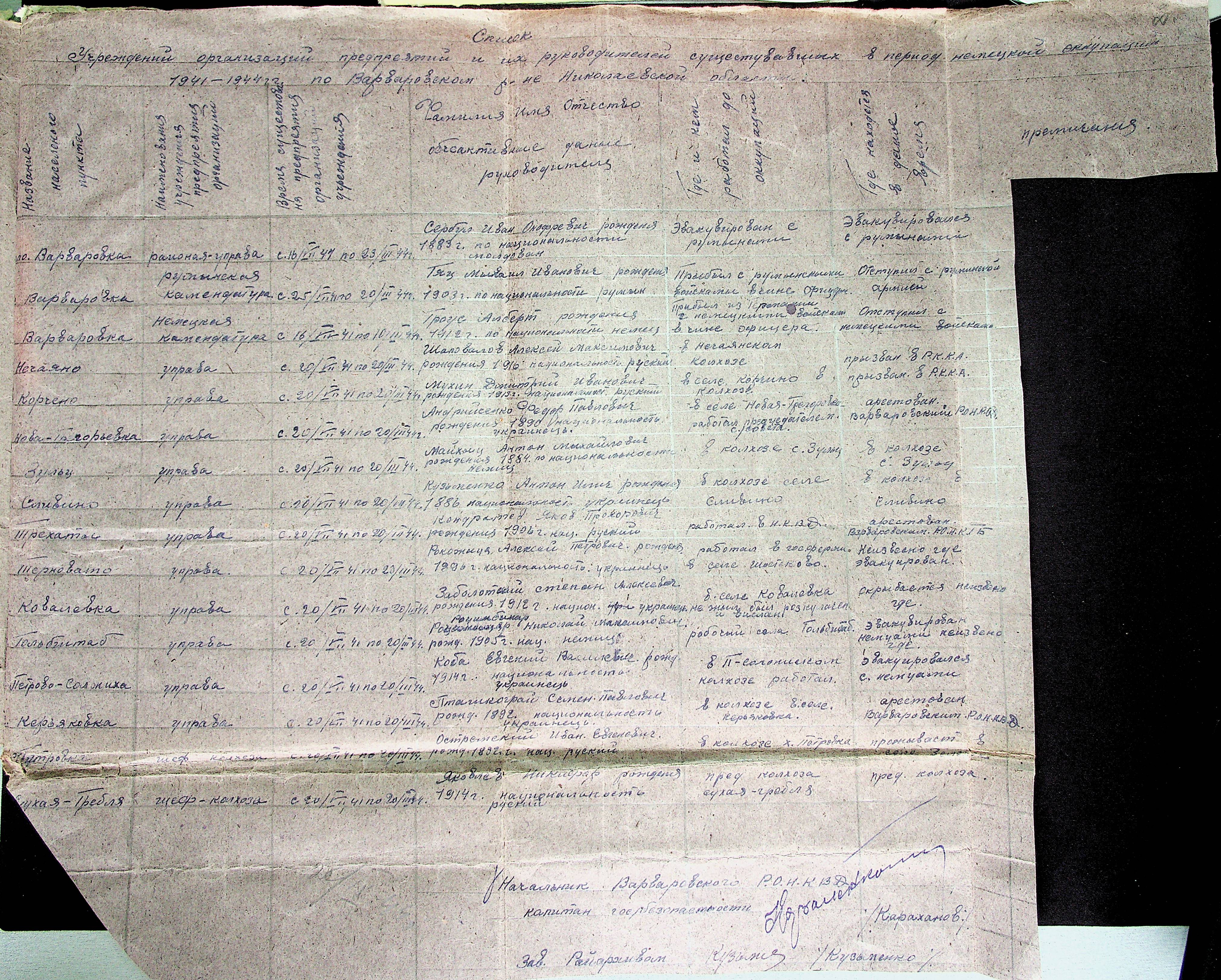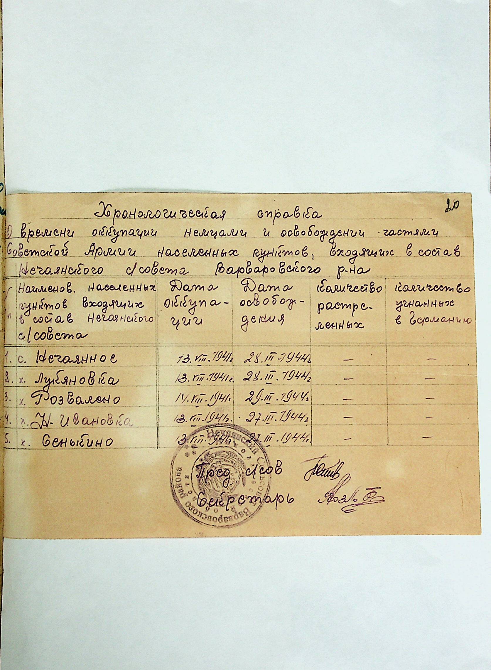 • • • • Справа № 21 “Хронологічні довідки (списки громадян викрадених до Німеччини, розстріляних, списки керівників установ, робітників та службовців) періоду німецької окупації 1941-1944 та часу визволення Радянською армією Варварівського району Миколаївської області”