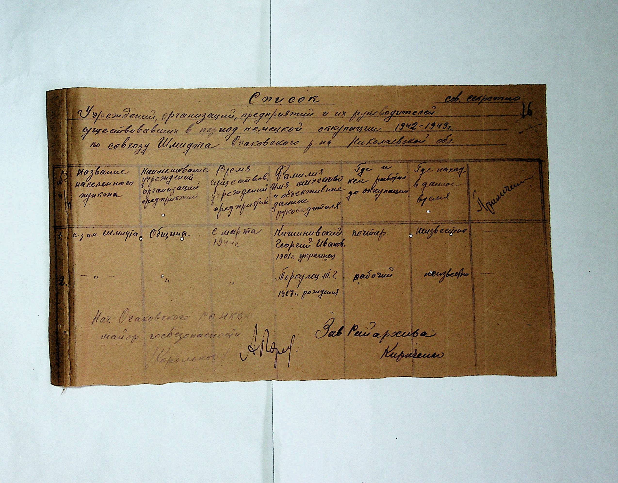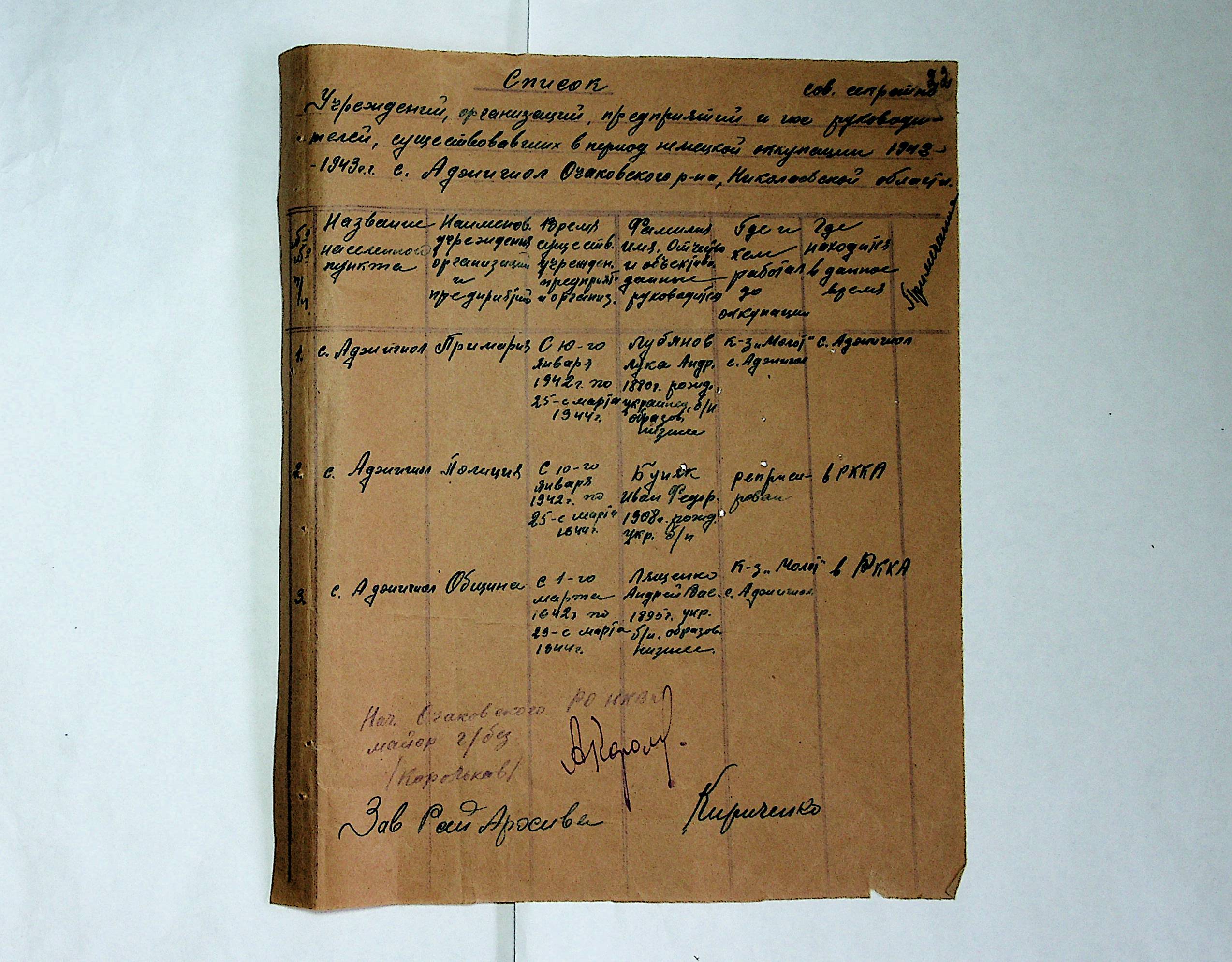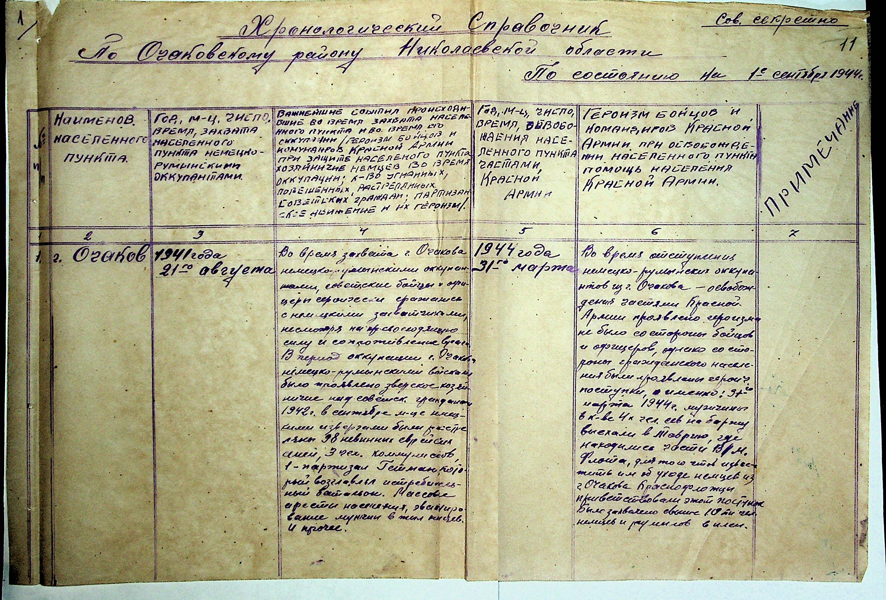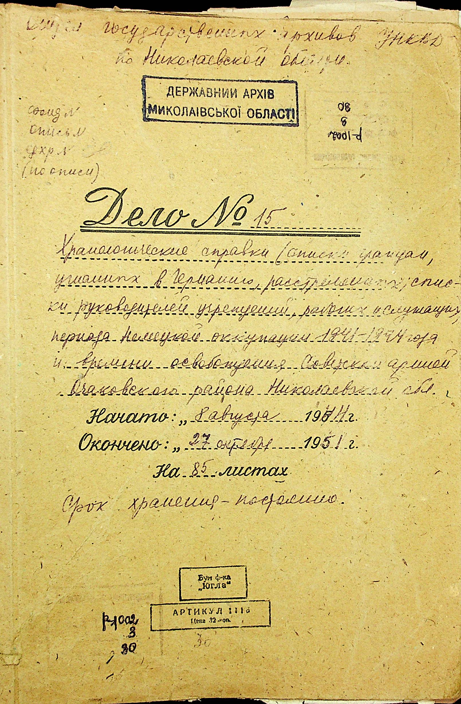 • • • • Справа № 30 “Хронологічні довідки (списки громадян викрадених до Німеччини, розстріляних, списки керівників установ, робітників та службовців) періоду німецької окупації 1941-1944 та часу визволення Радянською армією Очаківського району Миколаївської області”