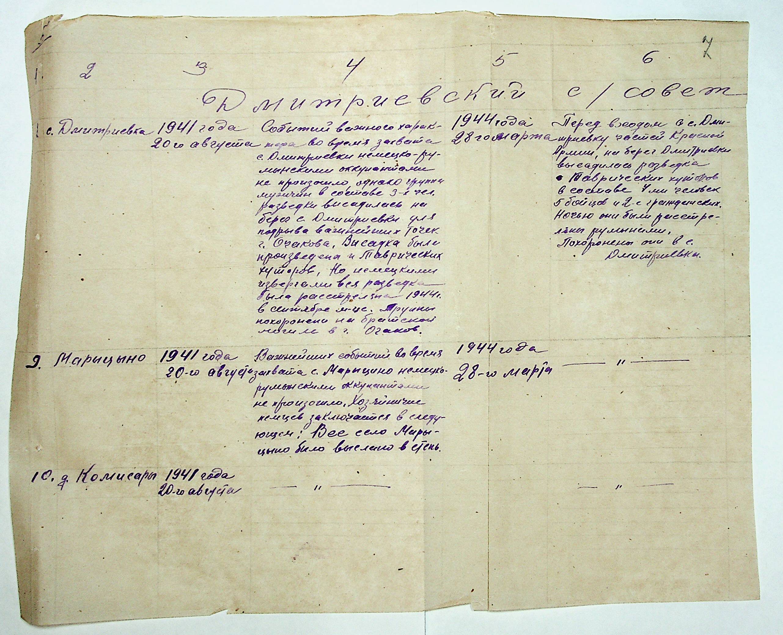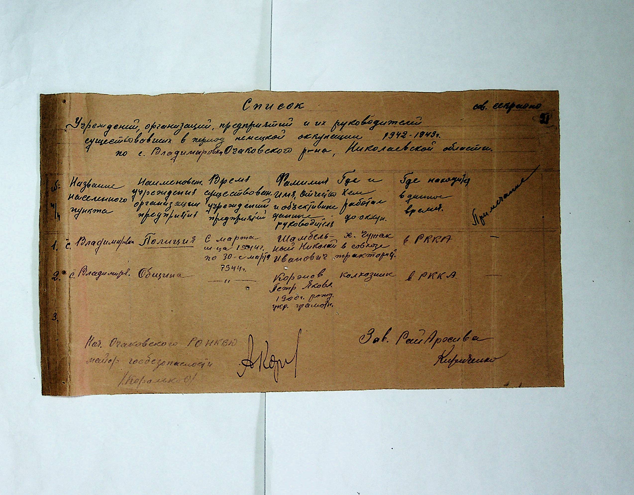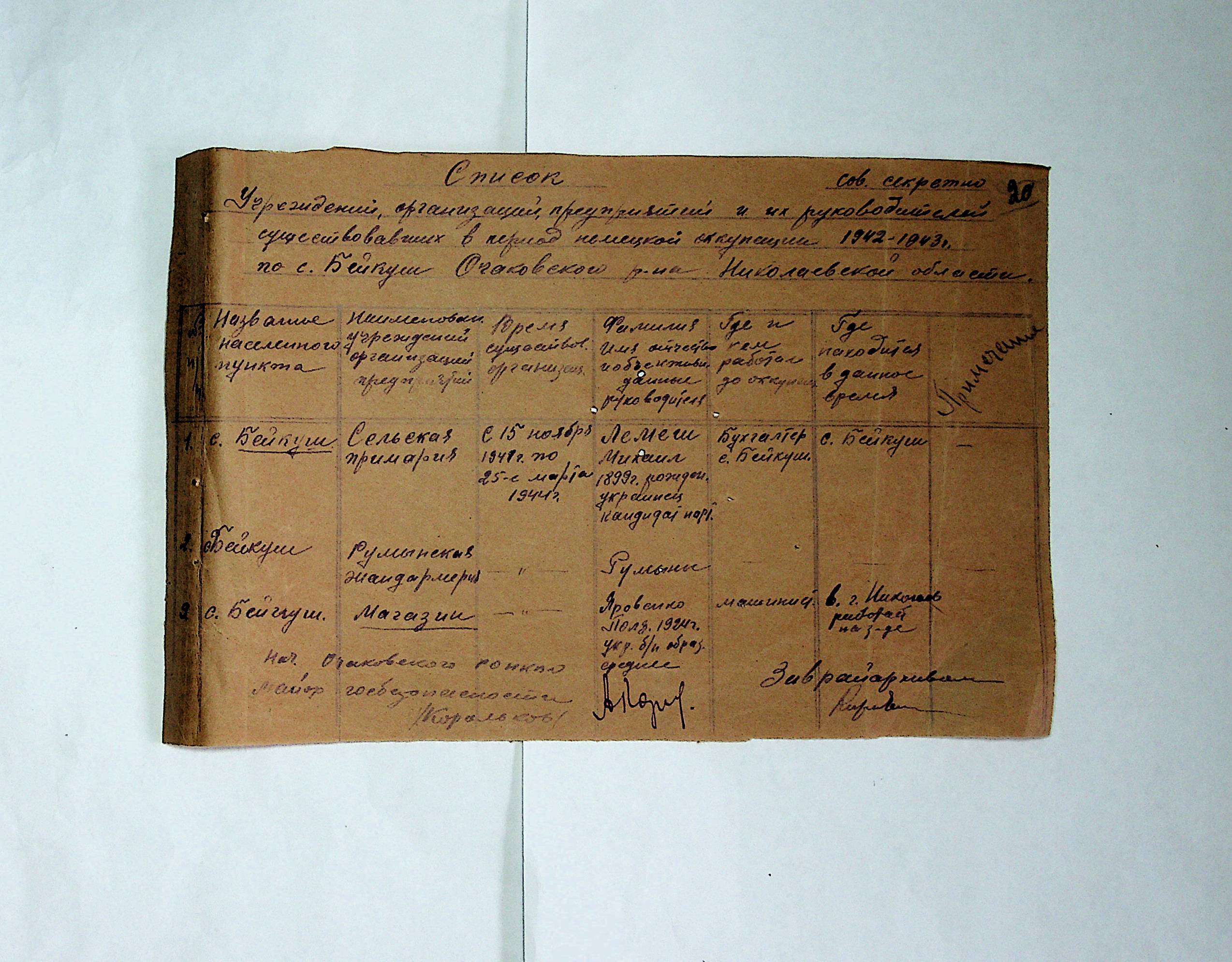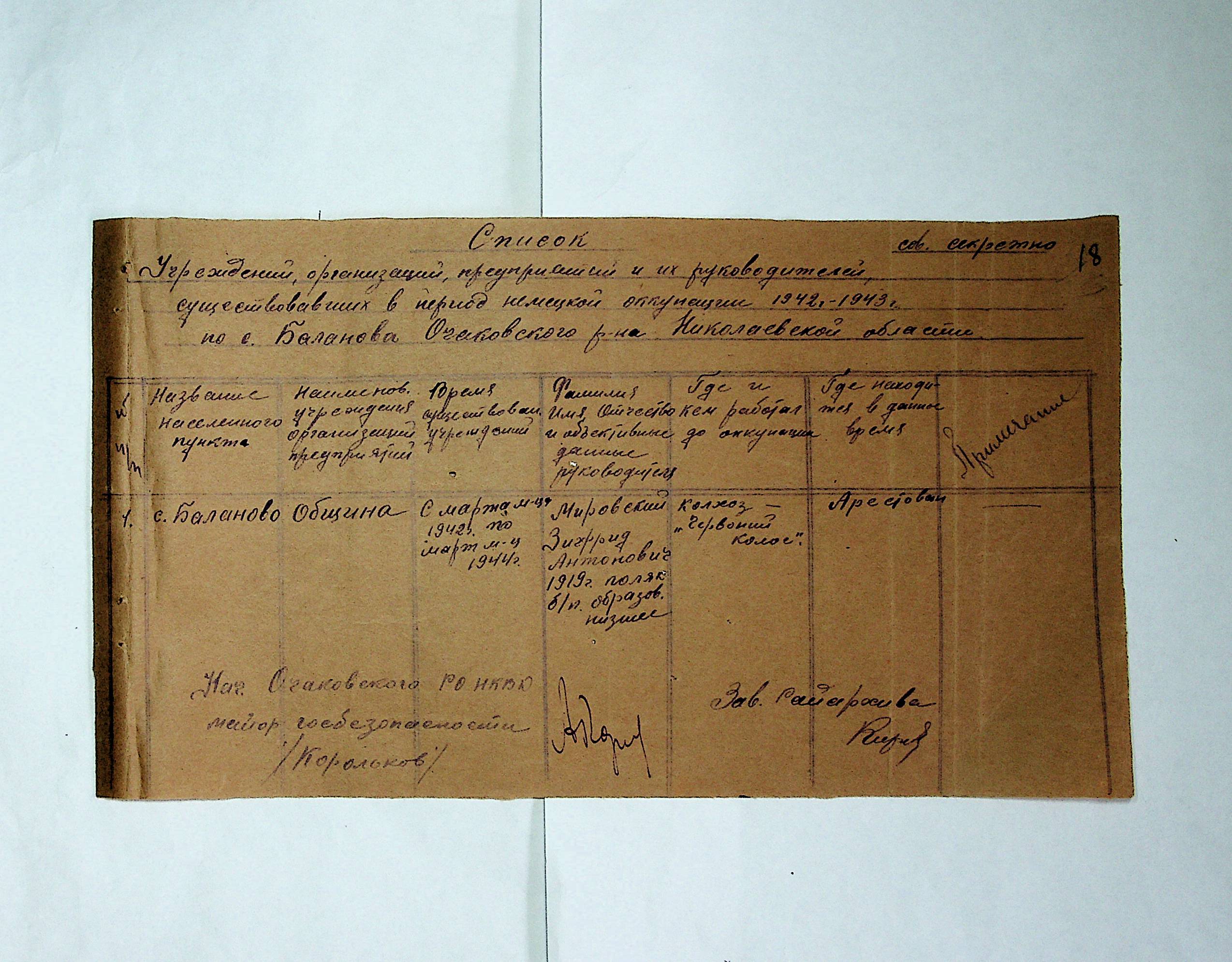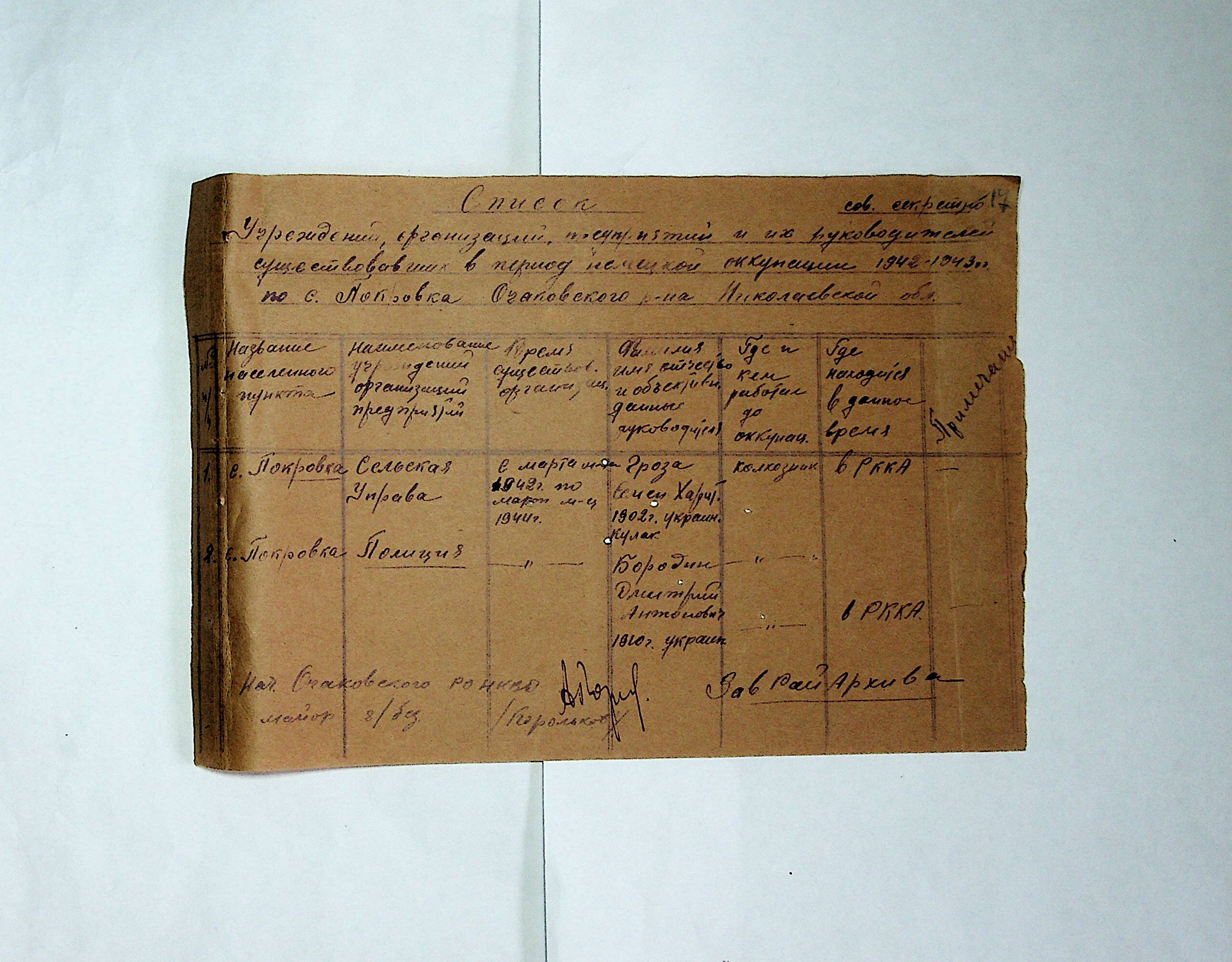 • • • • Справа № 30 “Хронологічні довідки (списки громадян викрадених до Німеччини, розстріляних, списки керівників установ, робітників та службовців) періоду німецької окупації 1941-1944 та часу визволення Радянською армією Очаківського району Миколаївської області”