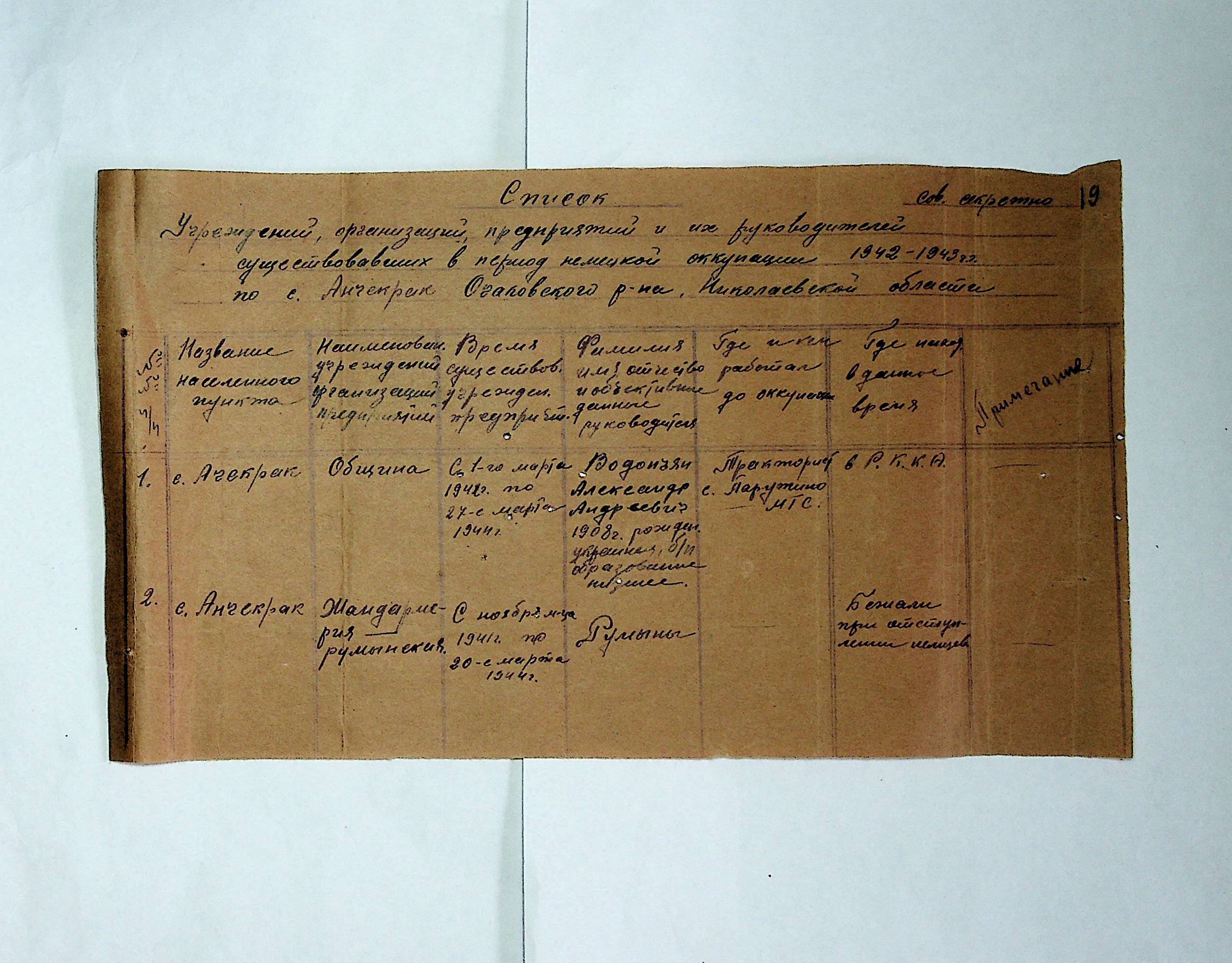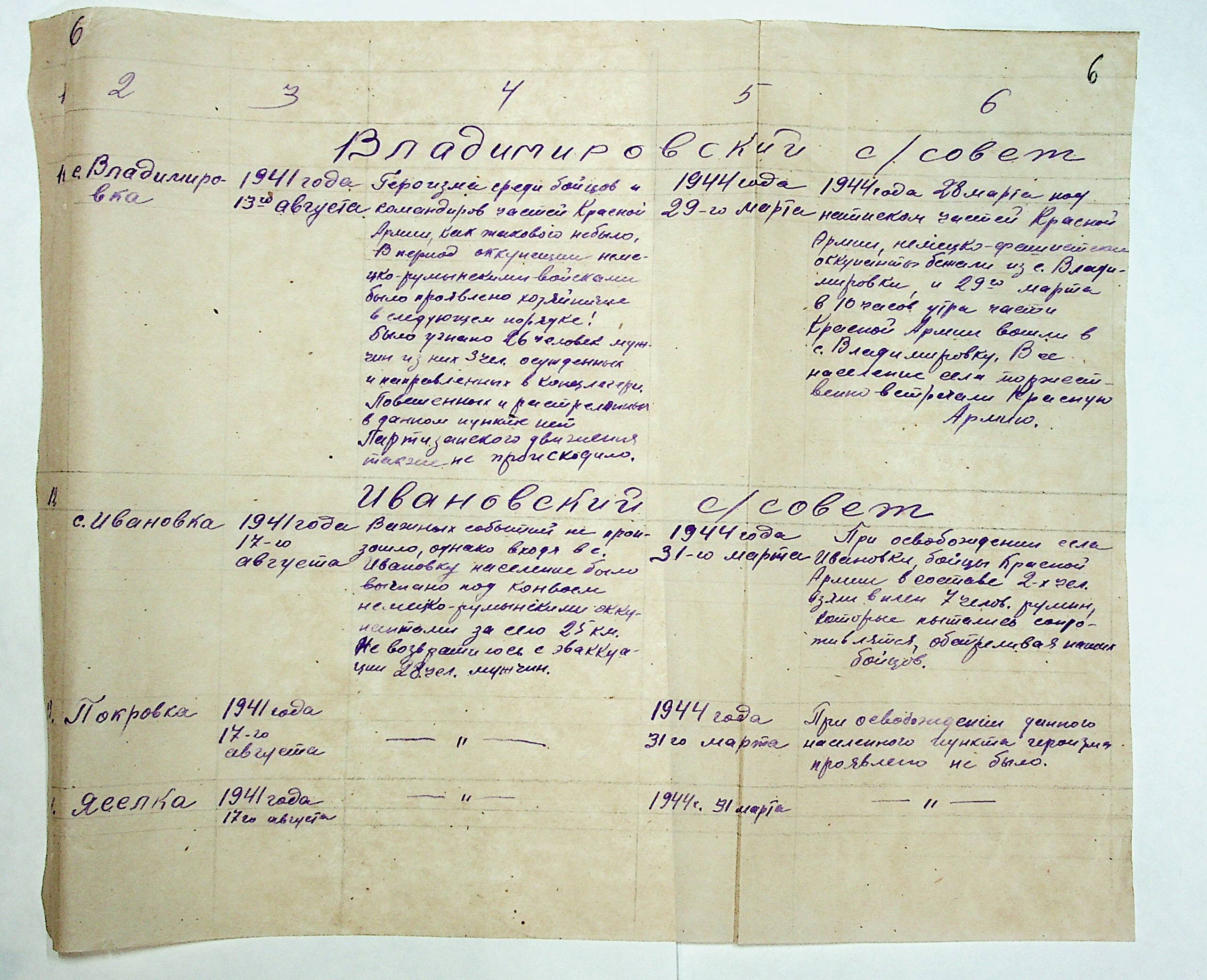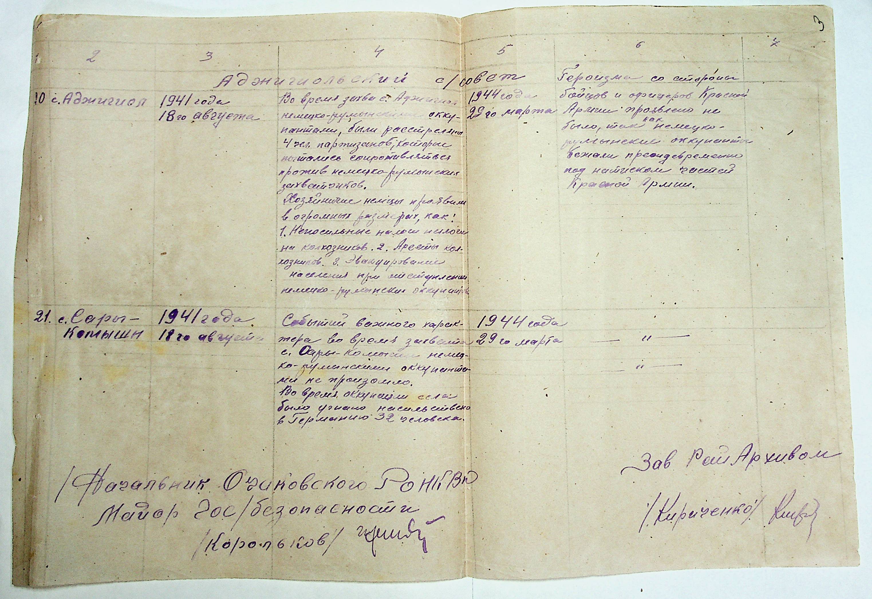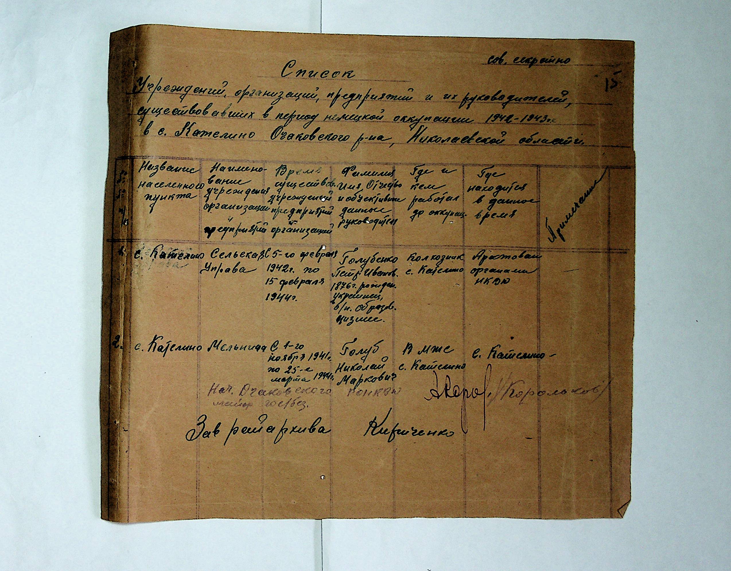 • • • • Справа № 30 “Хронологічні довідки (списки громадян викрадених до Німеччини, розстріляних, списки керівників установ, робітників та службовців) періоду німецької окупації 1941-1944 та часу визволення Радянською армією Очаківського району Миколаївської області”