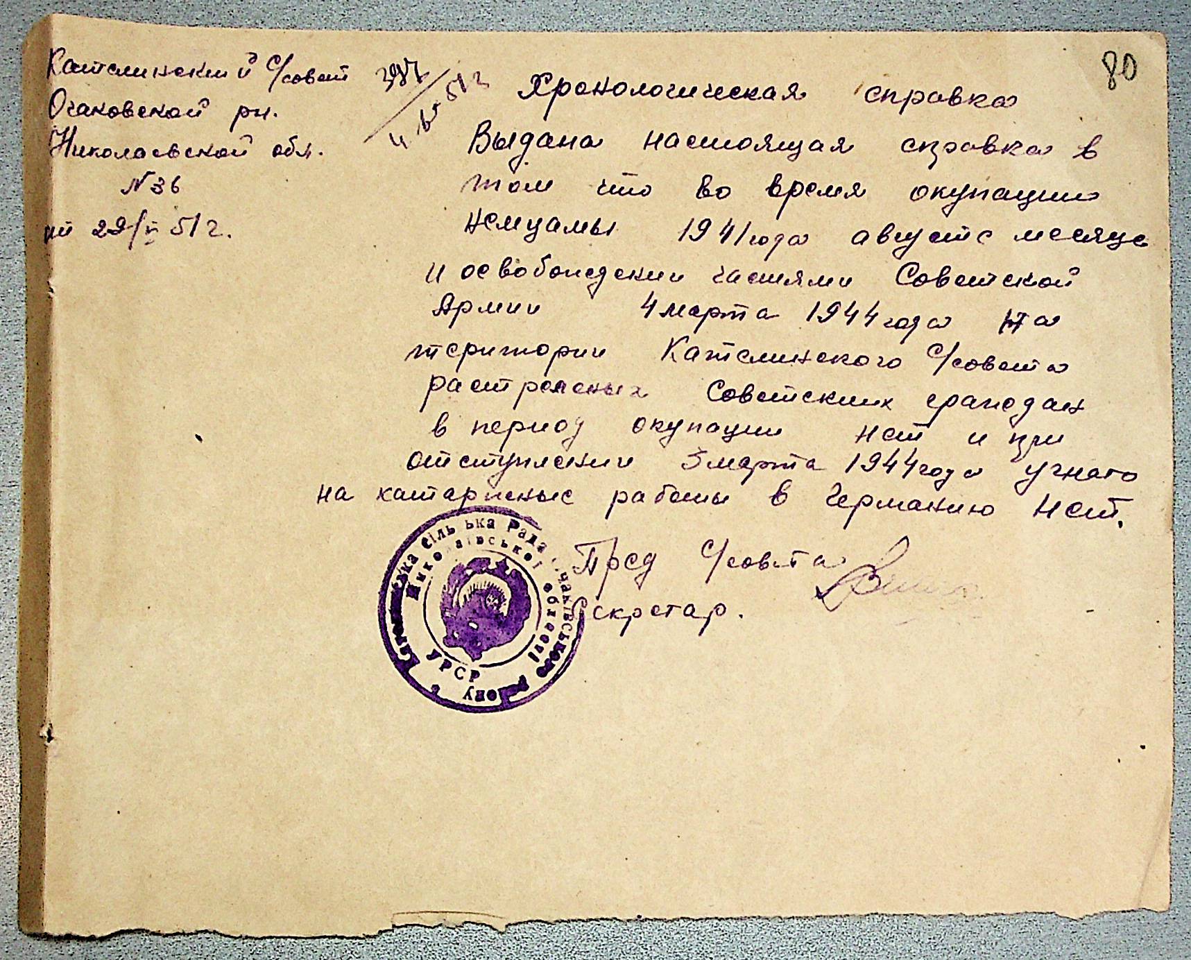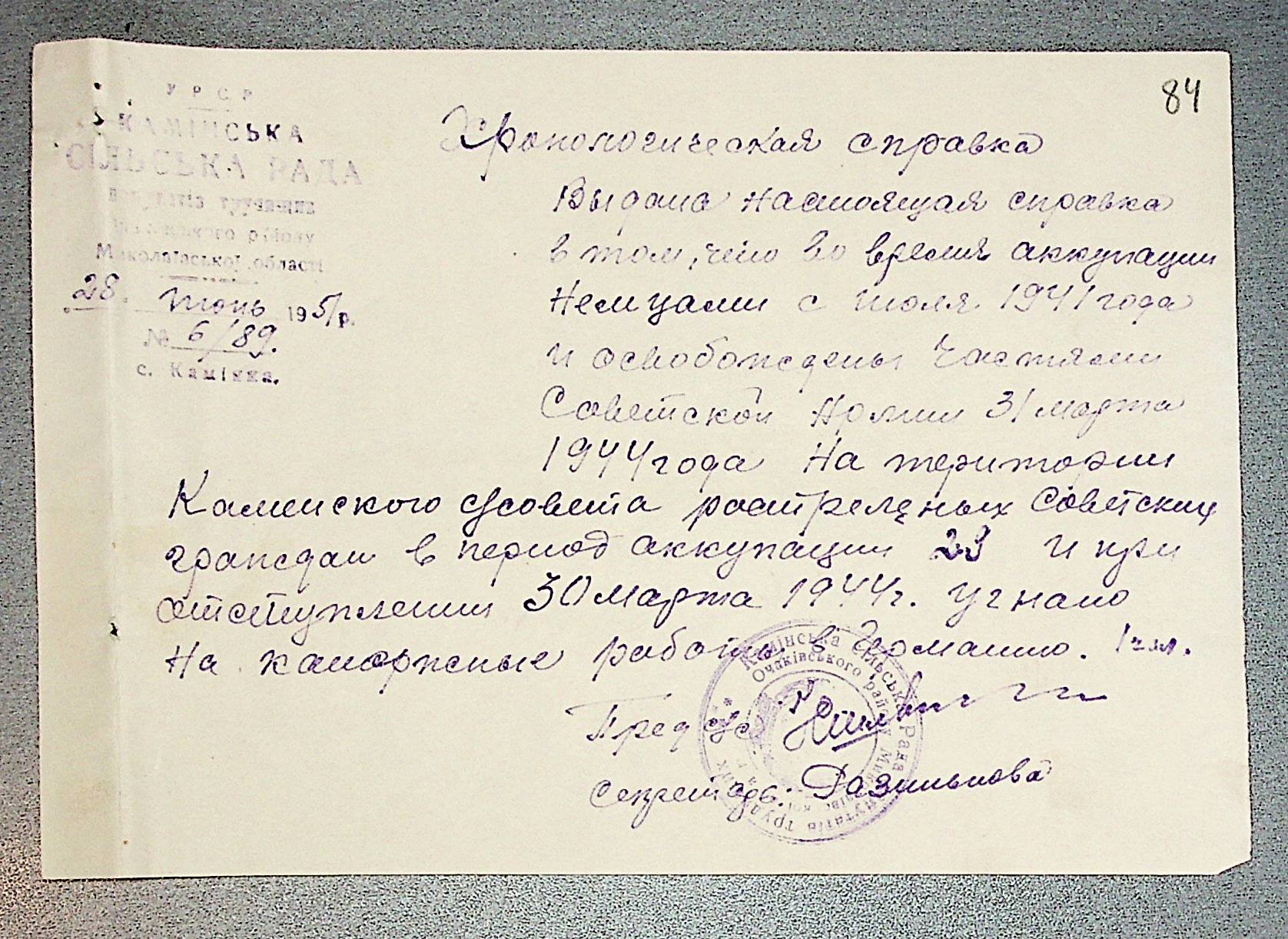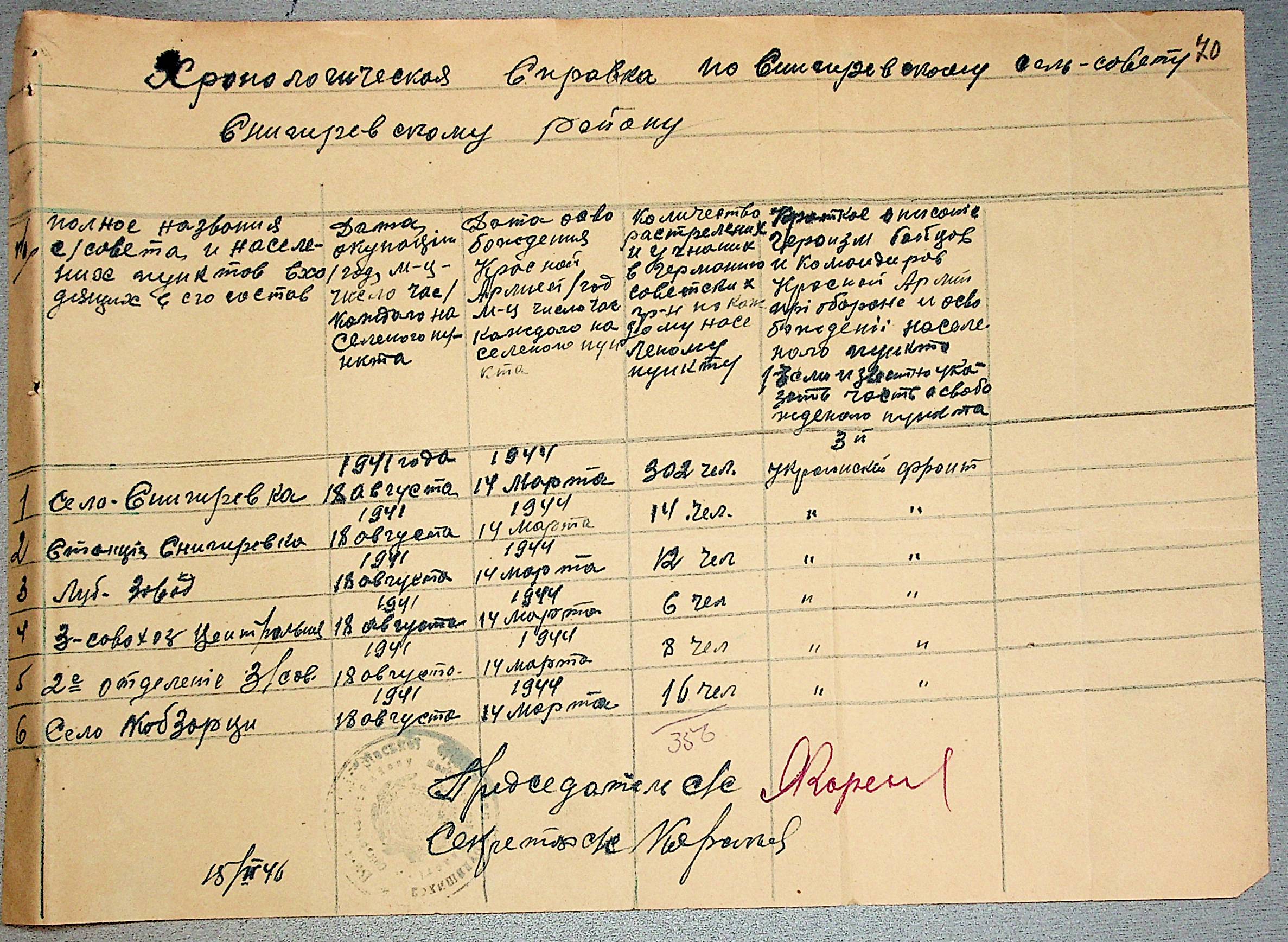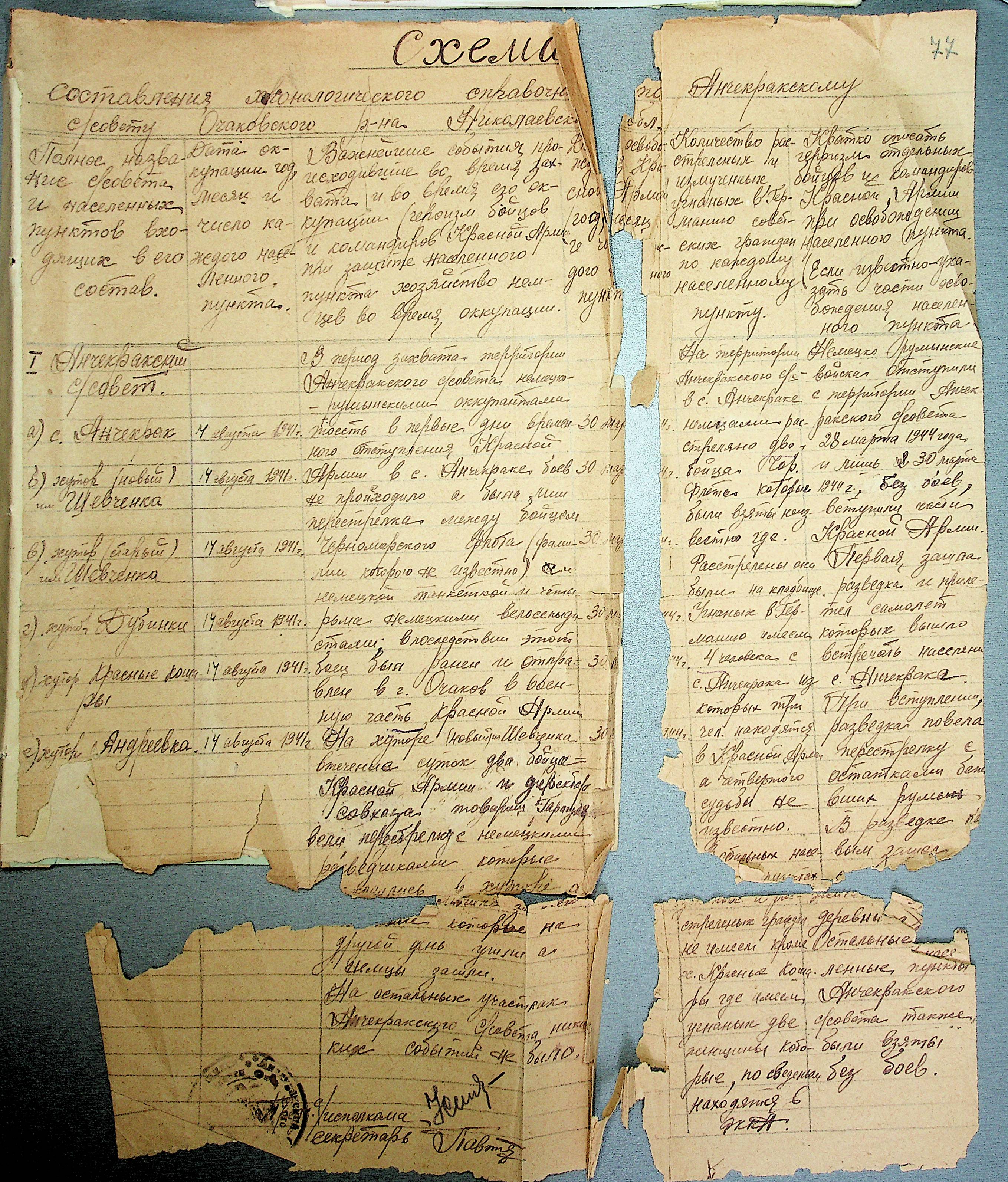 • • • • Справа № 30 “Хронологічні довідки (списки громадян викрадених до Німеччини, розстріляних, списки керівників установ, робітників та службовців) періоду німецької окупації 1941-1944 та часу визволення Радянською армією Очаківського району Миколаївської області”
