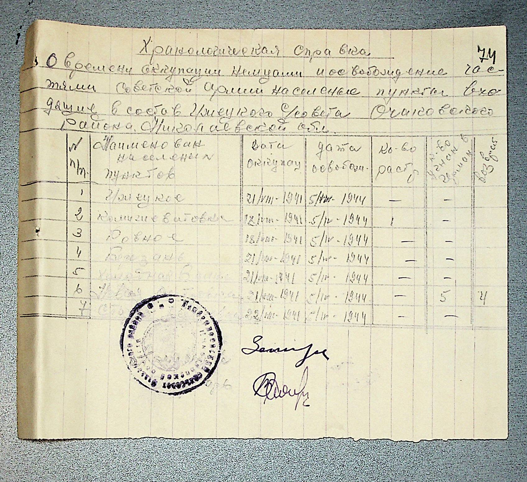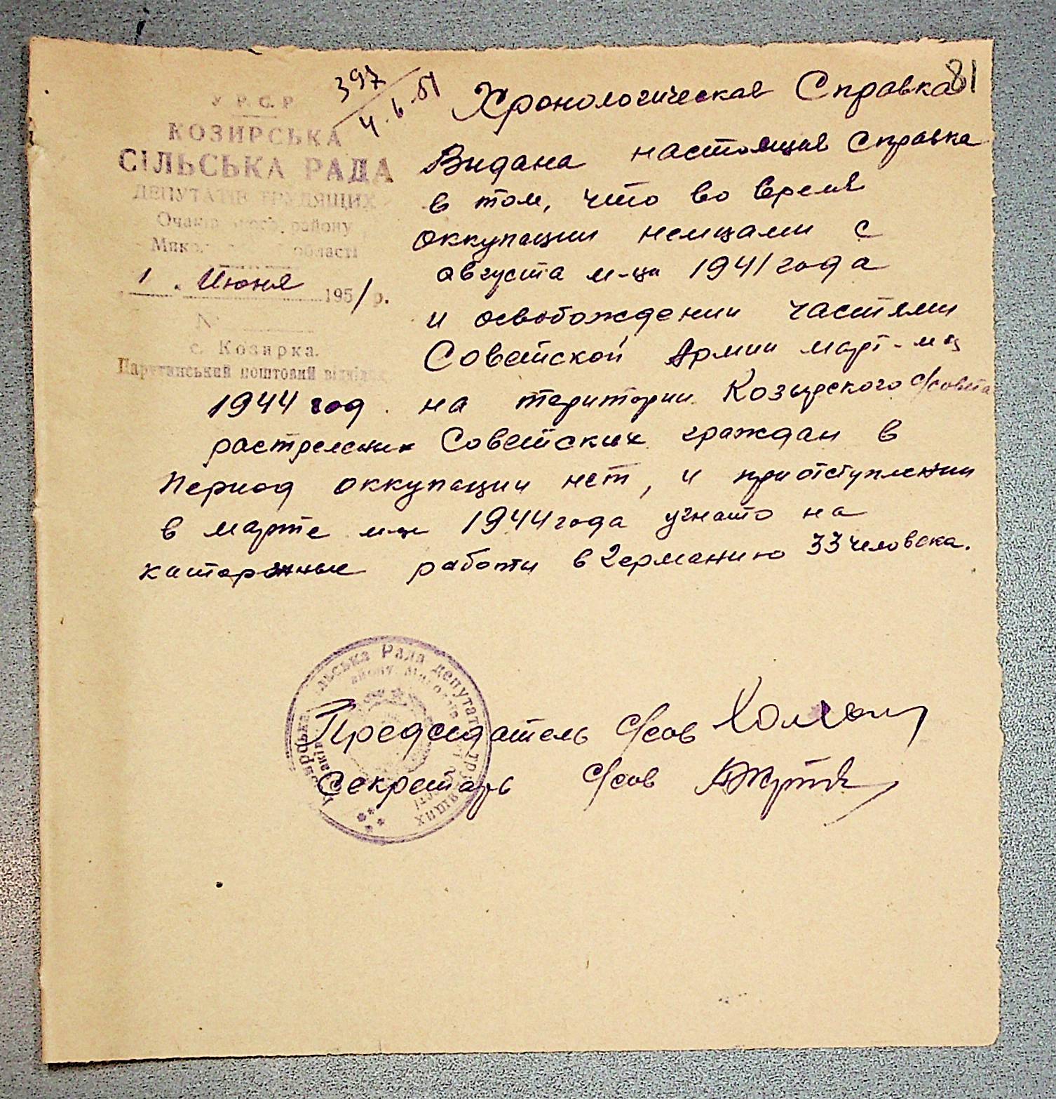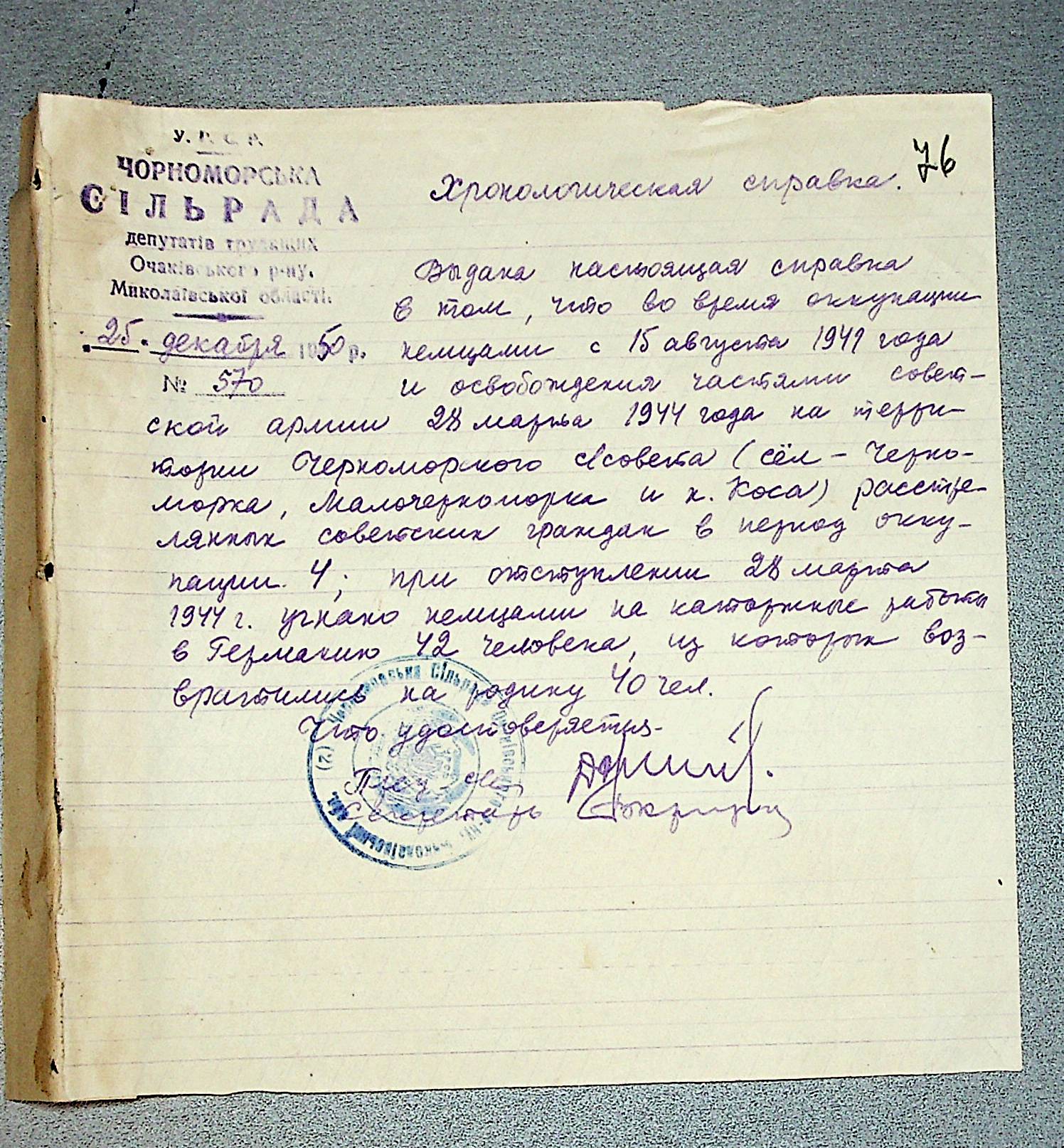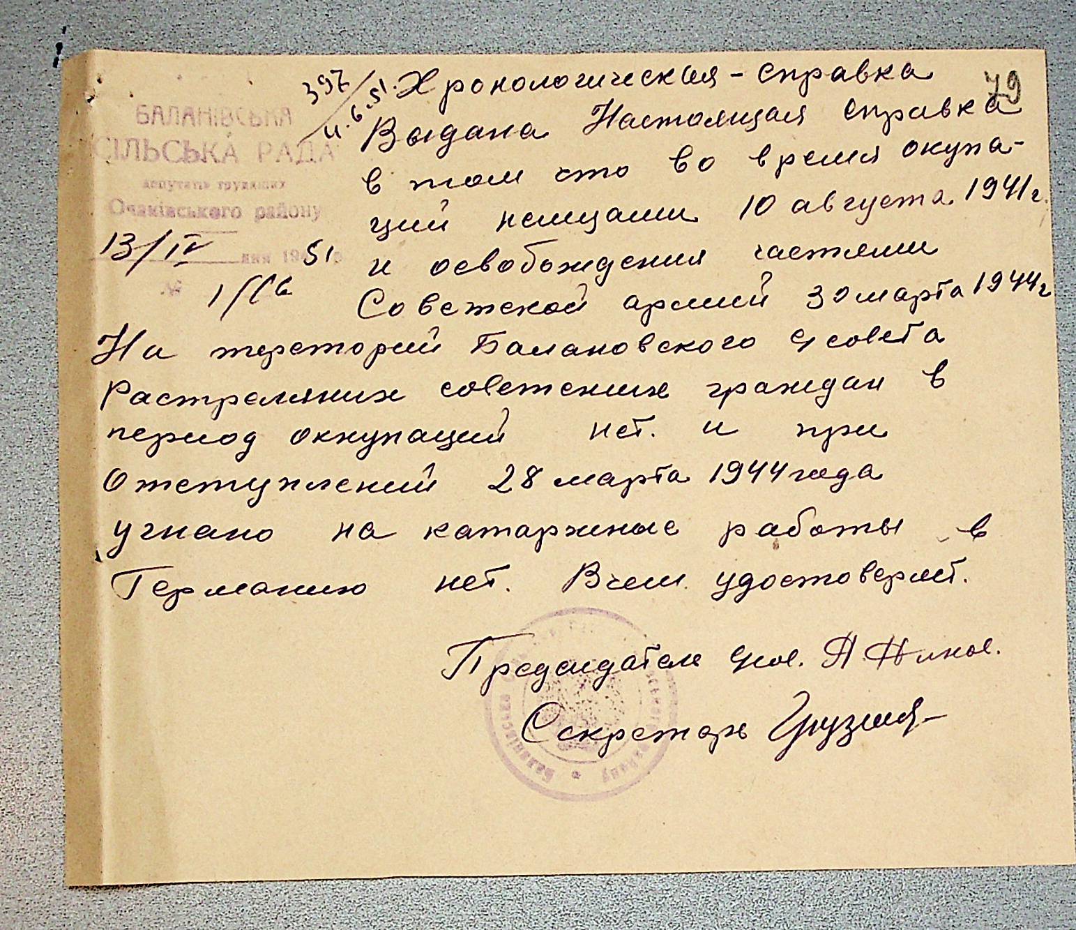 • • • • Справа № 30 “Хронологічні довідки (списки громадян викрадених до Німеччини, розстріляних, списки керівників установ, робітників та службовців) періоду німецької окупації 1941-1944 та часу визволення Радянською армією Очаківського району Миколаївської області”