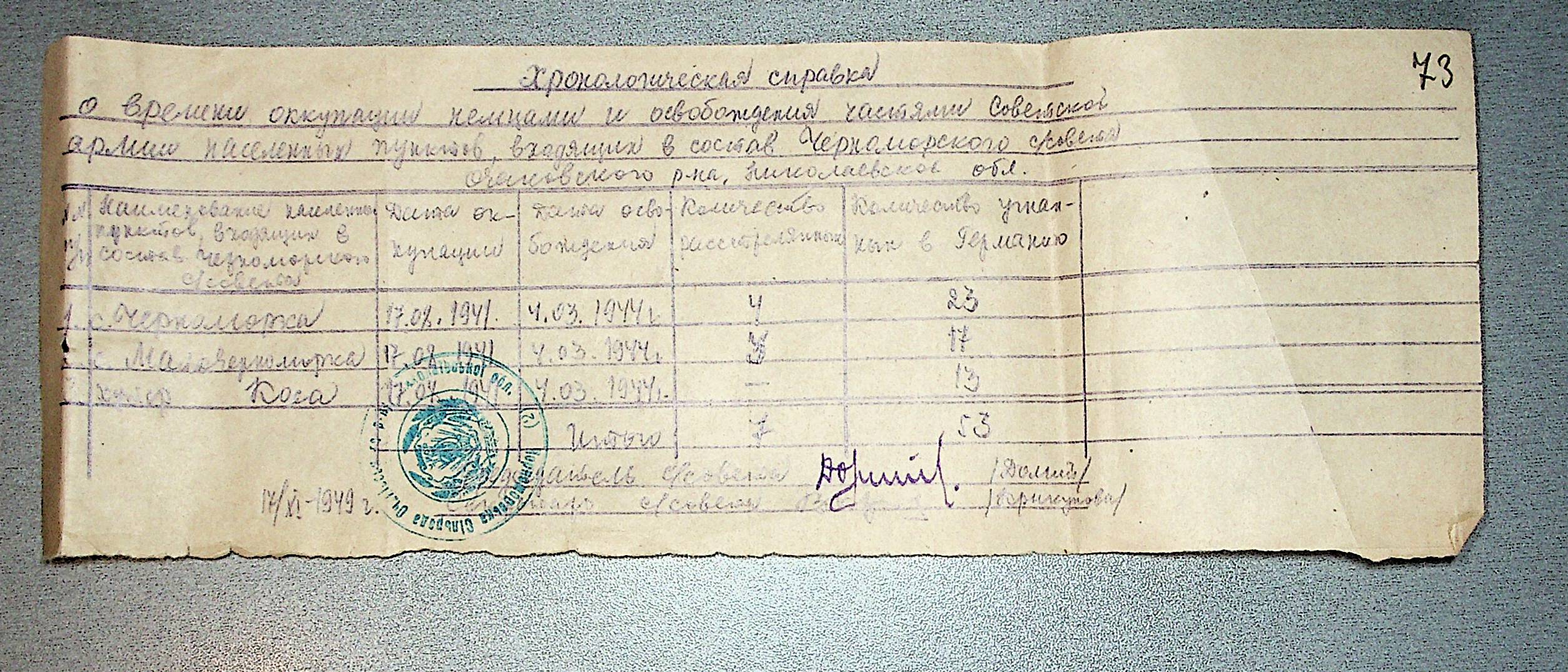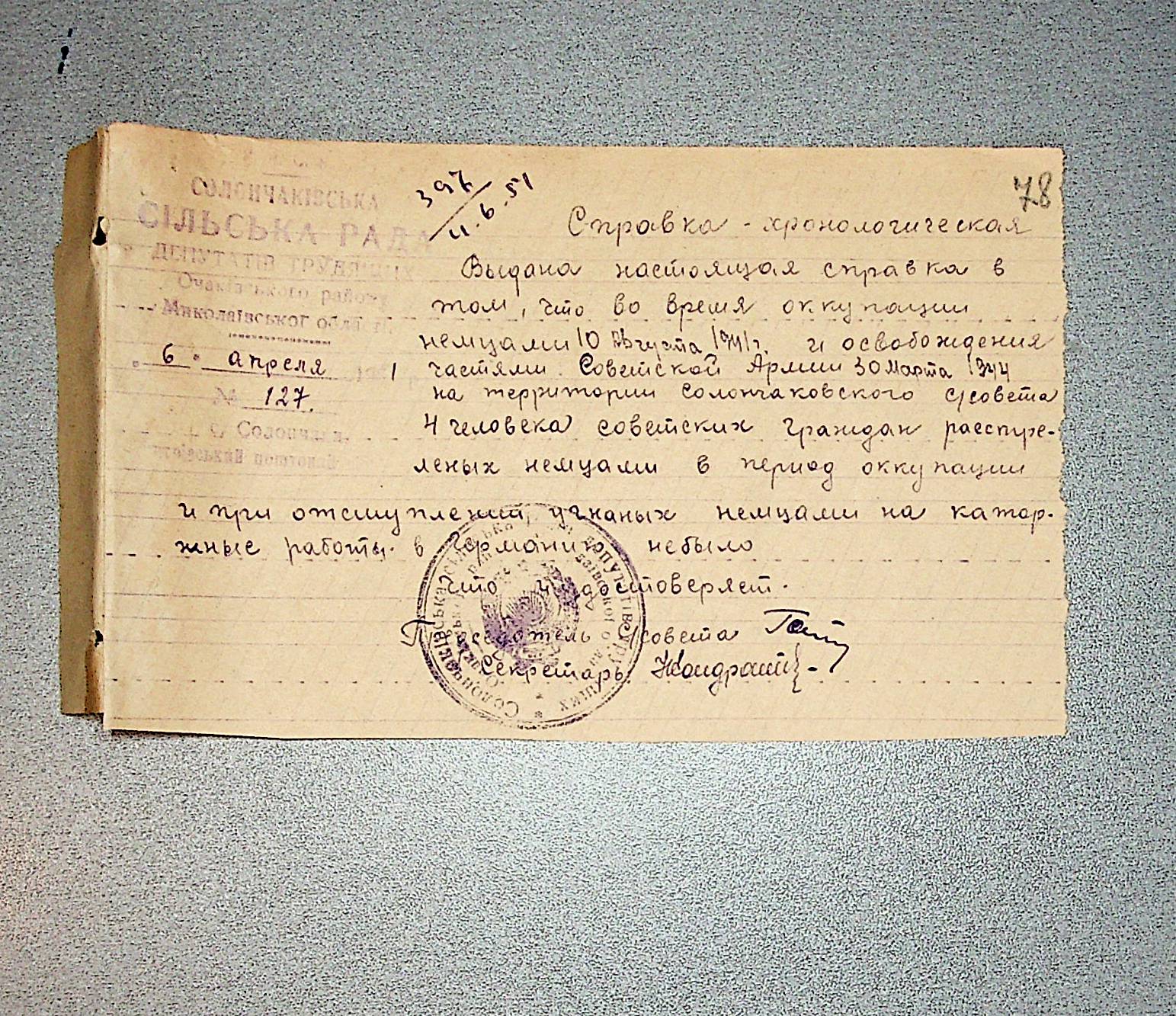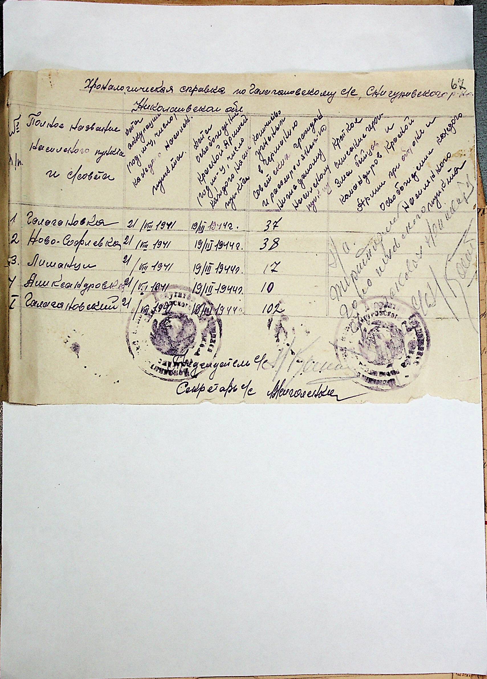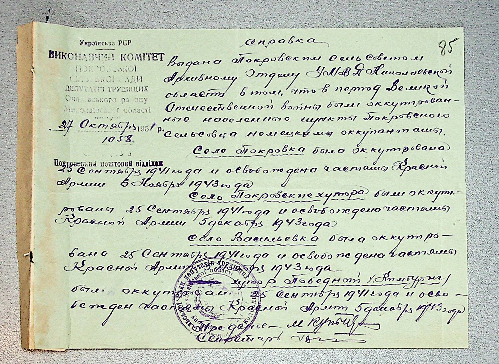 • • • • Справа № 30 “Хронологічні довідки (списки громадян викрадених до Німеччини, розстріляних, списки керівників установ, робітників та службовців) періоду німецької окупації 1941-1944 та часу визволення Радянською армією Очаківського району Миколаївської області”