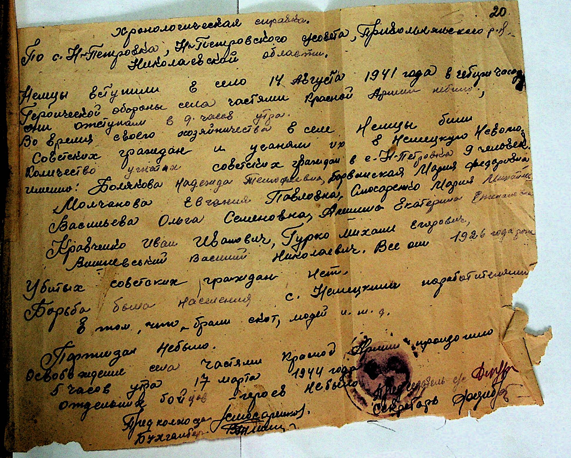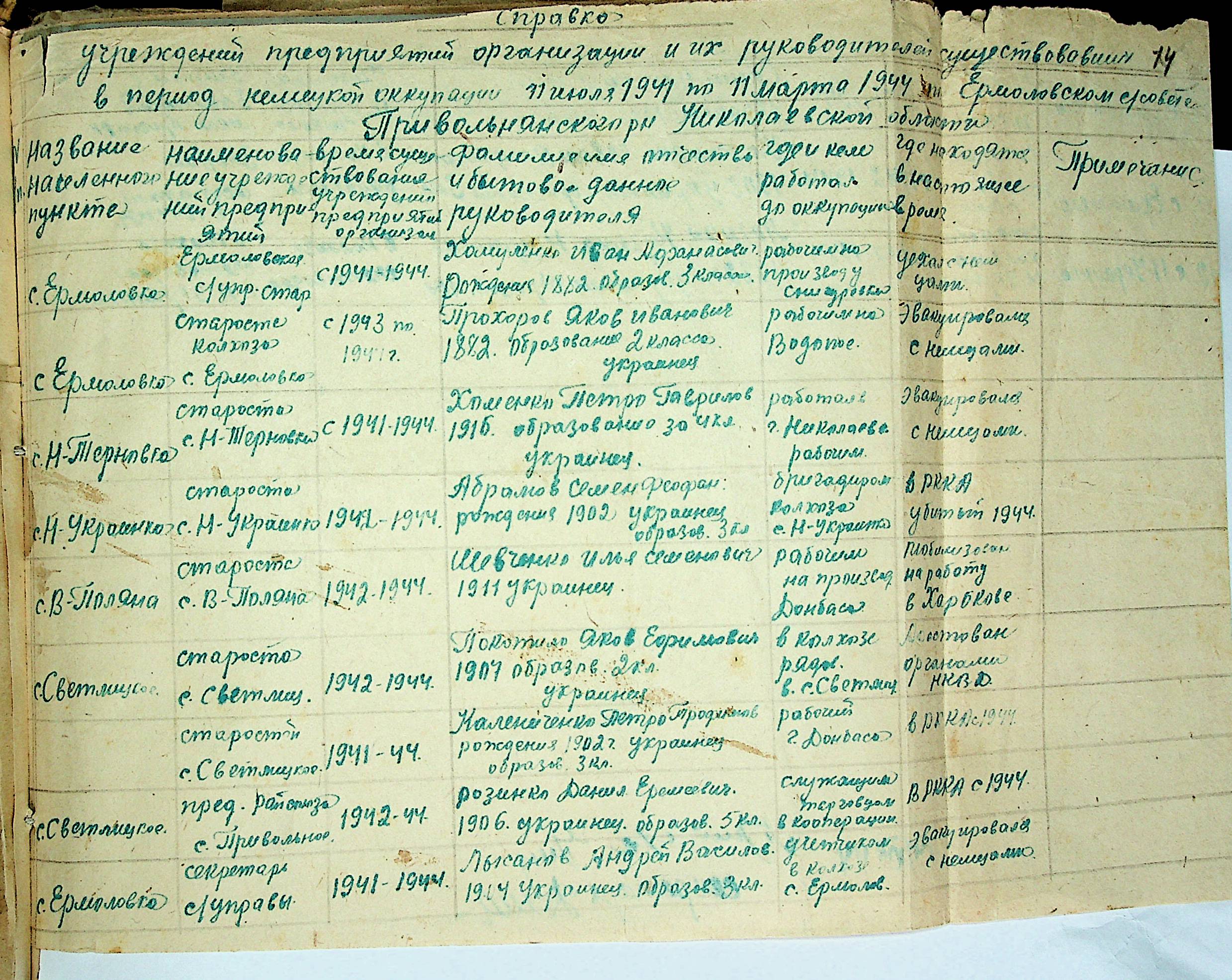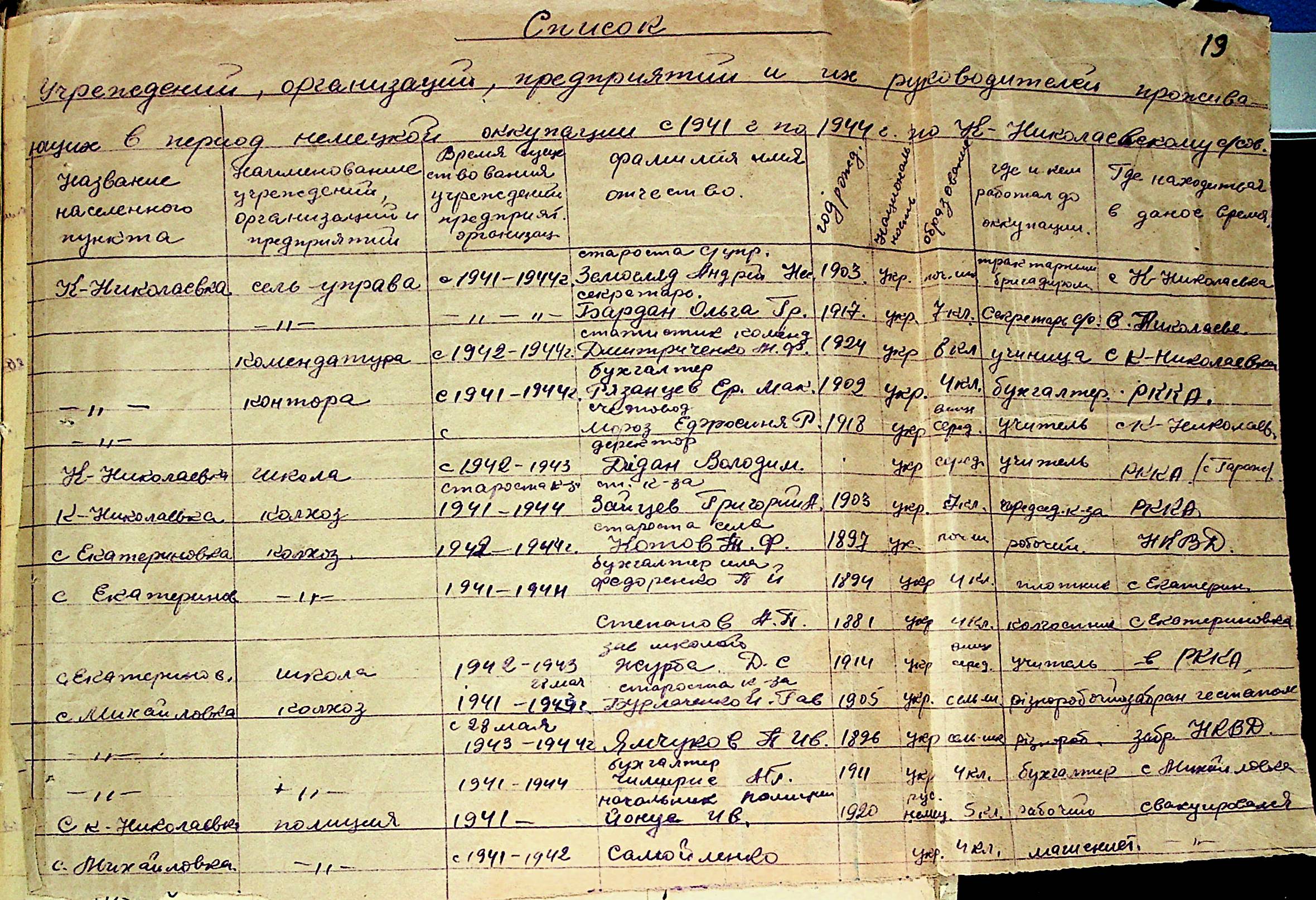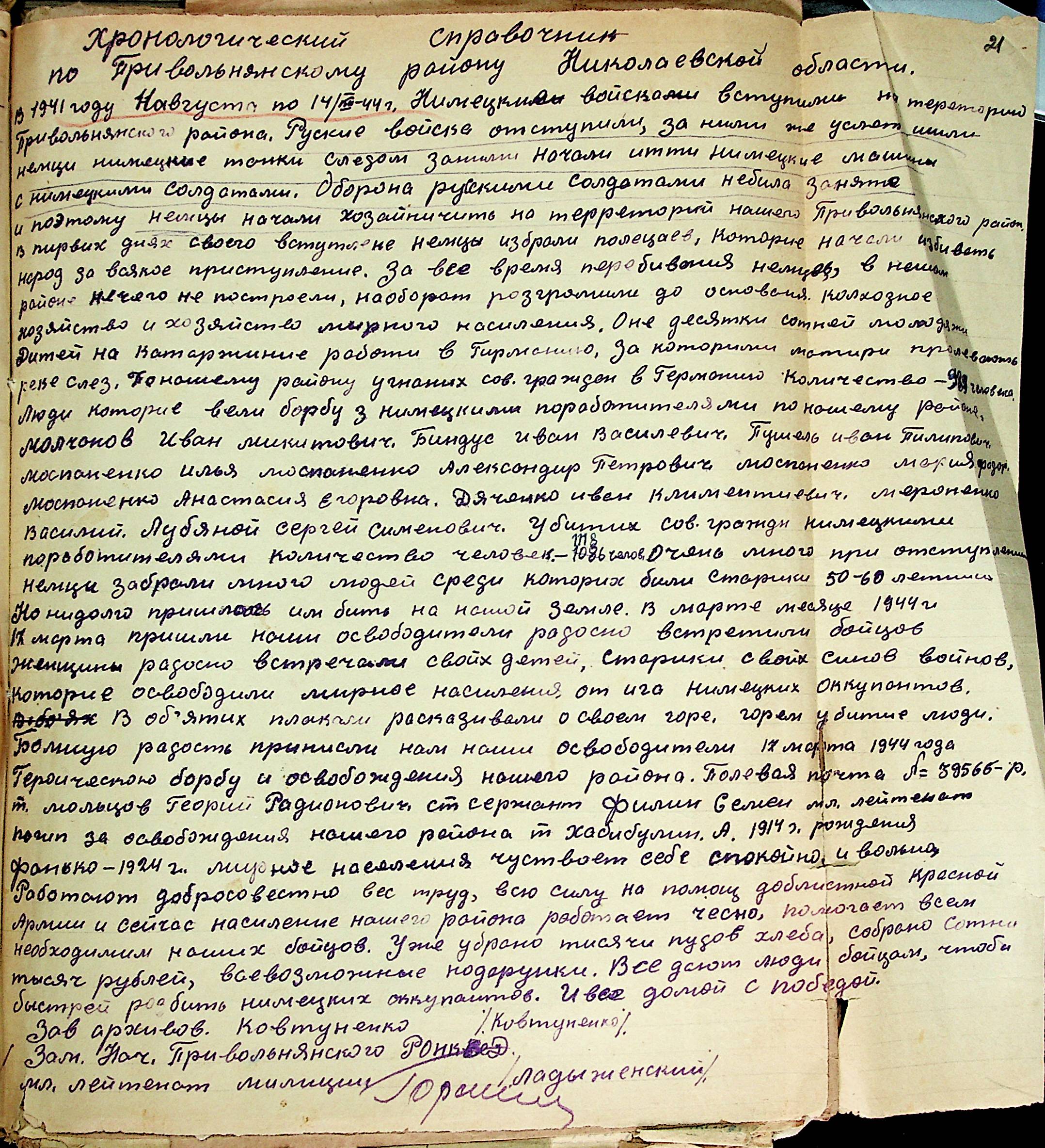 • • • • Справа № 31 “Хронологічні довідки (списки громадян викрадених до Німеччини, розстріляних, списки керівників установ, робітників та службовців) періоду німецької окупації 1941-1944 та часу визволення Радянською армією Привільнянського району Миколаївської області”