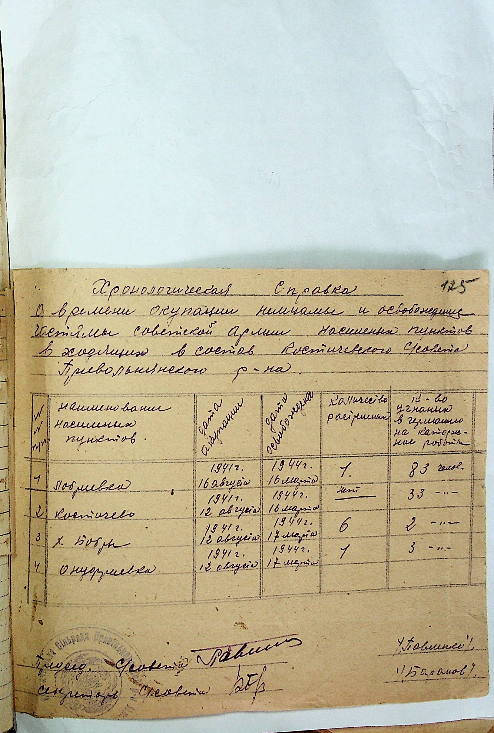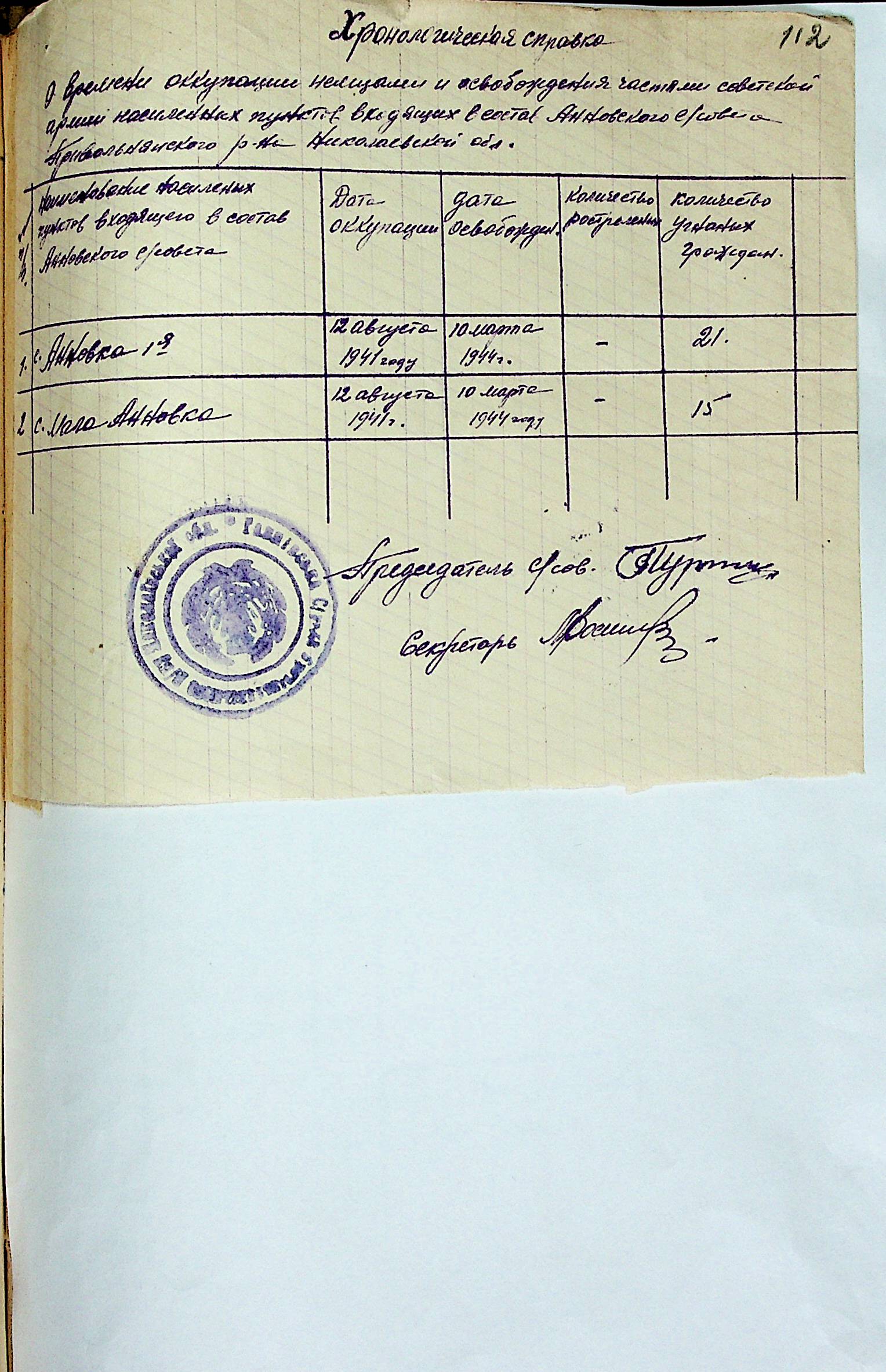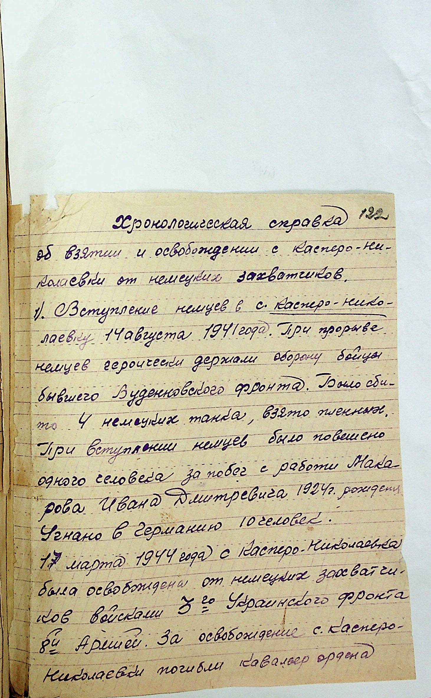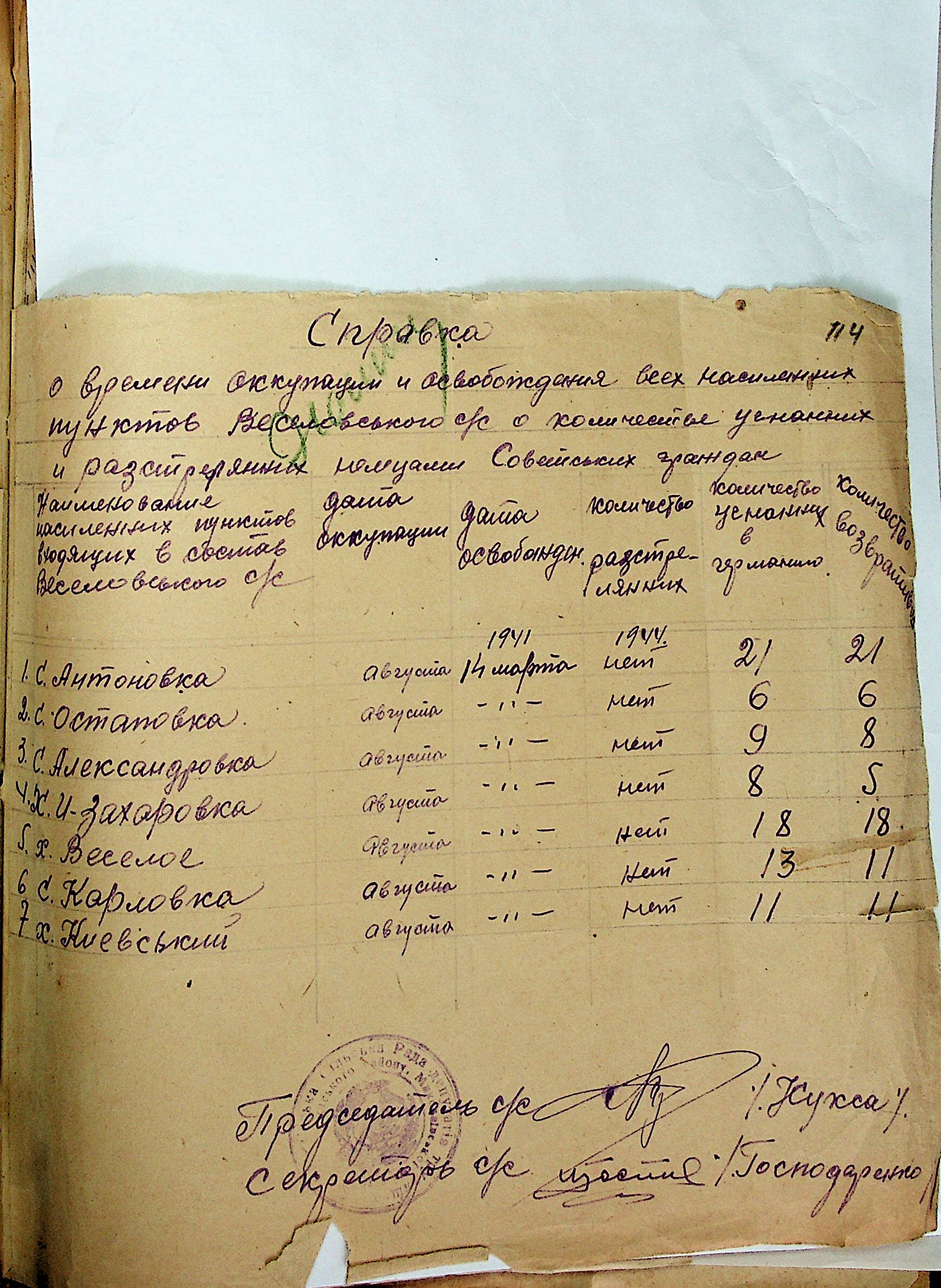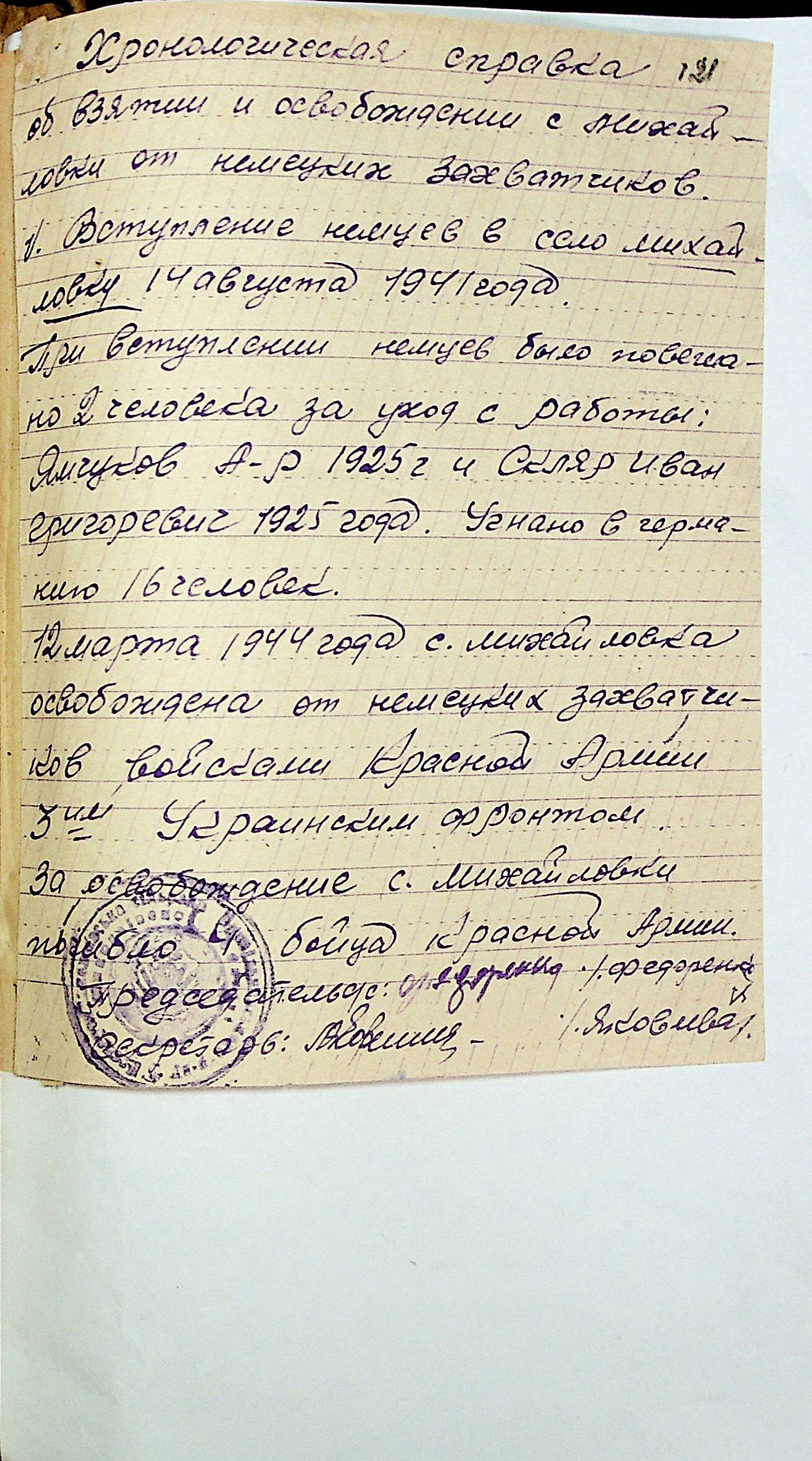 • • • • Справа № 31 “Хронологічні довідки (списки громадян викрадених до Німеччини, розстріляних, списки керівників установ, робітників та службовців) періоду німецької окупації 1941-1944 та часу визволення Радянською армією Привільнянського району Миколаївської області”